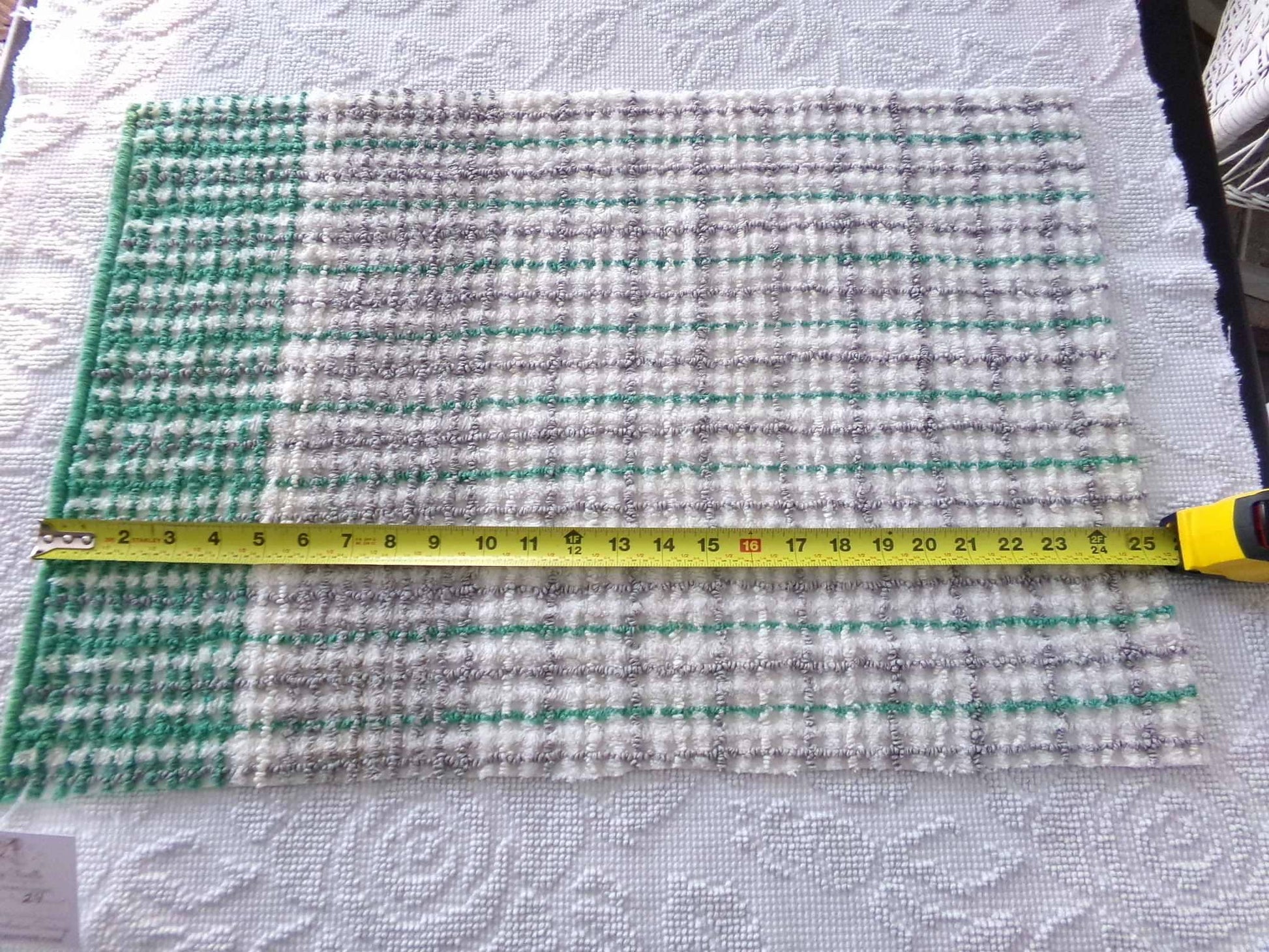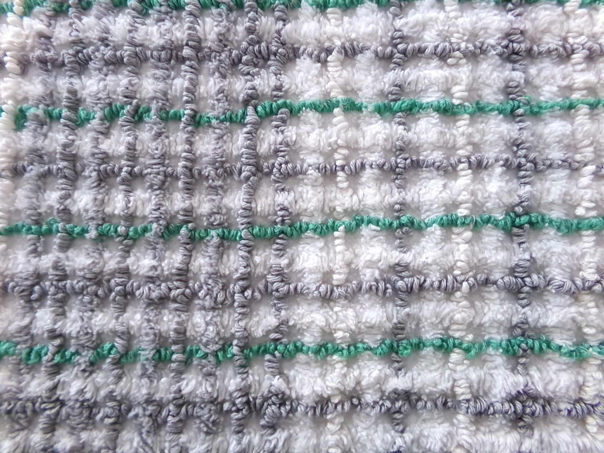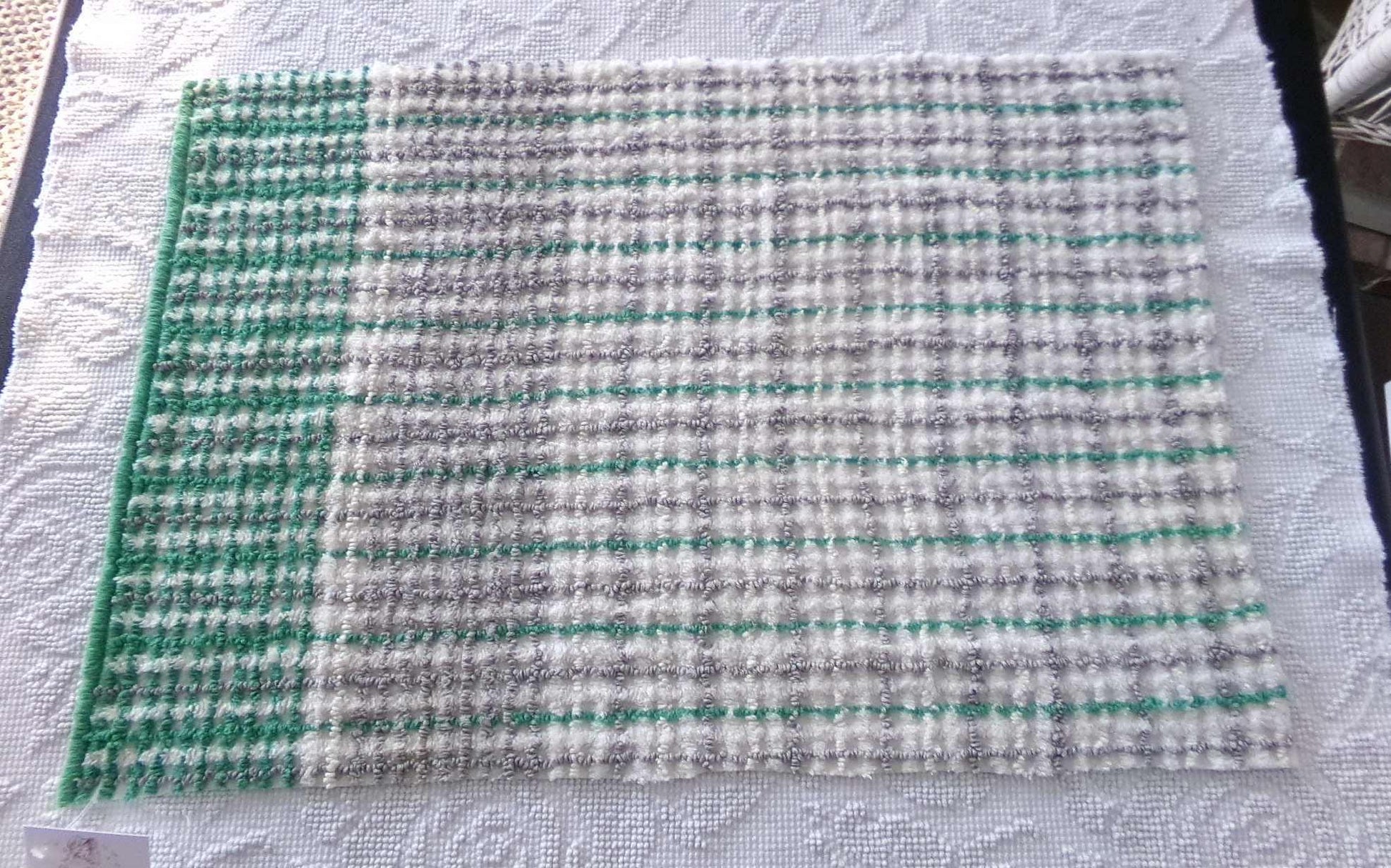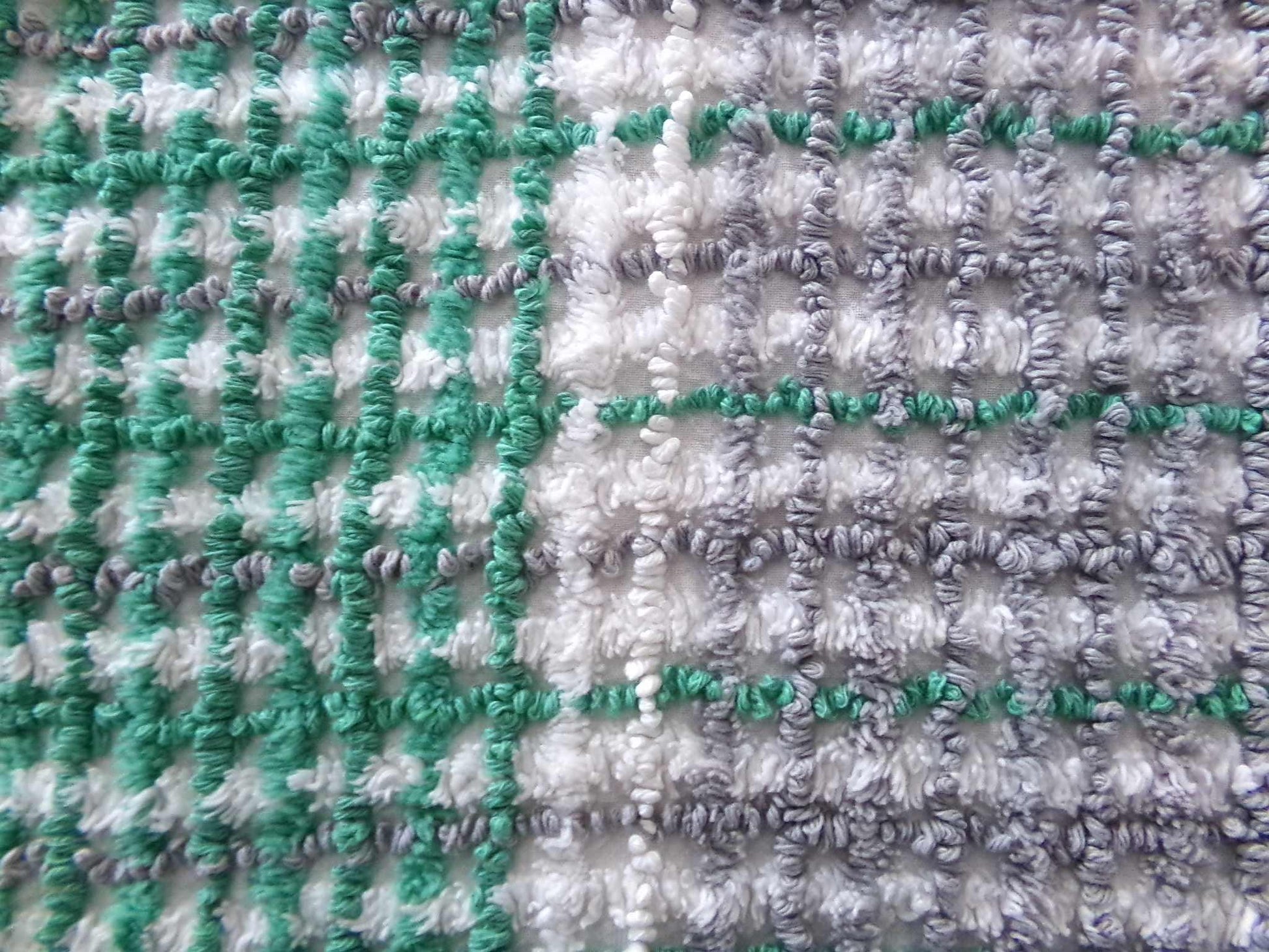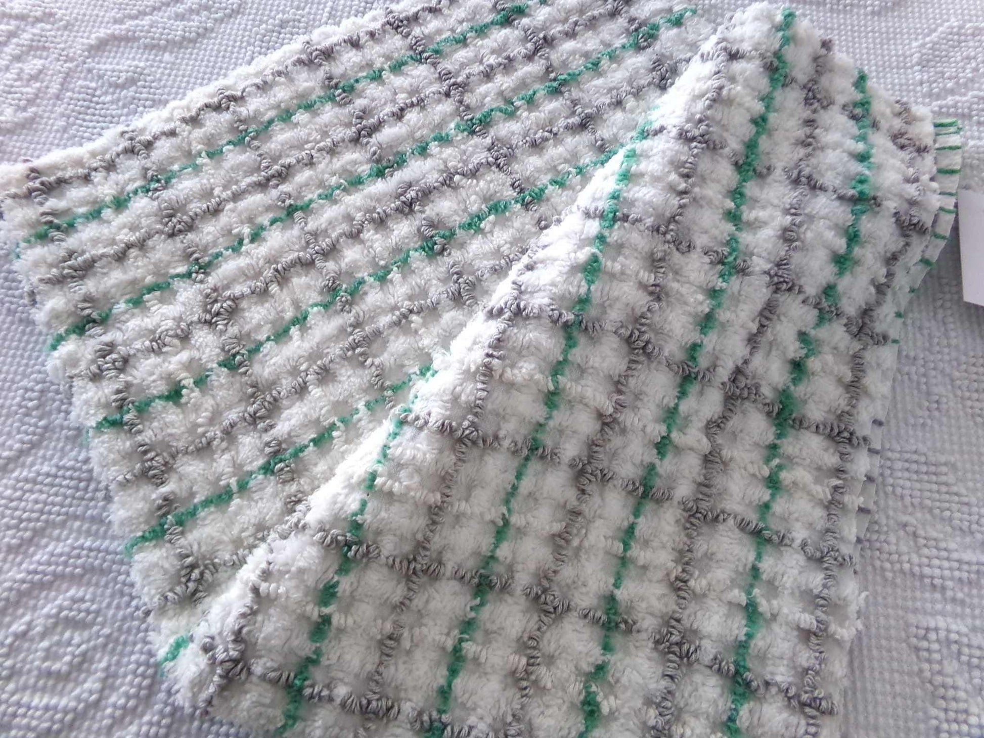 see more, cottagedivine.comNeed an unusual piece of vintage chenille fabric with excellent texture? This material might be what you've been searching for. A prominent geometric pattern makes a striking statement in kelly green and dove grey, set on a white bkgd.