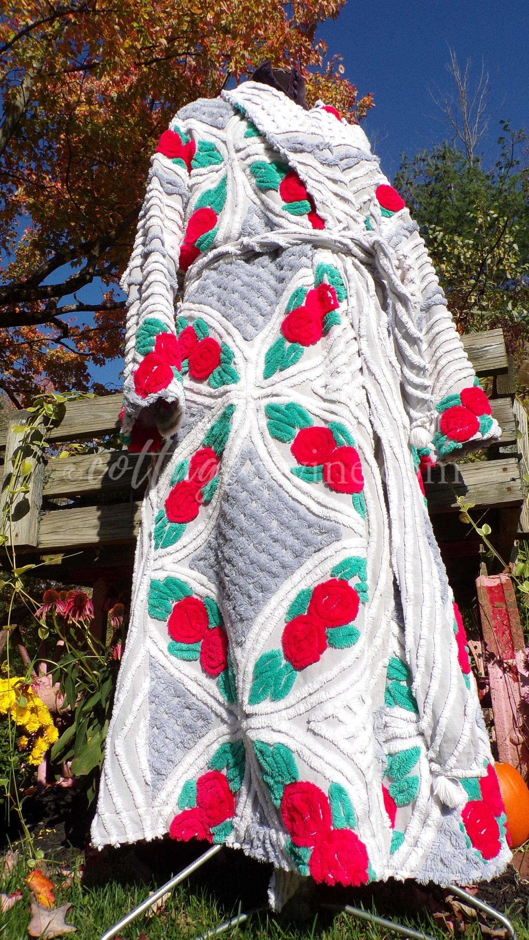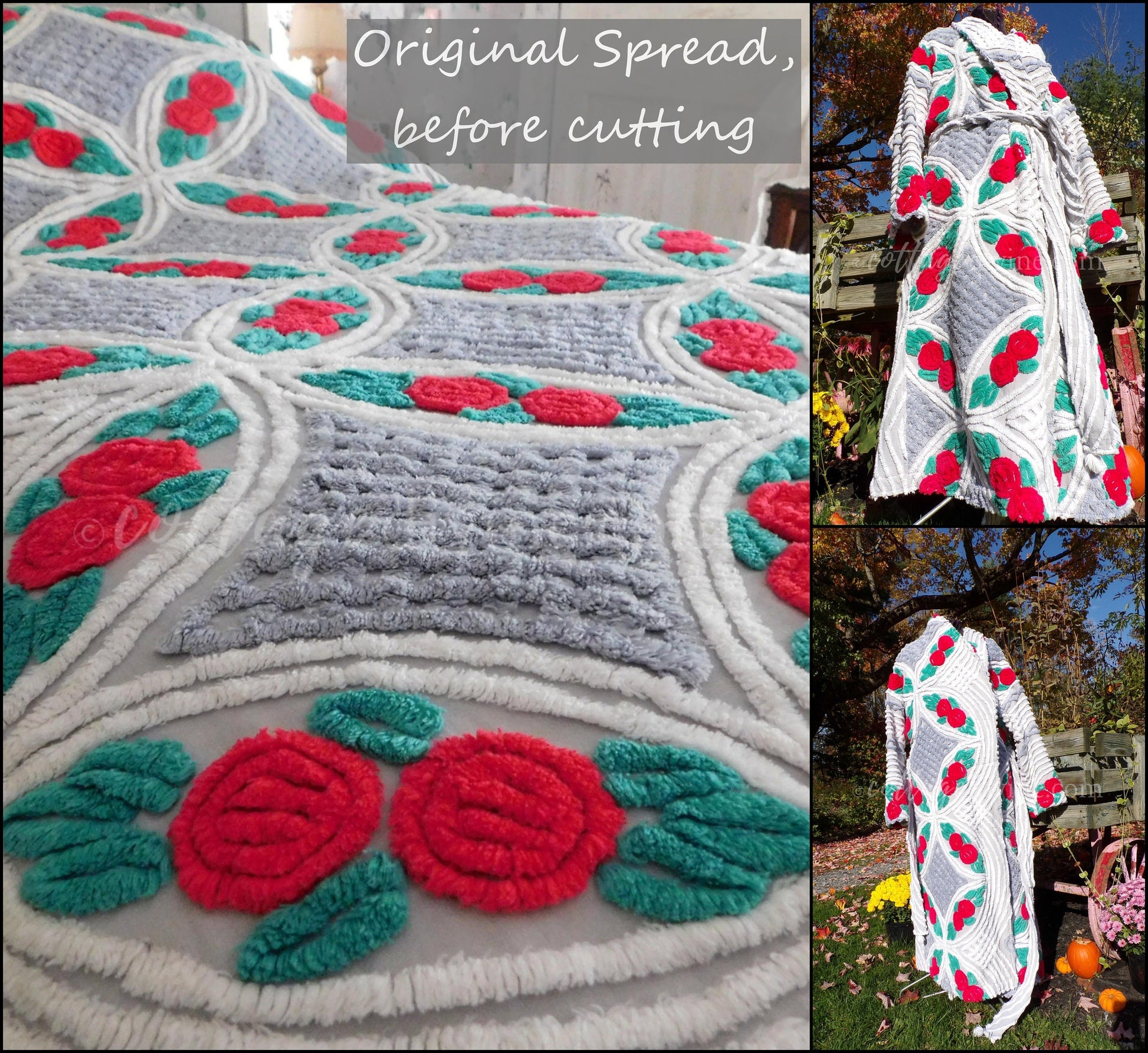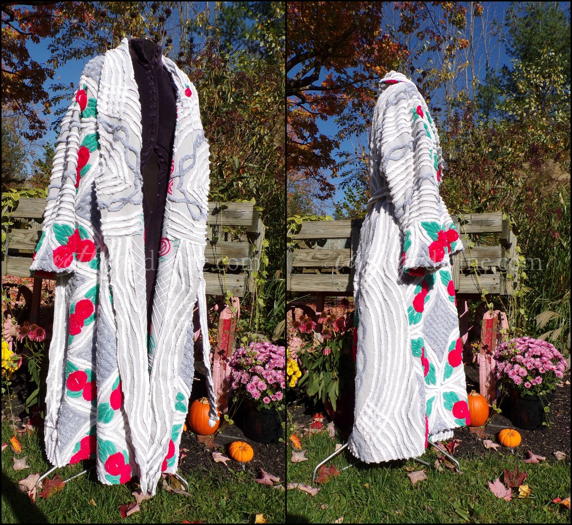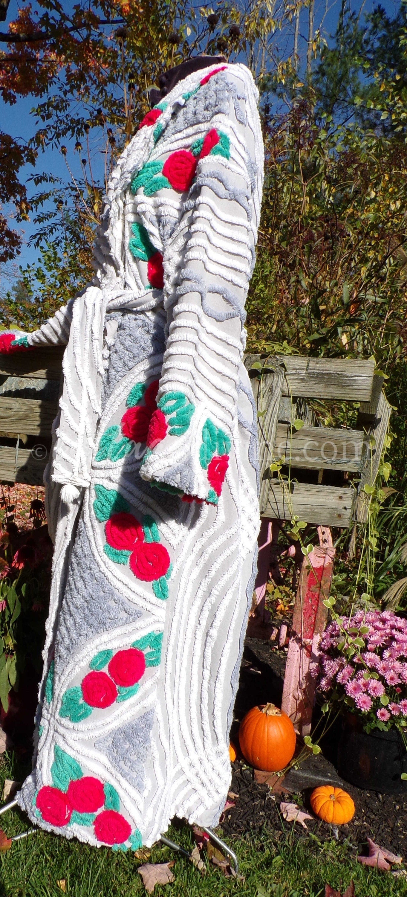 Cozy up in this "Lovey Dovey" chenille robe (or art-to-wear coat, if you're daring) & time travel back long, long ago...the chenille bedspread this bathrobe was designed from dates to the mid-1940s era.It is of the pattern often showcased in promotional materials from that time for the famed Peacock Alley, when proprietors would proudly display their chenille wares on clotheslines that attracted tourists passing through.
