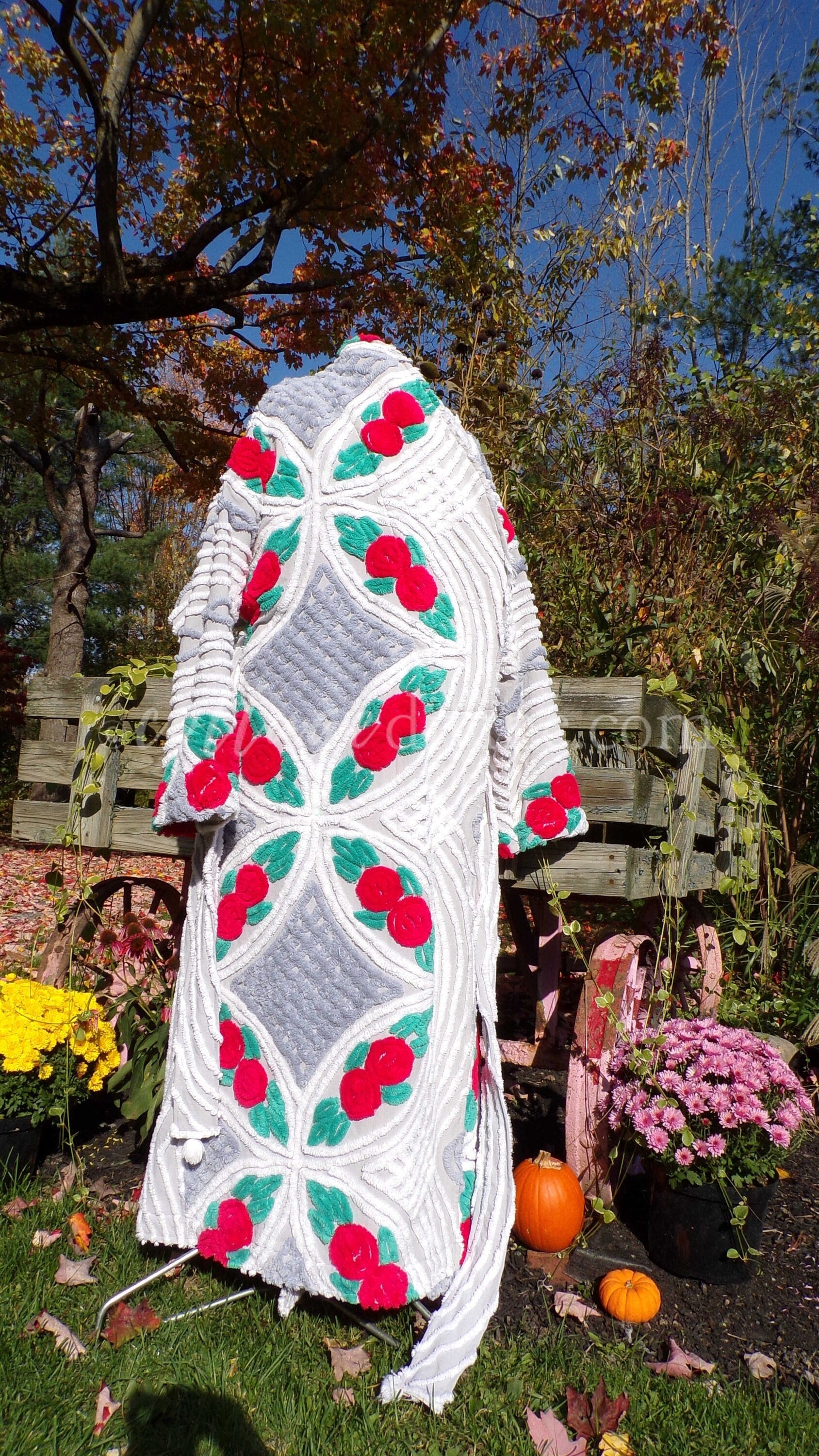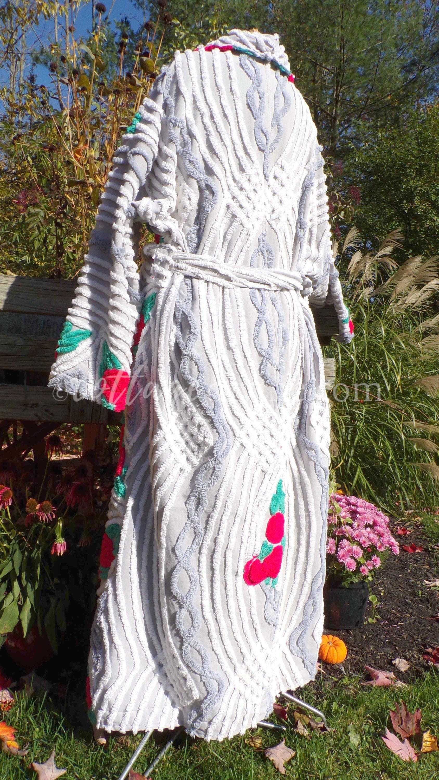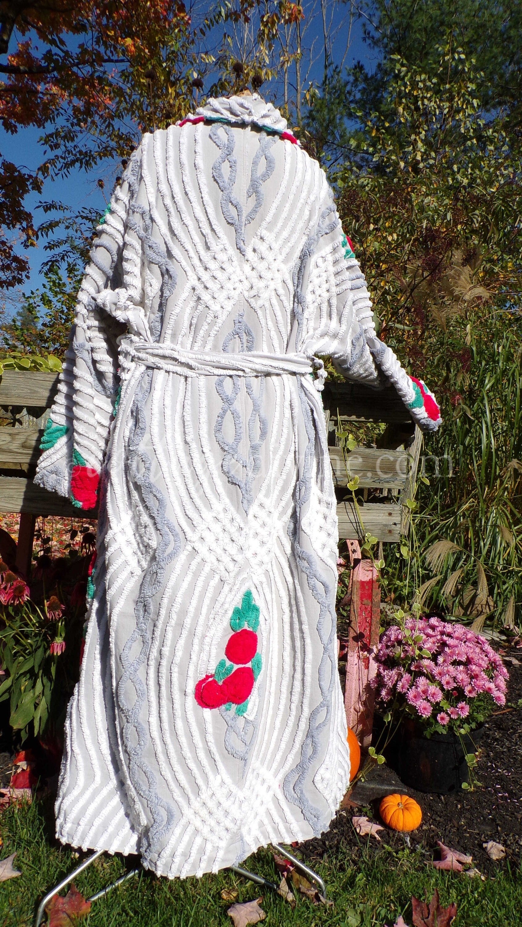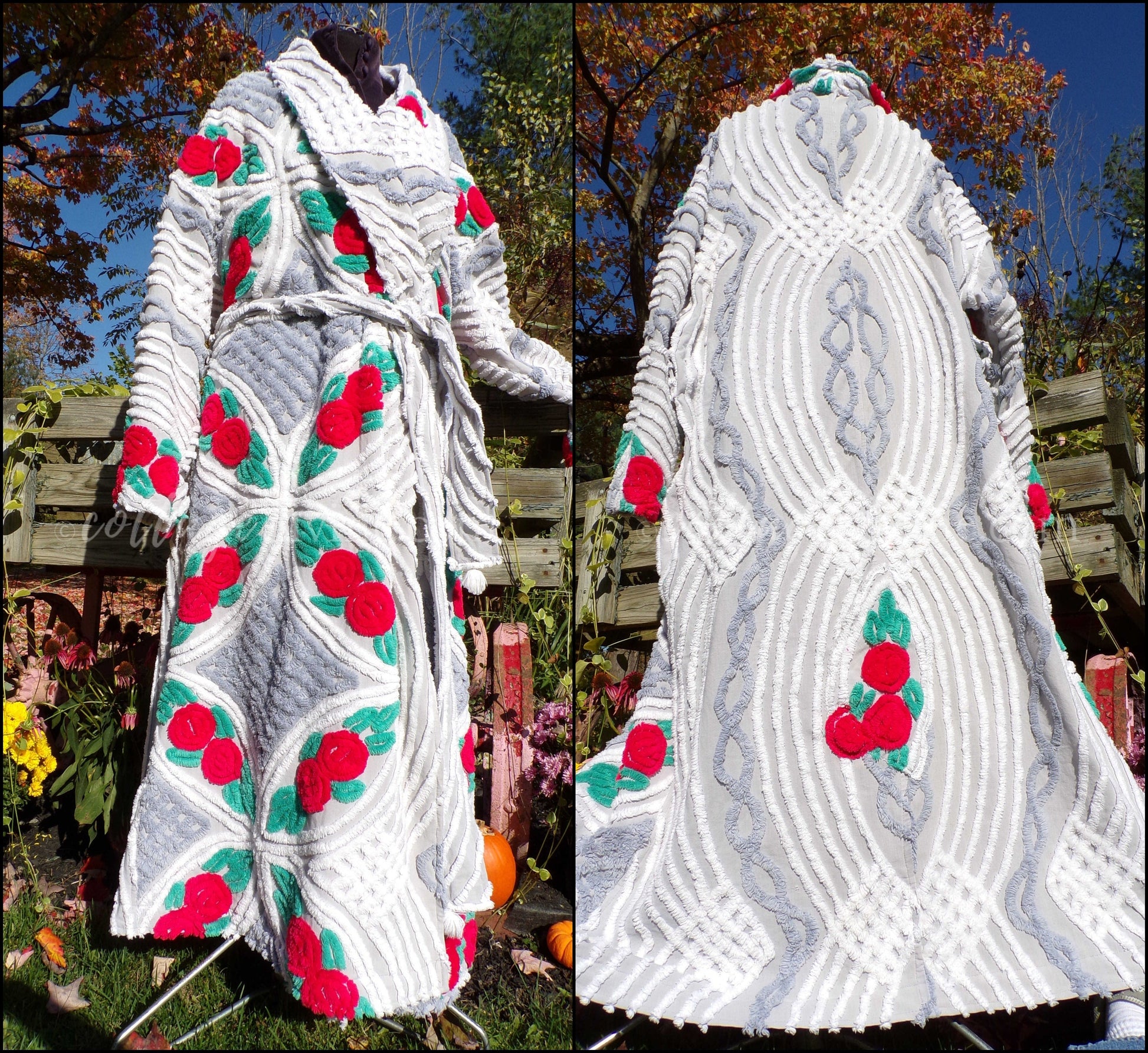 Cozy up in this "Lovey Dovey" chenille robe (or art-to-wear coat, if you're daring) & time travel back long, long ago...the chenille bedspread this bathrobe was designed from dates to the mid-1940s era.It is of the pattern often showcased in promotional materials from that time for the famed Peacock Alley, when proprietors would proudly display their chenille wares on clotheslines that attracted tourists passing through.