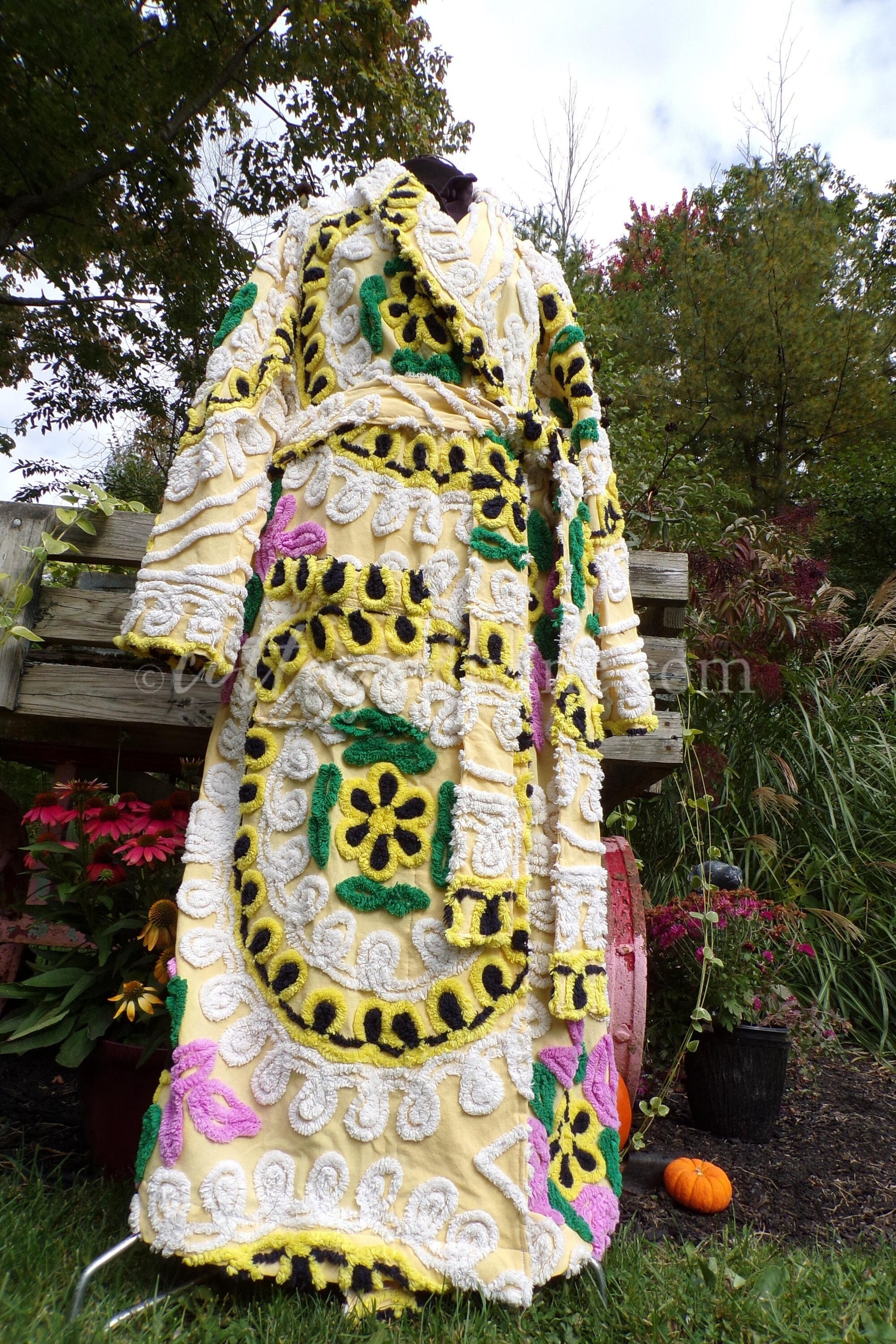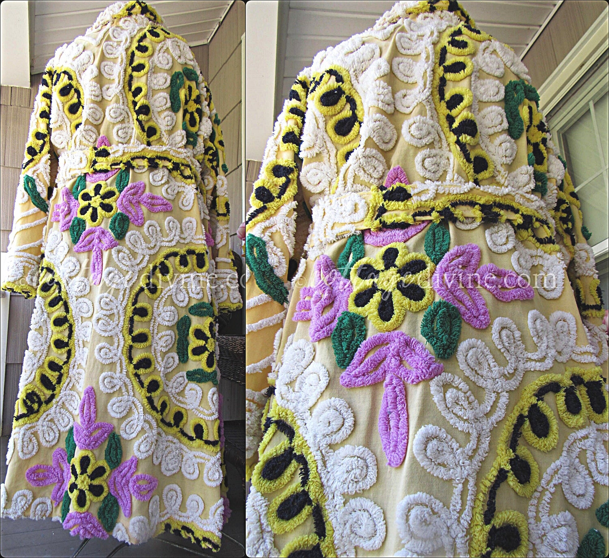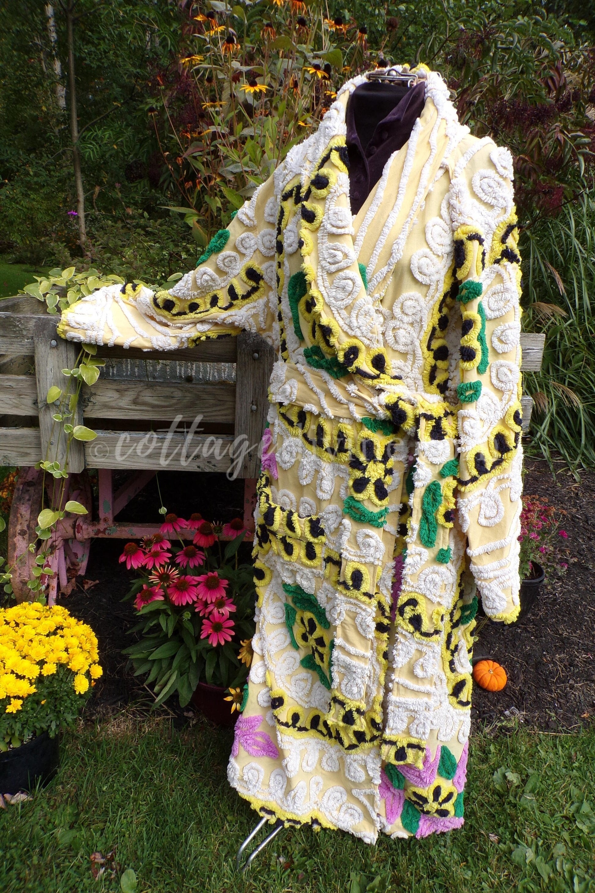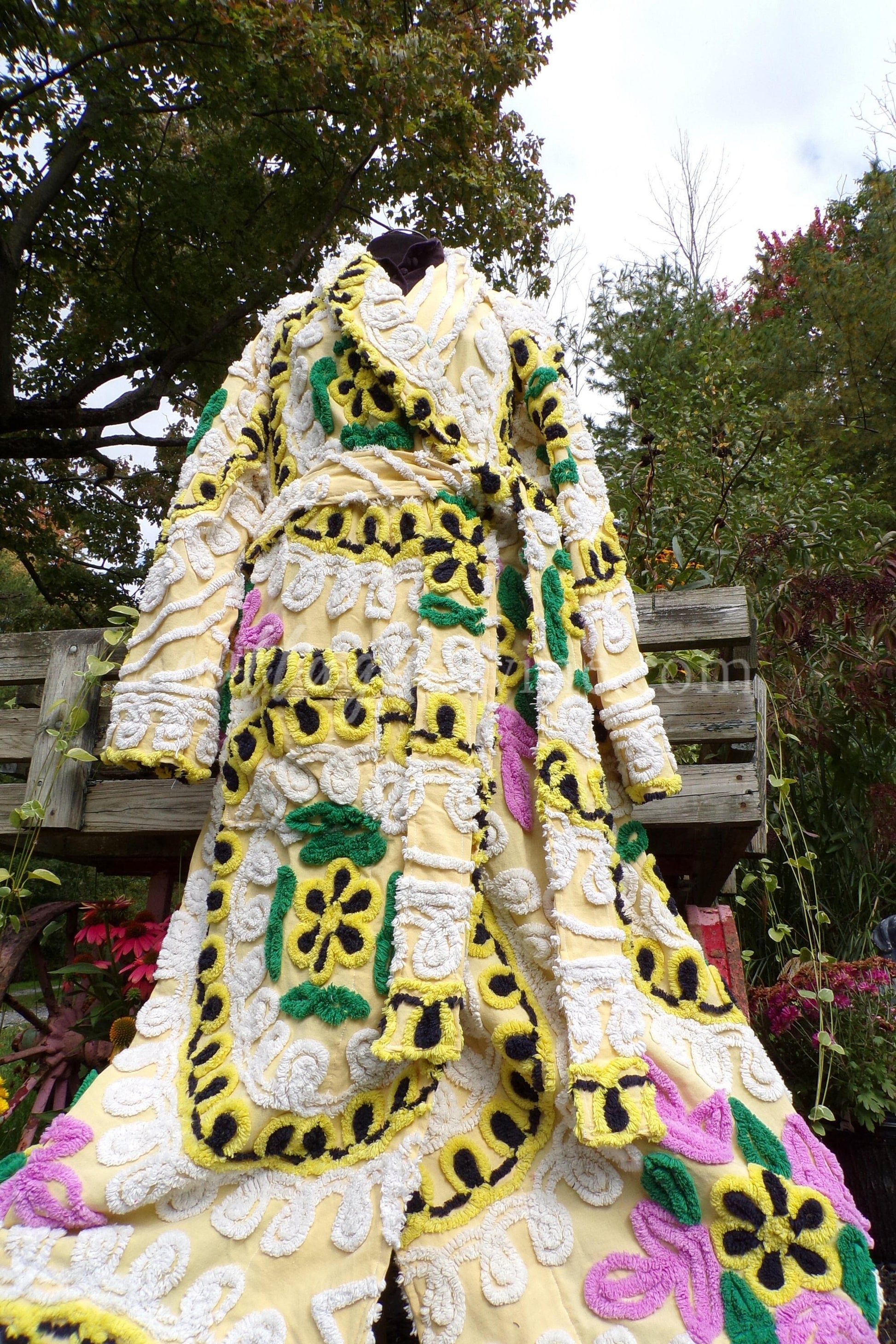 This memorable design was handcrafted by upcycling an original vintage chenille bedspread, circa the mid-1950s, not a repro. 100% cotton, soft fluffy tufting. Standard tie belt included.