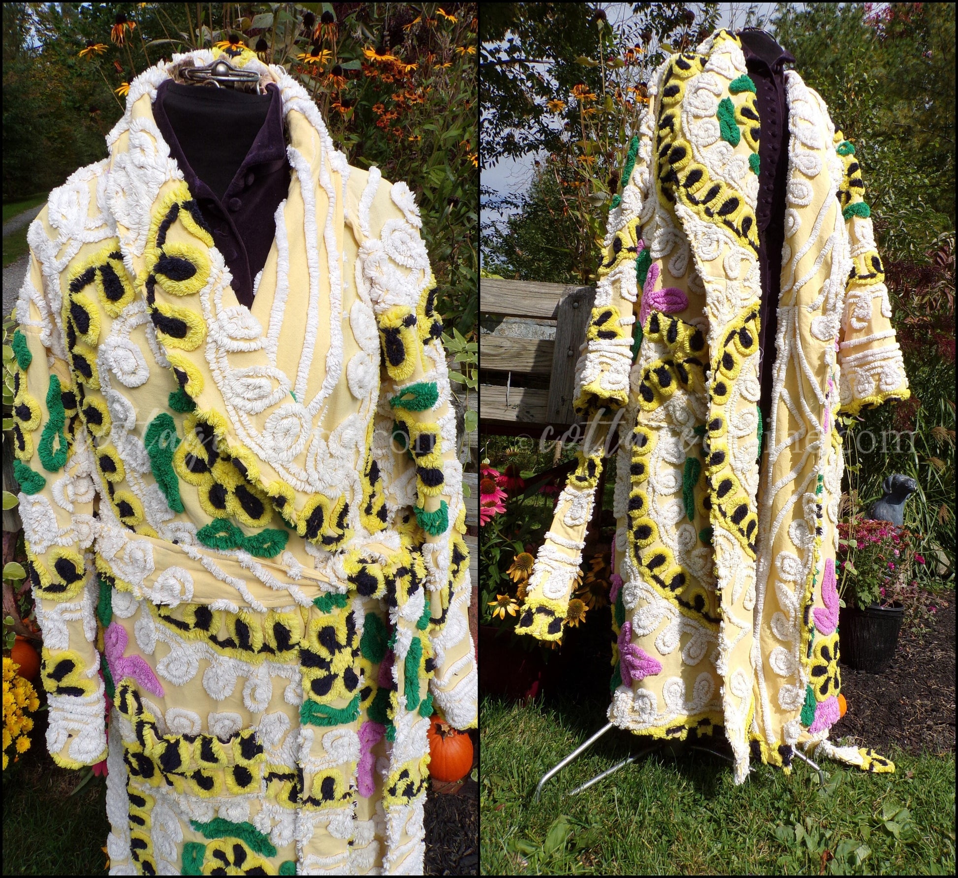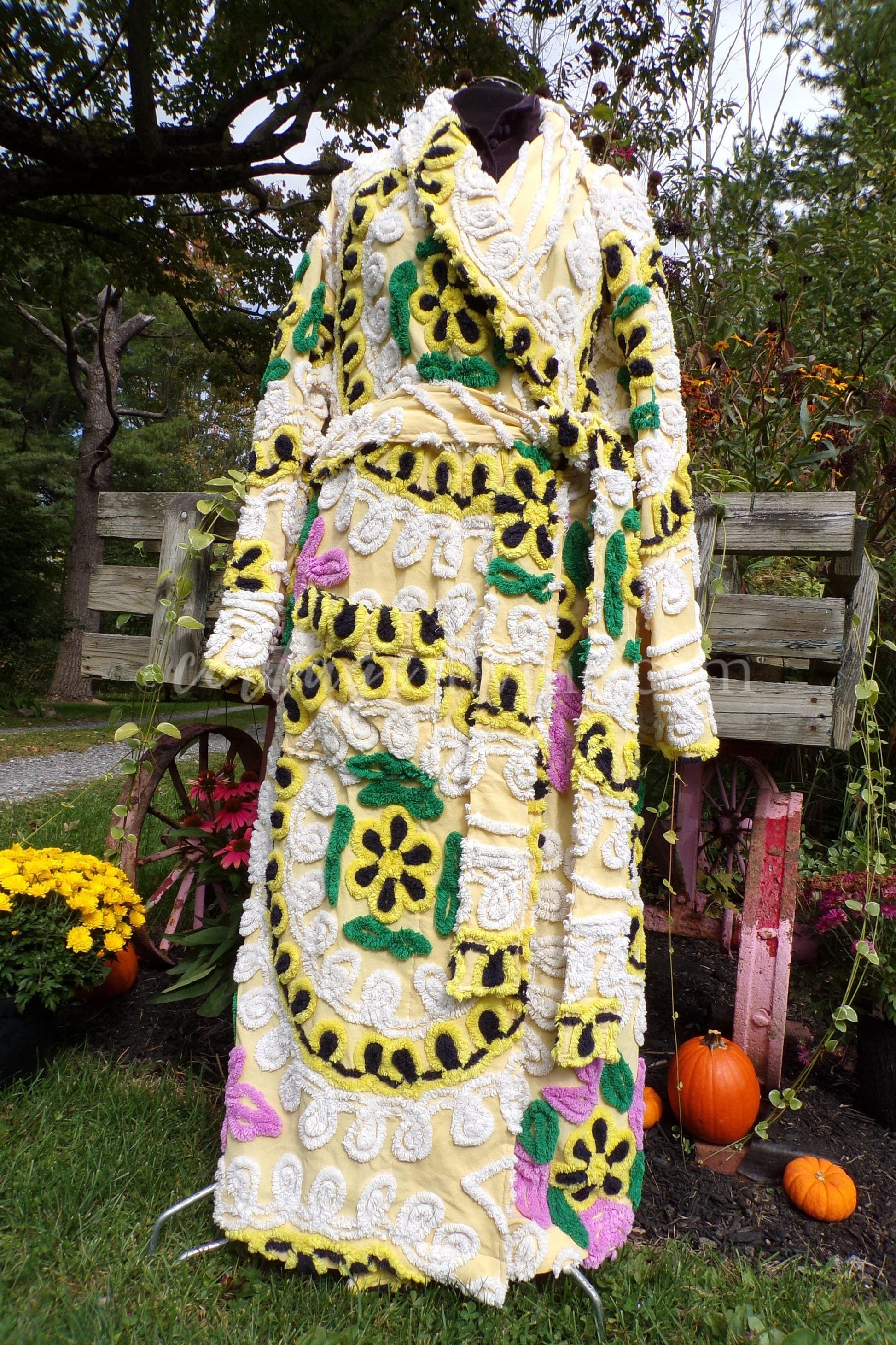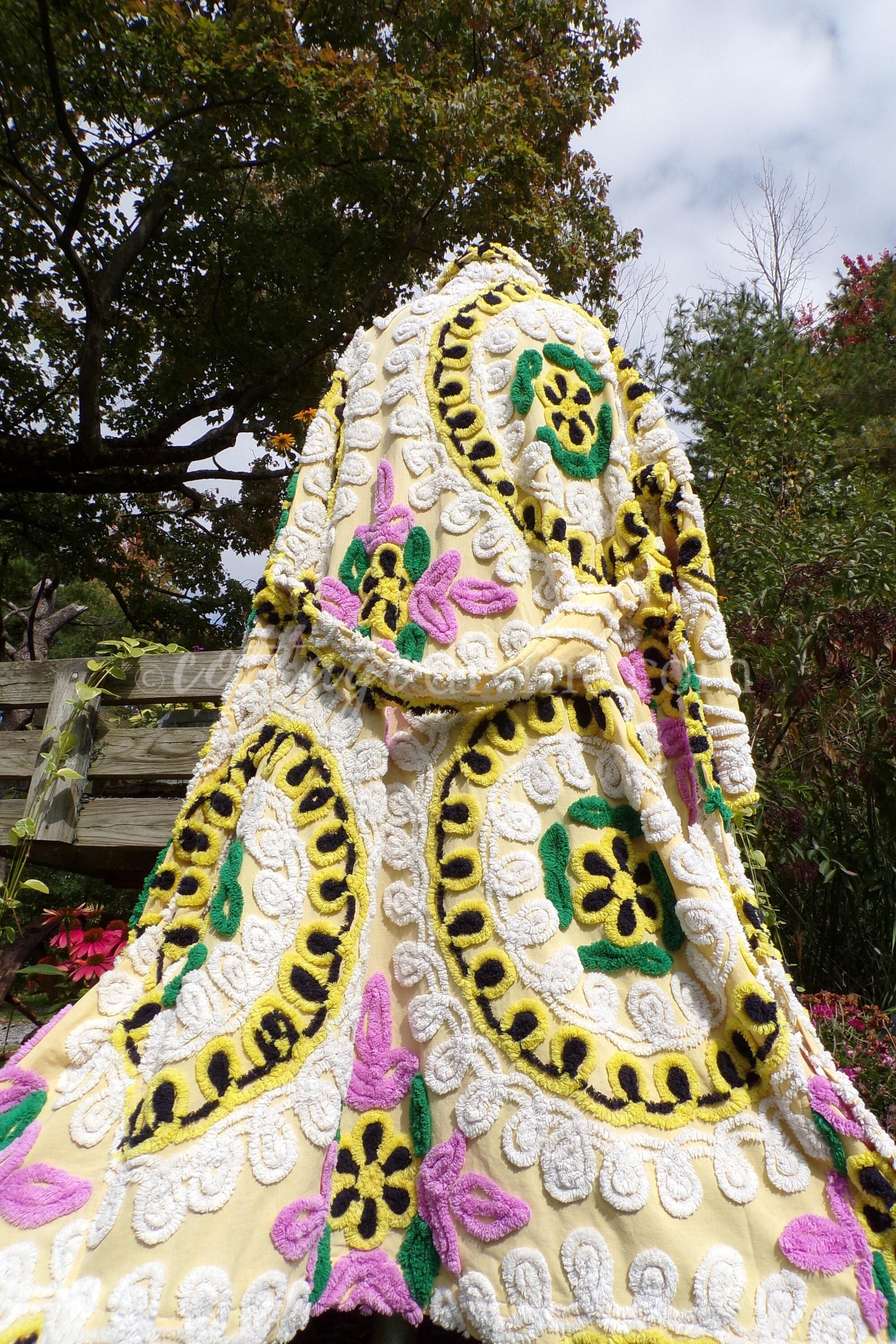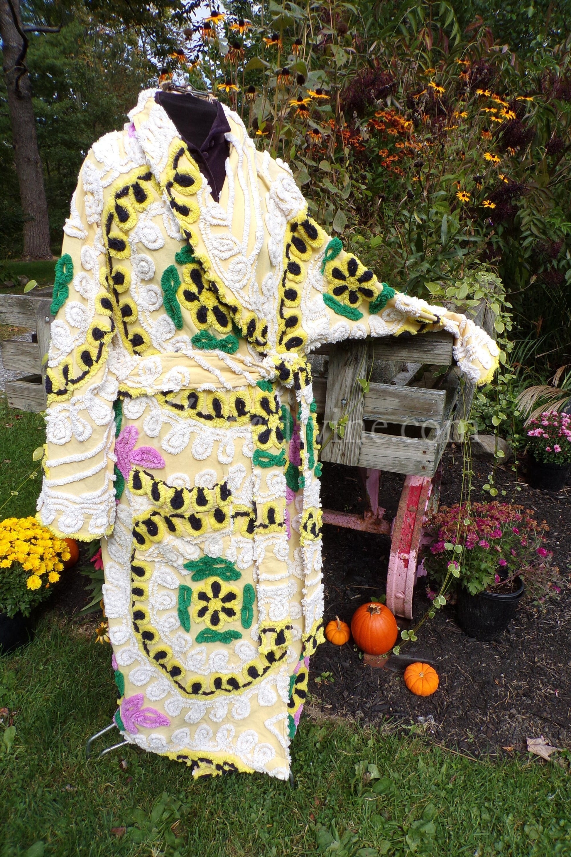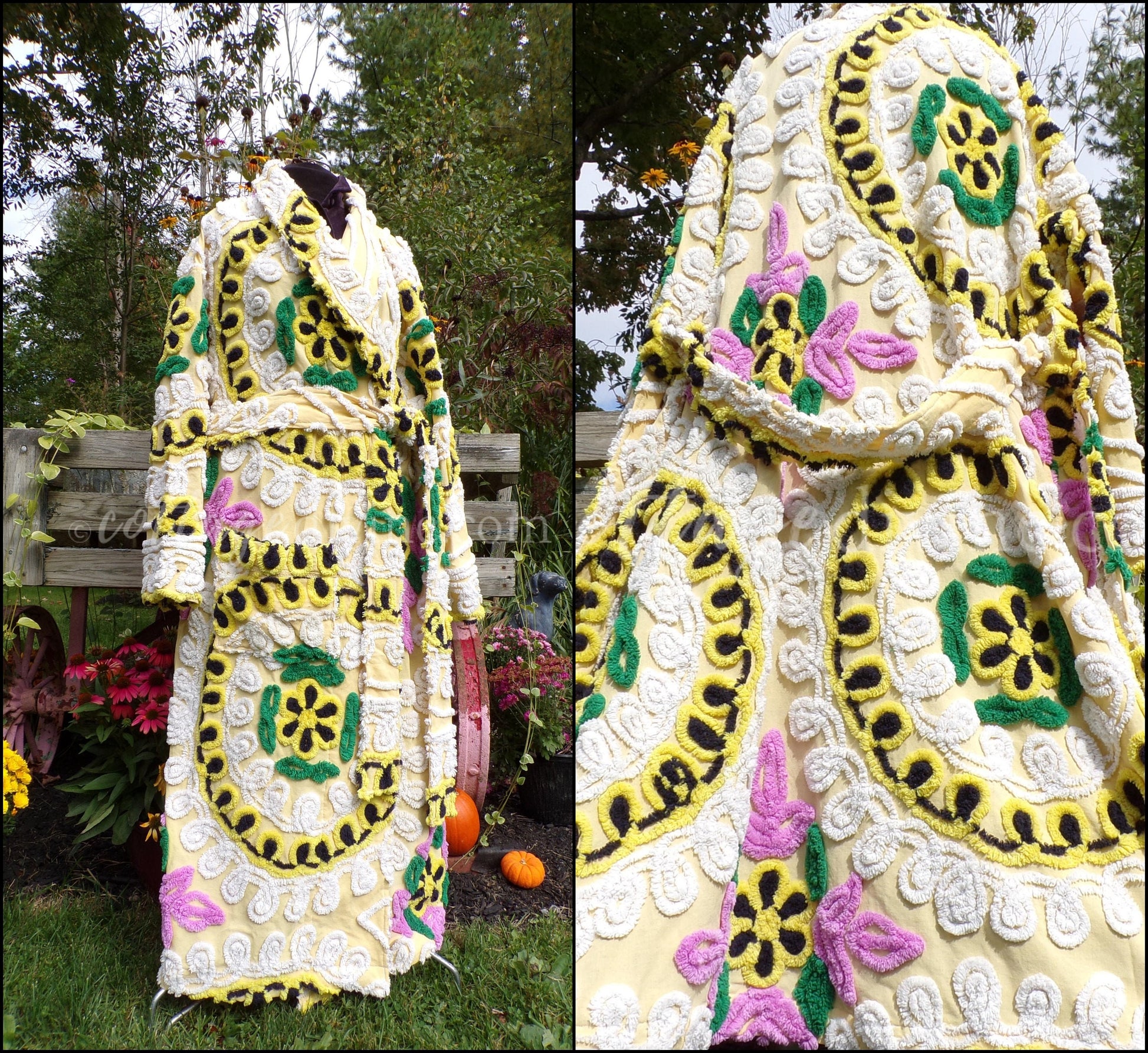 This memorable design was handcrafted by upcycling an original vintage chenille bedspread, circa the mid-1950s, not a repro. 100% cotton, soft fluffy tufting. Standard tie belt included.