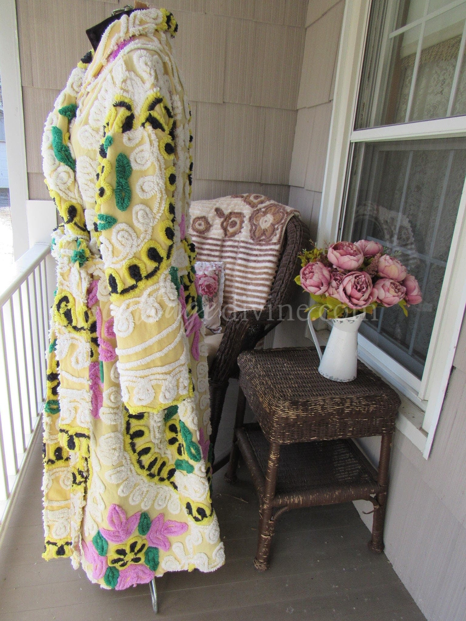Good Morning, Sunshine! Inspired by the fabulous robes made famous by the beloved 1990s sitcom The Nanny & the always glam Fran, this is a chenille bathrobe like no other...in one of the rarest patterns & colorways ever produced in vintage chenille. Wear as a bathrobe or as an artsy coat.Rise 'n shine with sunny yellow background uplifting & inspiring you for the new day. Love the licorice black accents and those endless swirls & twirls of curlicues, complimented by gorgeous large lavender lily flowers.
