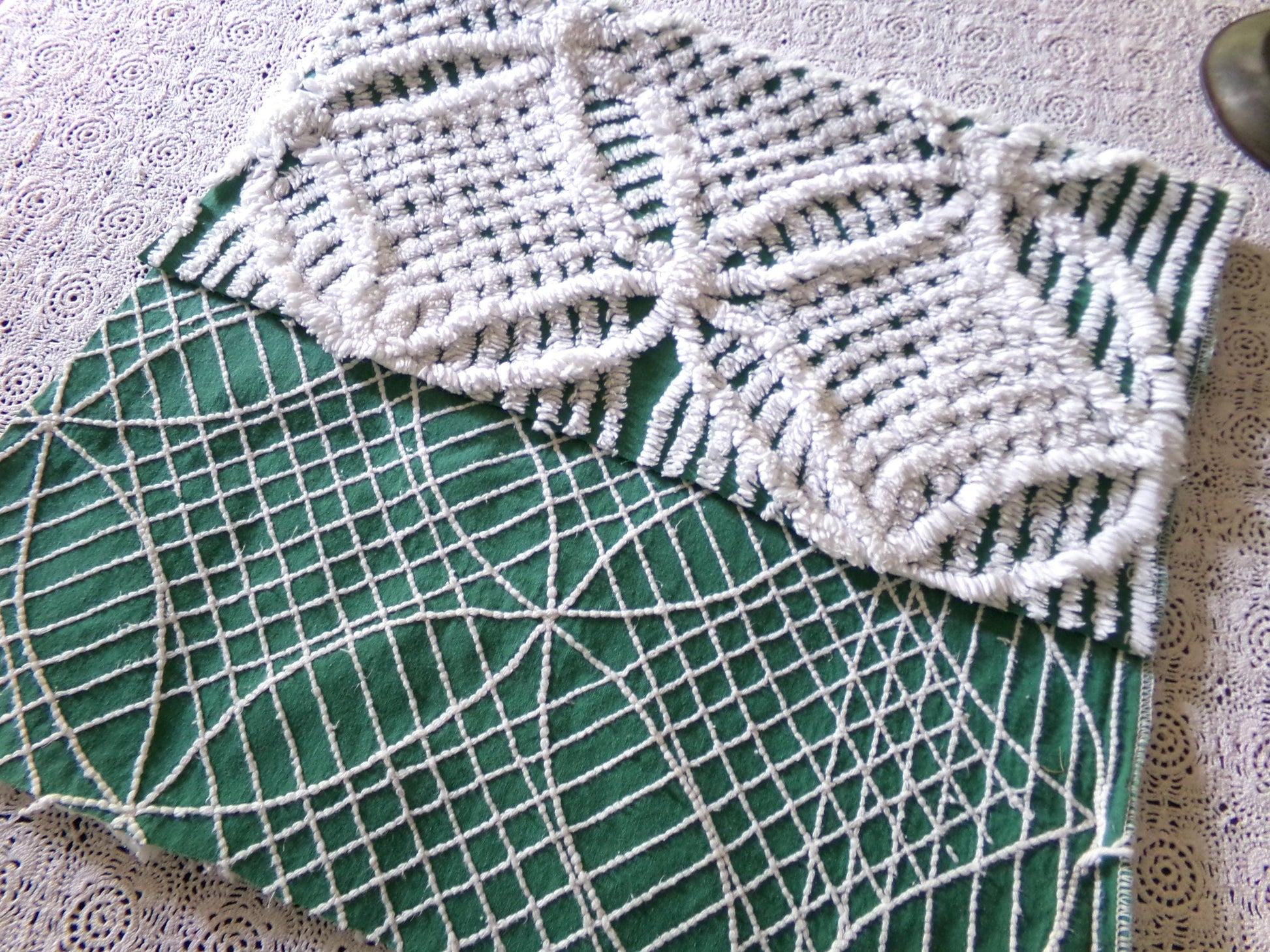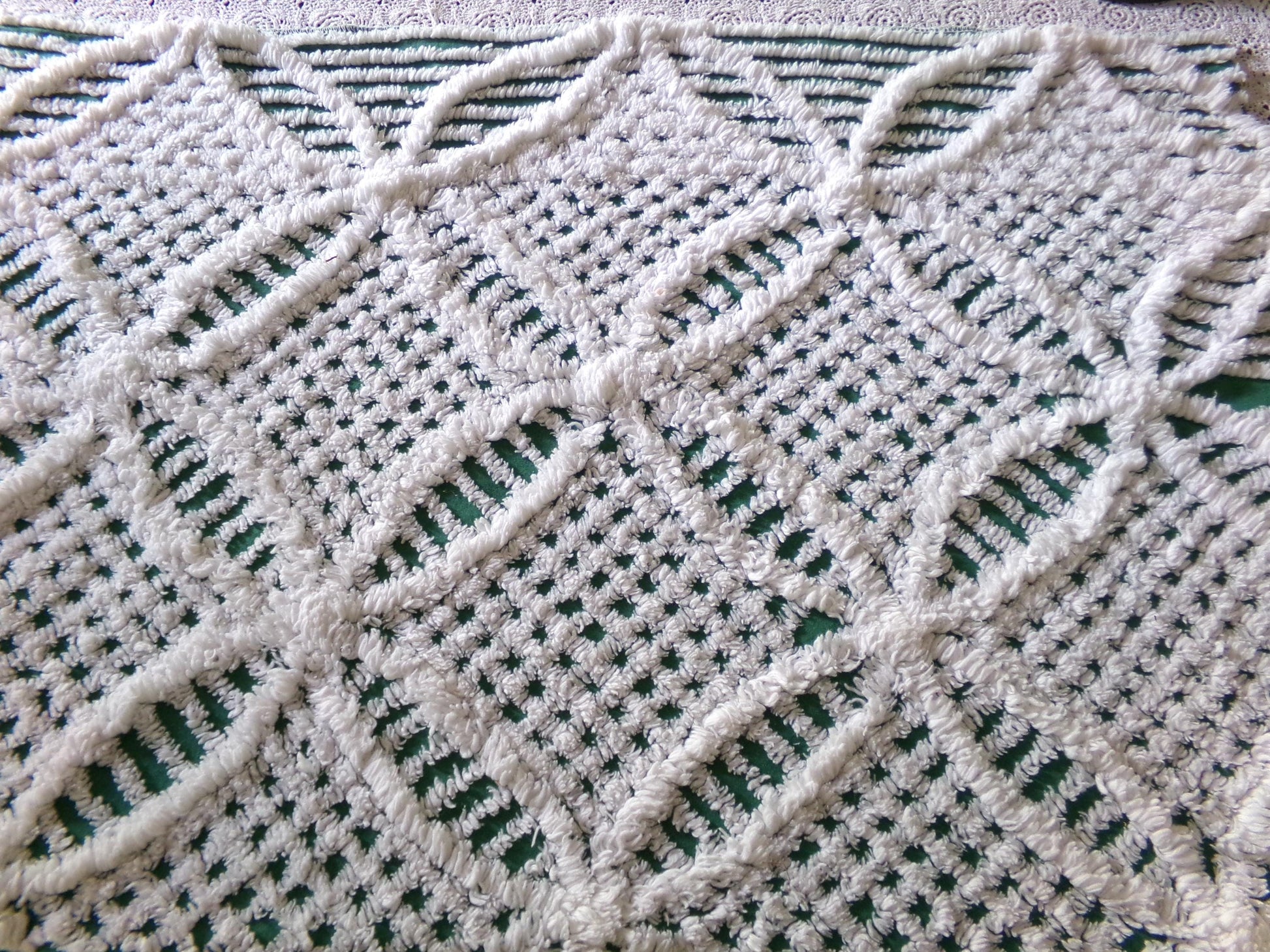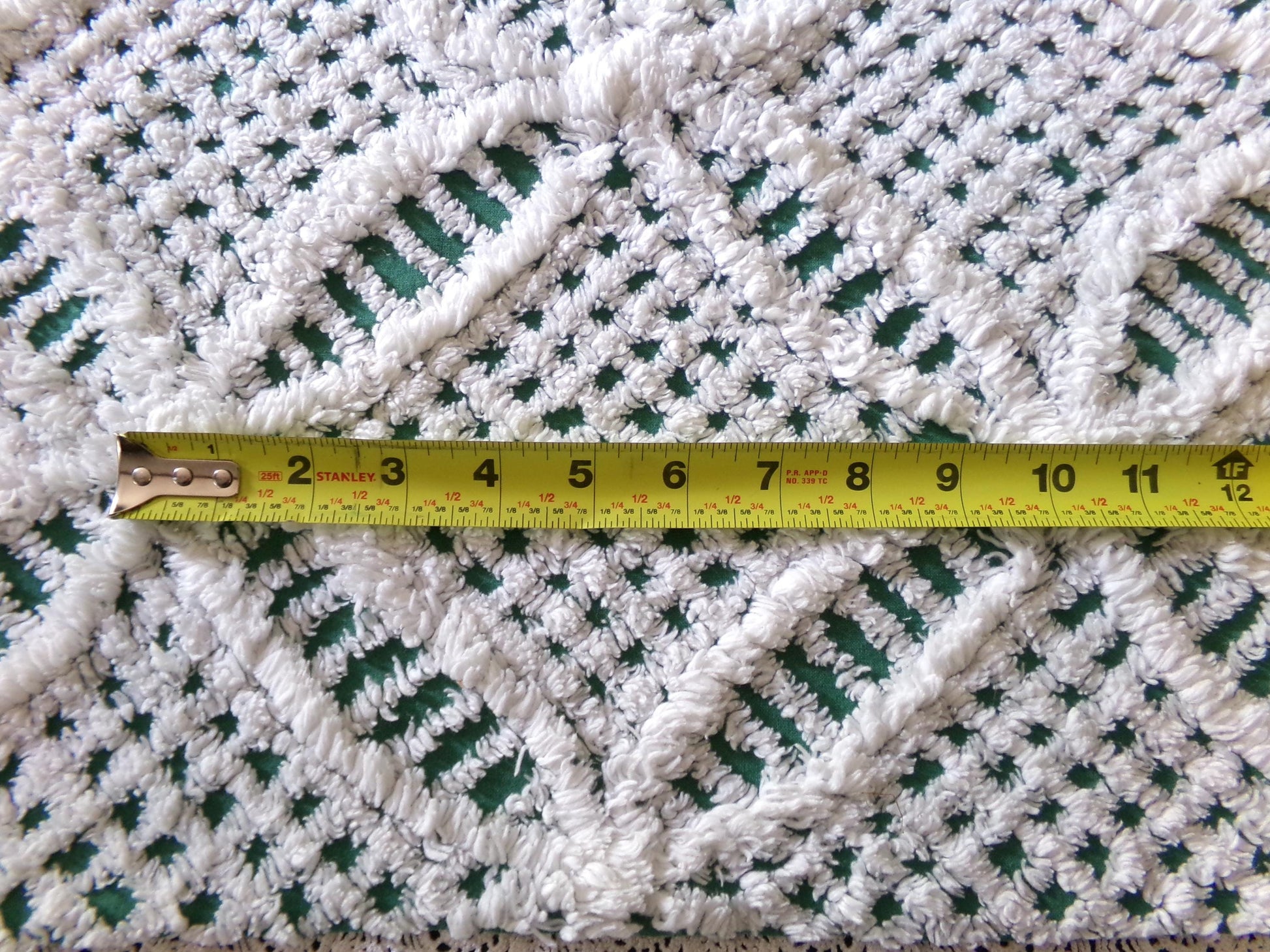 Majestic lush plush green vintage chenille material features contrast white geometric wedding rings for a striking presentation in any project. Outstanding colors - the snowy white tufts really pop against the rich green.Piece measures an irregularly shaped 18" x 26" inches. 100% cotton, 1950s era original.
