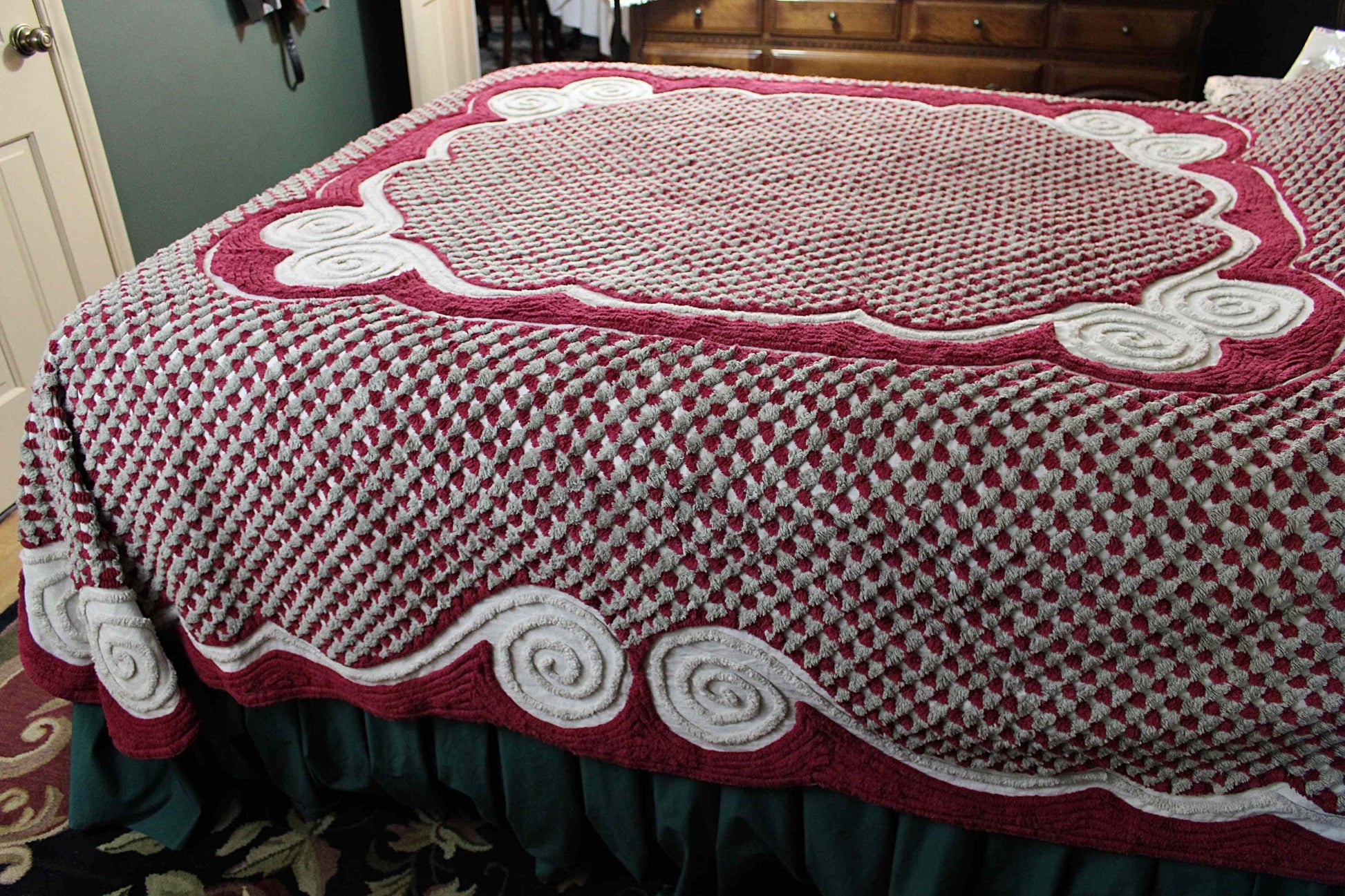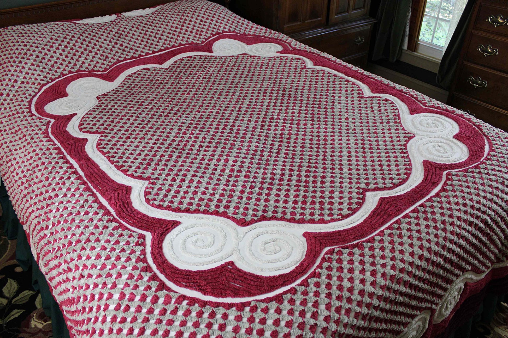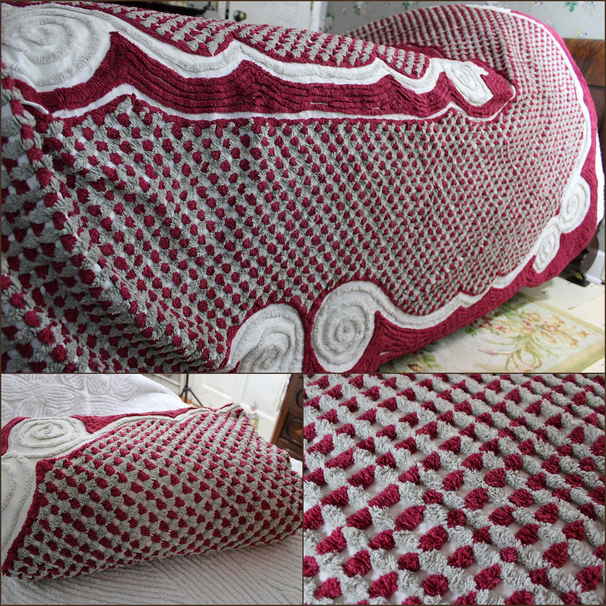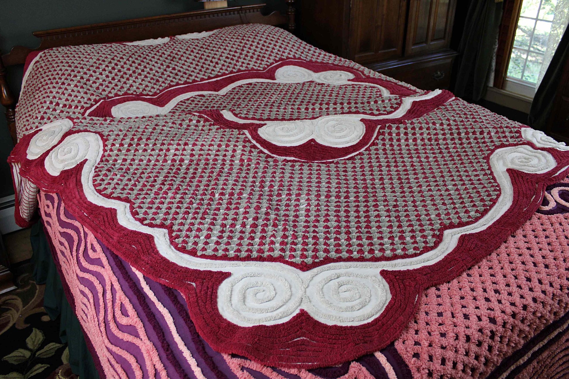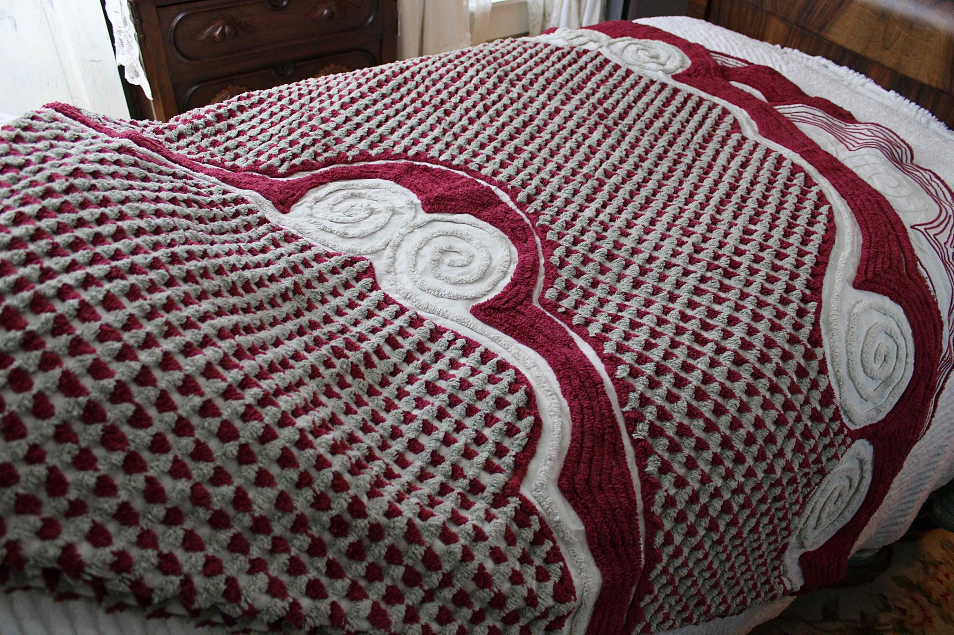Transform your space with this exceptional vintage chenille bedspread in an ultra plush design that will keep you warm. Dense dove grey and berry red waffle tufting is accented by a light ice gray spiral design. The entirety of the bedspread features a scalloped hemline for a touch of elegance.Very heavy, 100% luxury weight cotton. No fringe. Scallop corners all the way round., Colors remain even and vibrant. Full size bedding, shown on a queen bed.