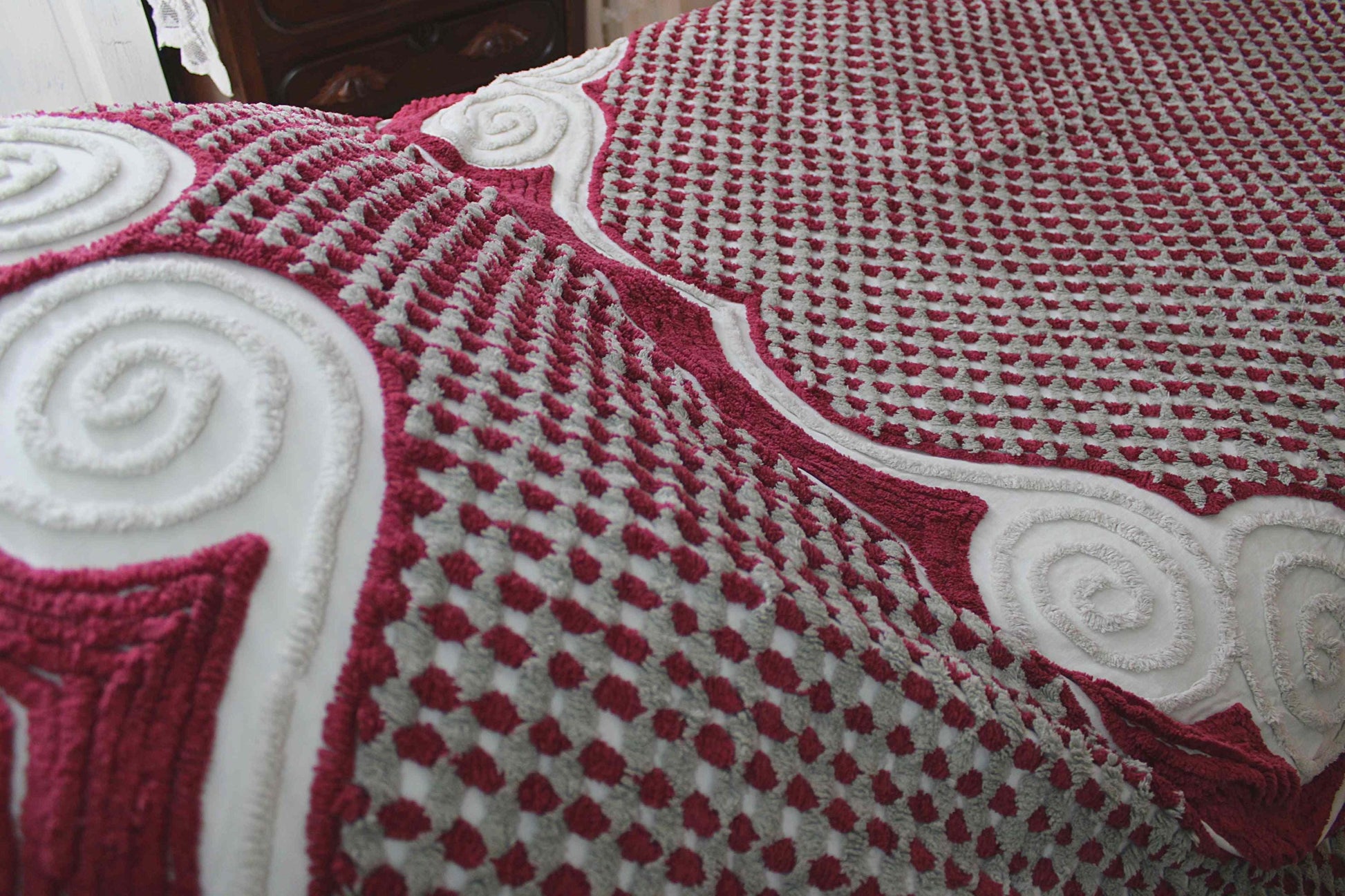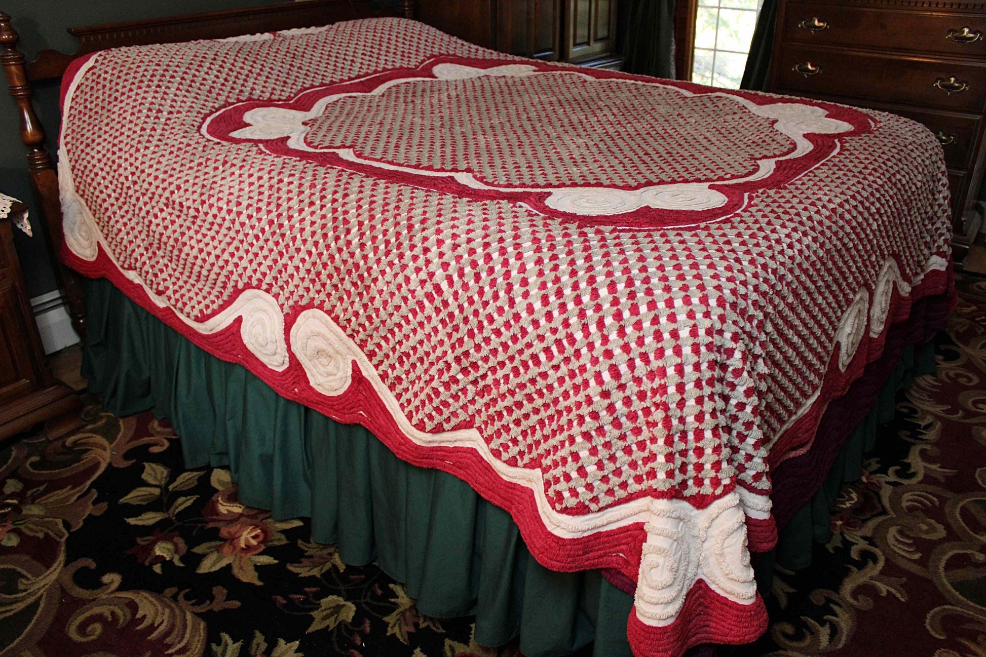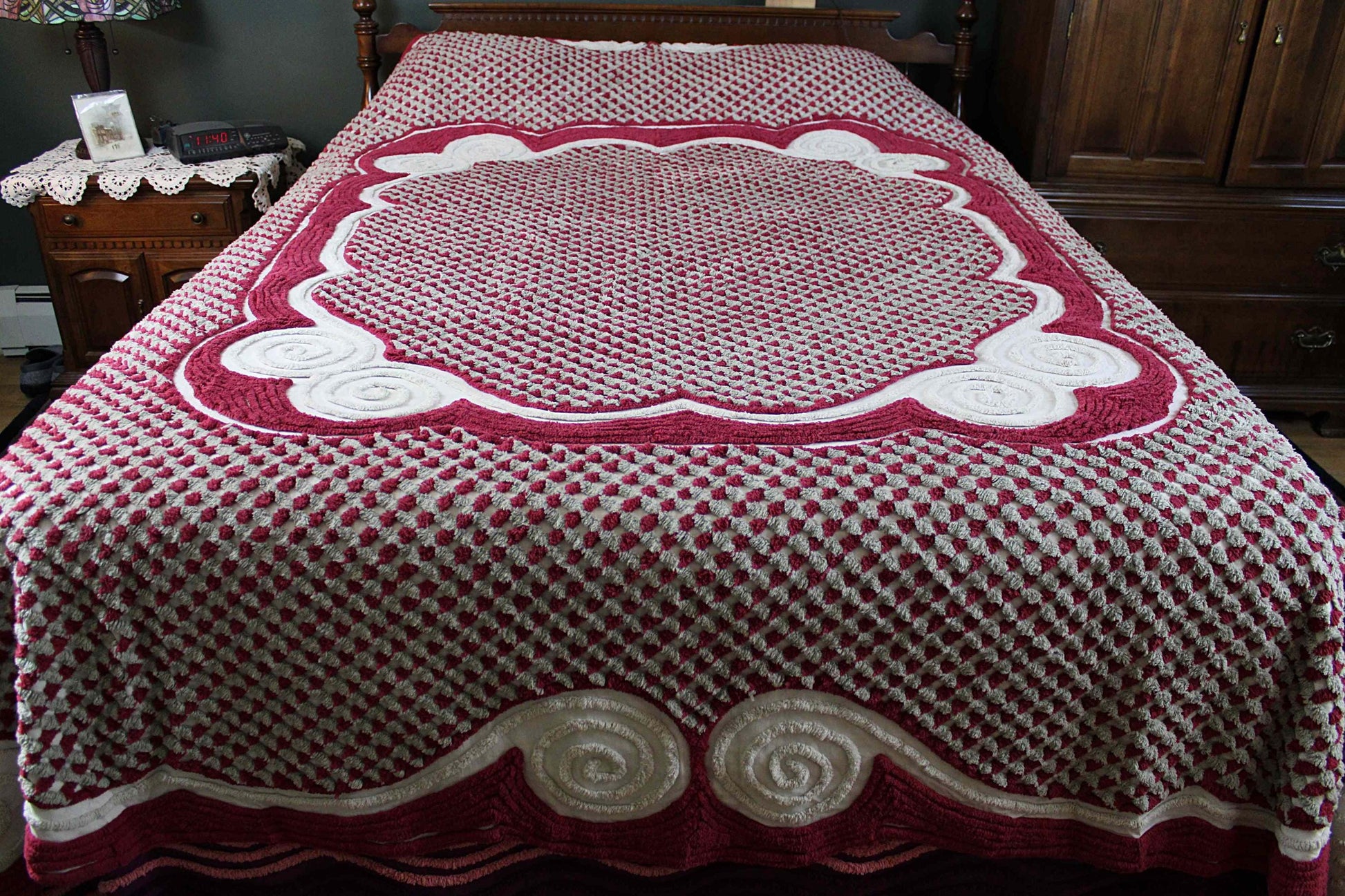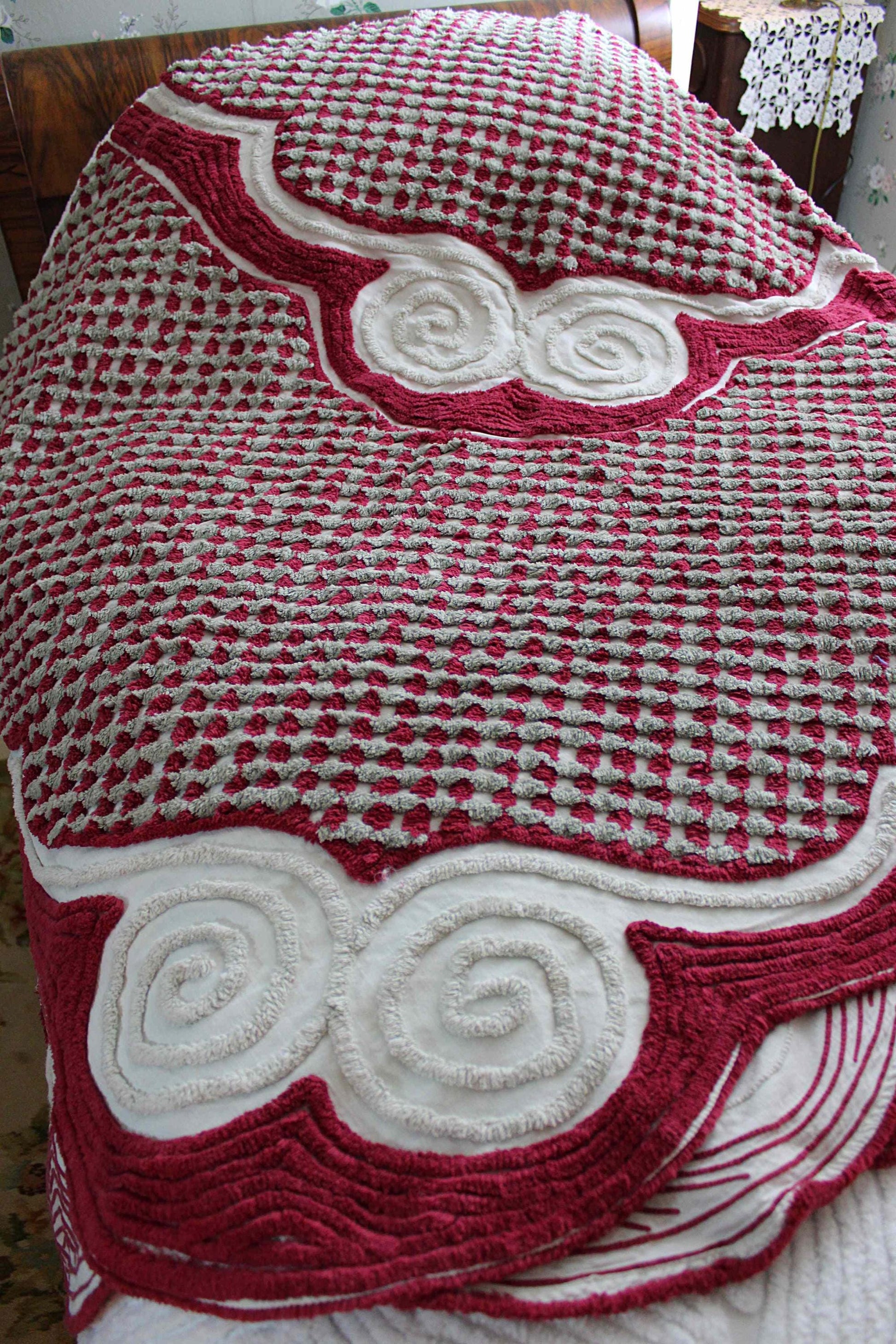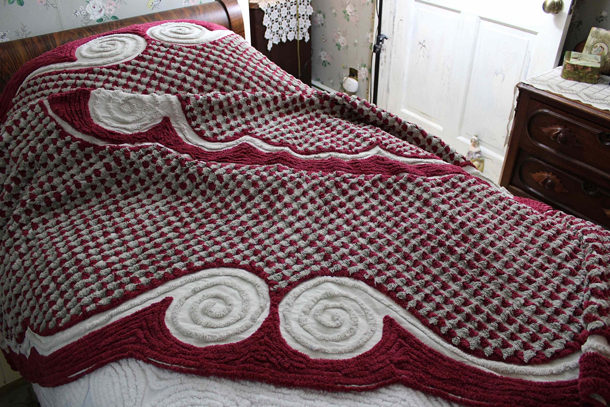 Transform your space with this exceptional vintage chenille bedspread in an ultra plush design that will keep you warm. Dense dove grey and berry red waffle tufting is accented by a light ice gray spiral design. The entirety of the bedspread features a scalloped hemline for a touch of elegance.Very heavy, 100% luxury weight cotton. No fringe. Scallop corners all the way round., Colors remain even and vibrant. Full size bedding, shown on a queen bed.