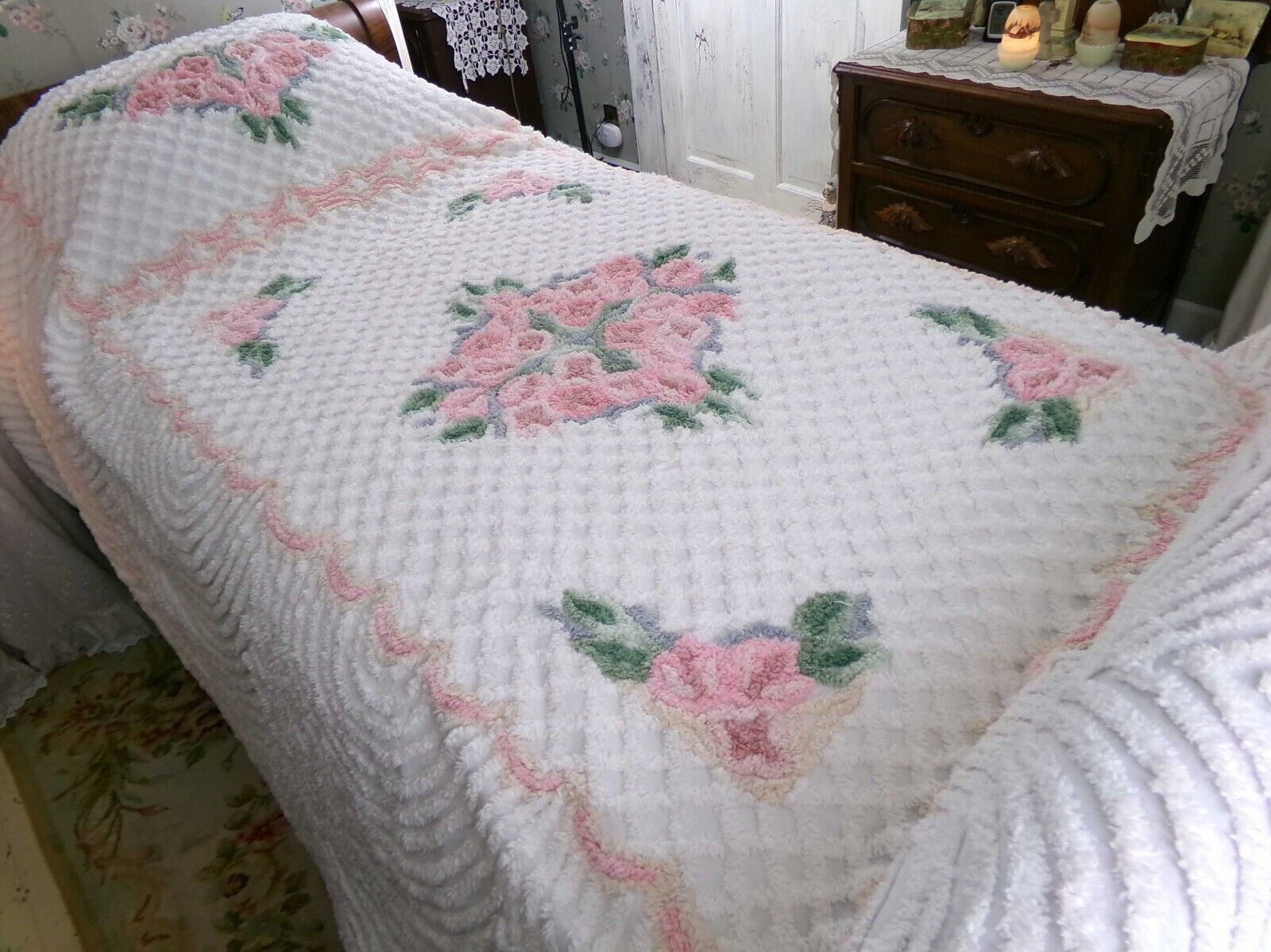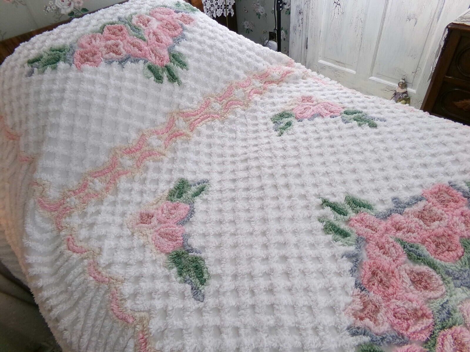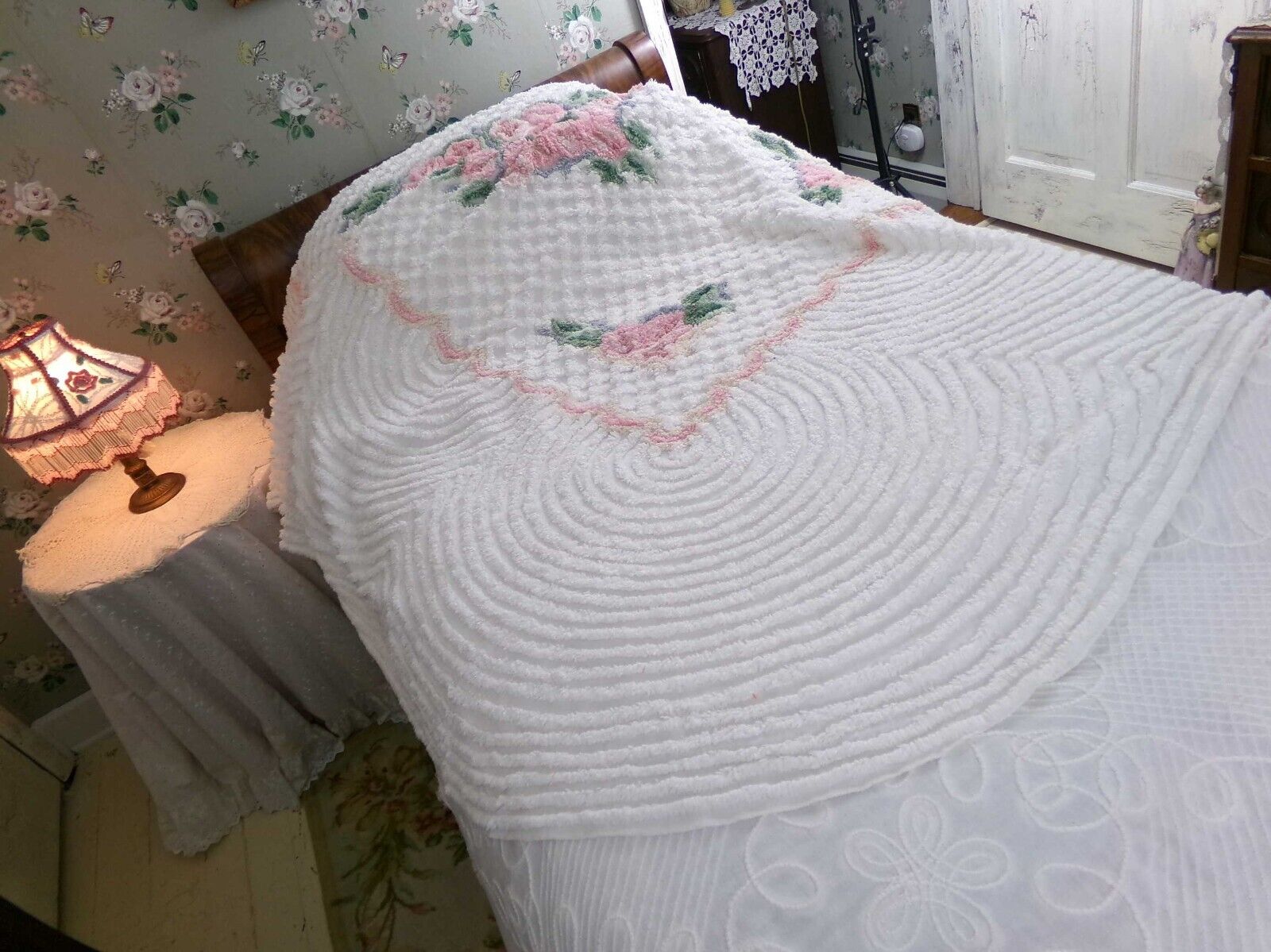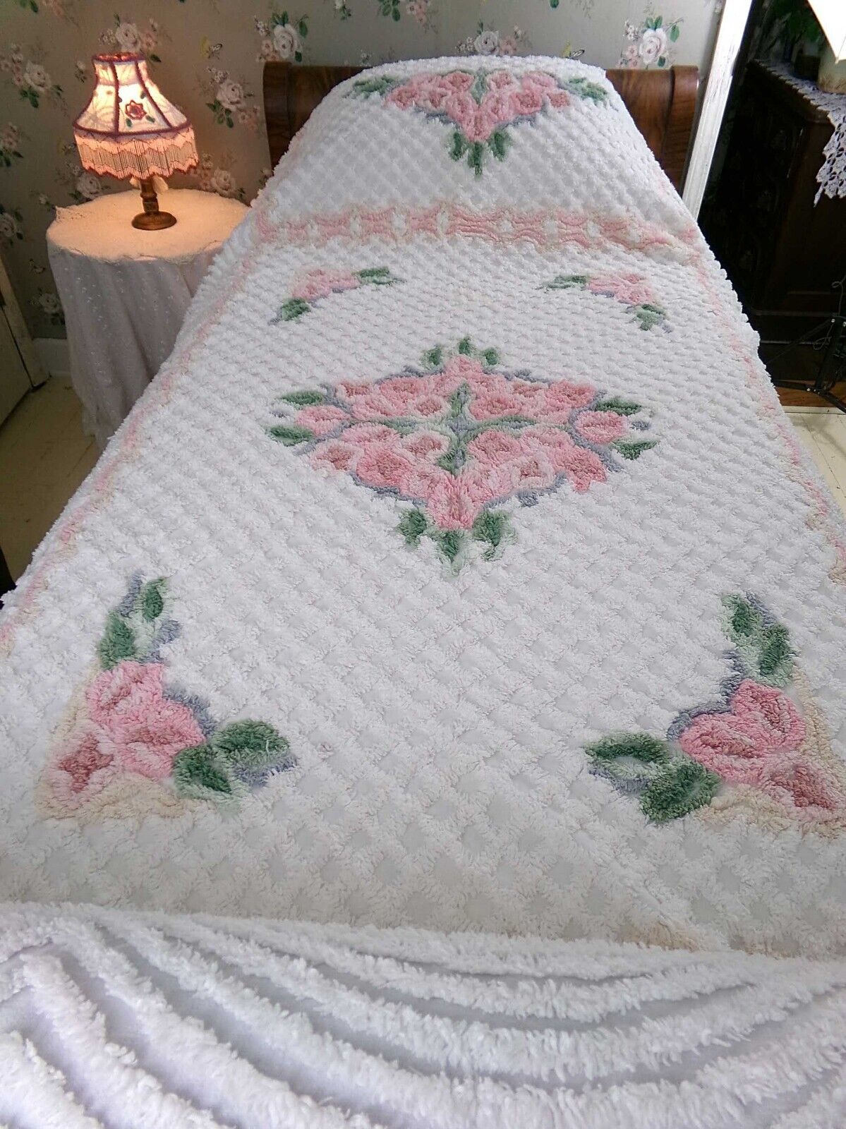 This gorgeous vintage chenille bedspread has all the cottage charm you love in a timeless pink rose floral design set on a thick white lattice pattern. Accented by prominent swooping scallop swirls along the drop sides.This is a weighty, substantial luxury bedspread in a hard-to-find twin size. You could also display this across a favorite chair or on the back of a sofa because it makes a lovely presentation anywhere you put it.