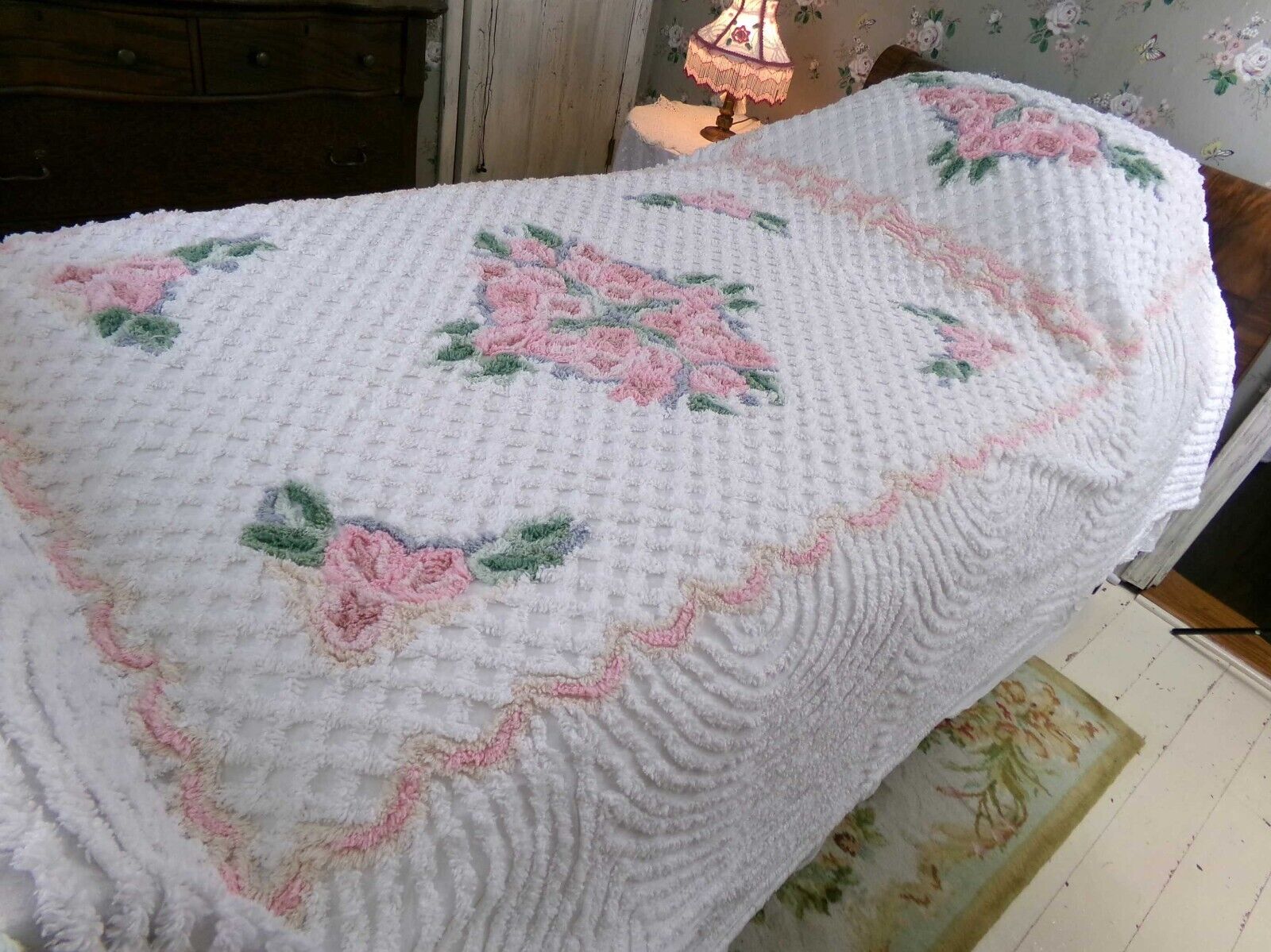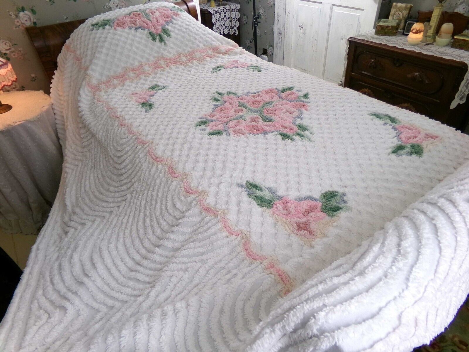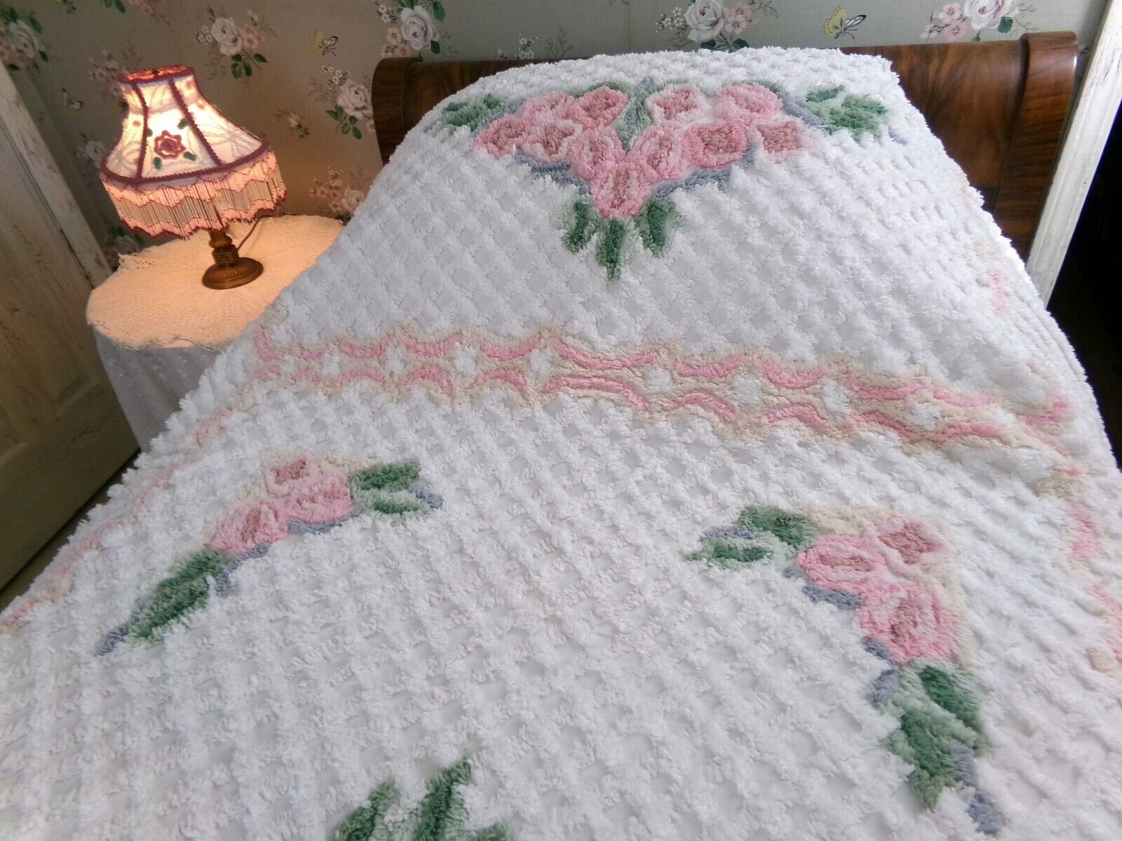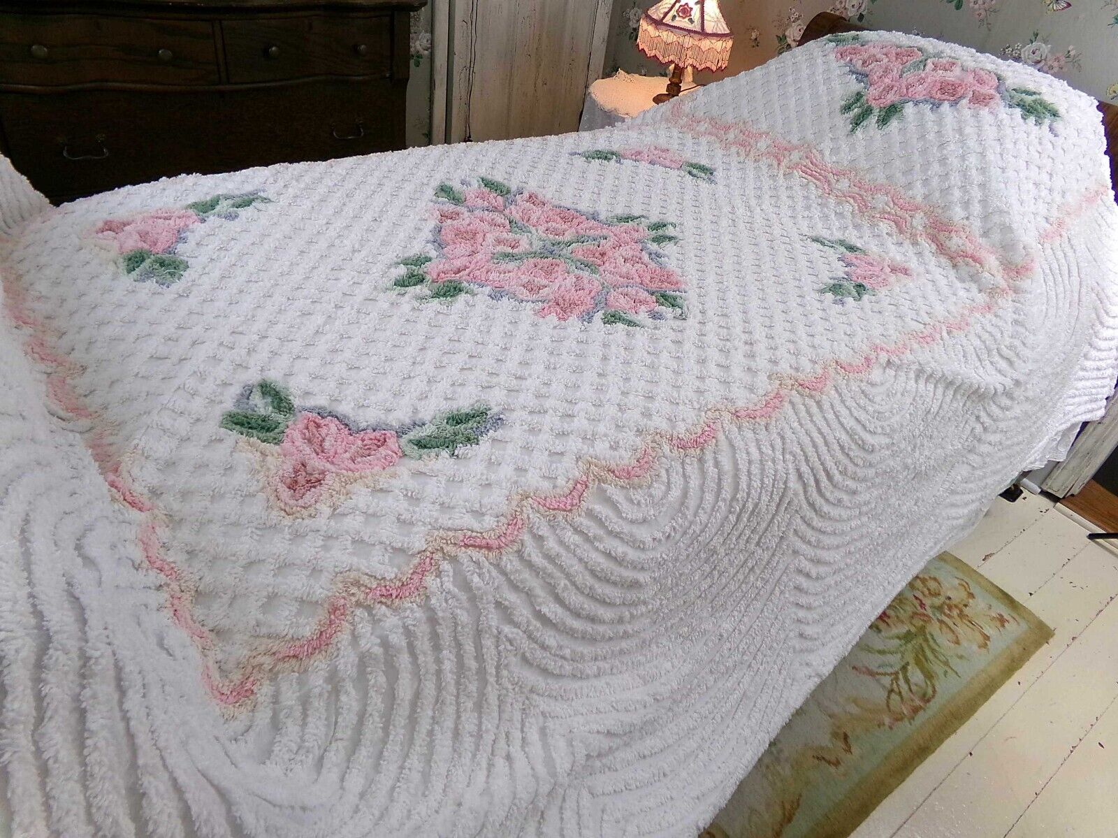 This gorgeous vintage chenille bedspread has all the cottage charm you love in a timeless pink rose floral design set on a thick white lattice pattern. Accented by prominent swooping scallop swirls along the drop sides.This is a weighty, substantial luxury bedspread in a hard-to-find twin size. You could also display this across a favorite chair or on the back of a sofa because it makes a lovely presentation anywhere you put it.
