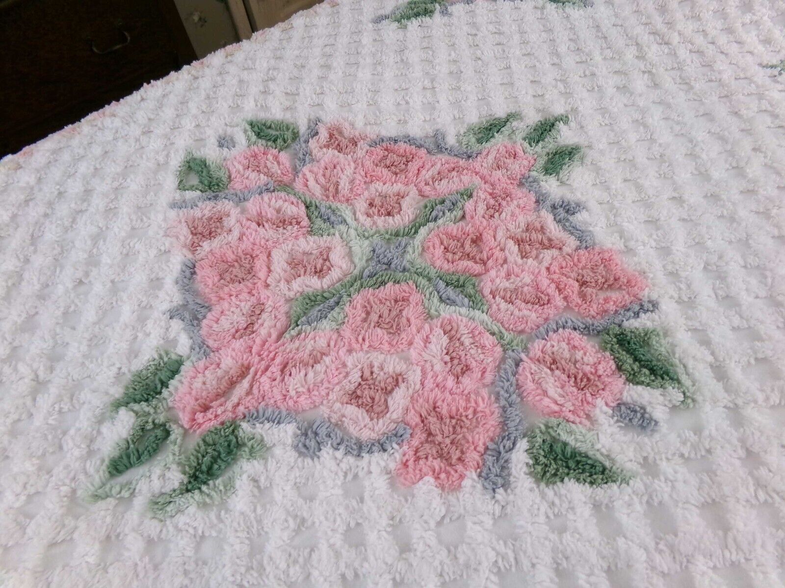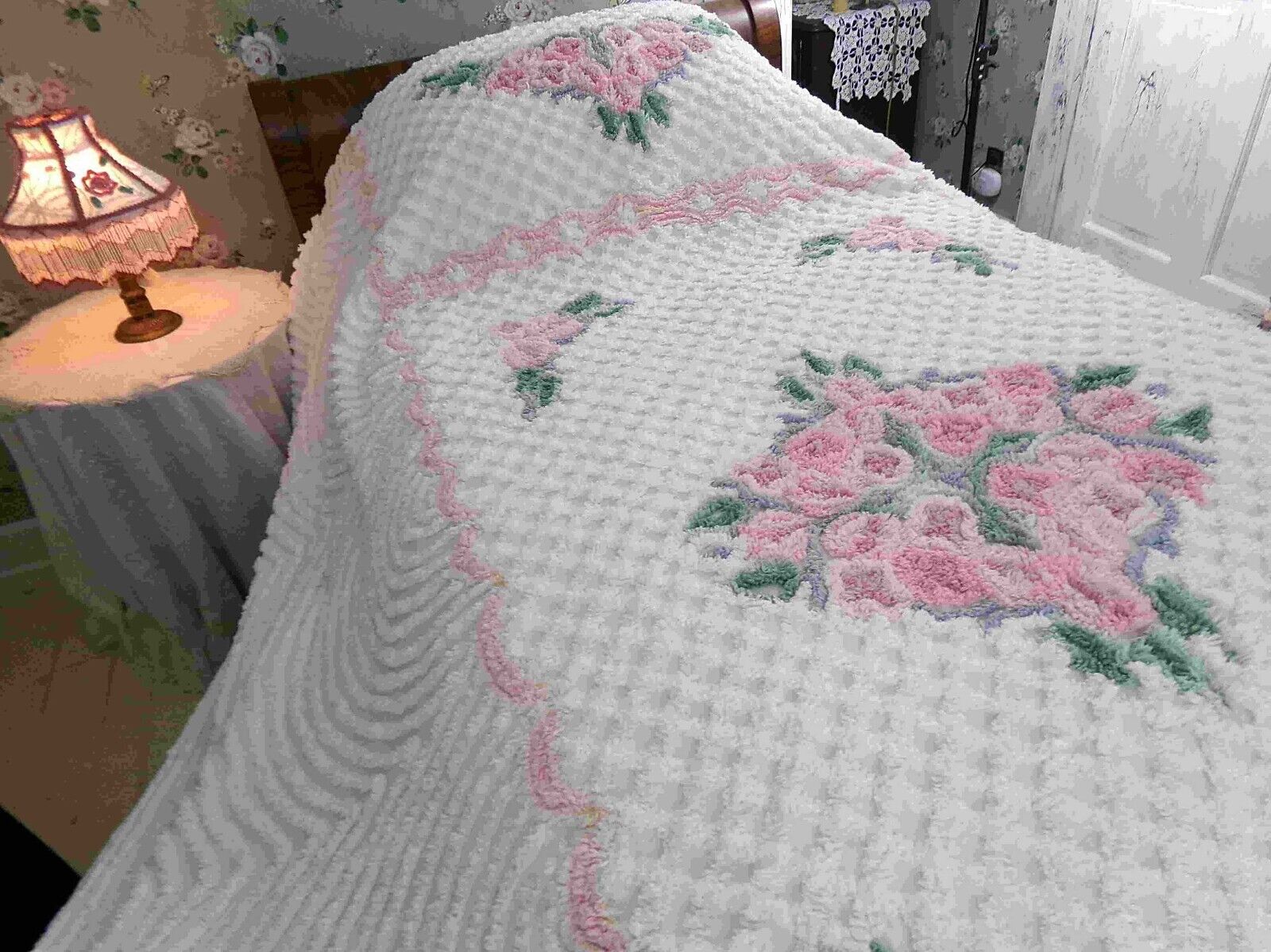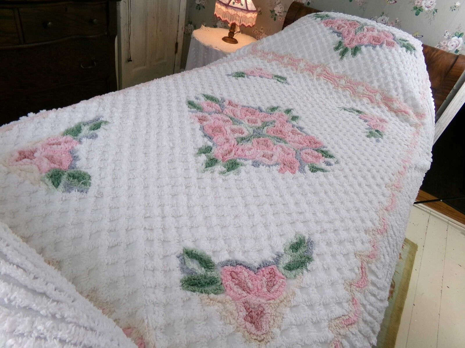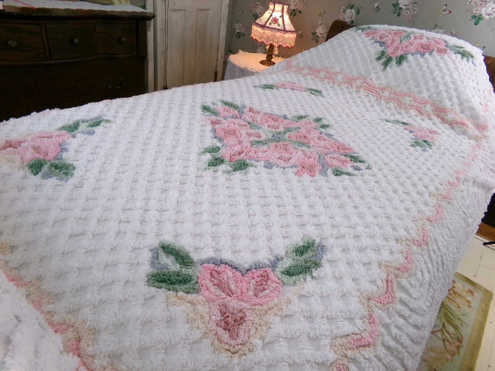 This gorgeous vintage chenille bedspread has all the cottage charm you love in a timeless pink rose floral design set on a thick white lattice pattern. Accented by prominent swooping scallop swirls along the drop sides.This is a weighty, substantial luxury bedspread in a hard-to-find twin size. You could also display this across a favorite chair or on the back of a sofa because it makes a lovely presentation anywhere you put it.