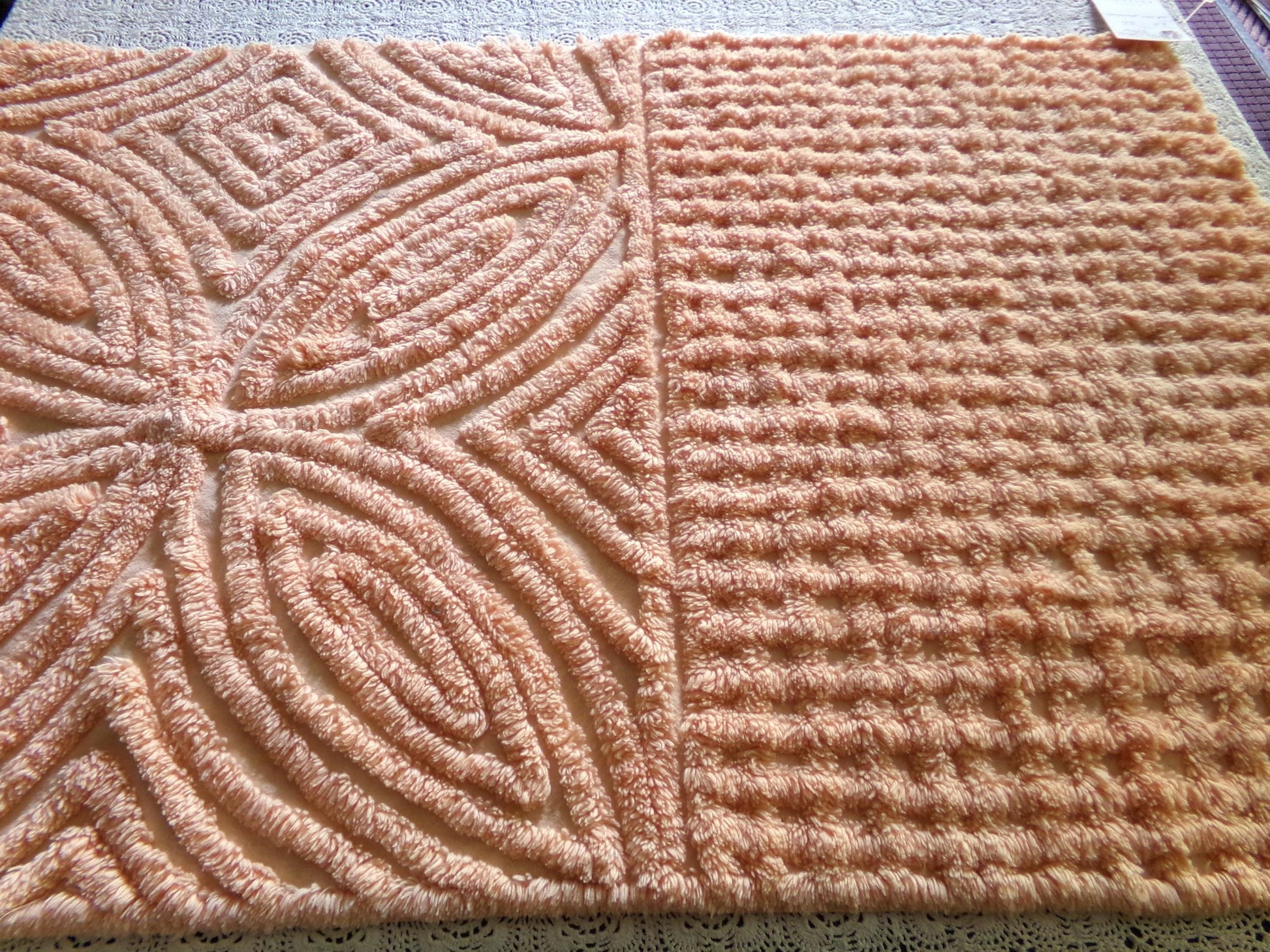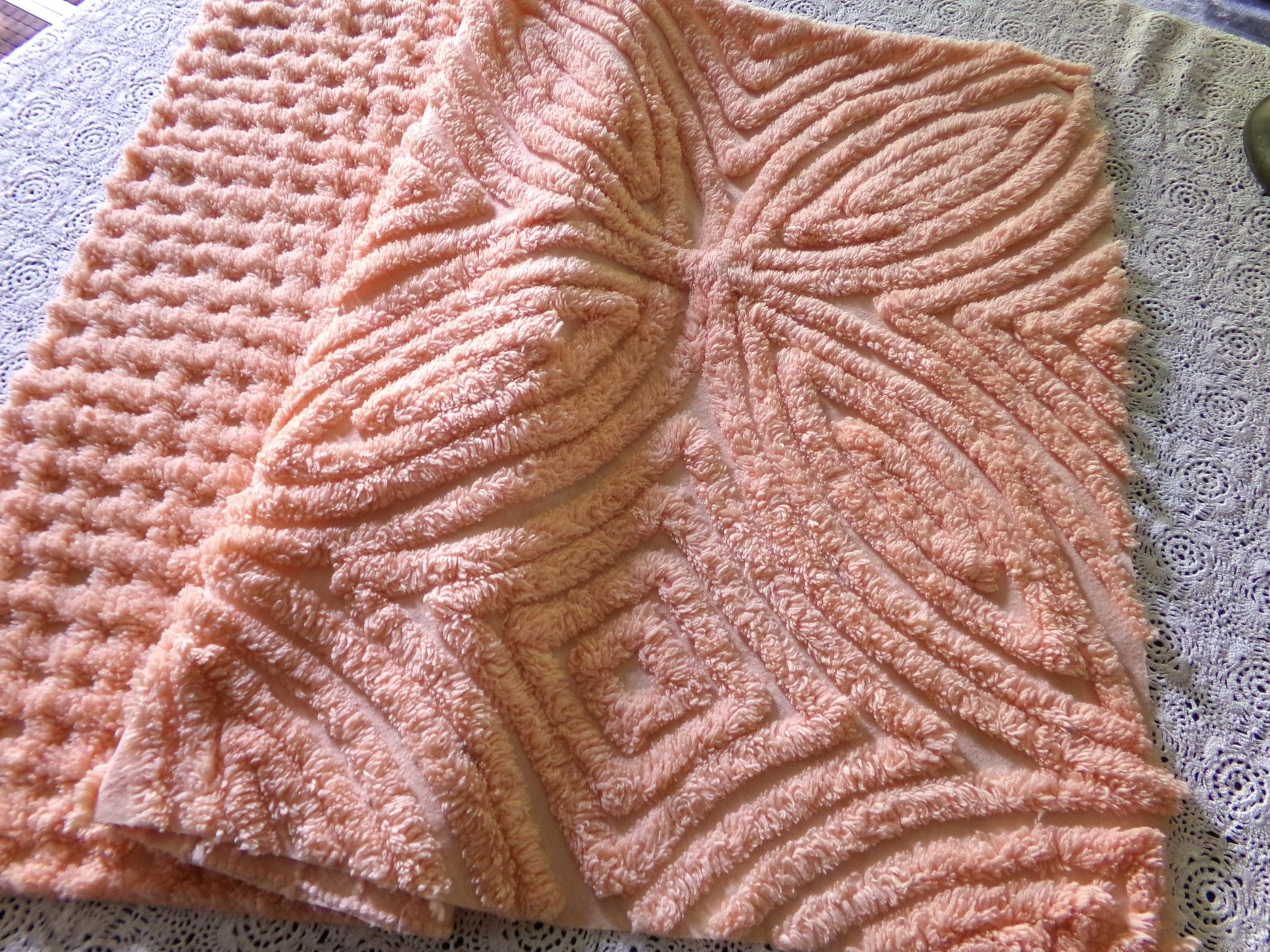 Beautiful, plush peach glow chenille tufting this fabric piece. It features a split design, with one side a thick waffle grid tuft, and the other, a geometric flower petal design. This is a traditional 1940s era shade of cozy peach glow orange, see color comparison img #3. Cotton fabric, approx 20" x 32" inches. Light age discoloration to an edge & a small pinhole.w h a t - t o - k n o w