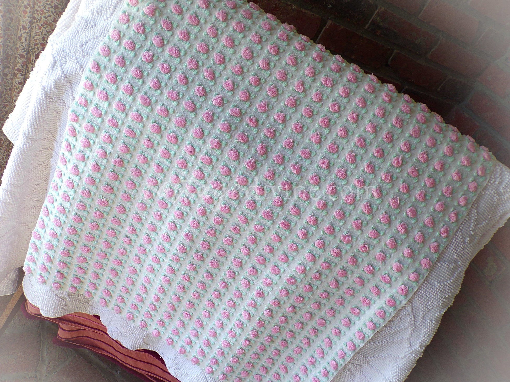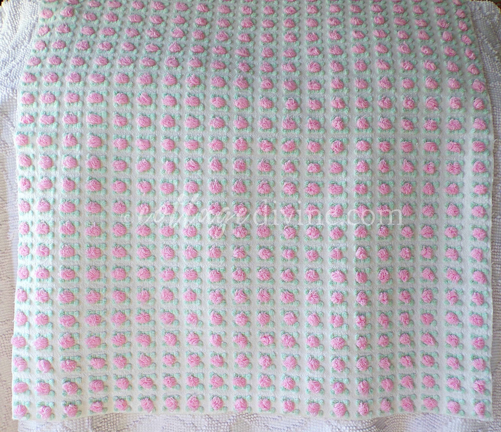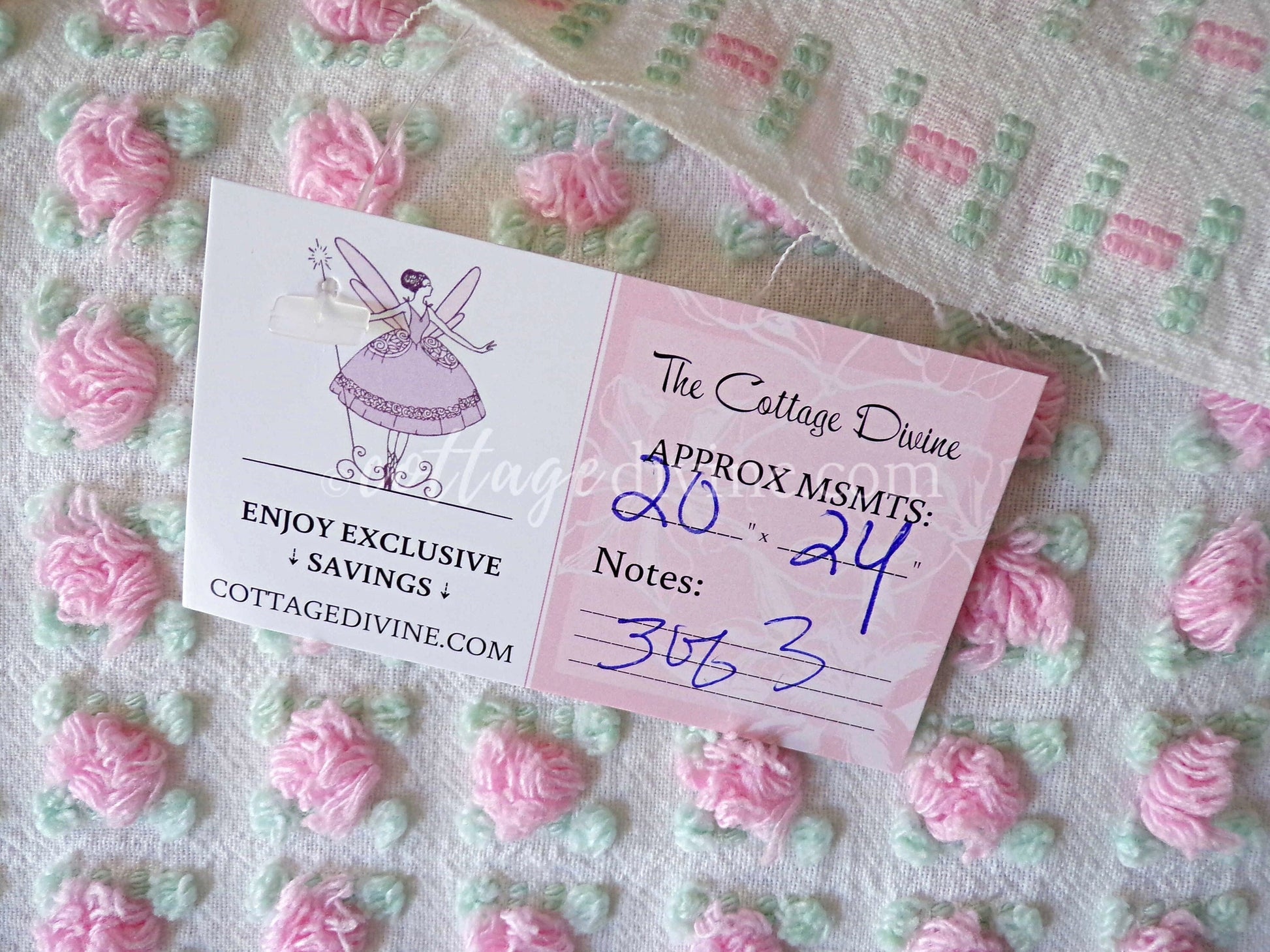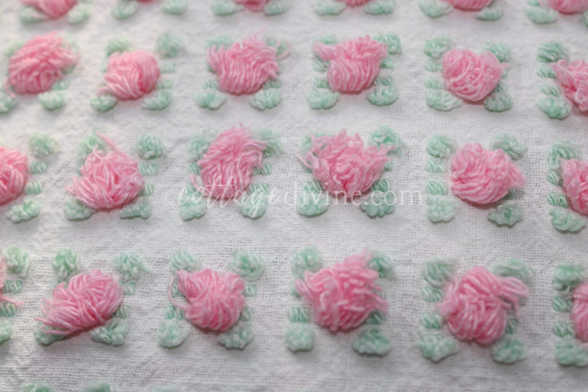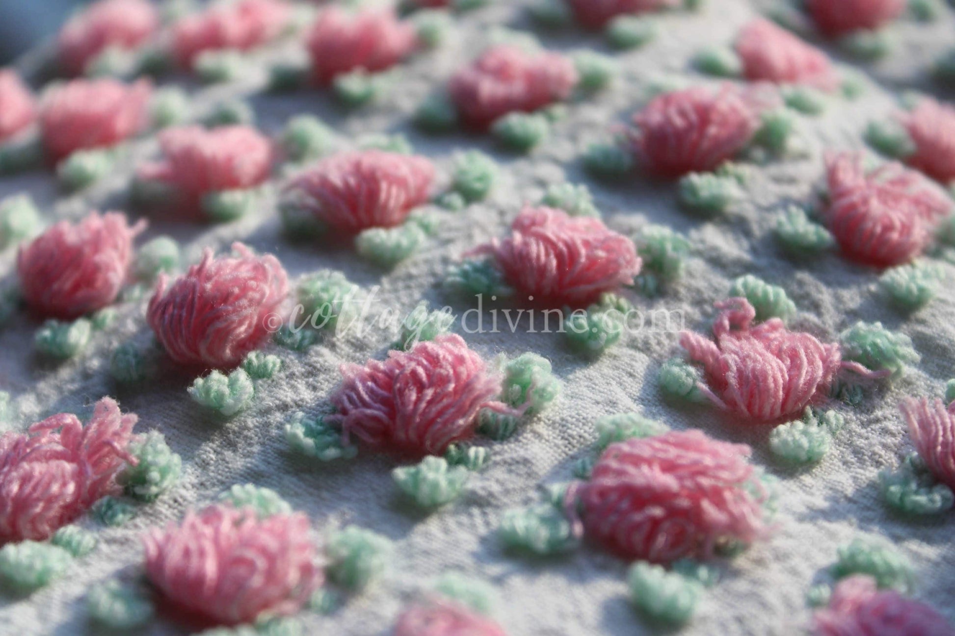 One of the most popular of all vintage chenille patterns, this 20" x 24" inch fabric piece was sourced from an original pink rosebud bedspread by Morgan Jones.Classic pink rosebuds are flanked by mint green leaves - ideal to incorporate in handmade chenille quilts, DIY pillows, and just about any other design that demands cottage charm. Photos taken in a variety of lighting situations to show the pink tone of the roses.
