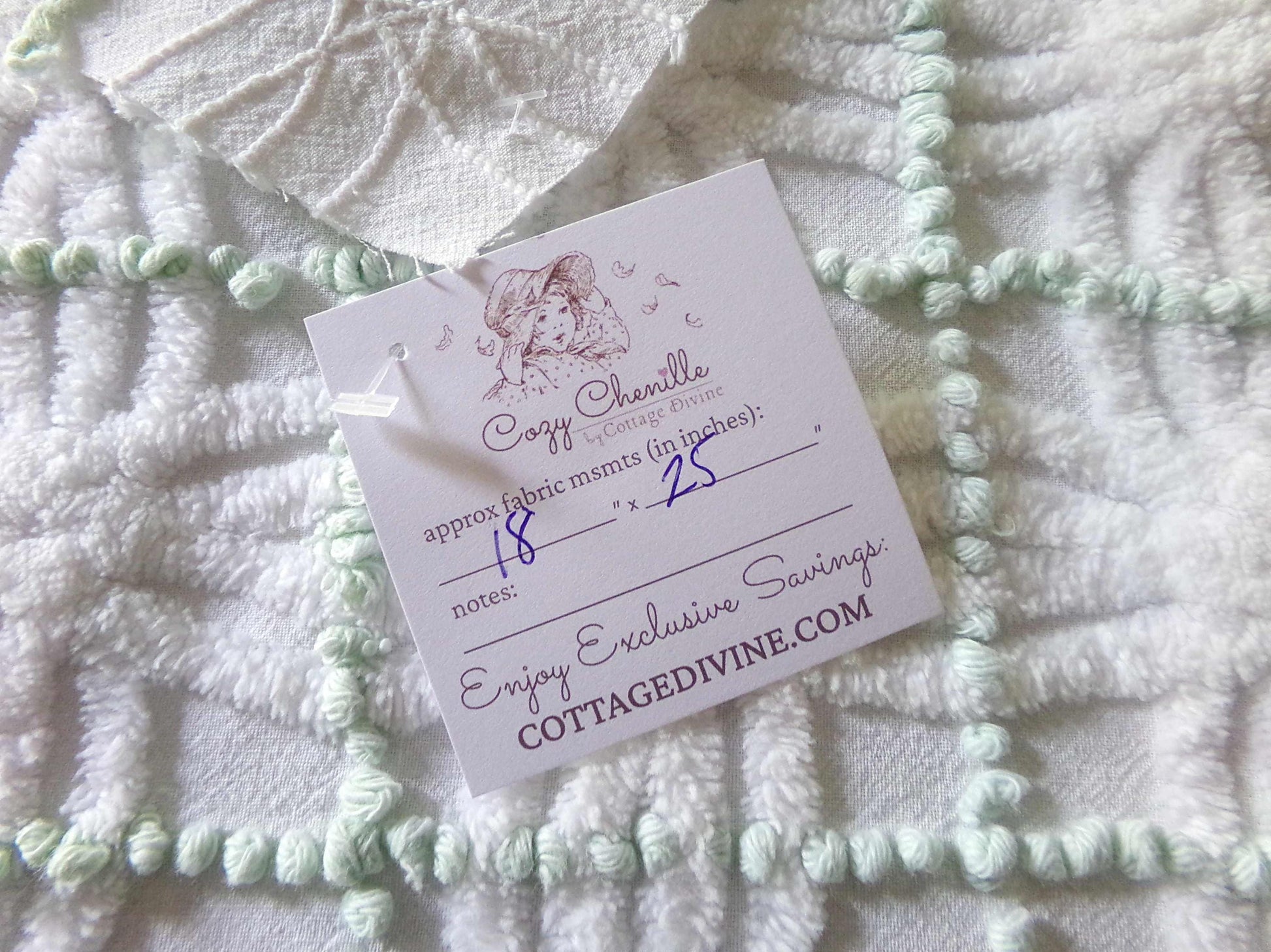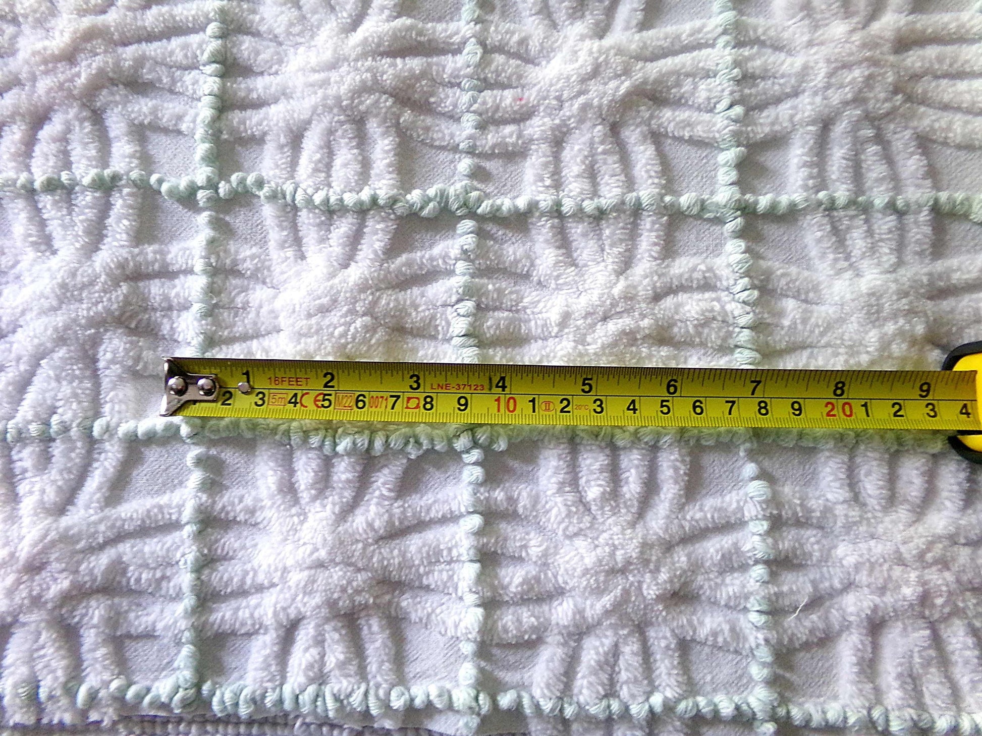A very popular colorway and design, this vintage chenille fabric features a plush spider tuft wedding ring design in snowy white, accented by tiny mint green pearl pops. Ideal in handmade chenille quilts, pillows & more.100% cotton. Measures about 25" x 18" inches. Small pinholes/pulls such as seen final img.