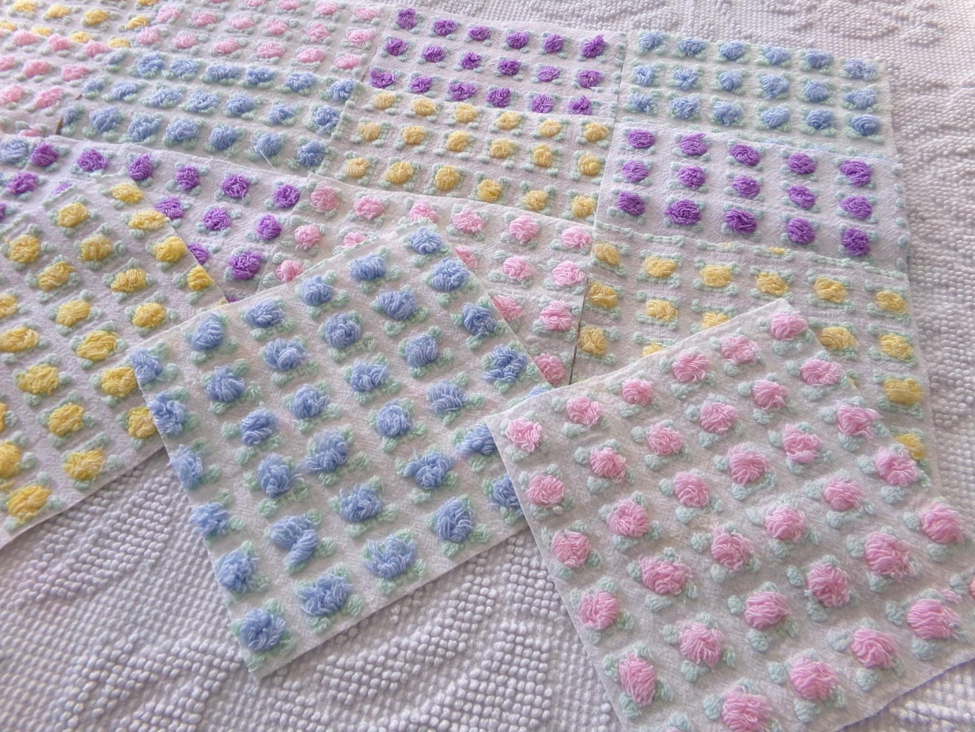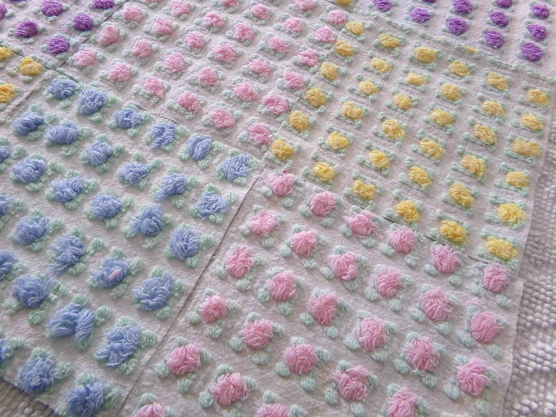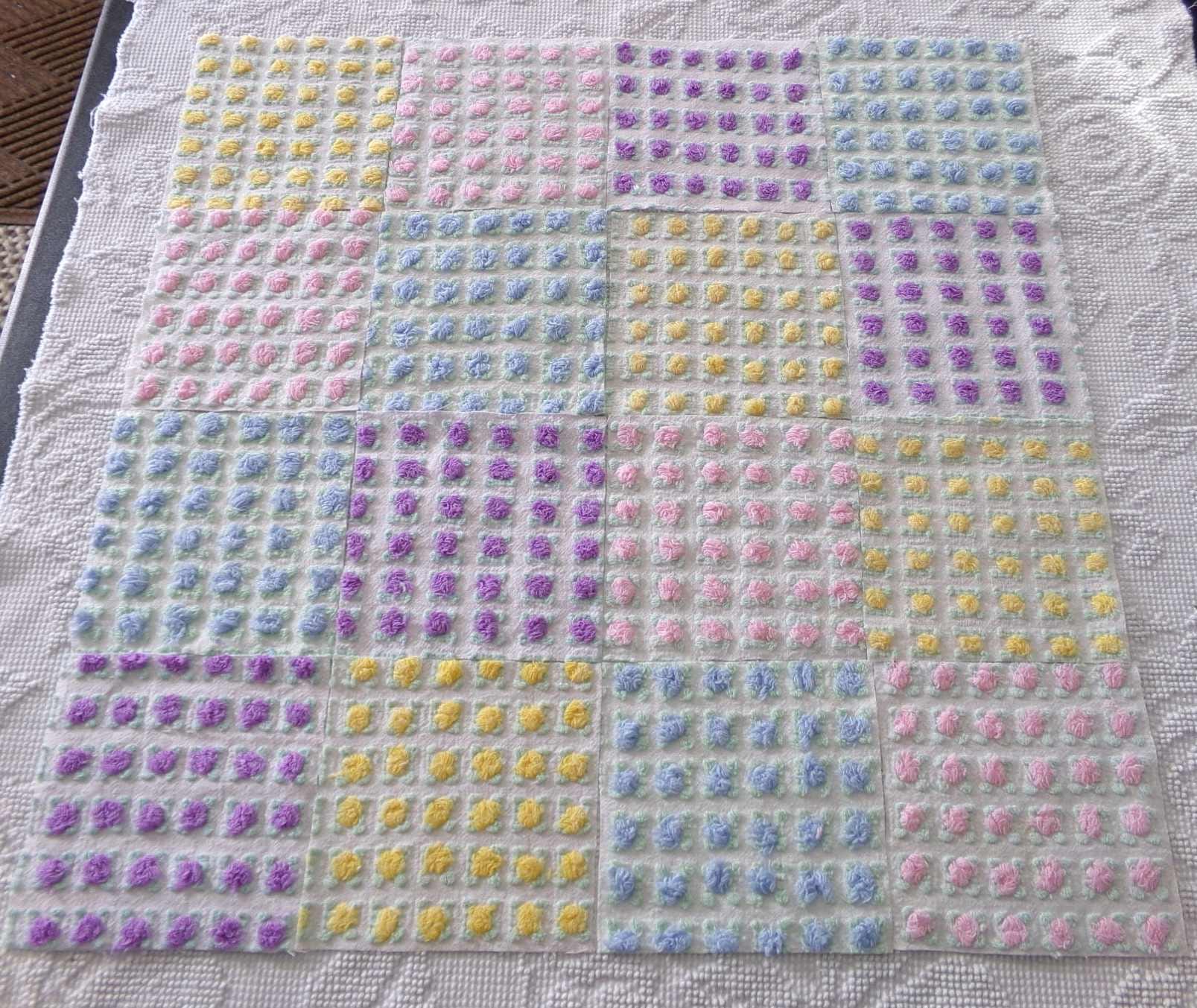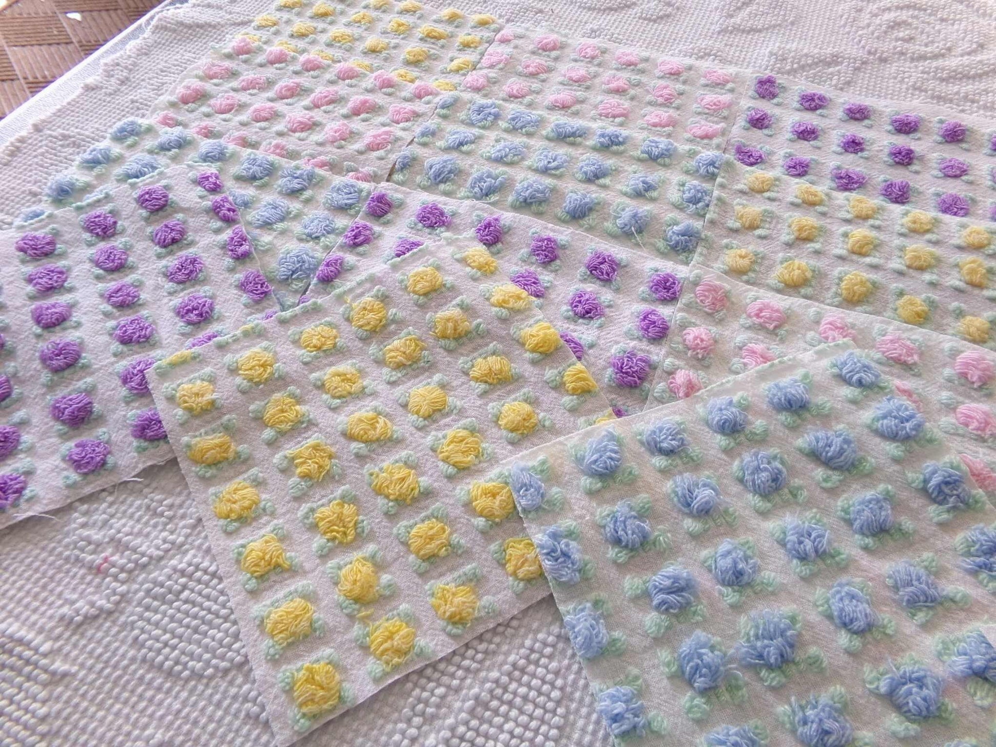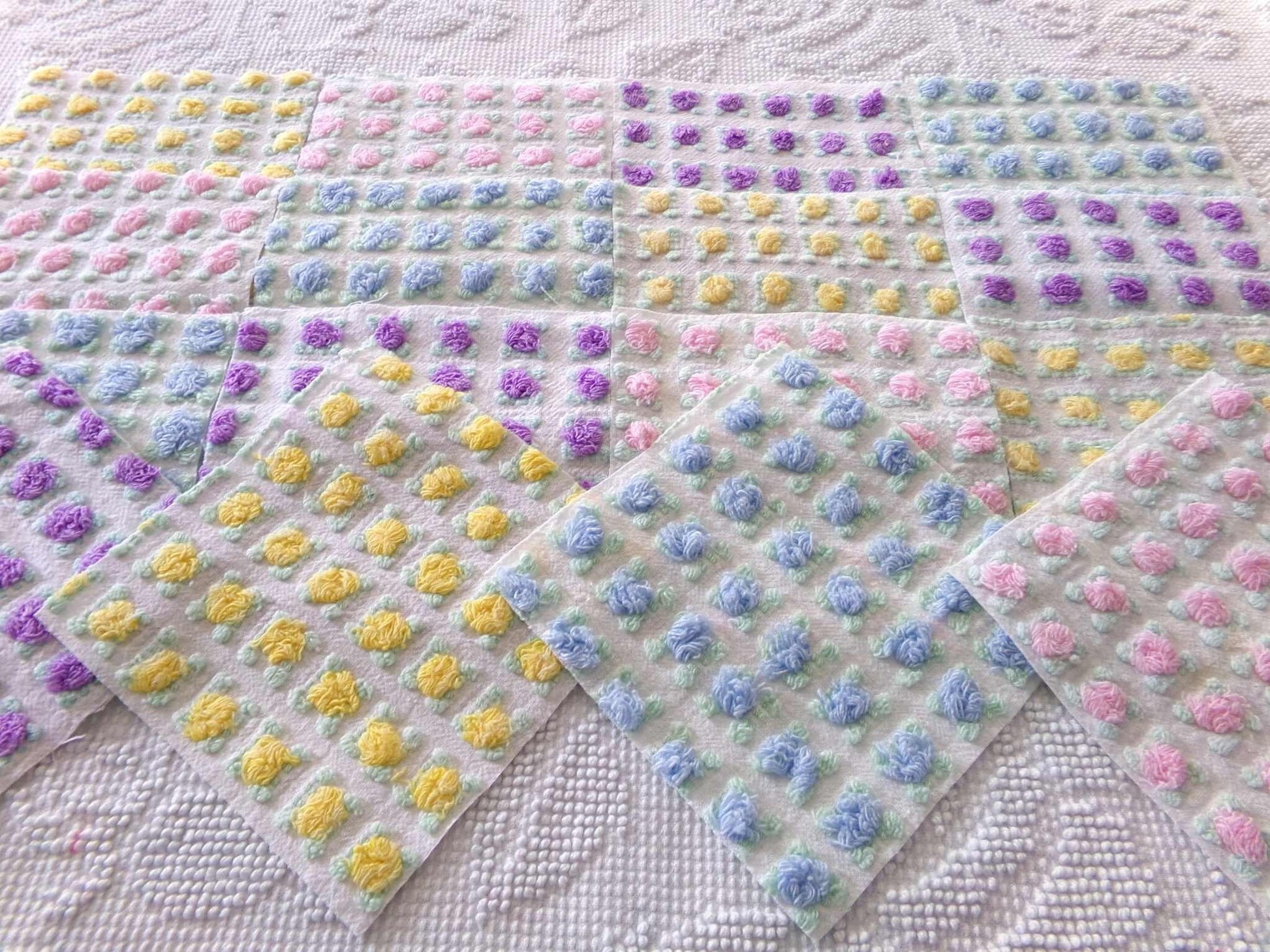 "All the Rosebuds"...this premium set of vintage chenille quilt squares features a sampling of four of the most popular rosebud colors: pretty pink, amethyst purple, summer sky blue and sunshine yellow. All are hand selected and cut from original Morgan Jones rare rosebud chenille bedspreads from the 1960s.::total qty: 16 chenille quilt squares