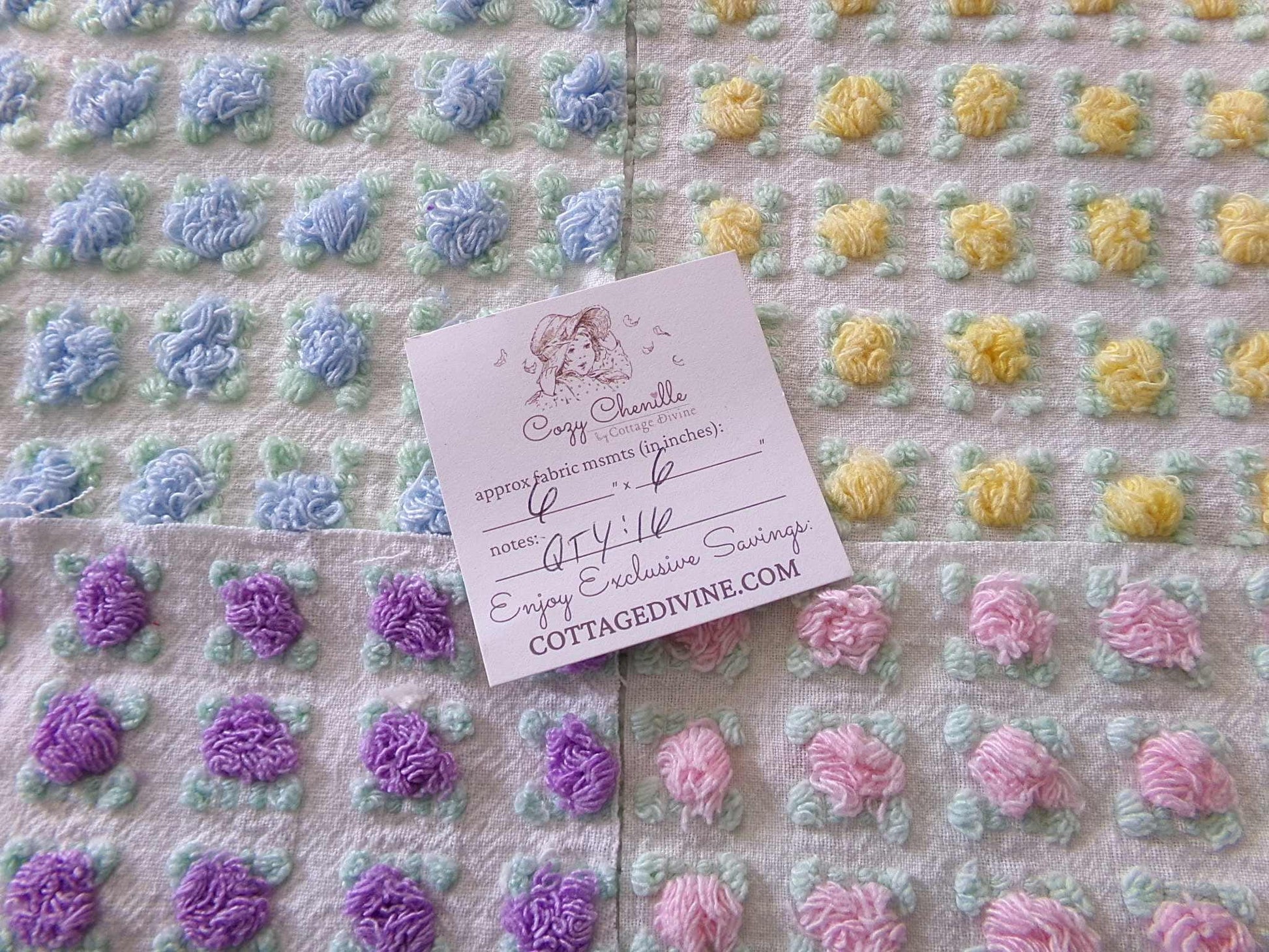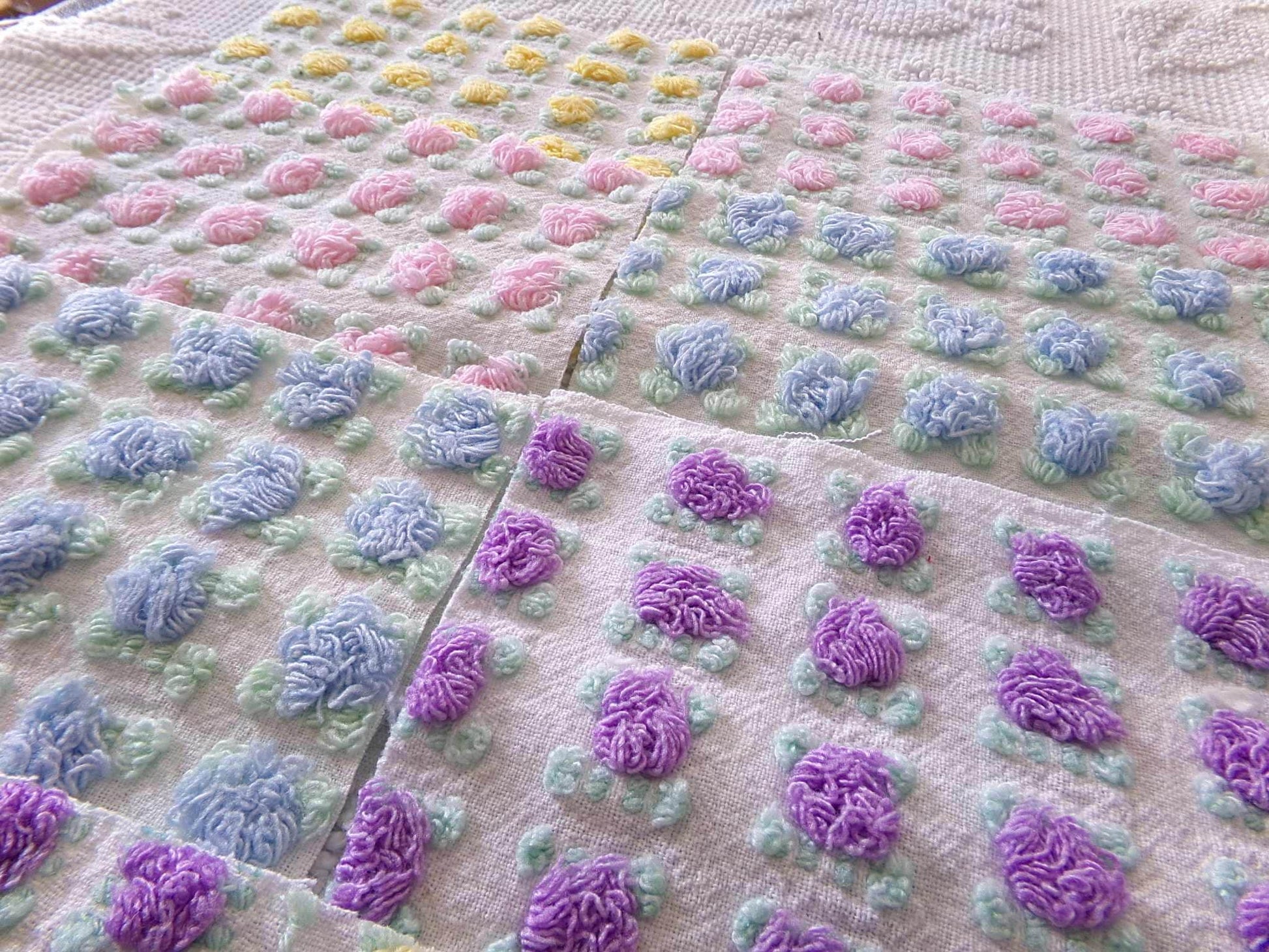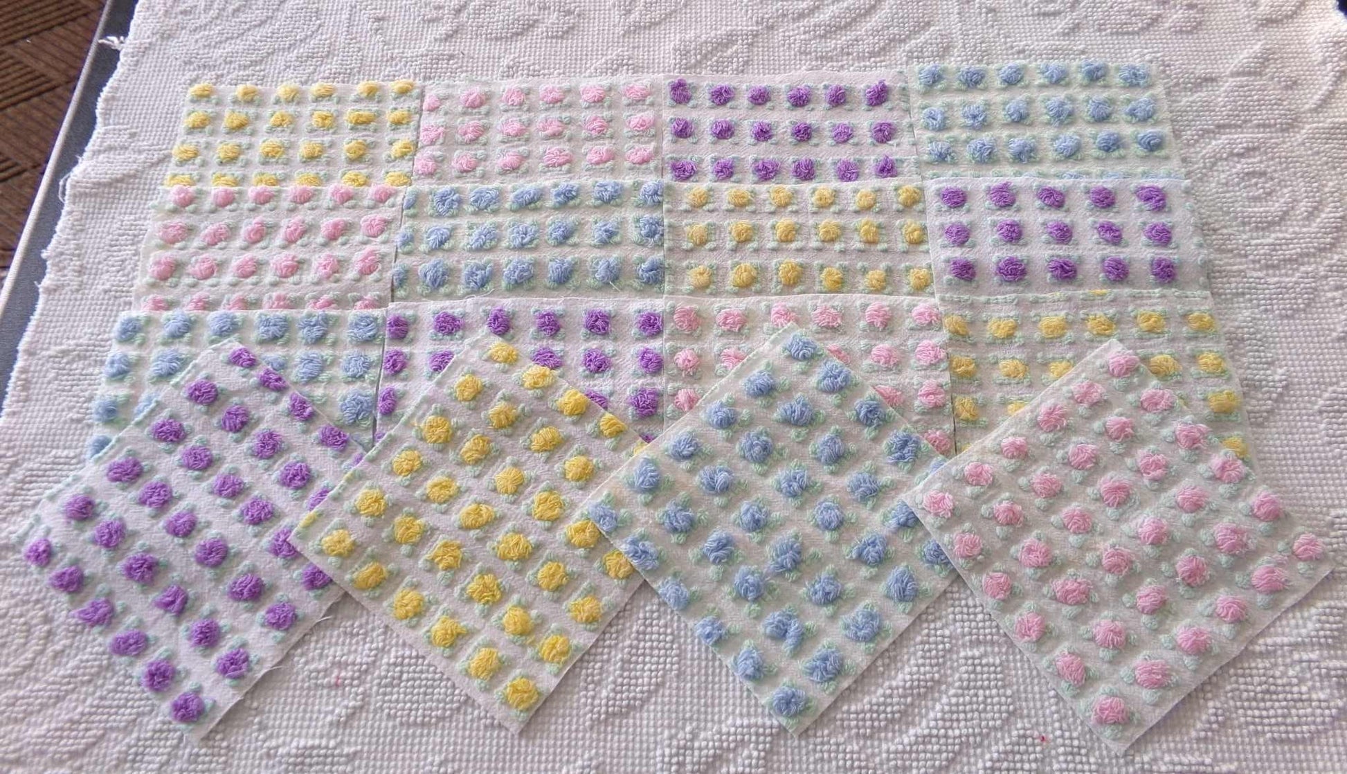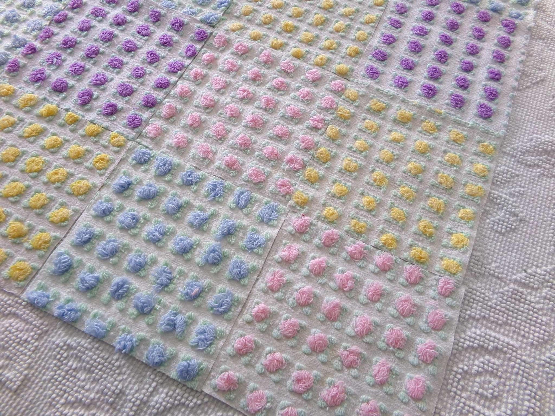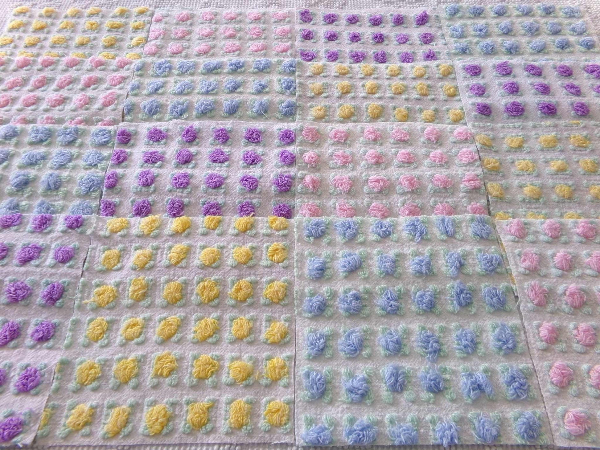 "All the Rosebuds"...this premium set of vintage chenille quilt squares features a sampling of four of the most popular rosebud colors: pretty pink, amethyst purple, summer sky blue and sunshine yellow. All are hand selected and cut from original Morgan Jones rare rosebud chenille bedspreads from the 1960s.::total qty: 16 chenille quilt squares