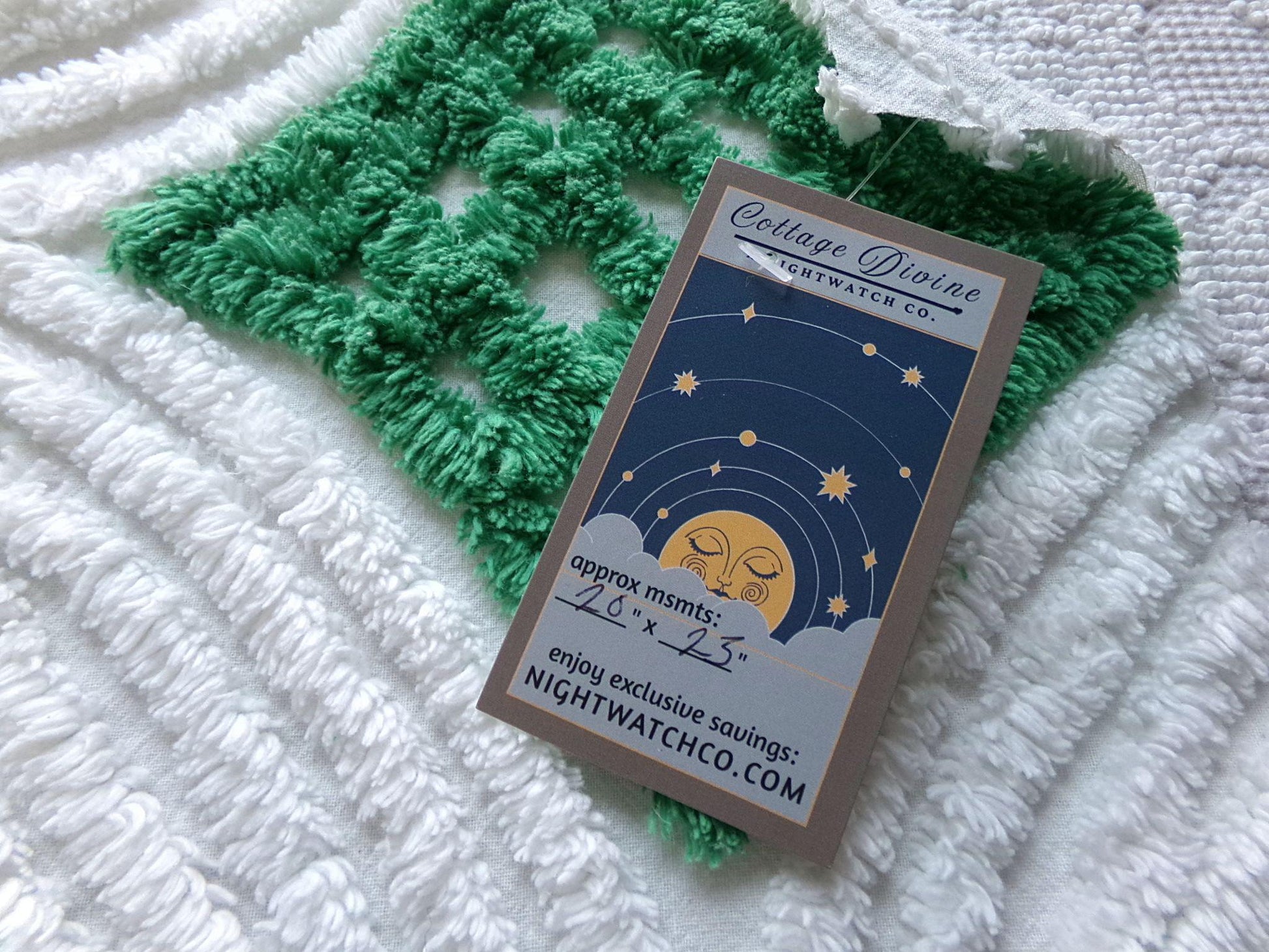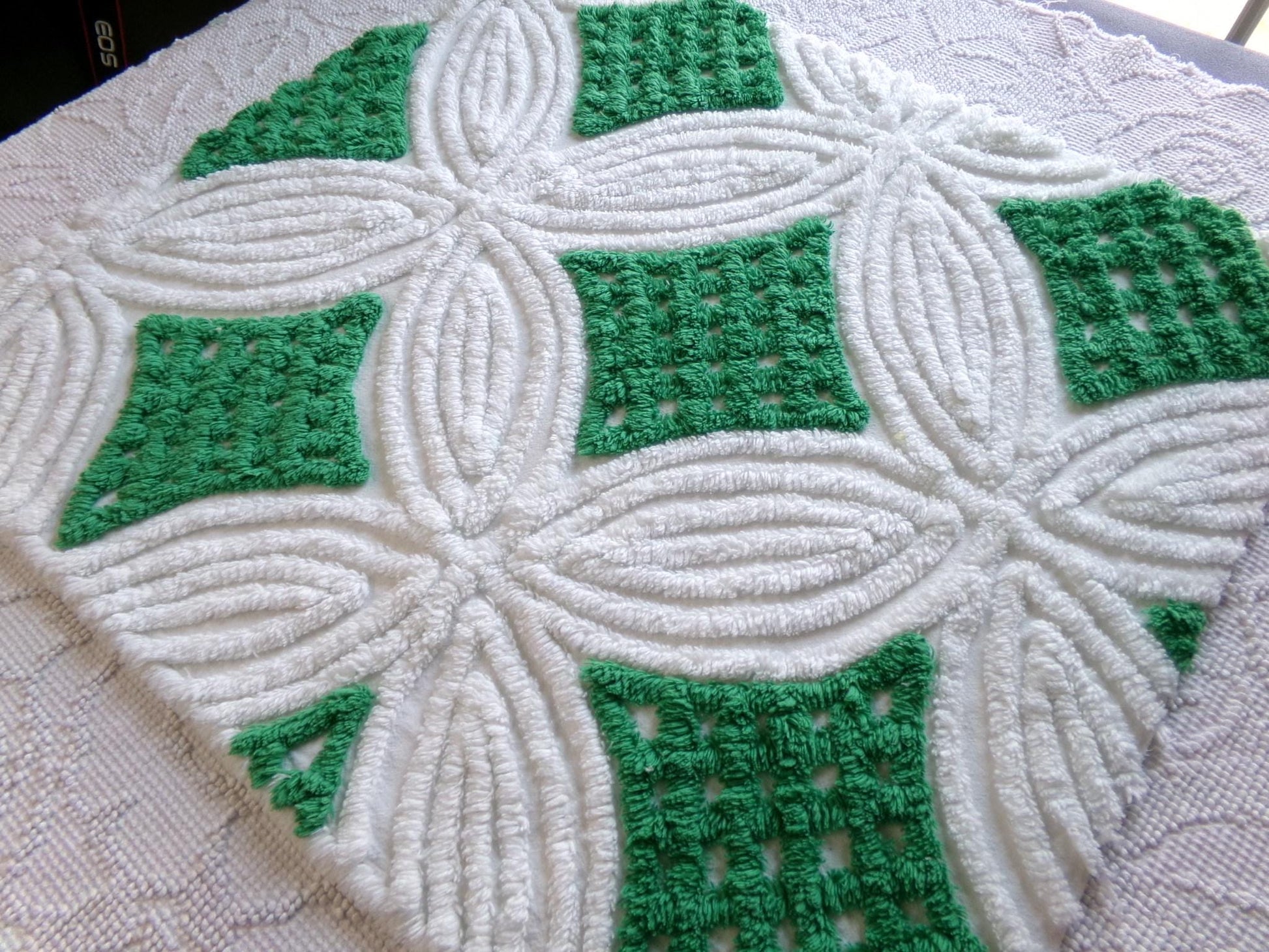 What will you create with this eye-catching fabric? This chenille fabric piece features an unusual color combination not often seen: preppy kelly green contrasting with white. Together, these colors and unique pattern create an outstanding visual presentation in any project.Fabric piece measures approx 23" x 20" inches. 100% plush weight cotton with thick tufting. Sourced from an original vintage chenille bedspread. Original fabric from the 1950s; you may notice a few light pinholes.