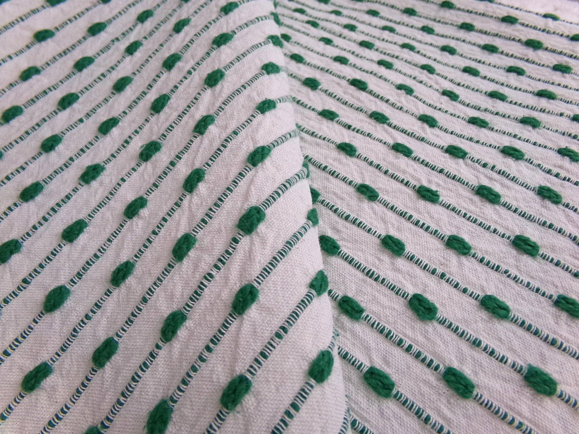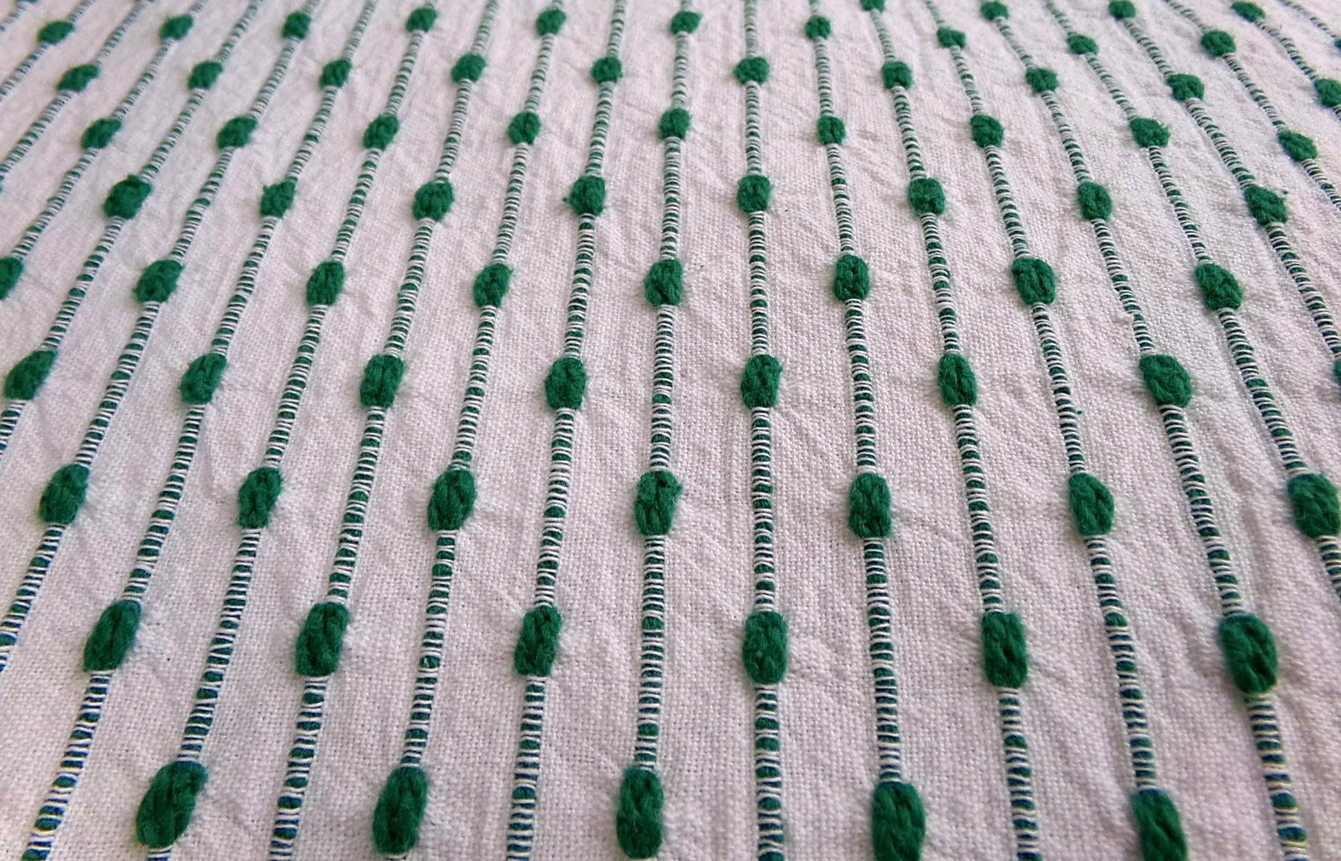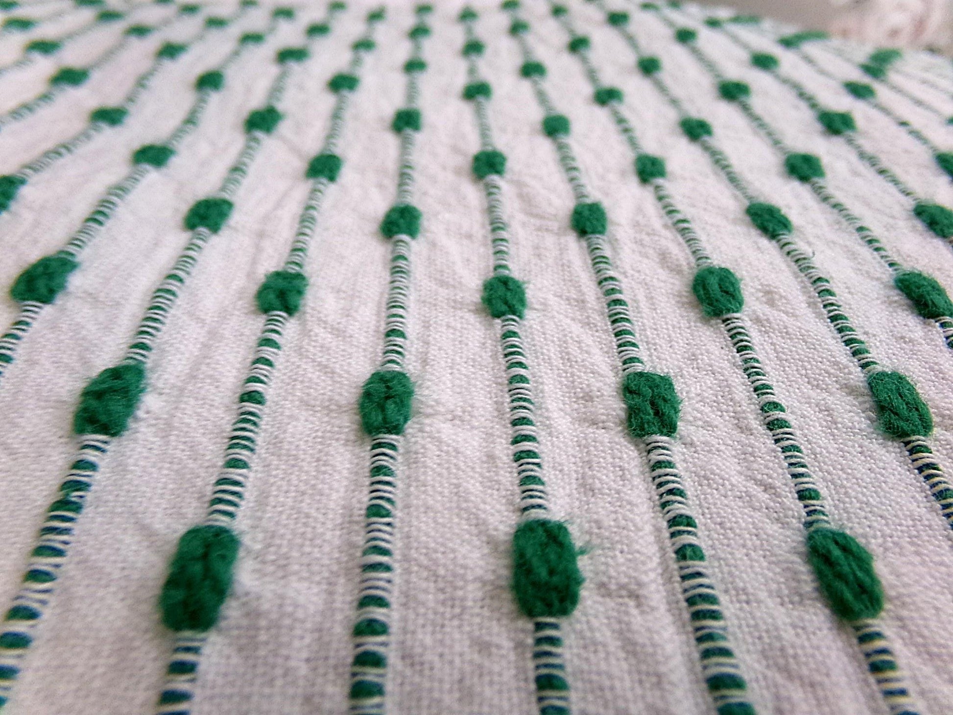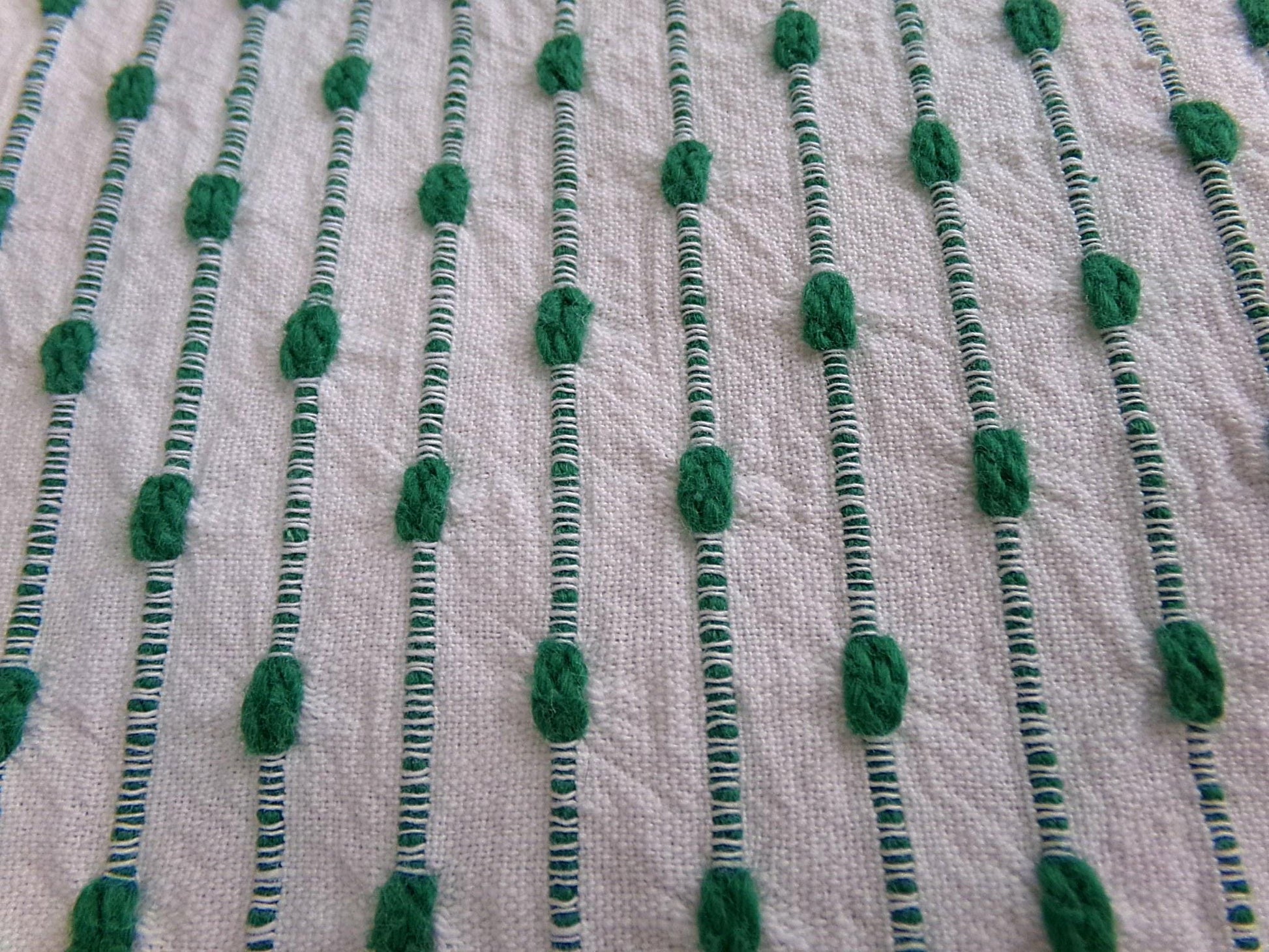 This is one of my most favorite vintage fabrics - little kelly green "pinstripes" feature a unique chenille texture, set on a white woven background. I love this fabric because you can easily incorporate into so many different projects: think Christmas stockings, holiday quilts, festive pillows. The kelly green color also looks fantastic paired with preppy blues and yellows for coastal chic designs.Approx msmts: 20" x 25" inches. Lightweight woven cotton. A rare Bates design.