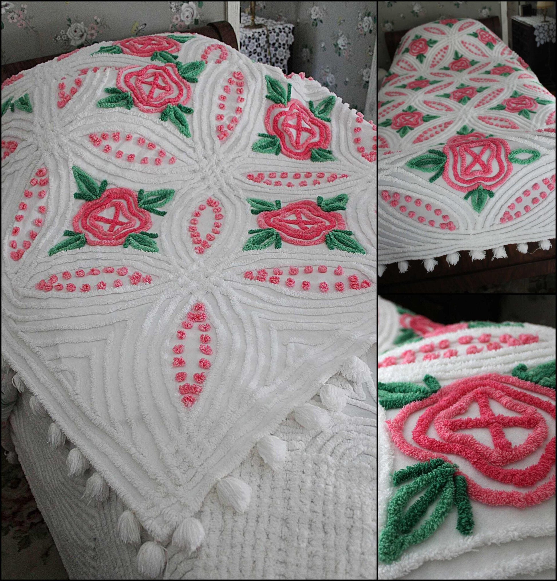 "Princess Pink Rose"...a splendid vintage chenille bedspread from the midcentury era in one of the most popular patterns - a beautiful pink rose design set on a white background, accented with sweet pink puff dots.This vintage bedspread is a great way to infuse classic cottage charm because of its beloved design that never goes out of style. And with the thick, luxurious tufting and all those pom poms, it's quite a heavier weight. Such a treasure...