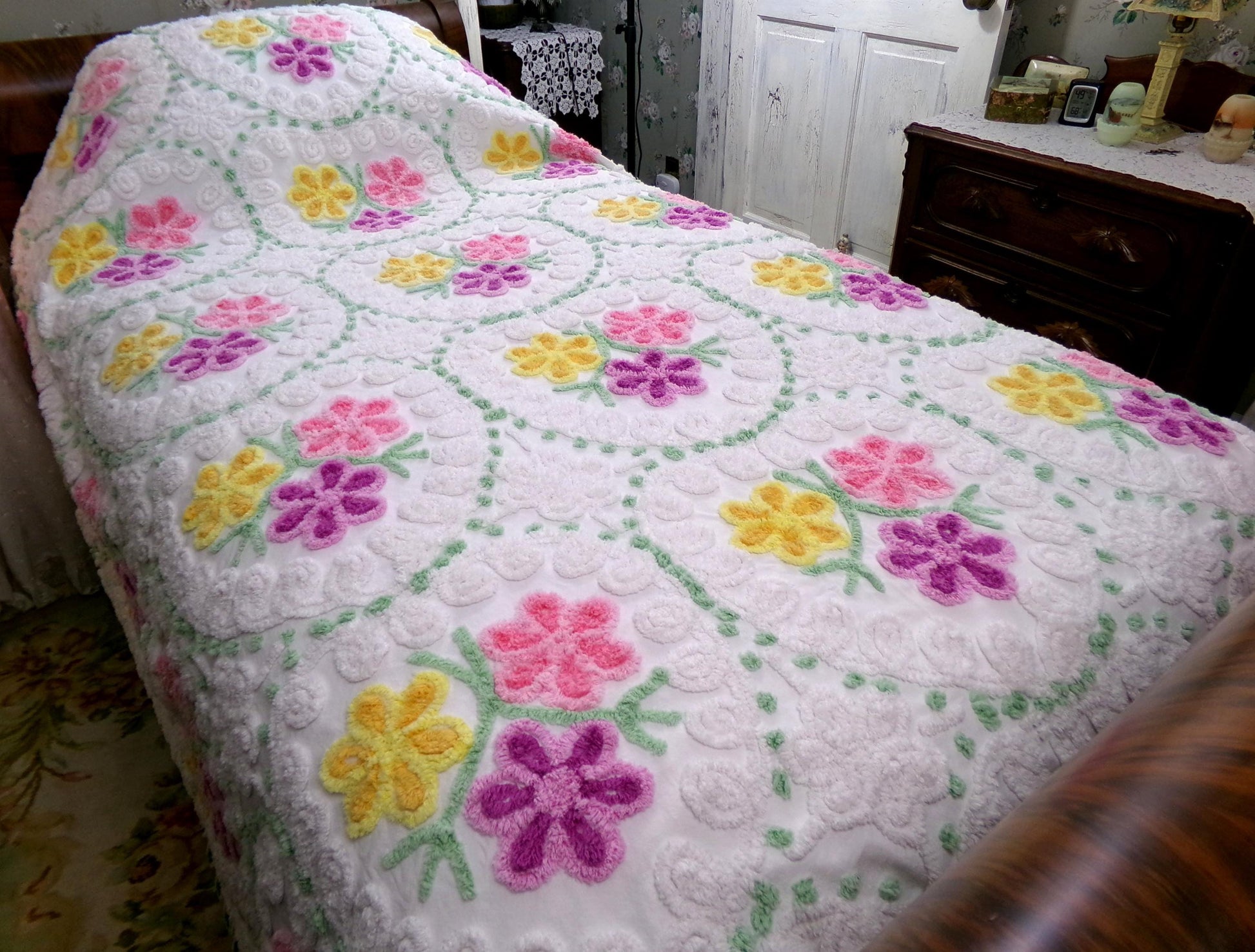 see more, cottagedivine.comThis vintage FULL size chenille bedspread is a perfect blend between whimsical sweet and cottage chic. From the Midcentury era, it features trios of colorful flowers set in large hearts - all surrounded by curlicue swirls & green dots. Set on a white cotton bkgd.