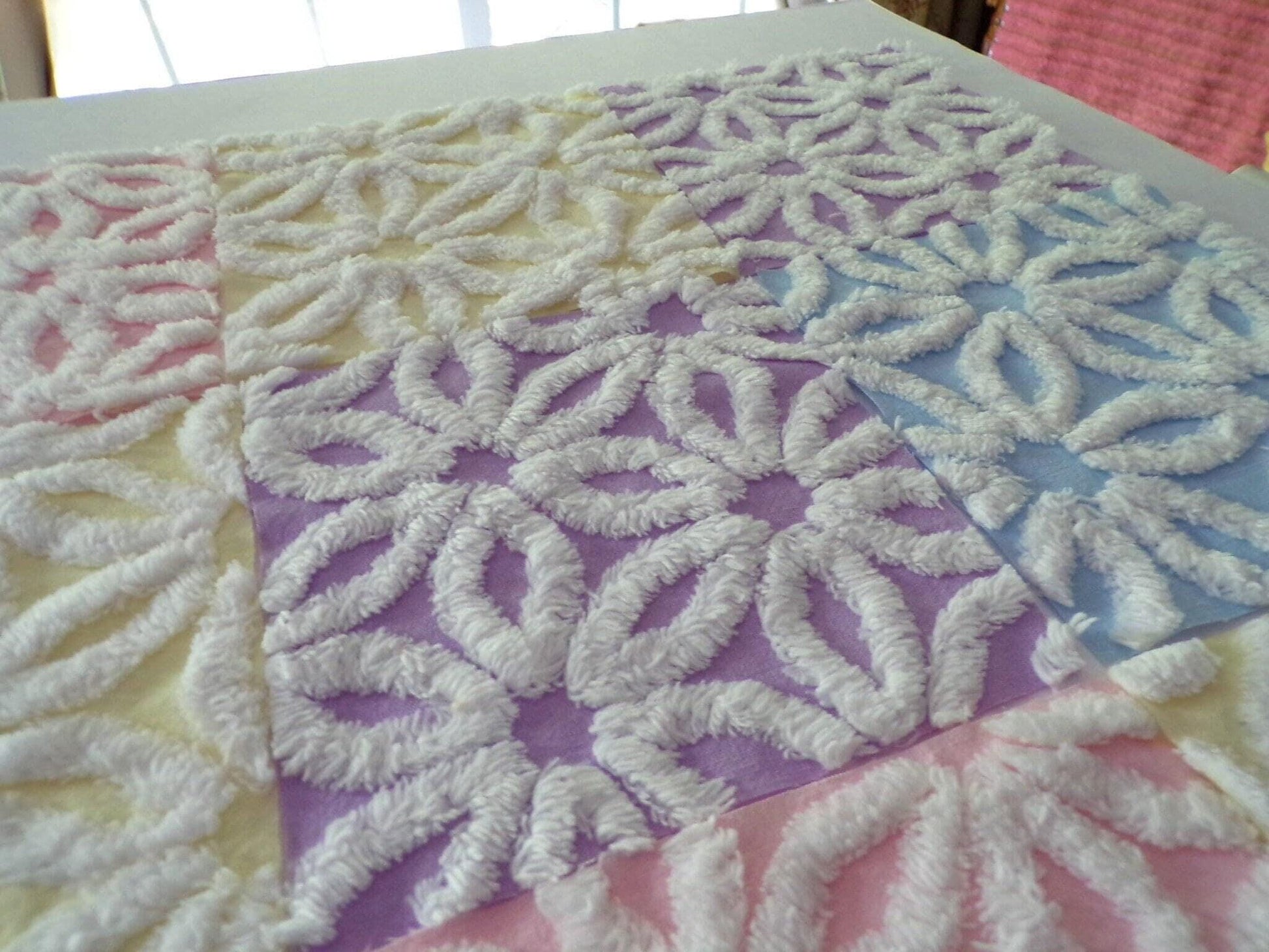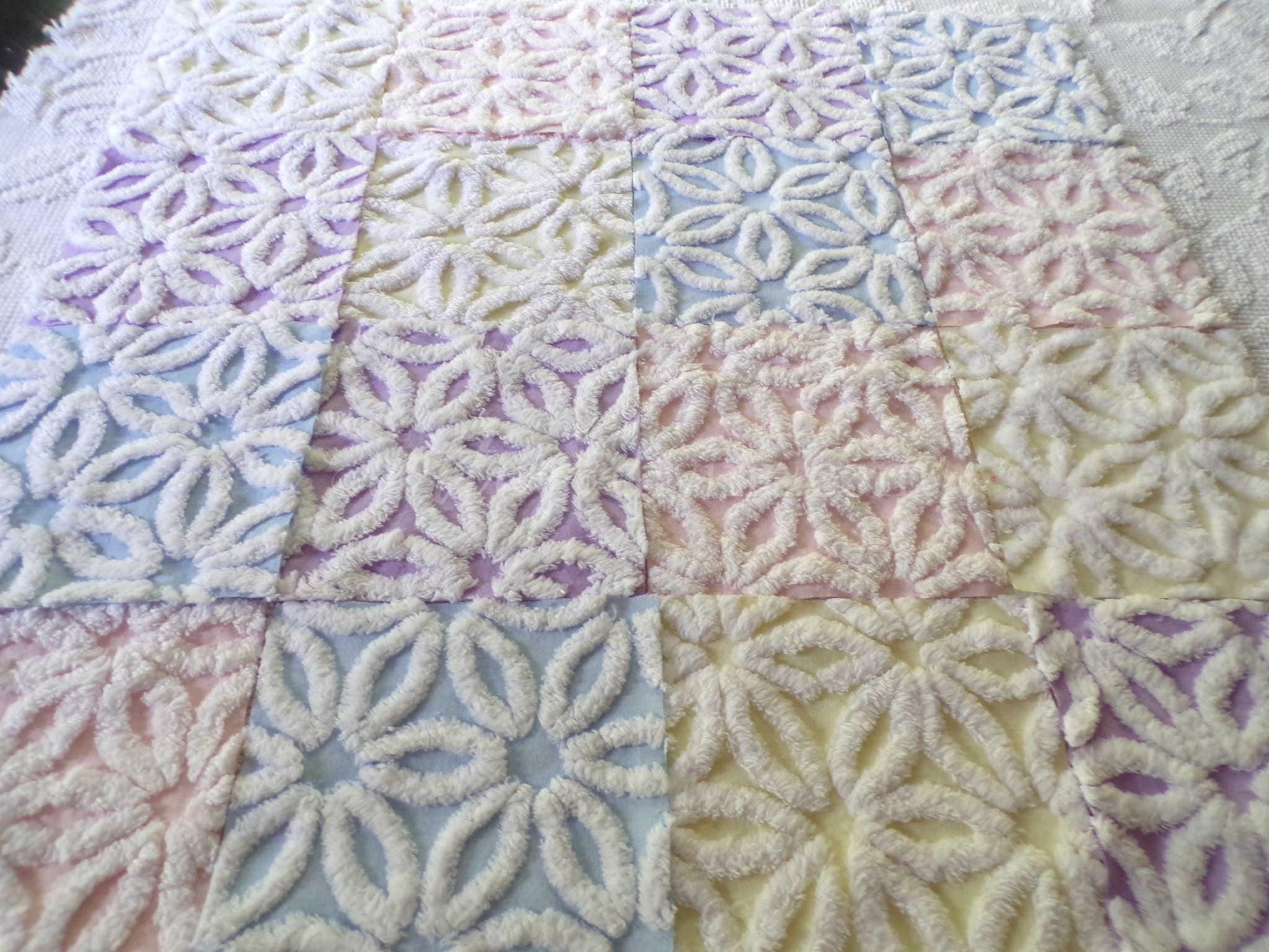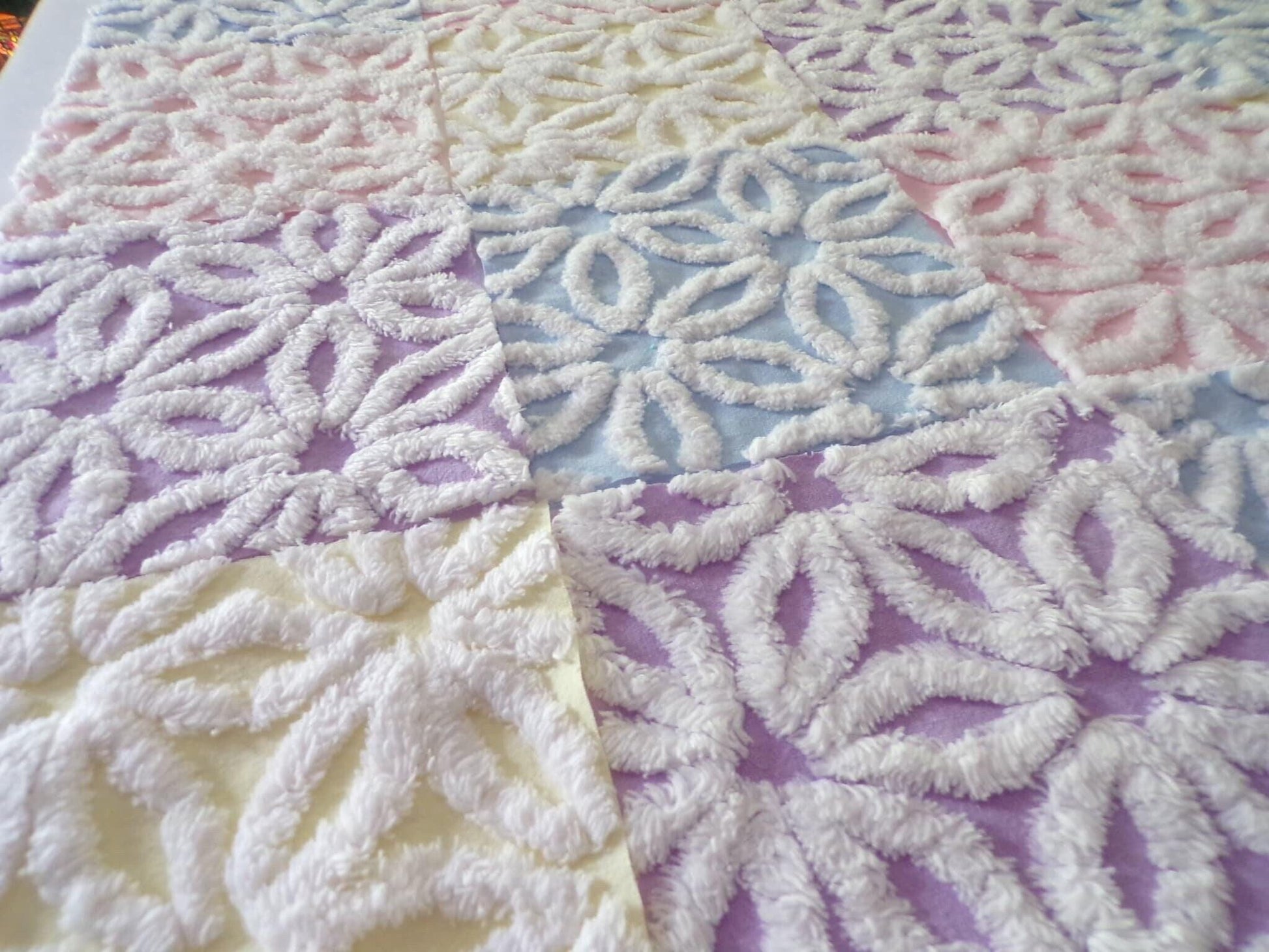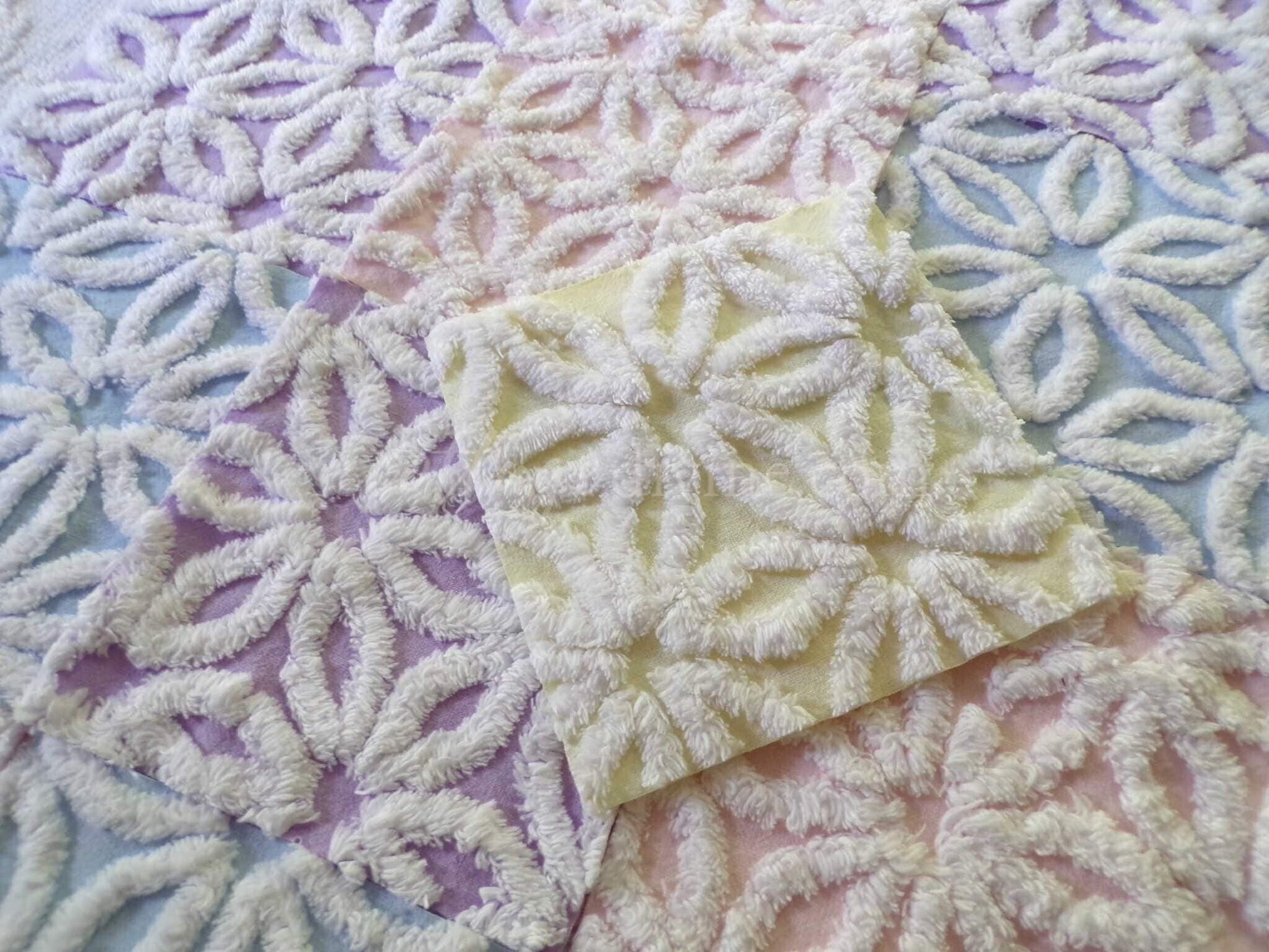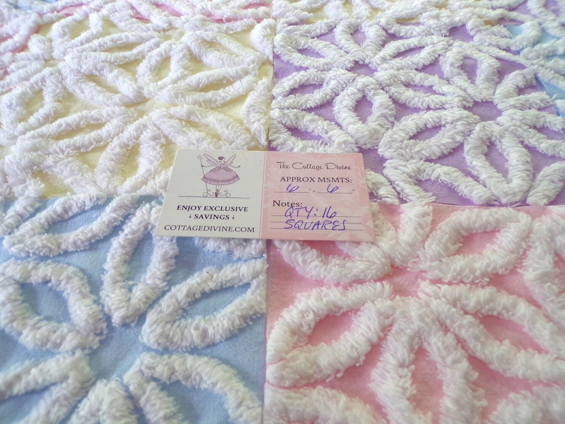 A pretty pastel coordinated quilt square set in four color favorites by vintage maker Hofmann Textiles effortlessly lends uplifting nostalgic cottage charm into your special project..::total qty: 16 chenille fabric quilt squares::size: 6" x 6" rotary cut