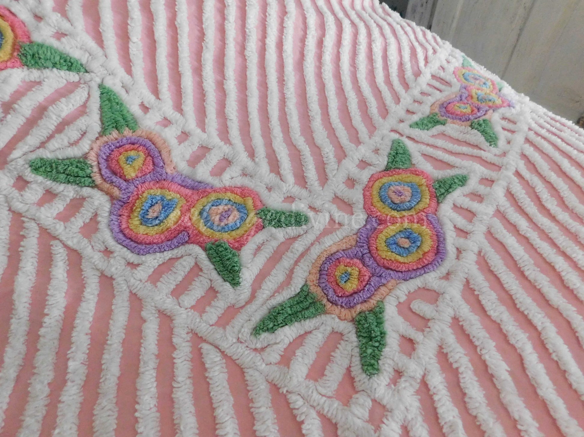 This FULL size vintage chenille bedspread is cottage chic, with a feisty fun essence. Plush white chevron tufting is framed by thick sculpted roses, all accented along the bottom edges by a fabulous, rare rainbow tuft designMeasures approx 90"W x 100"L. 100% thick cotton. In very good pre-loved vintage condition, having light attributes consistent with age/former life (i.e. skipped tufts, small age marks or repairs, etc.). Original factory markings as seen final img, with an overshot dye mark.::all items have been laundered/stored near fragranced products; please pass if sensitive