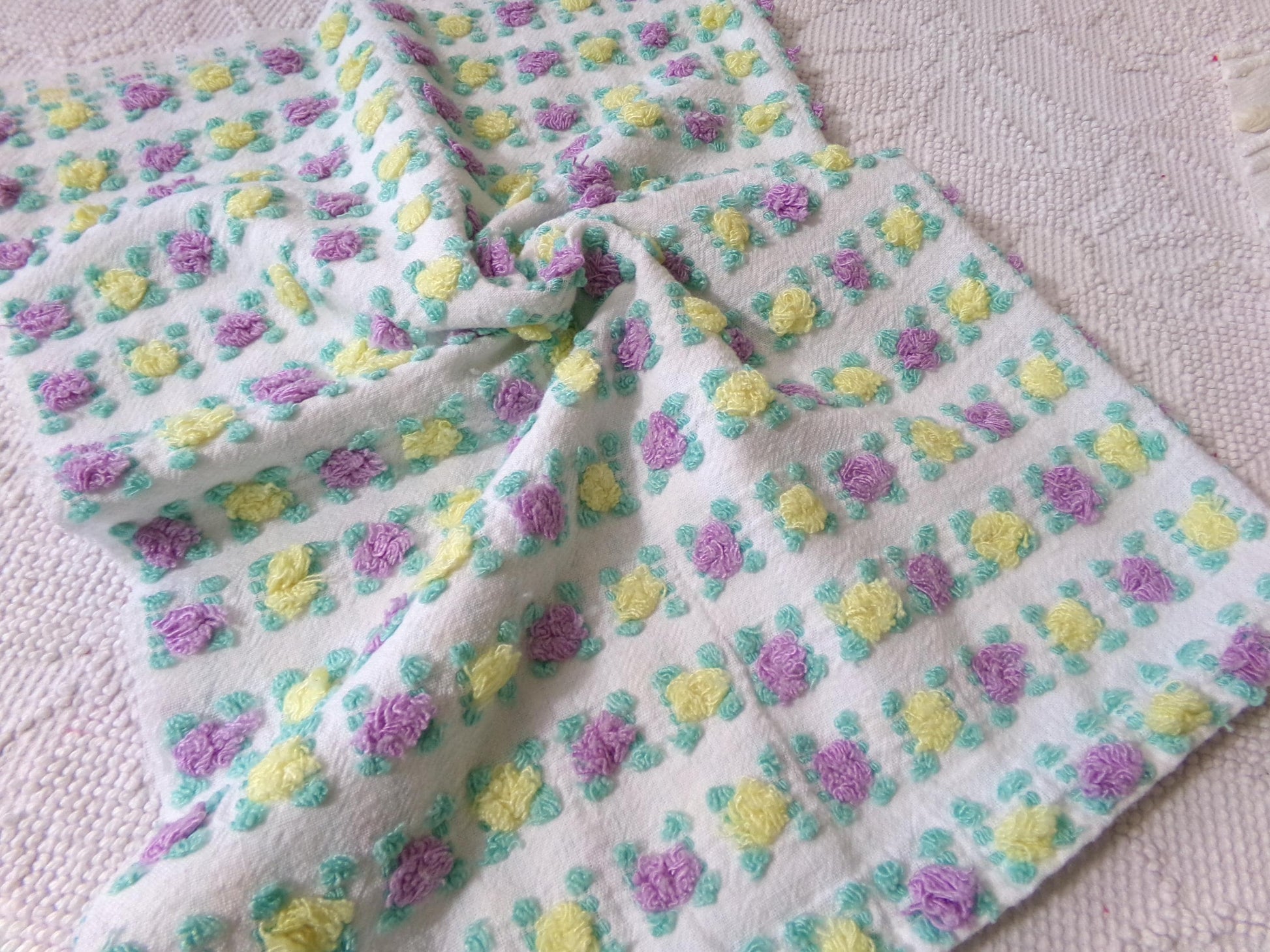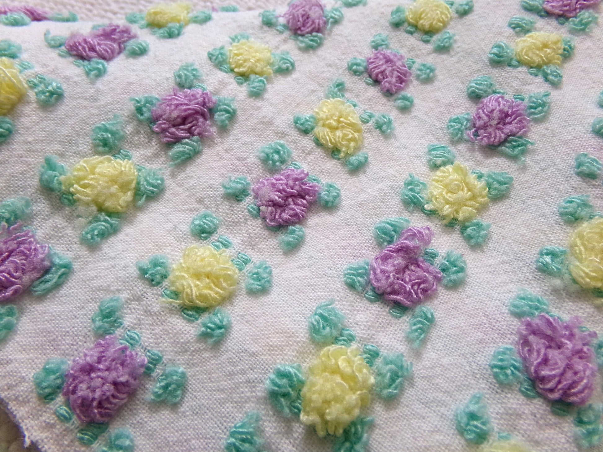 Here is your opportunity to incorporate one of the rarest patterns in vintage chenille fabric - an exquisite contrast rosebud pattern in lovely yellow and amethyst purple roses, accented by little tropical green leaves.This rare gem has been carefully cut from an original, New Old Stock vintage chenille bedspread that had never previously even been removed from its package circa the early 1960s.