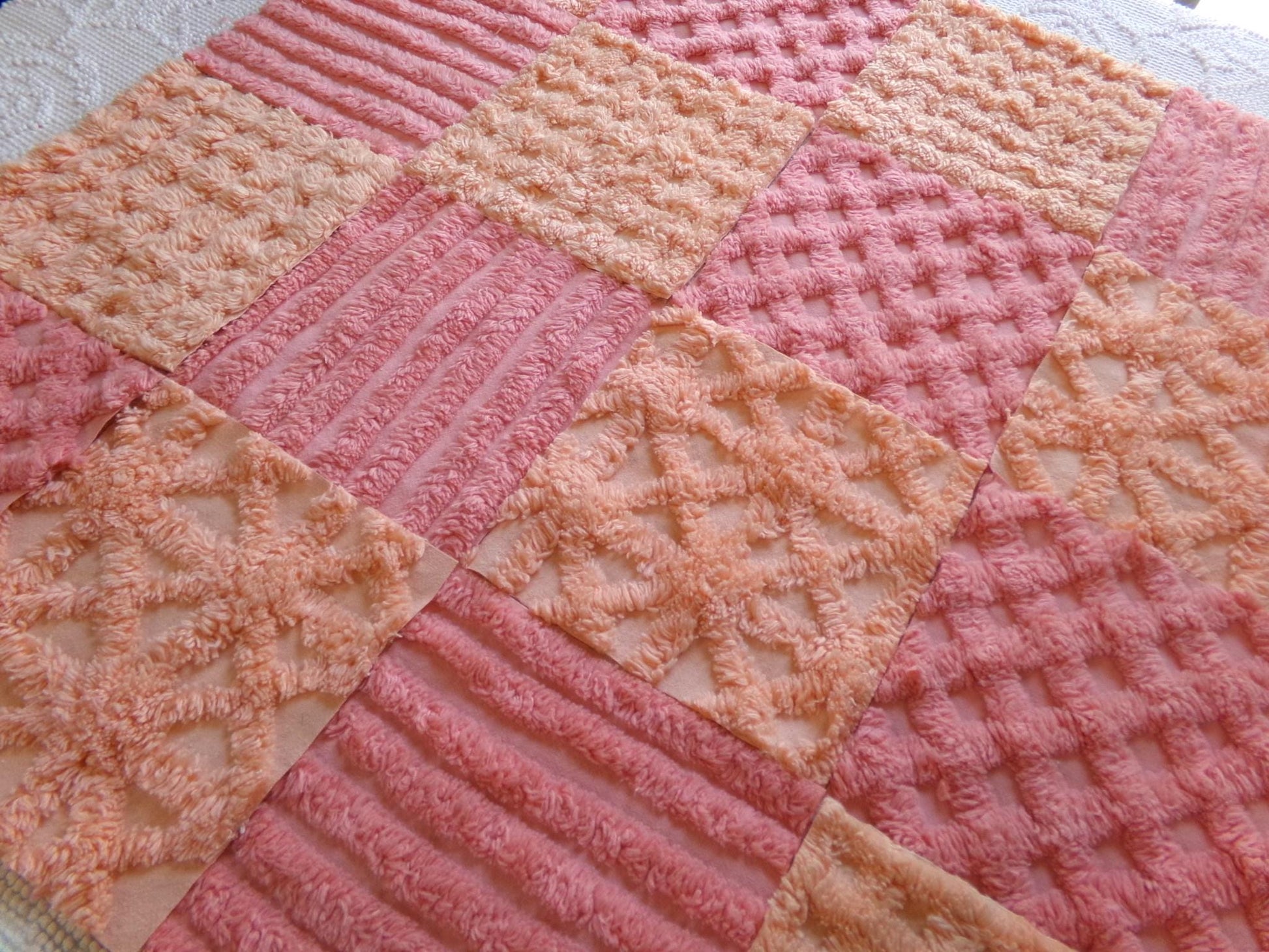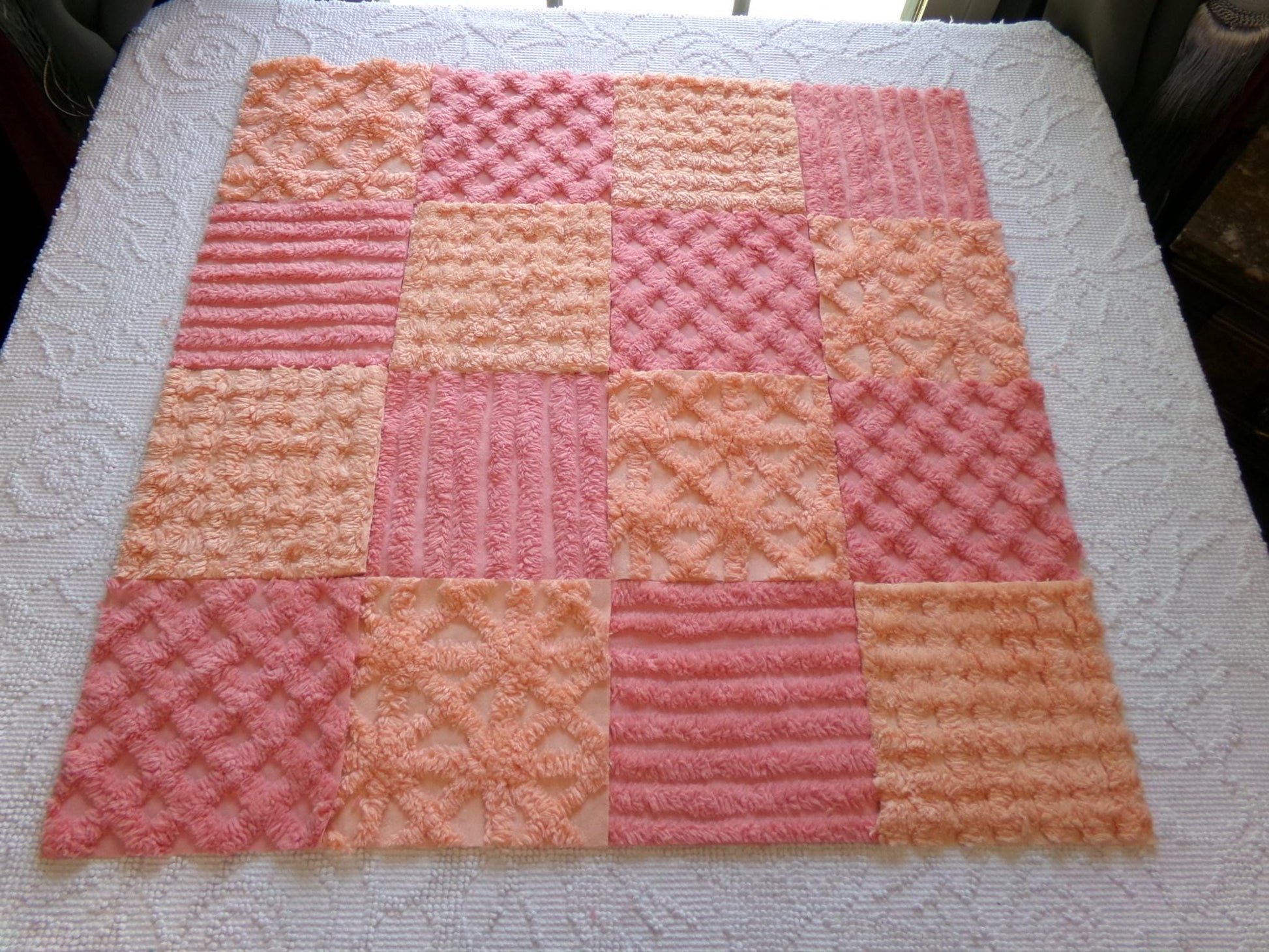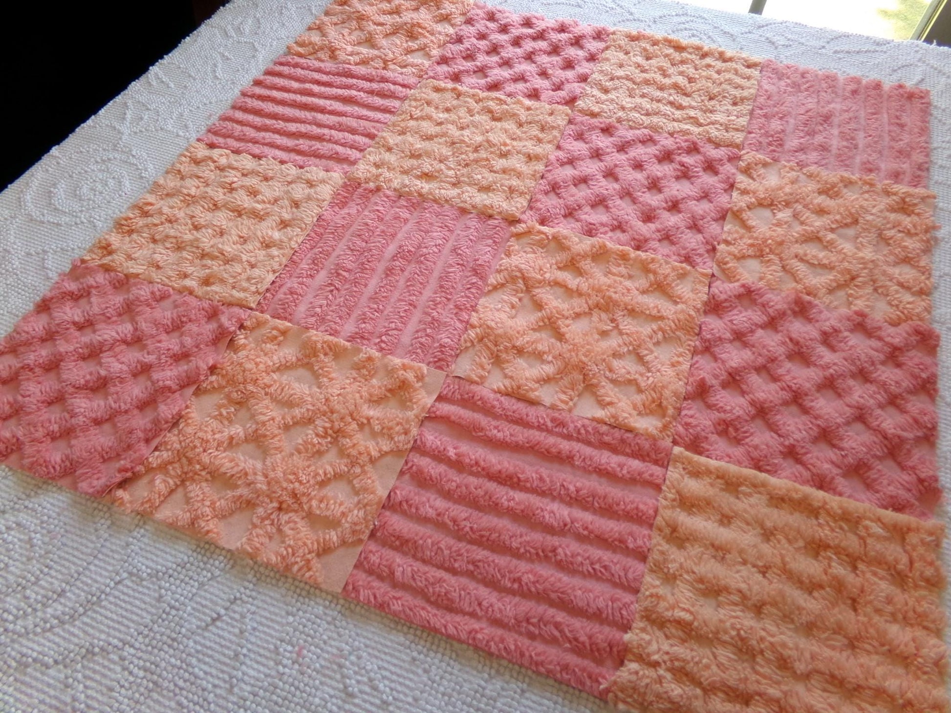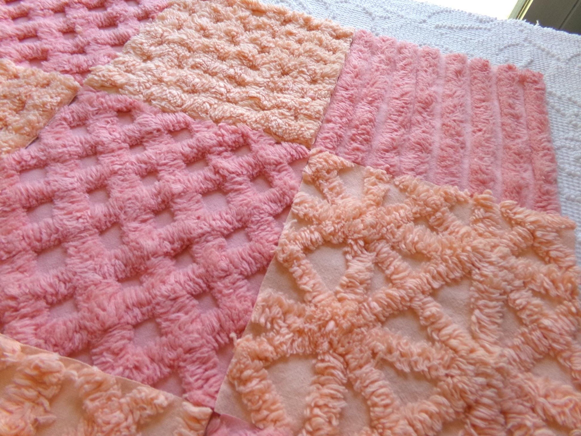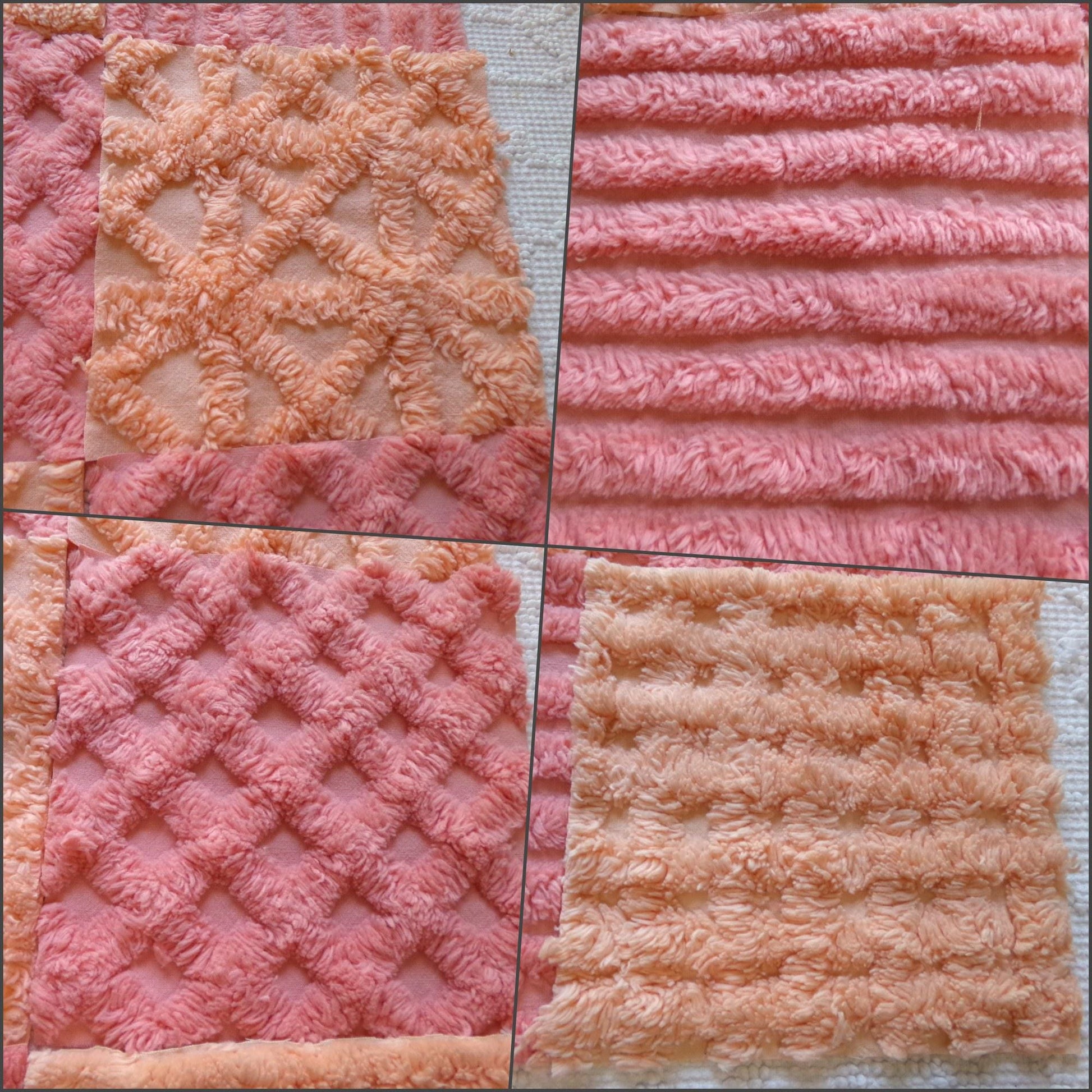 Inspired by the delicious colors of raspberry peach sherbet, here is this delightful set of 16 vintage chenille fabric squares. These are some of the most plush chenille squares I have right now, and the color selection is just fabulous.::total qty: 16 chenille quilt squares