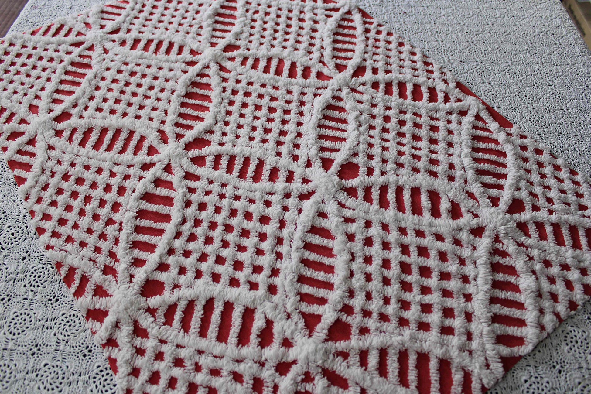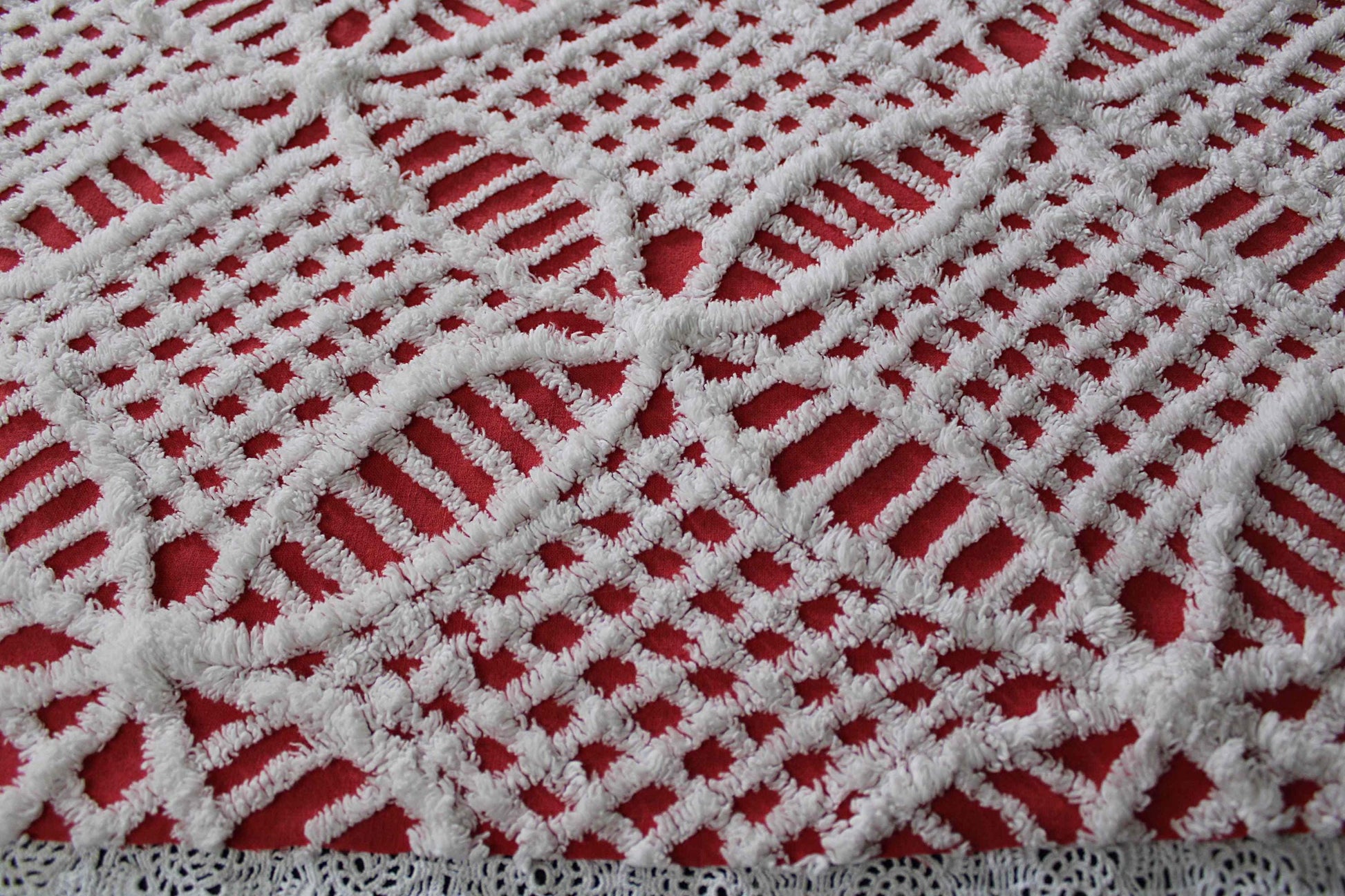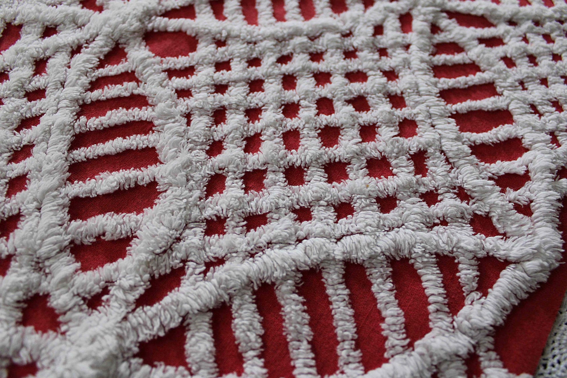 Fun festive vintage chenille fabric piece in a traditional 1950s style red & white geometric wedding ring design. A great choice to incorporate in Christmas projects like stockings & quilts.Approx 19" x 27" inch piece. 100% cotton, lightweight, strong & easy to sew with. In person, the red appears gently faded which is common to nearly all vintage reds of this shade.