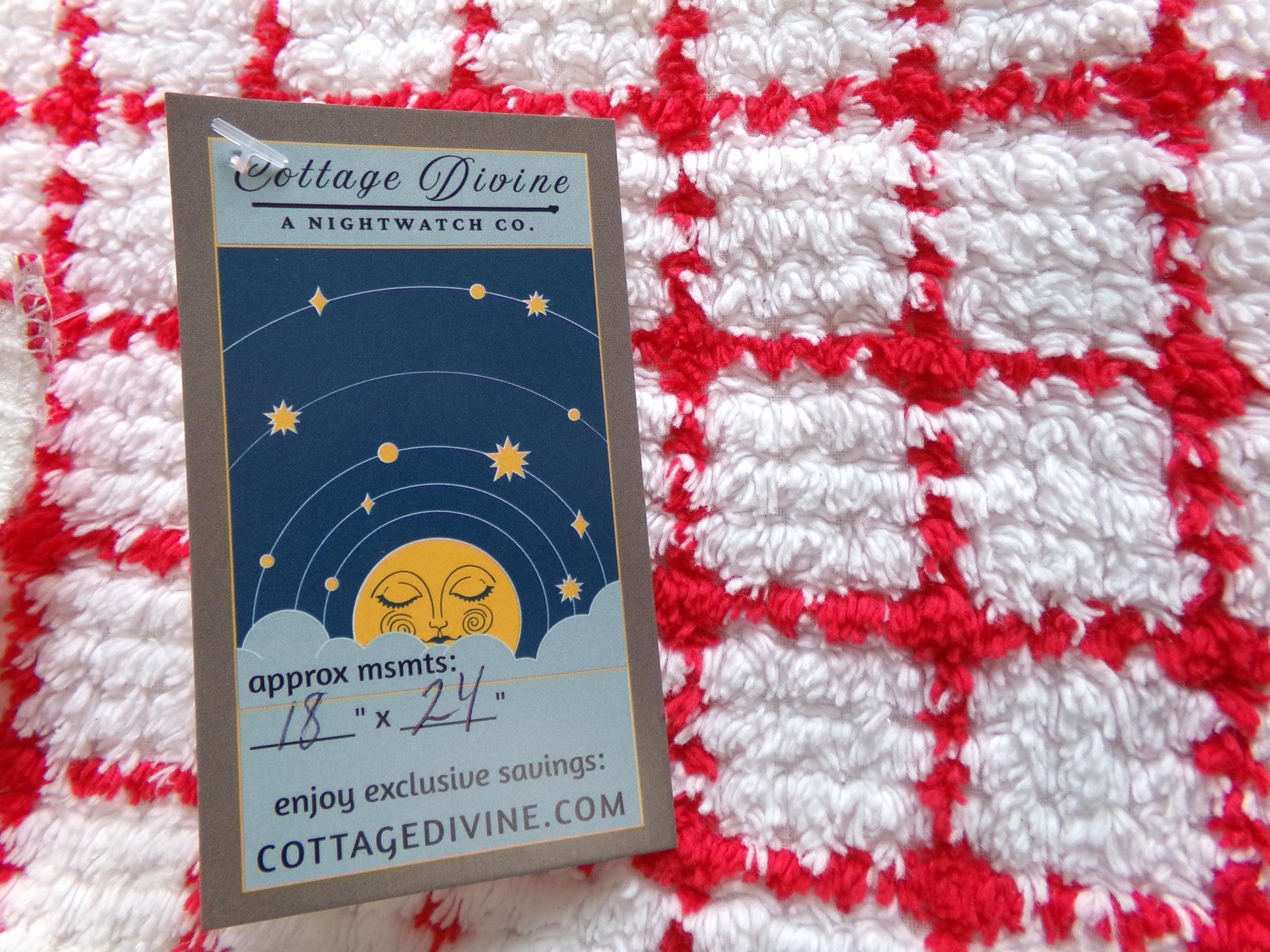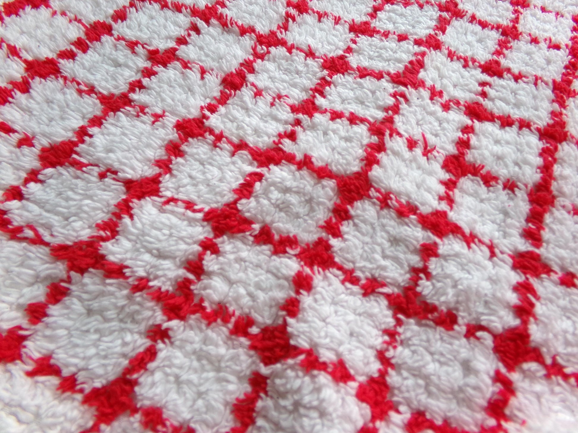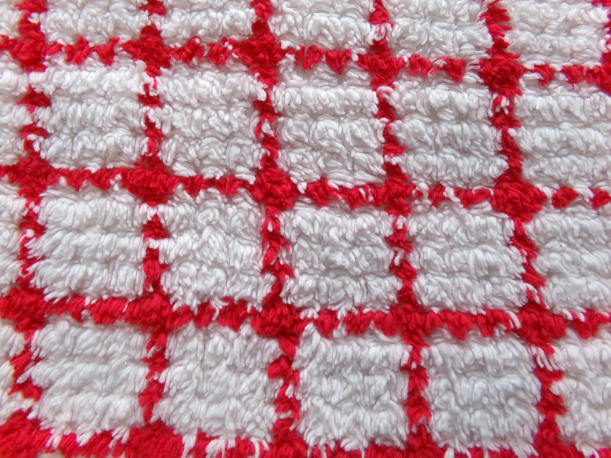 This piece of vintage chenille fabric features a red & white geometric cube pattern on a lightweight white bkgd. Note the cube lines are not perfectly straight, as seen in imgs. Few skips to the chenille tuft lines.Key highlights: