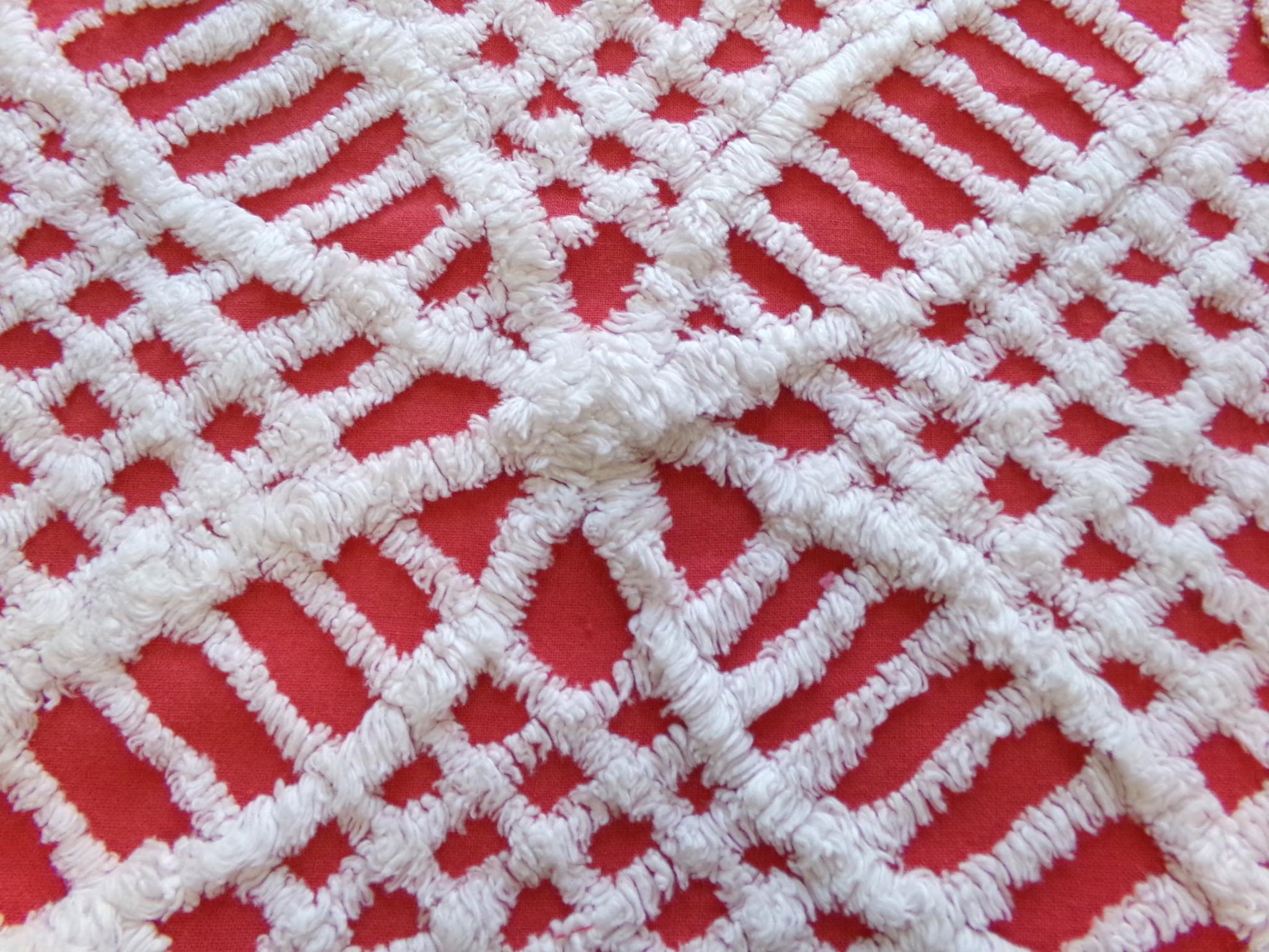 A popular festive fabric, this piece of vintage chenille definitely delivers some great color in a traditional tufted white wedding ring design on bright red.Measures about 17" x 24" inches. 100% thin/lightweight cotton; early 1950s era original. You may note light tuft loss and/or pinholes.