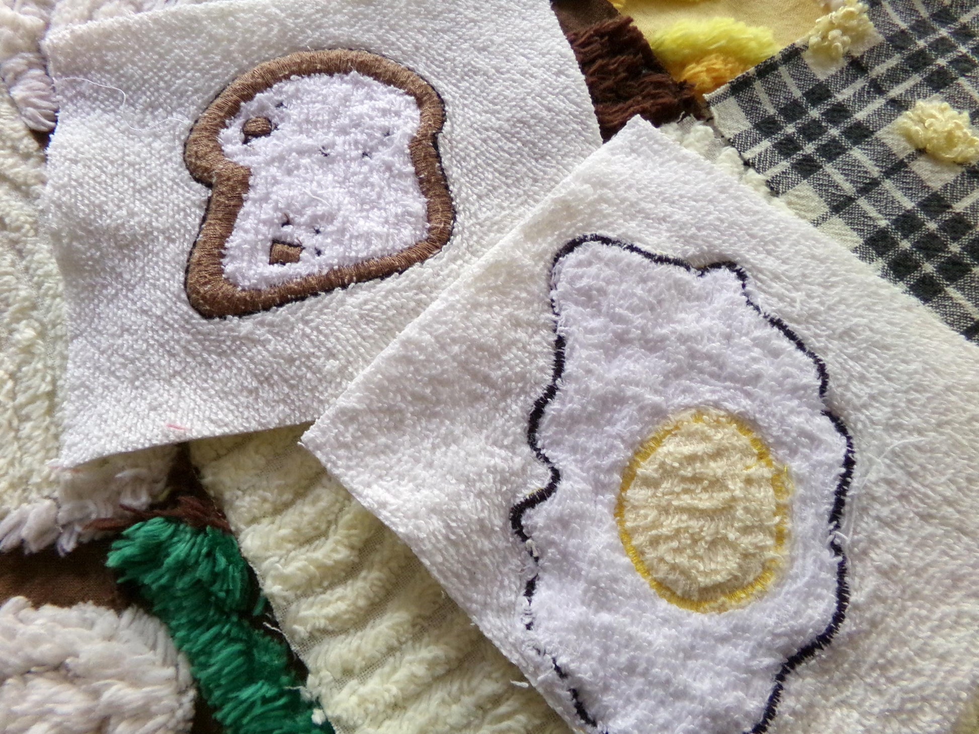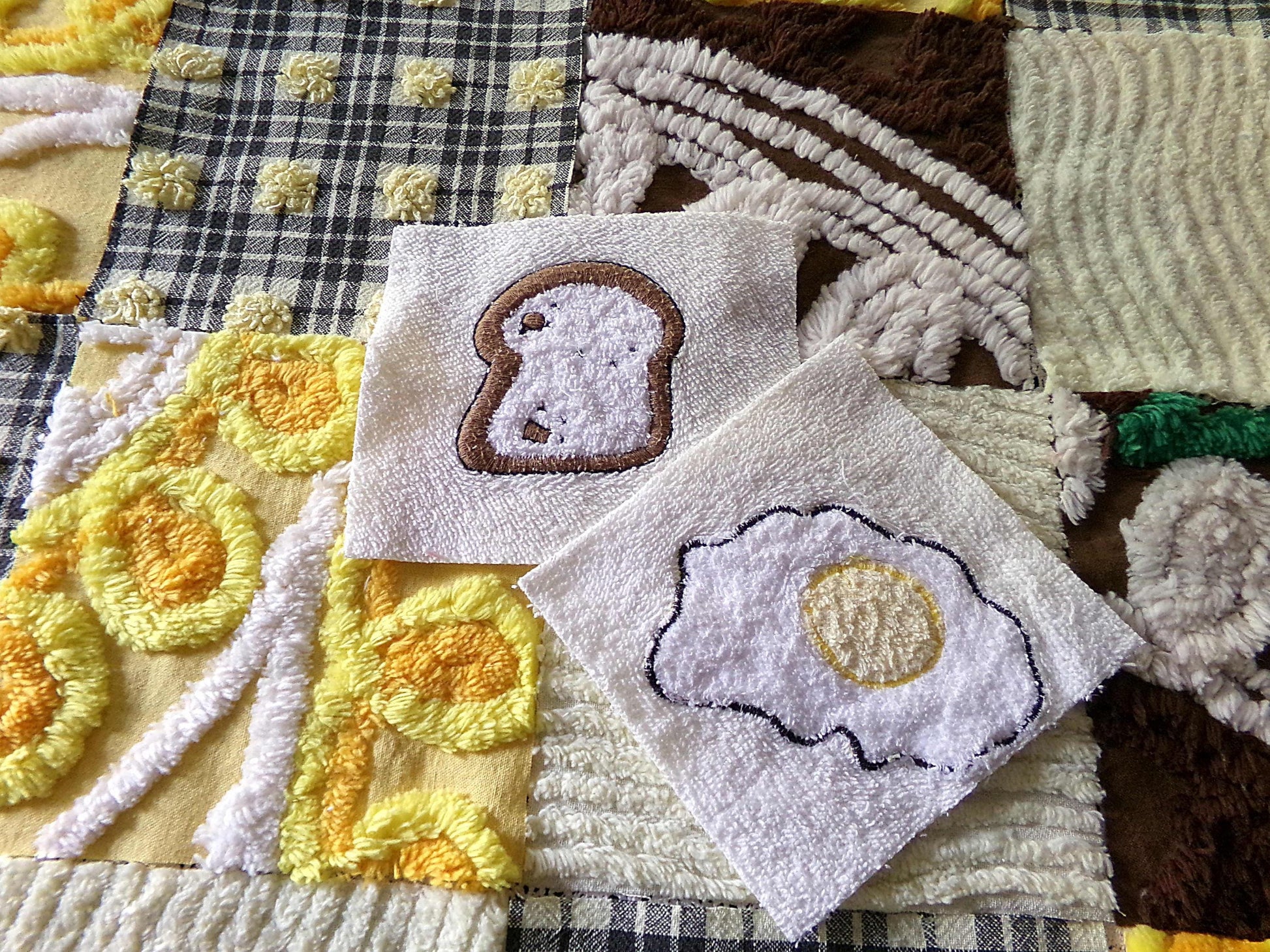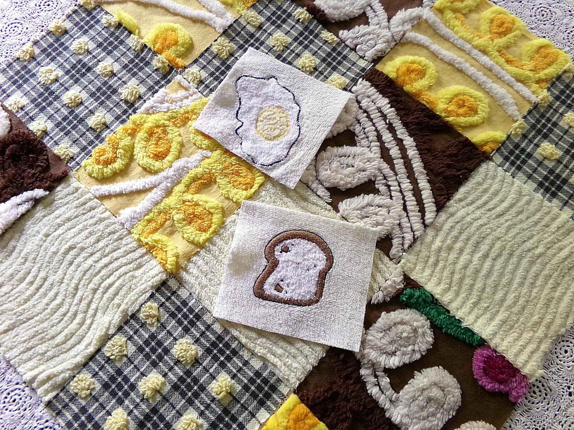 "Rise 'n Shine" ... This is a super fun set of 16 vintage chenille fabric squares with two extra little novelty pieces - one a scrambled egg; the other, a piece of toast. How cute is that?::total qty: 16 separate chenille quilt squares