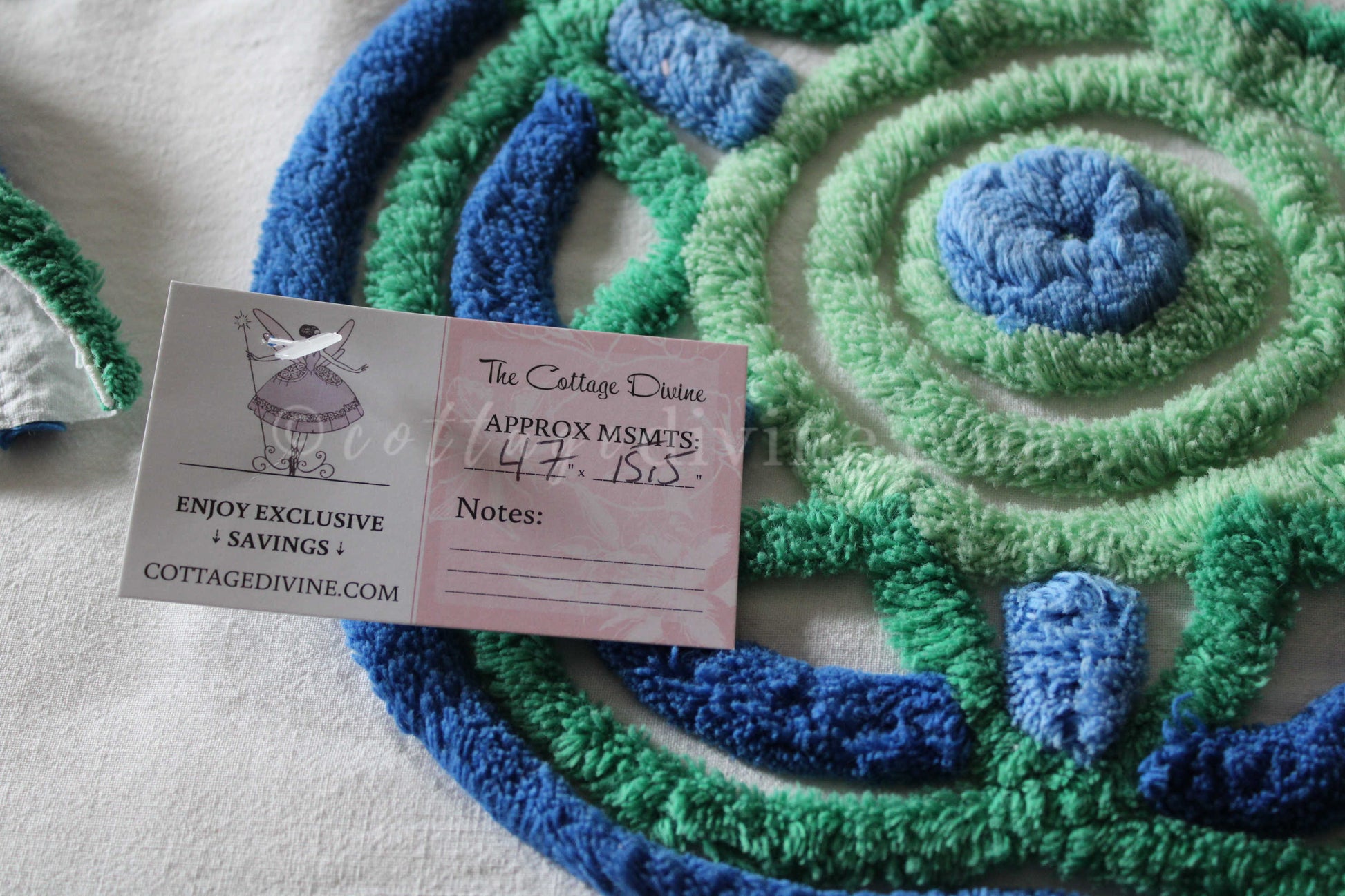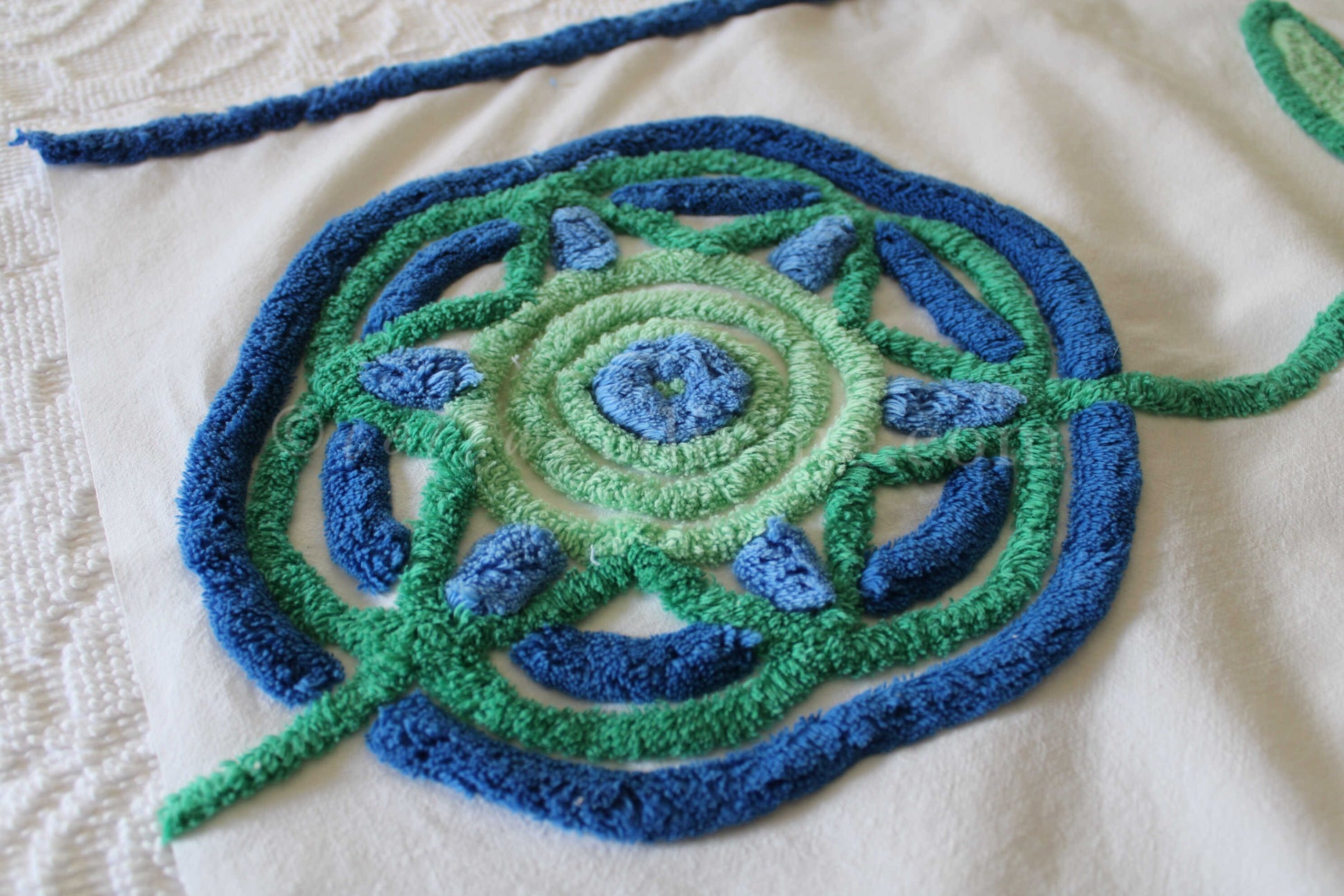 Looking for a very unusual piece of standout chenille with some serious flower power retro vibes? This vintage chenille piece may be just what you need to make your design come alive. Handmade in the late 1930s to early 1940s. Back then, they sold DIY kits that you could use to make your own chenille, and that's how someone made this - in a pattern you'll almost never see.Measures approx 15.5" x 47" inches. 100% lightweight cotton. Still vibrant, lively colors. Few shabby attributes such as a minor pinholew h a t - t o - k n o w