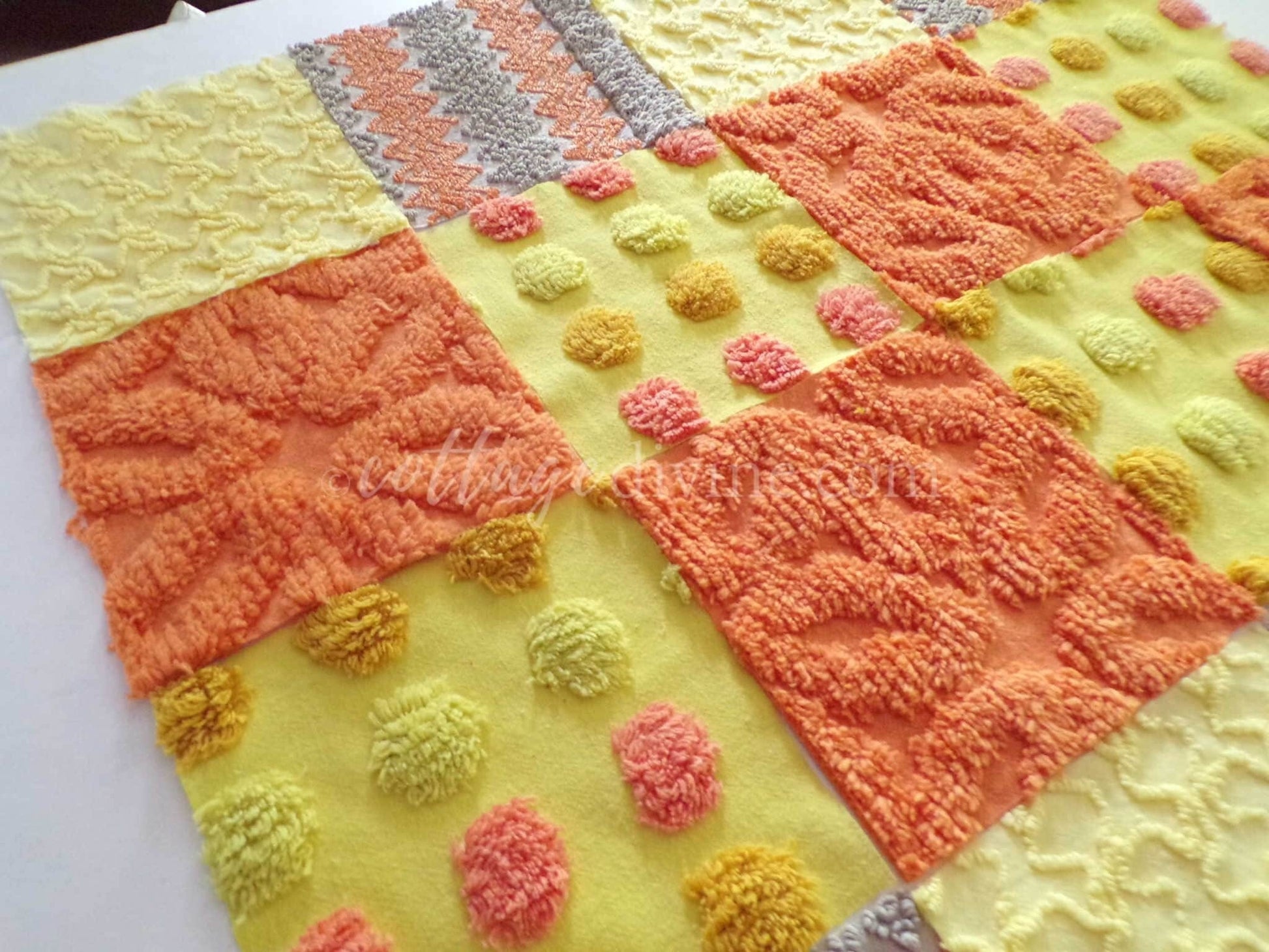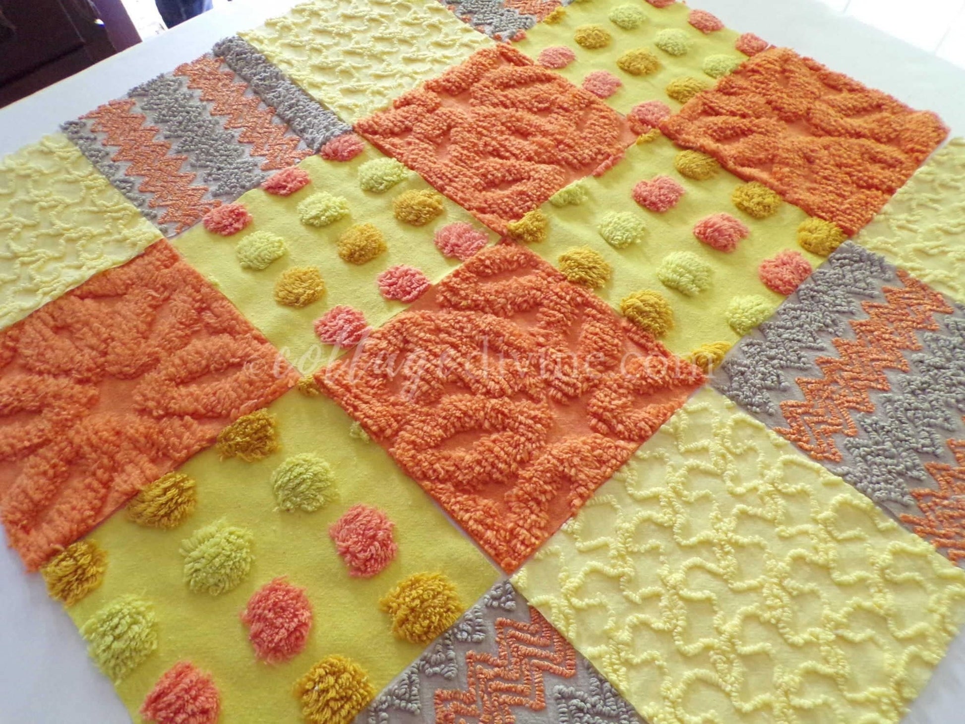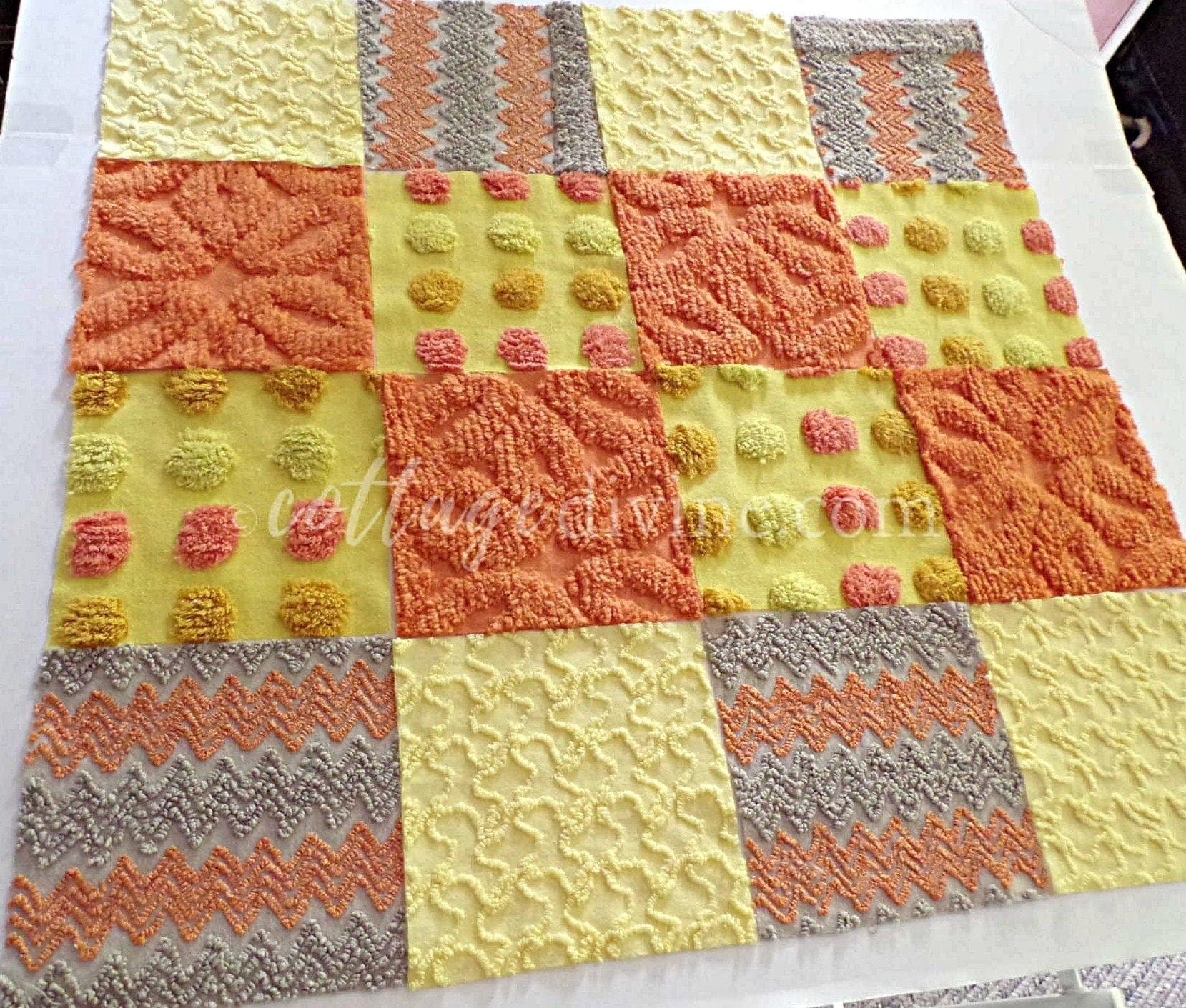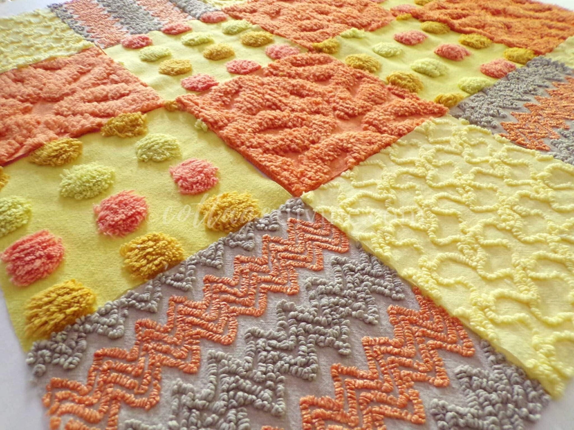 Hippie Halloween! We selected some of our most unique vintage chenille fabrics to create this assorted mix of quilt squares in retro fun autumn colors...ultra lightweight candy corn coin dots contrast with plush wild orange squares to lend exceptional visual appeal.::total qty: 16 chenille fabric quilt squares