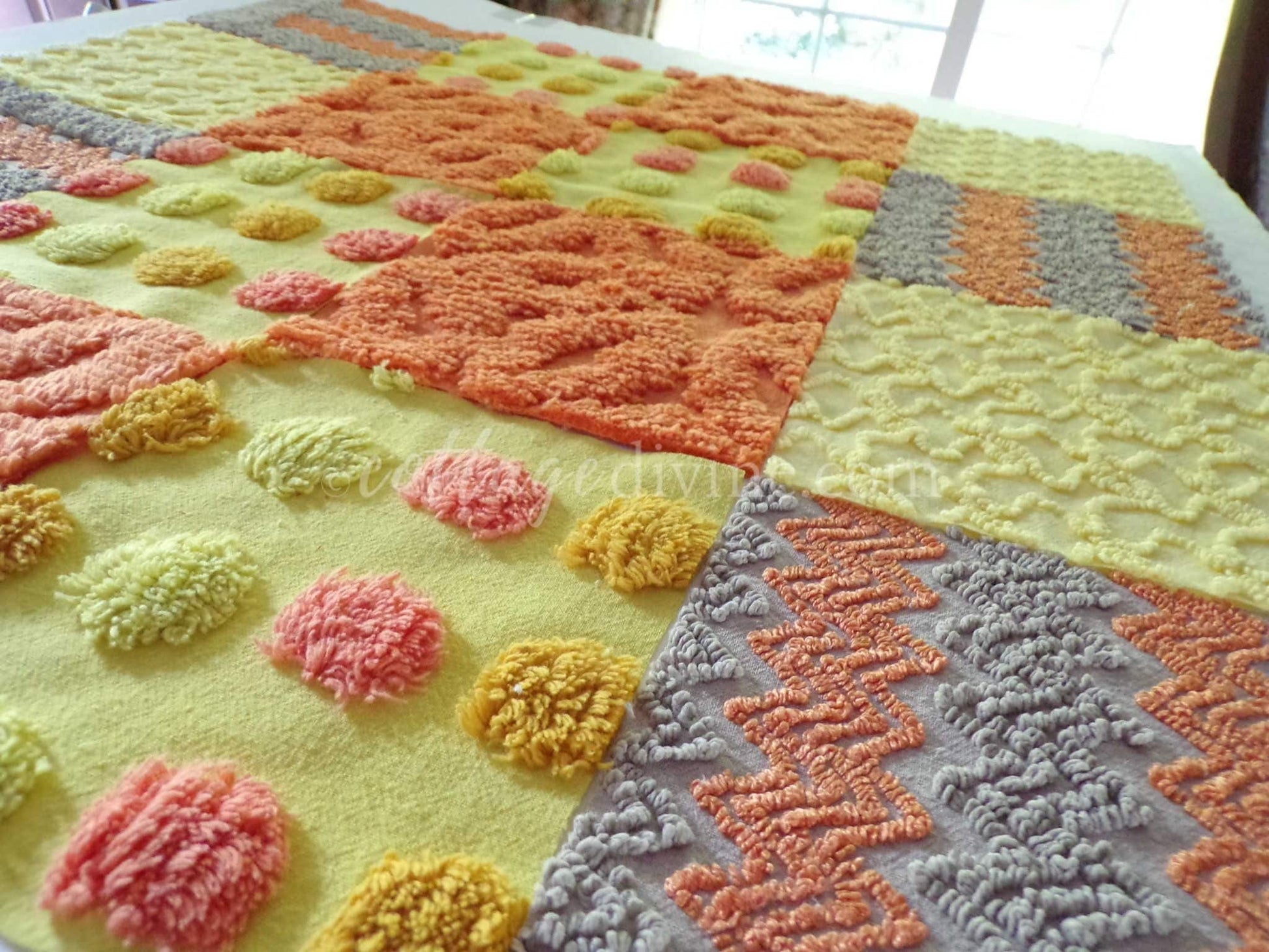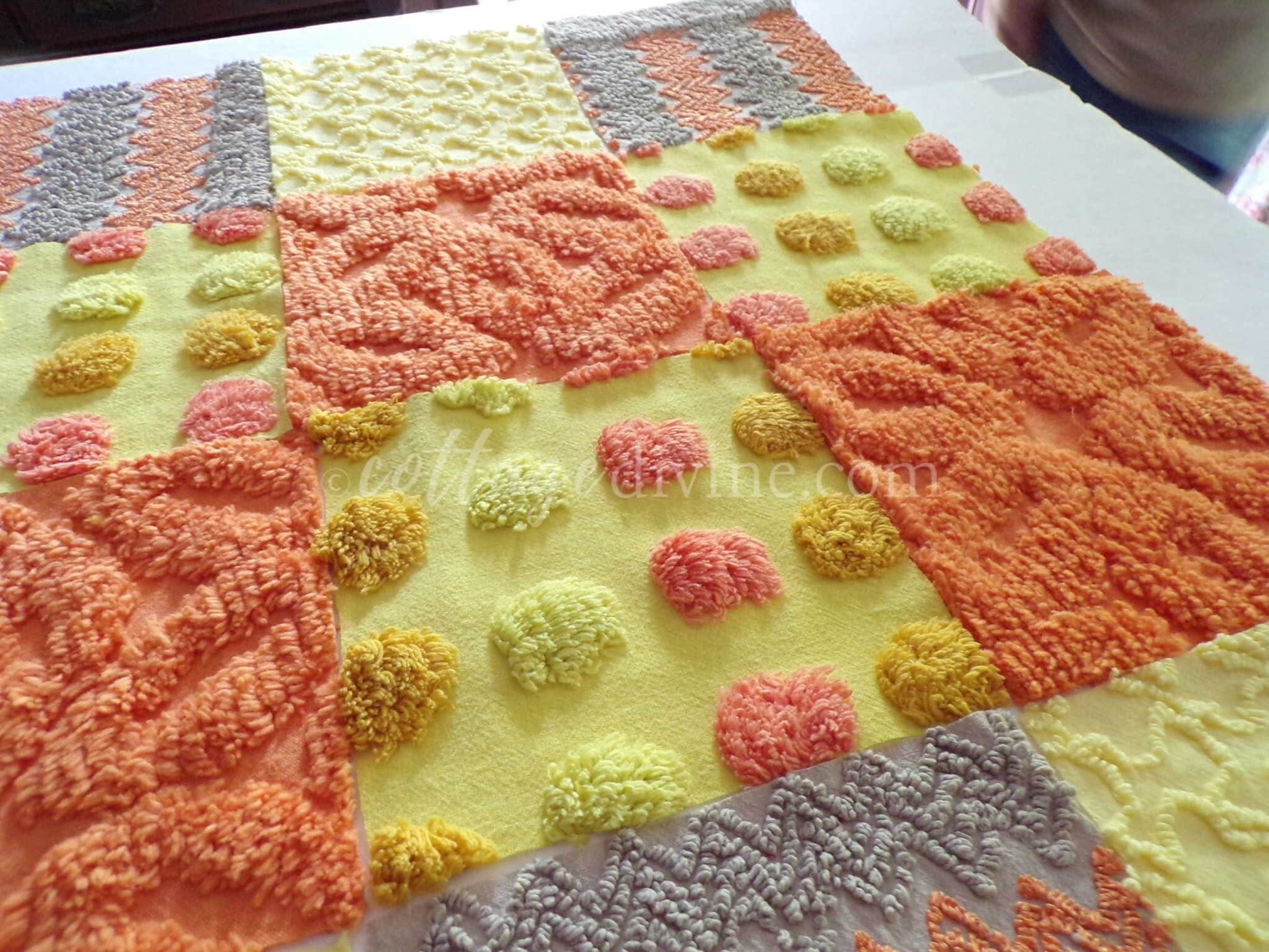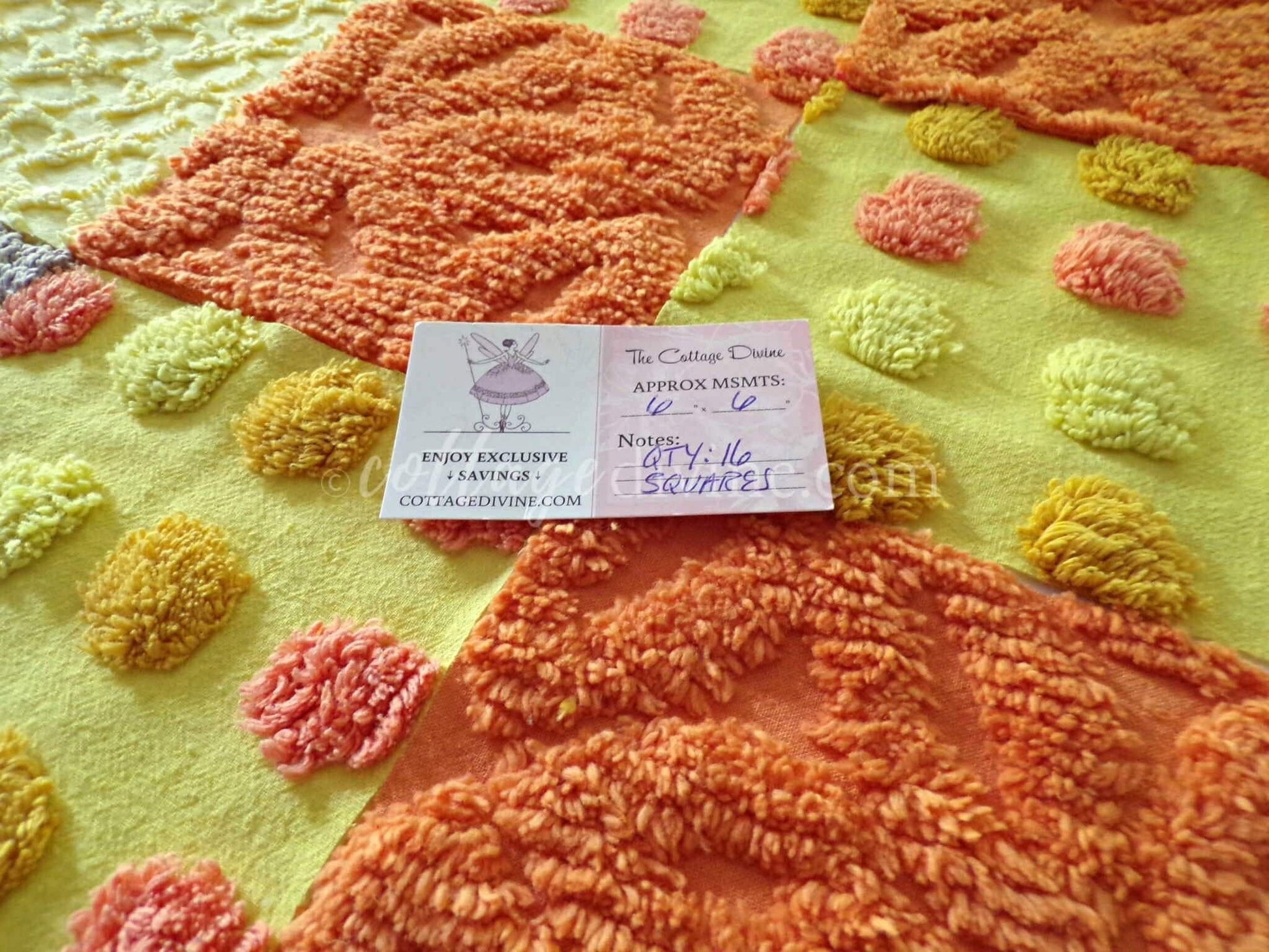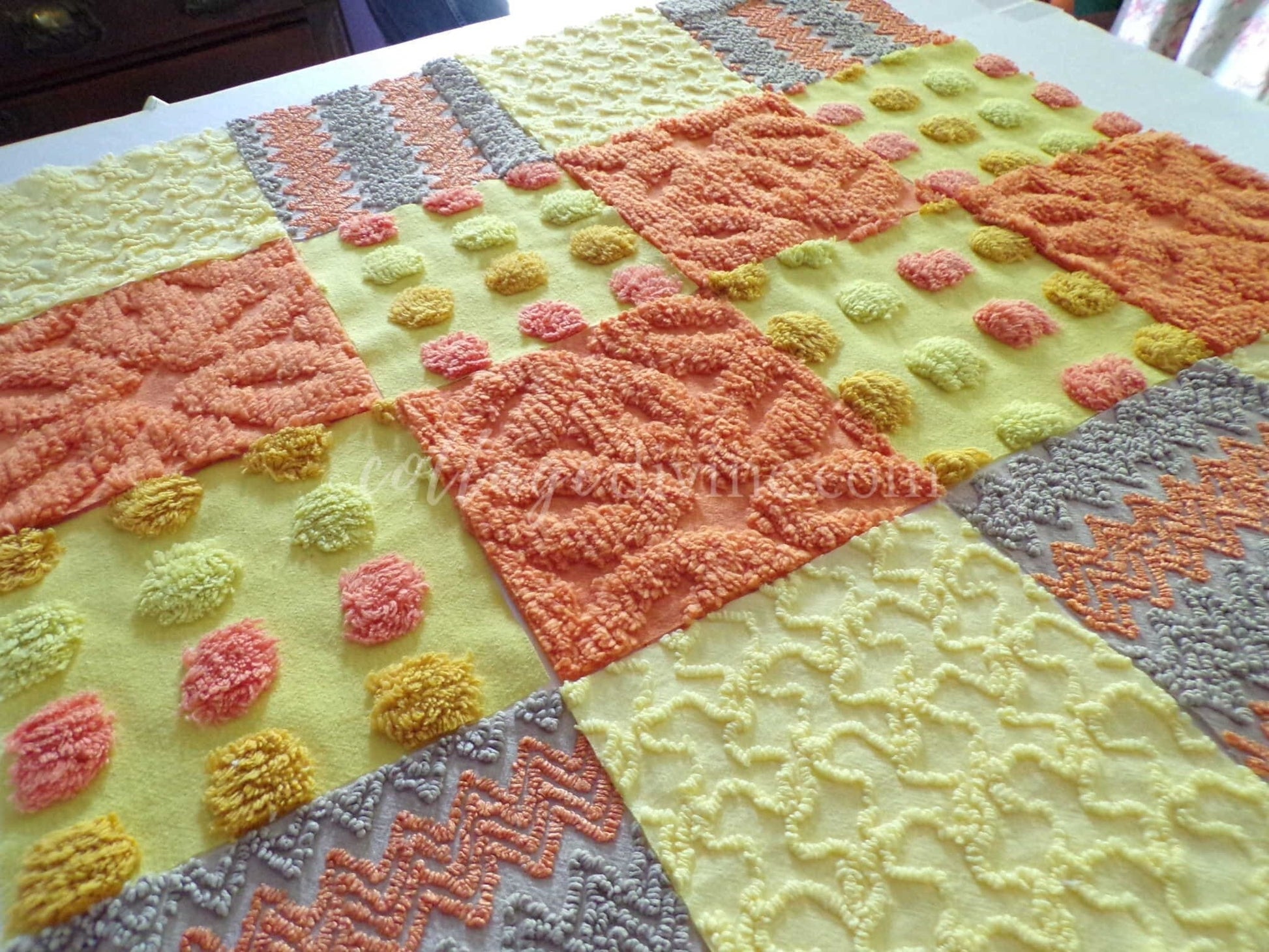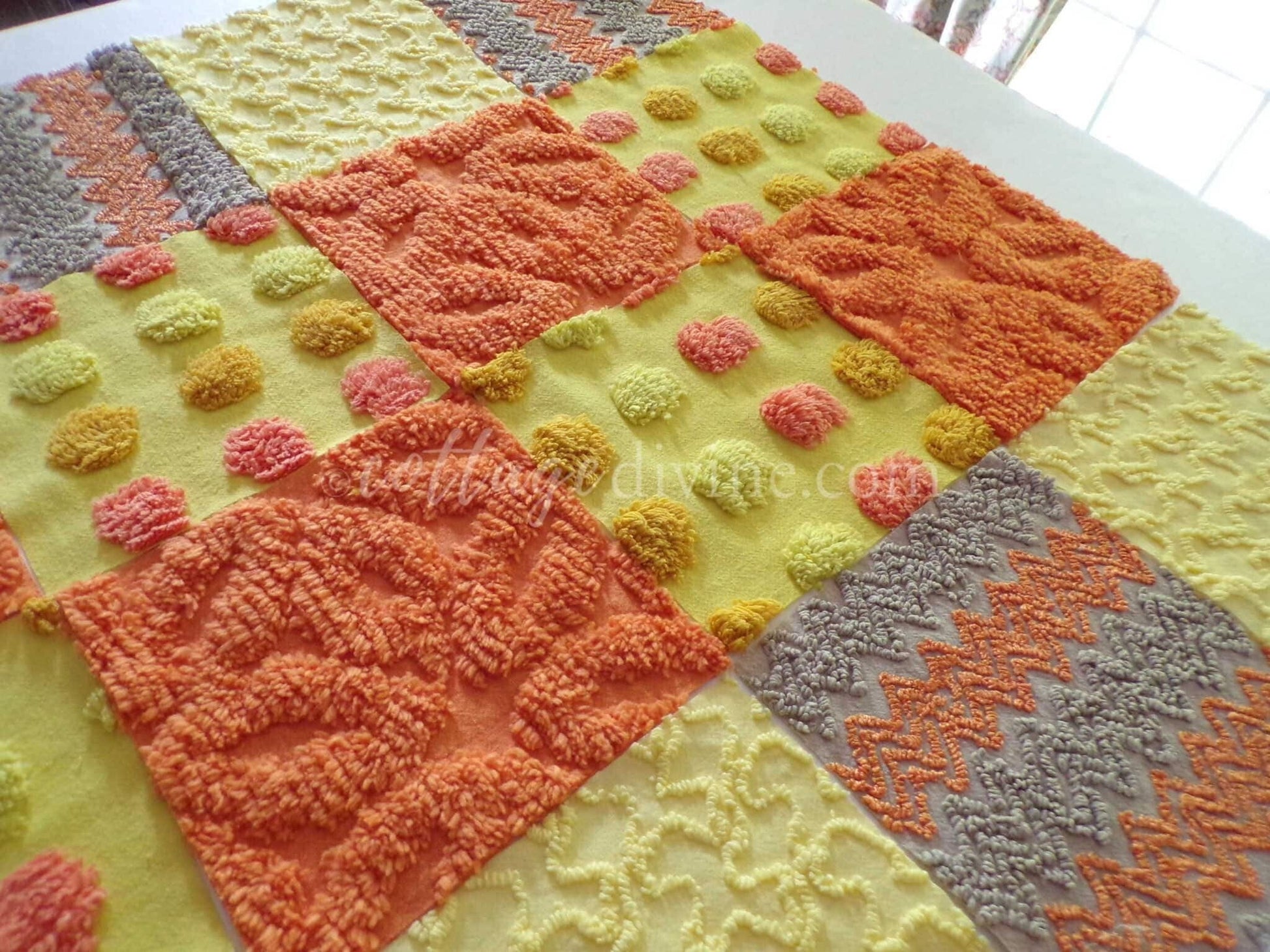 Hippie Halloween! We selected some of our most unique vintage chenille fabrics to create this assorted mix of quilt squares in retro fun autumn colors...ultra lightweight candy corn coin dots contrast with plush wild orange squares to lend exceptional visual appeal.::total qty: 16 chenille fabric quilt squares