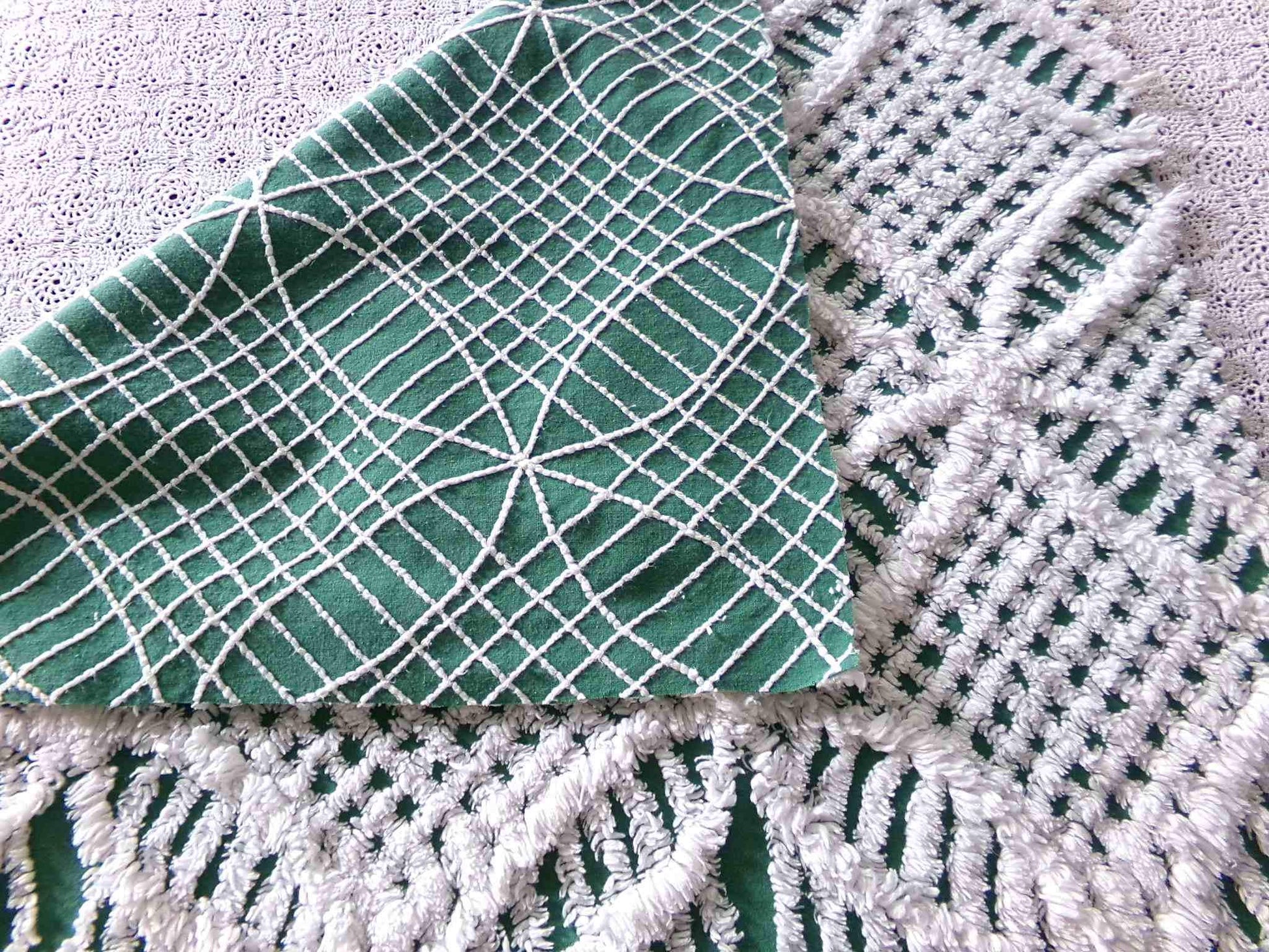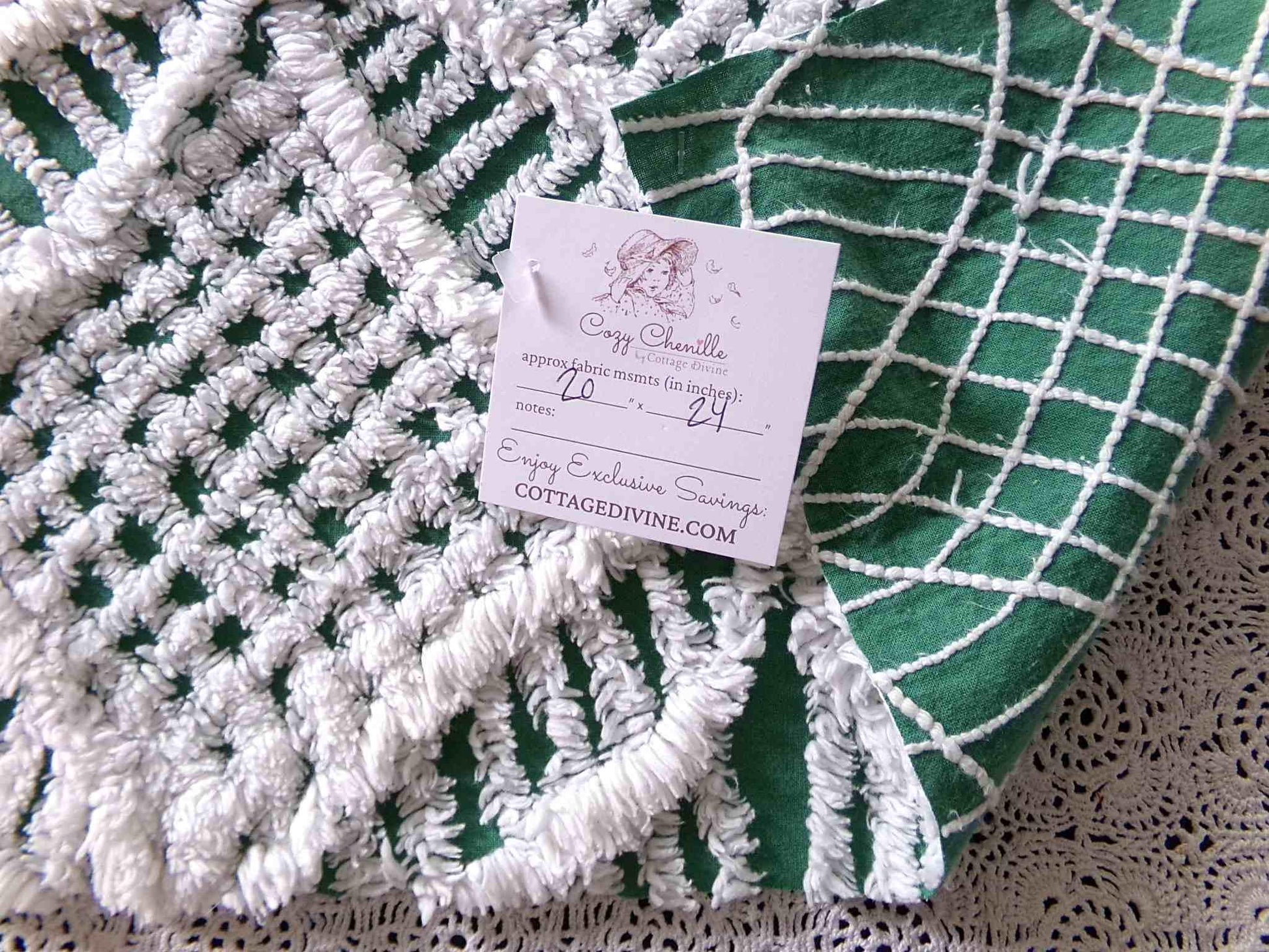 Bring depth and texture to your project with this vintage chenille fabric, in a rich green colorway tufted with plush white geometric wedding rings. A striking fabric to inspire or enhance your creative design.Piece measures approx 20" x 24" inches. 100% lightweight cotton with soft tufting.