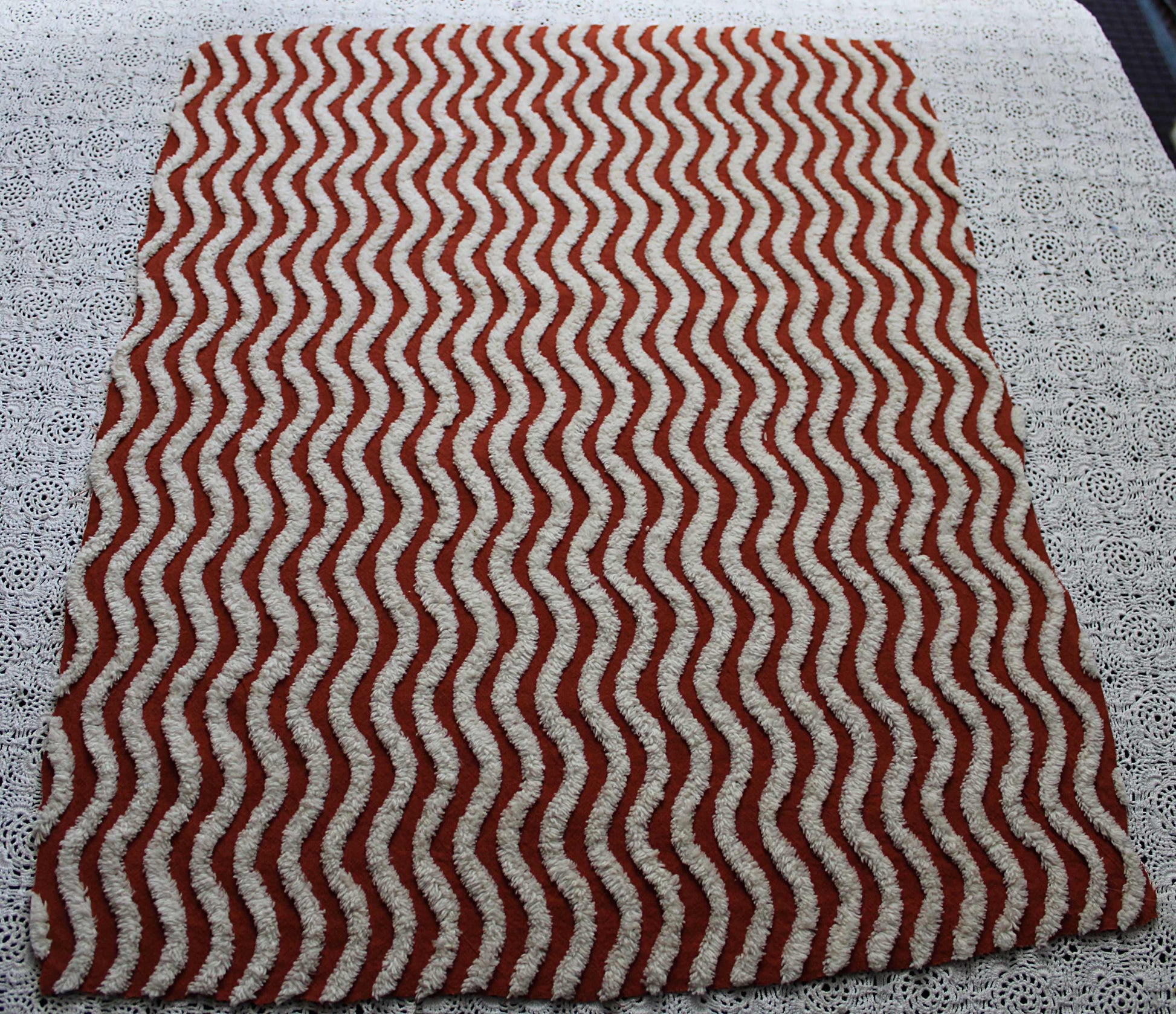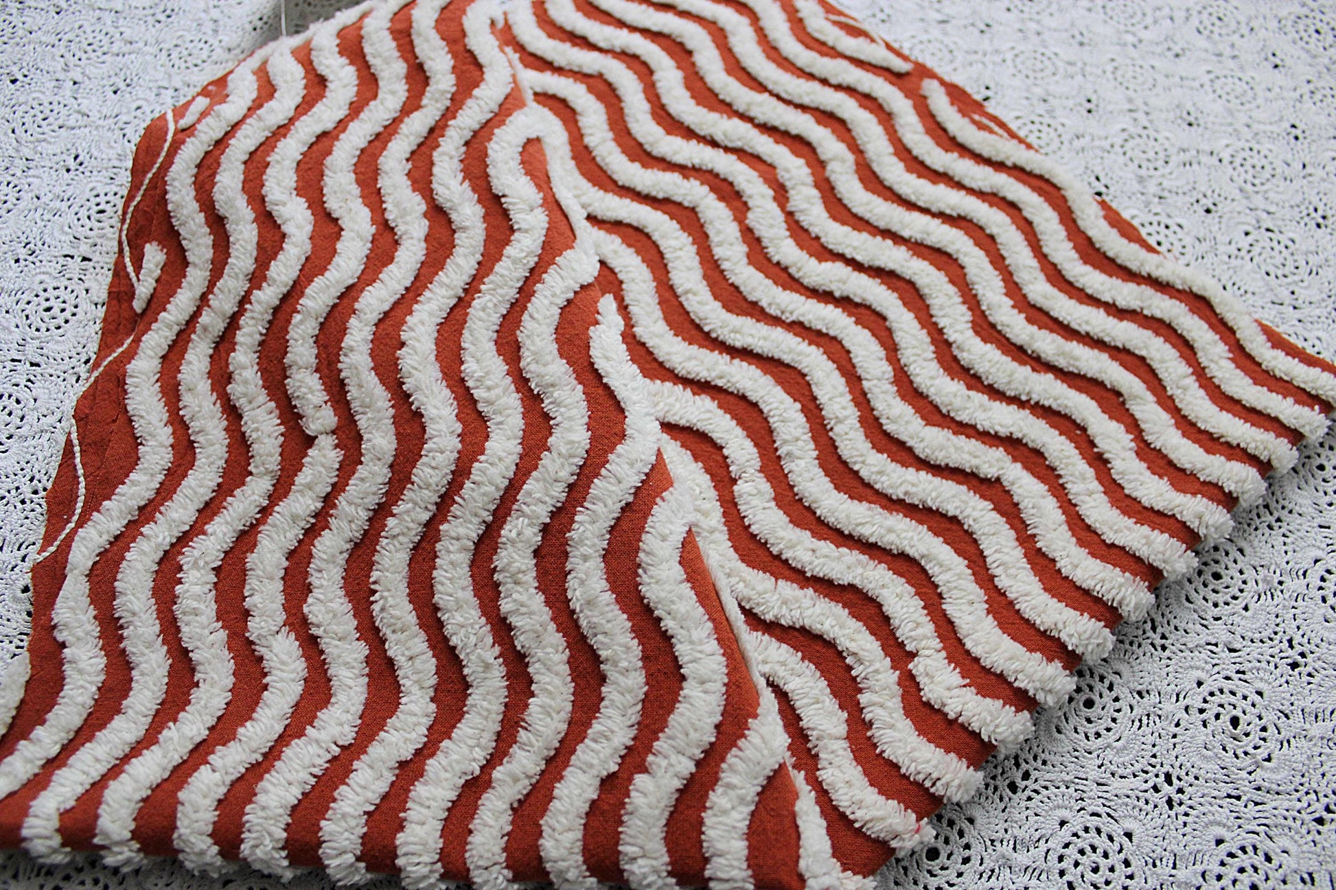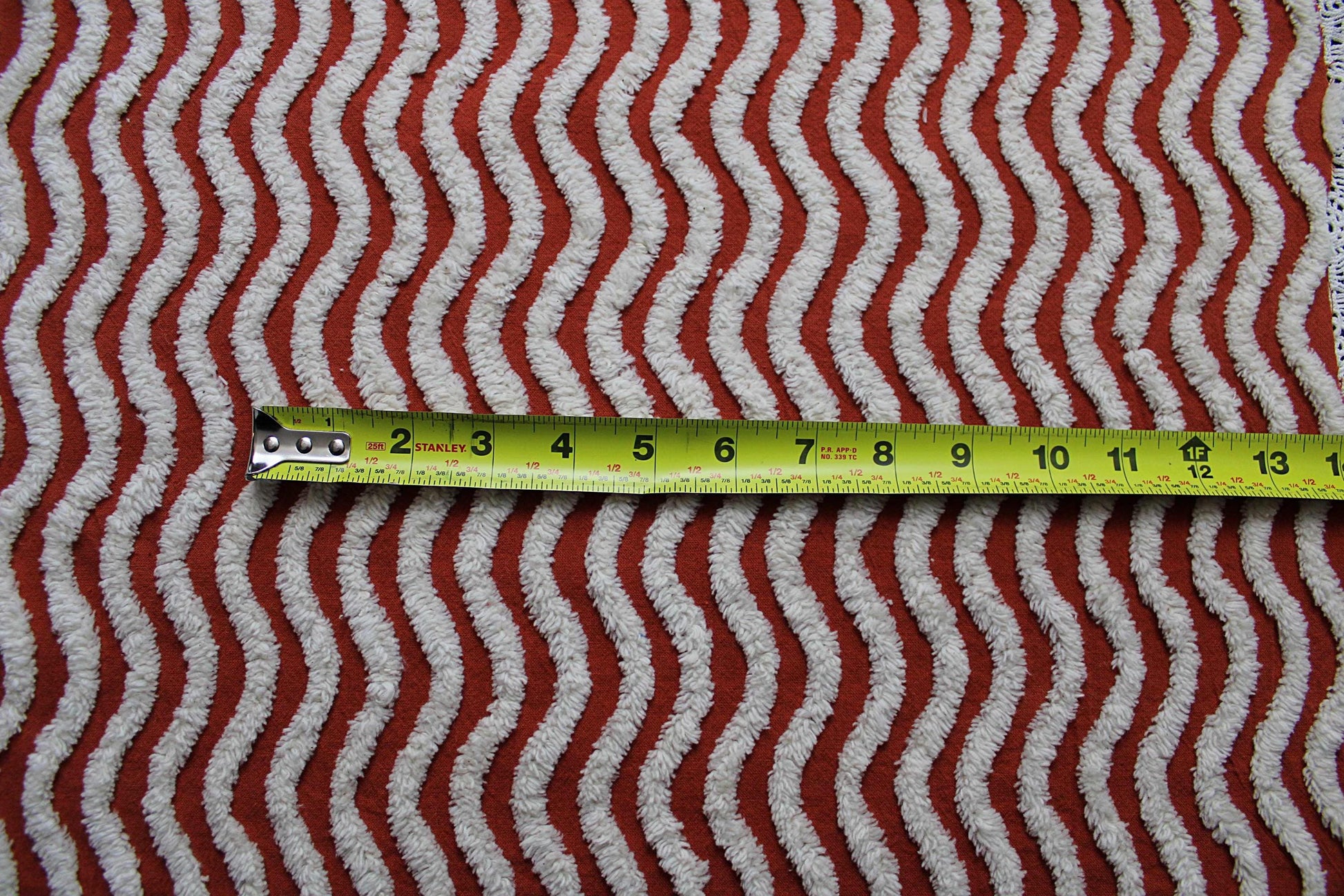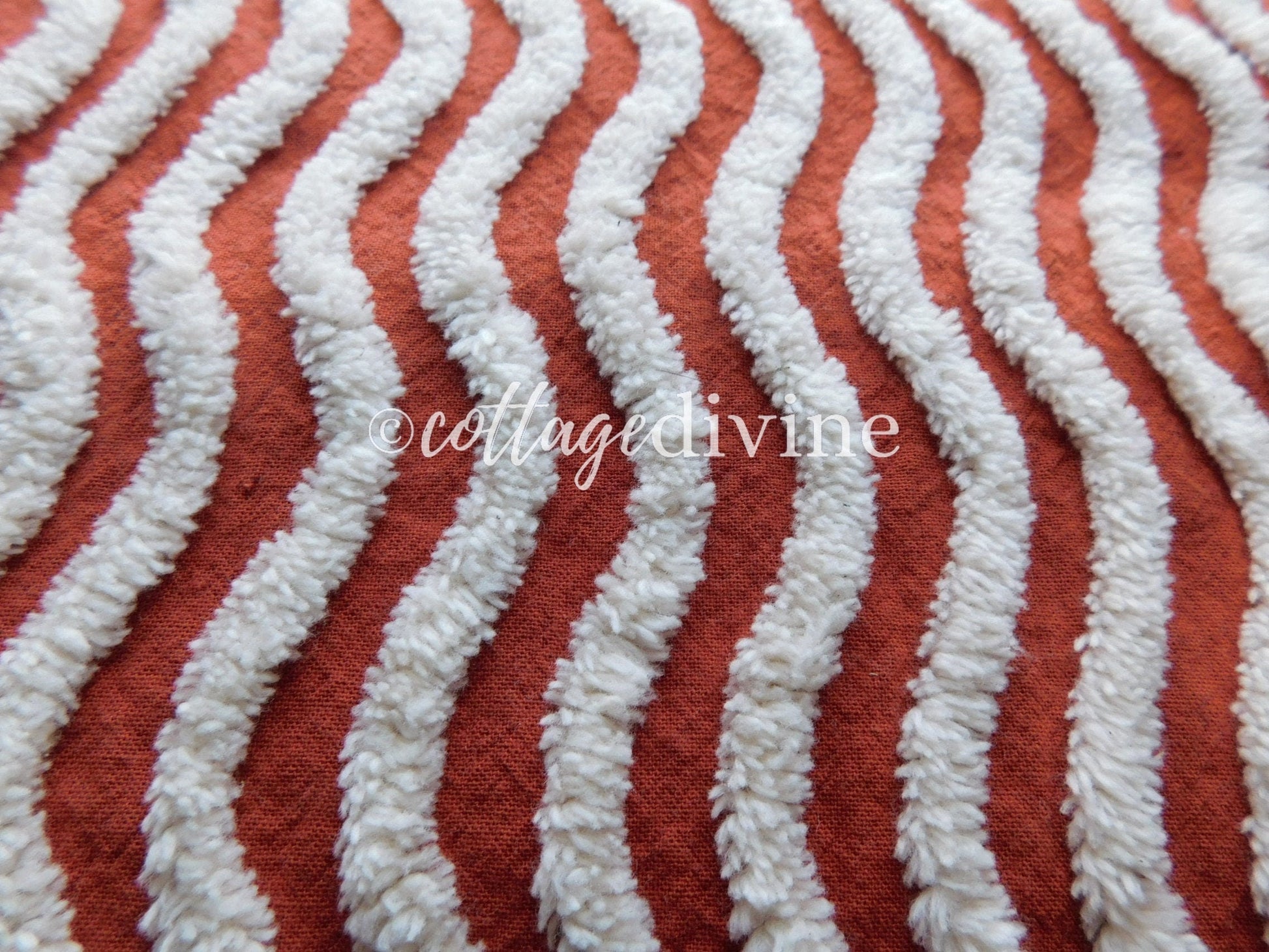 Add instant boho vibes to your project with this vintage chenille fabric. In an earthy, rich rustic rust color tufted with a white ripple stripe design that POPS against the deep background.Approx 18" x 24" inch fabric piece. Pairs well with olive, gold & medium to dark yellows. Though some of the photos may appear red, the bkgd is definitely a rust tone in person.