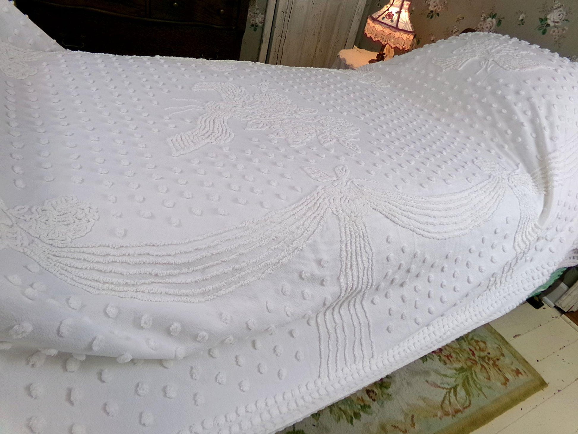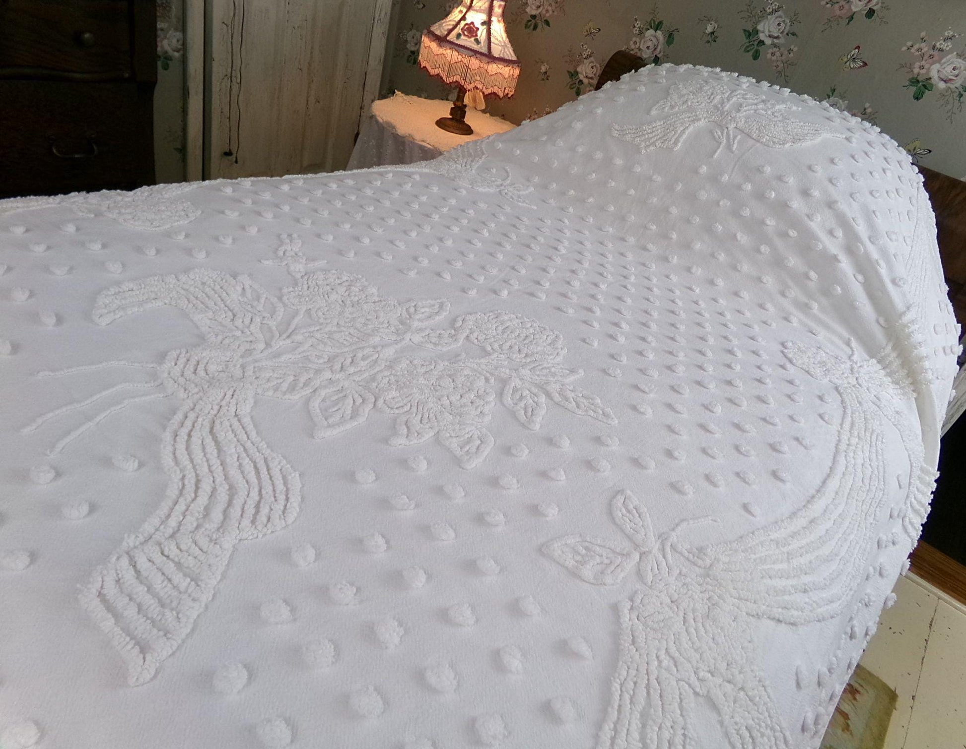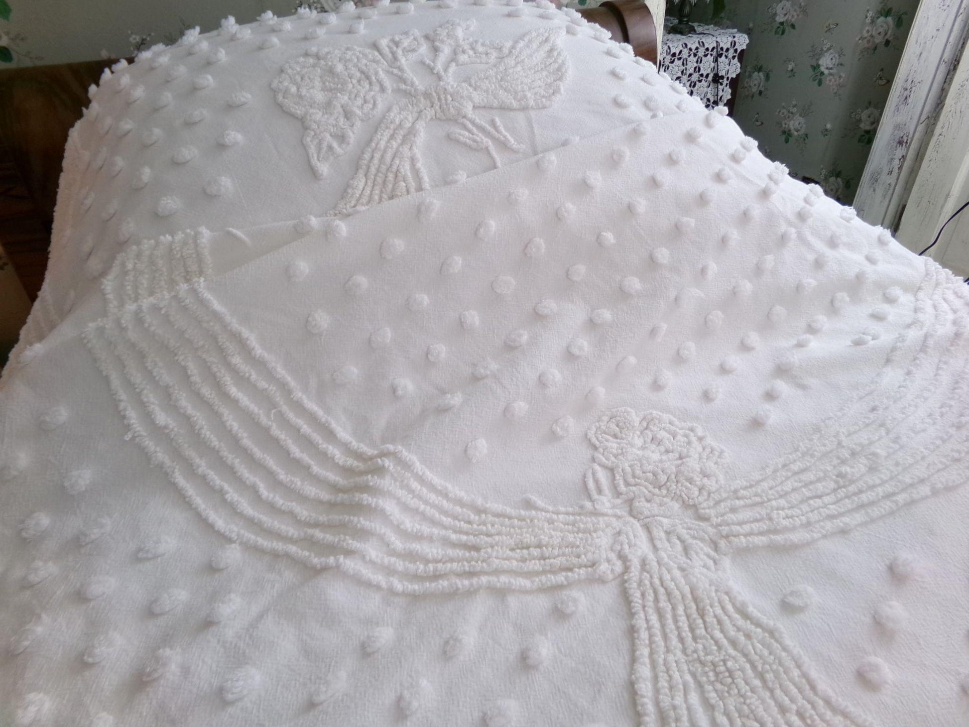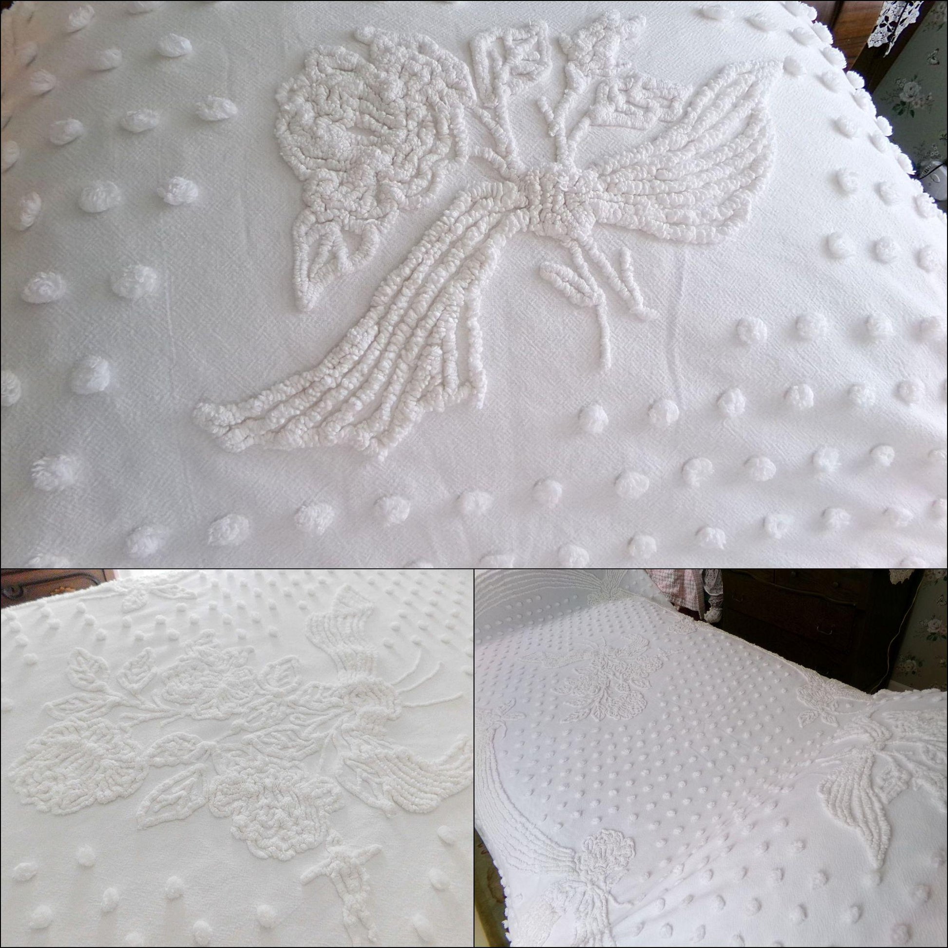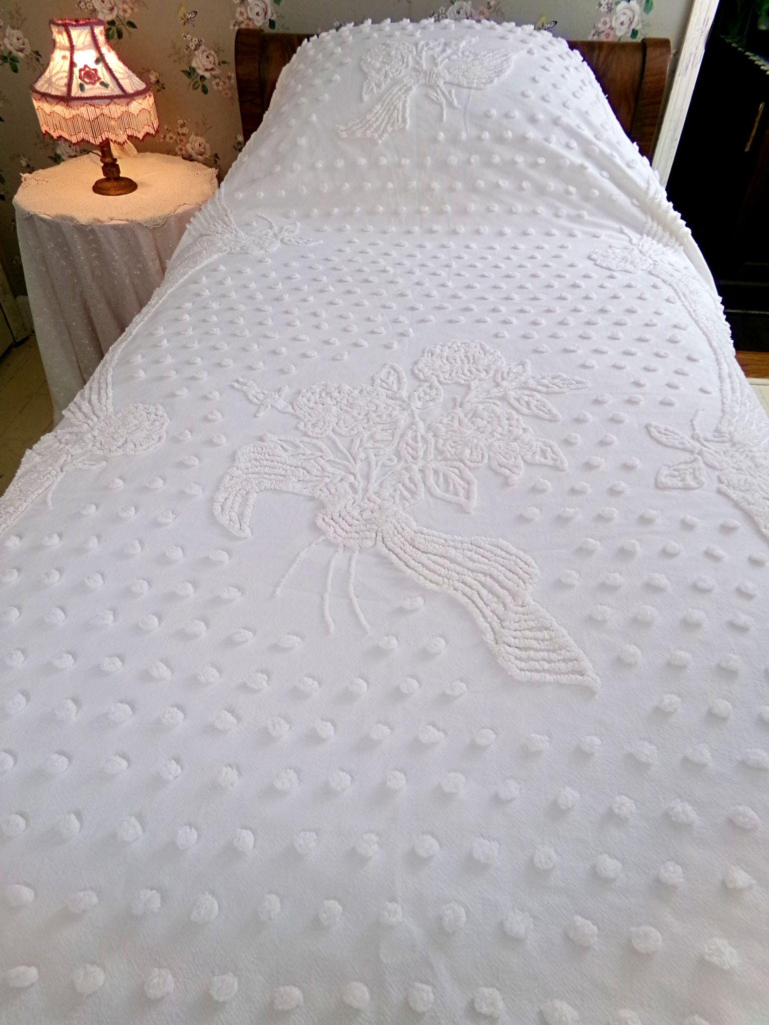Uplift any room with romantic farmhouse style...this classic white vintage chenille bedspread presents a gorgeous rose floral bouquet, surrounded by tufted dots & accent swags. The versatile white color makes this lovely bedspread able to adapt to just about any space you choose to display it in.{} TWIN SIZE, approx 68"W x 99"L, a great bedspread for layering. Lightweight quality 100% cotton with elaborate needletufting. Ideal as a summer coverlet.