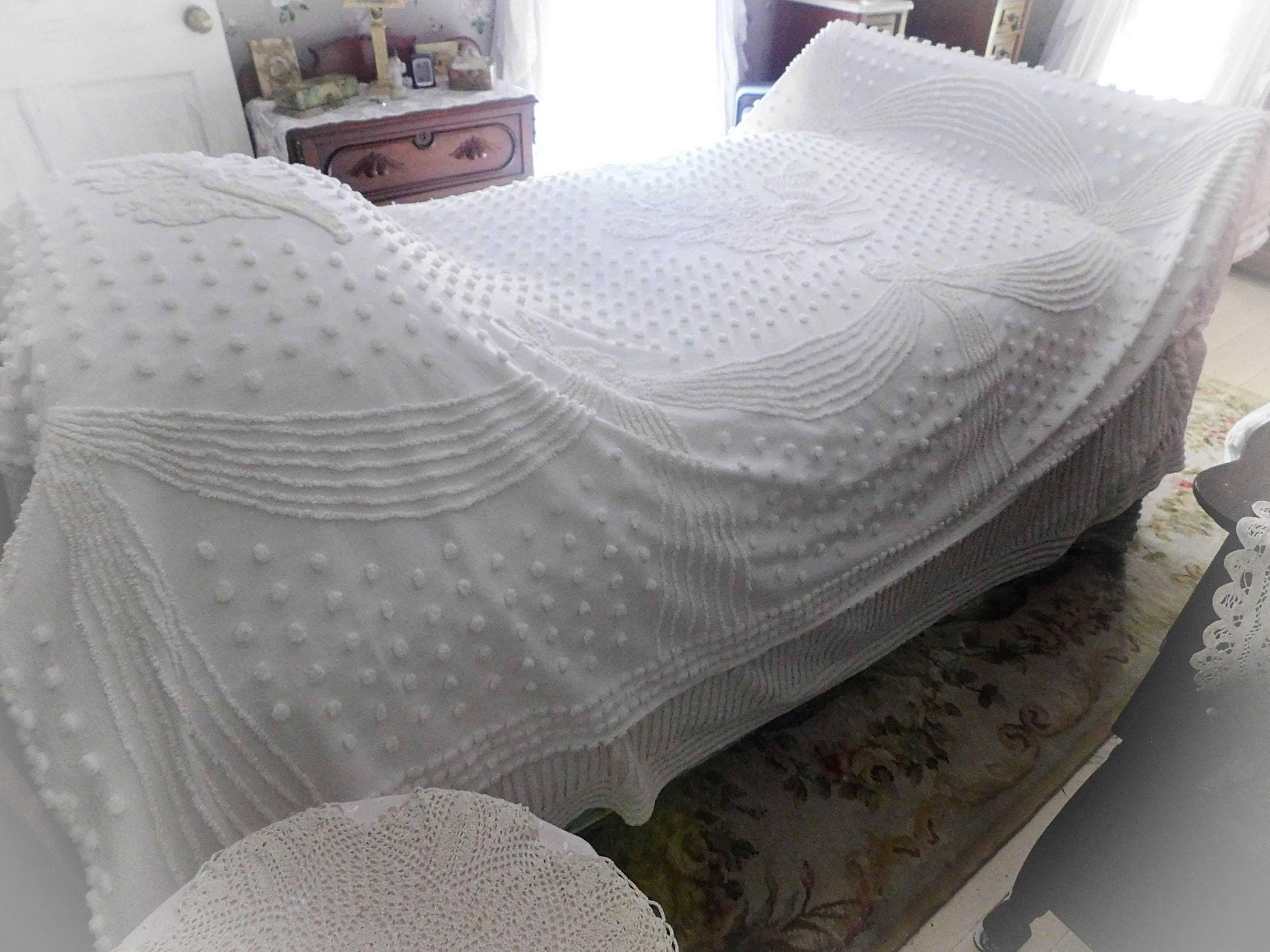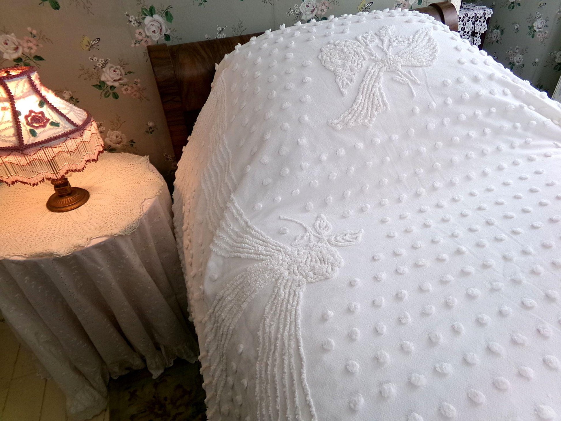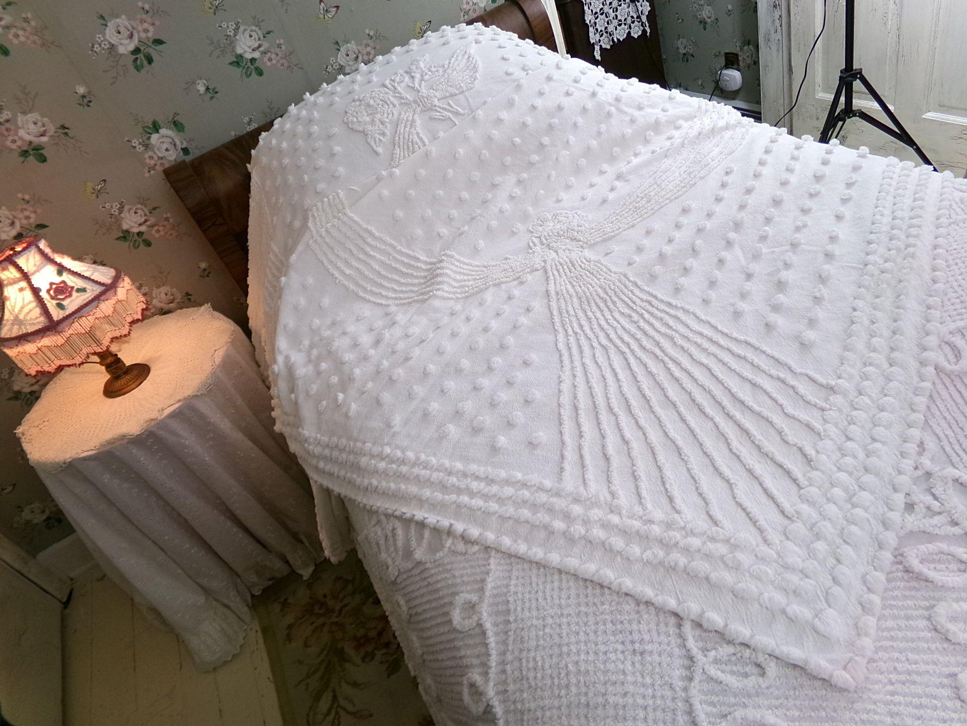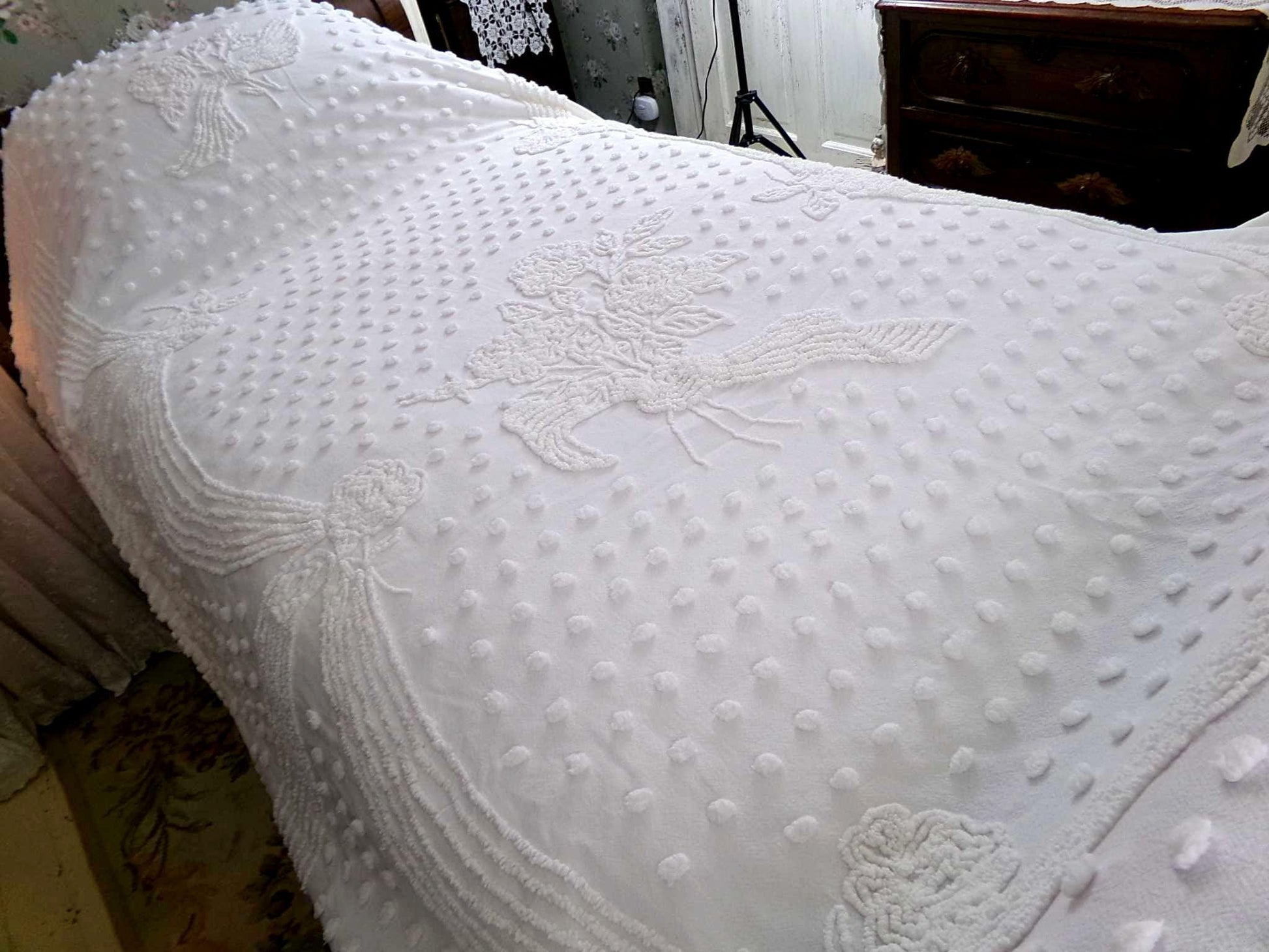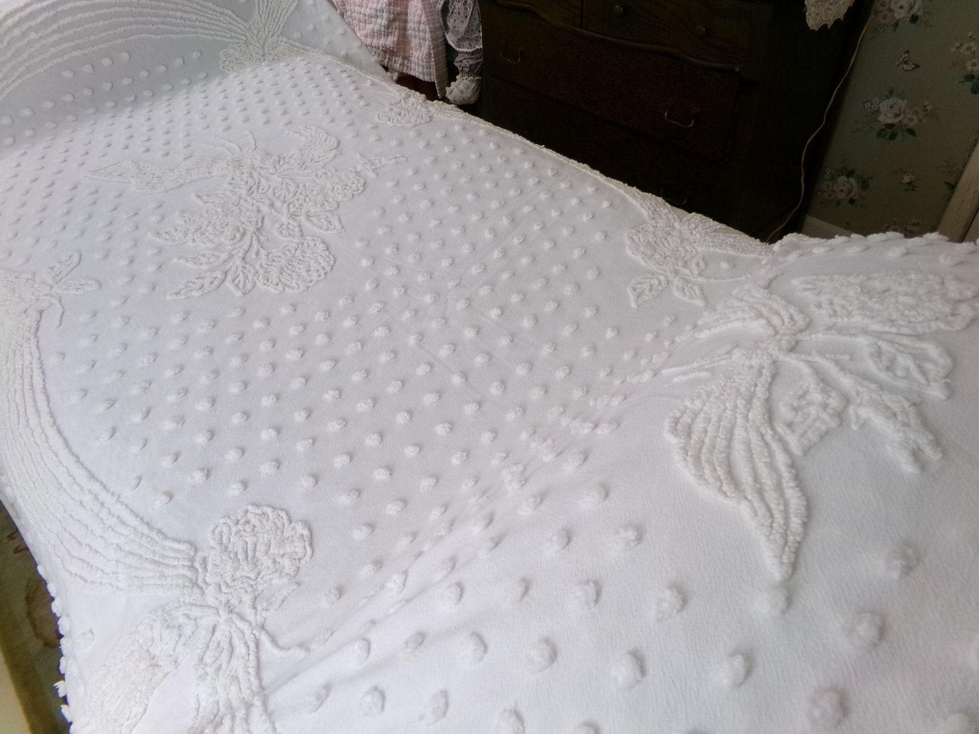 Uplift any room with romantic farmhouse style...this classic white vintage chenille bedspread presents a gorgeous rose floral bouquet, surrounded by tufted dots & accent swags. The versatile white color makes this lovely bedspread able to adapt to just about any space you choose to display it in.{} TWIN SIZE, approx 68"W x 99"L, a great bedspread for layering. Lightweight quality 100% cotton with elaborate needletufting. Ideal as a summer coverlet.