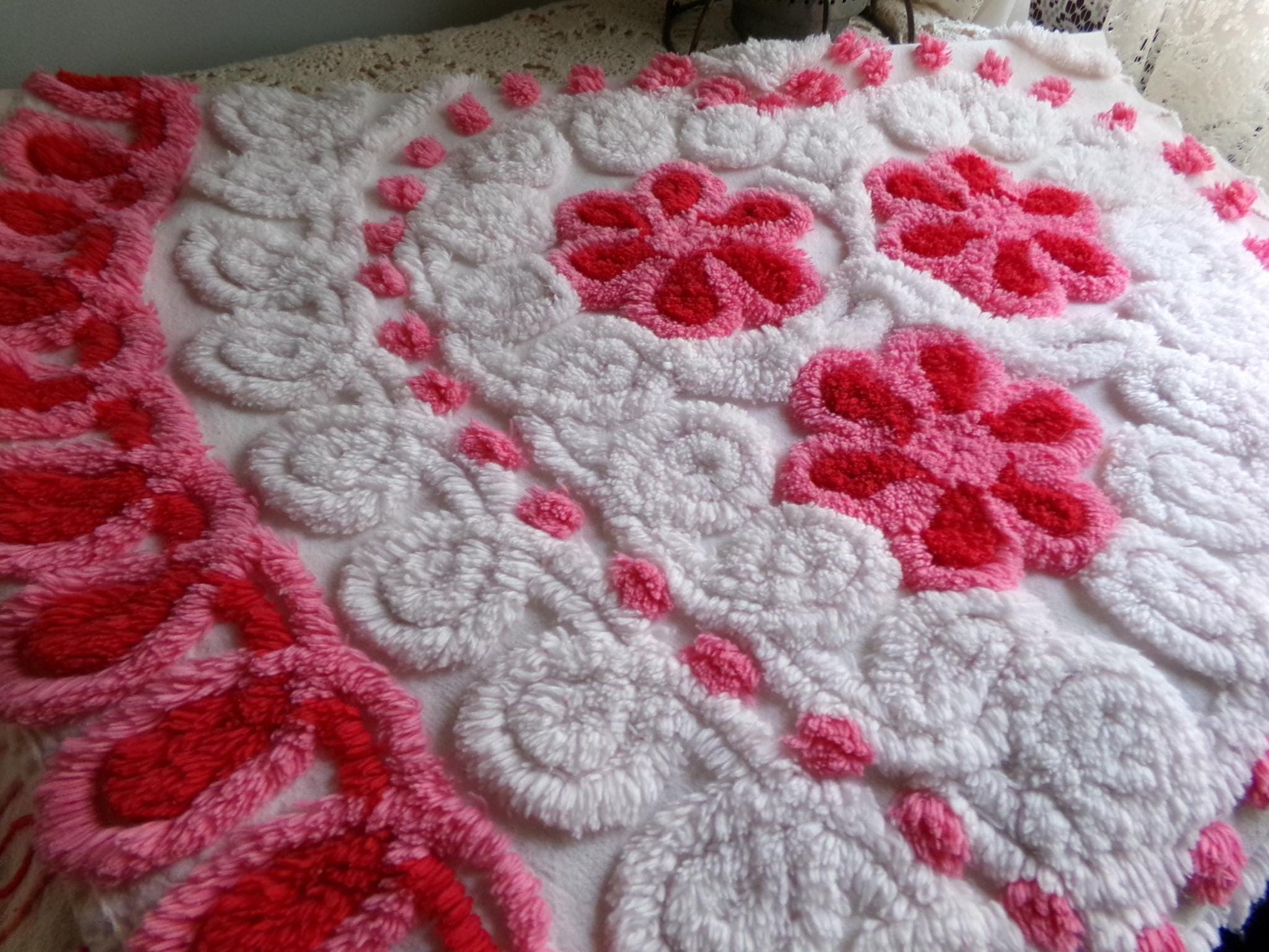 Plush cozy cute vintage chenille fabric features a candybox heart design on a white bkgd. How do you envision crafting with this fun piece of fabric? Handmade quilt...cute pillow cover...wall hanging...something else?Measures about 21" x 26" inches, rounded corner piece. 100% plush cotton. Original vintage chenille fabric sourced from a 1950s bedspread. Common to this white & pink tone color, you'll notice some carryover of pink fluffs onto the white bkgd.