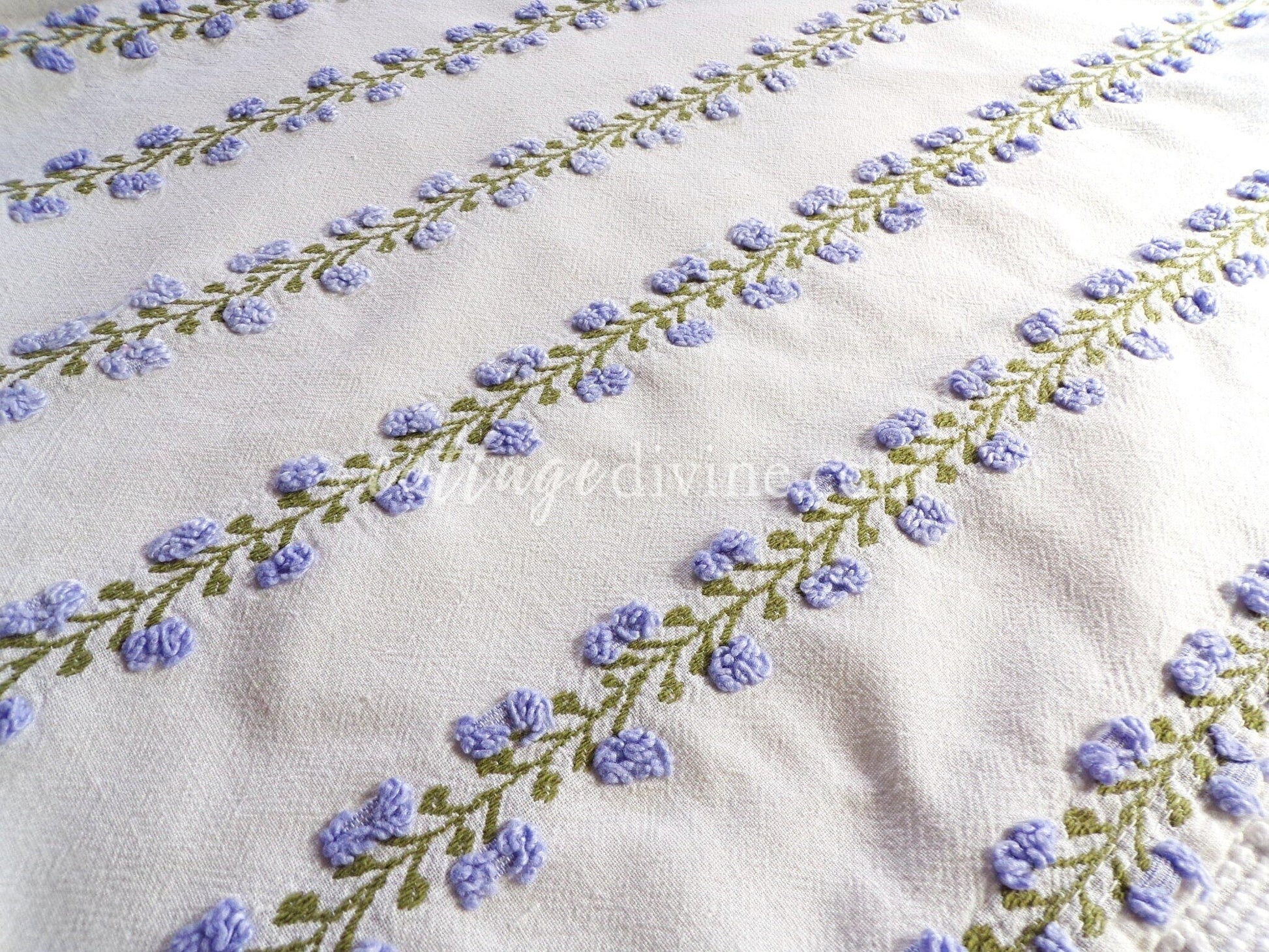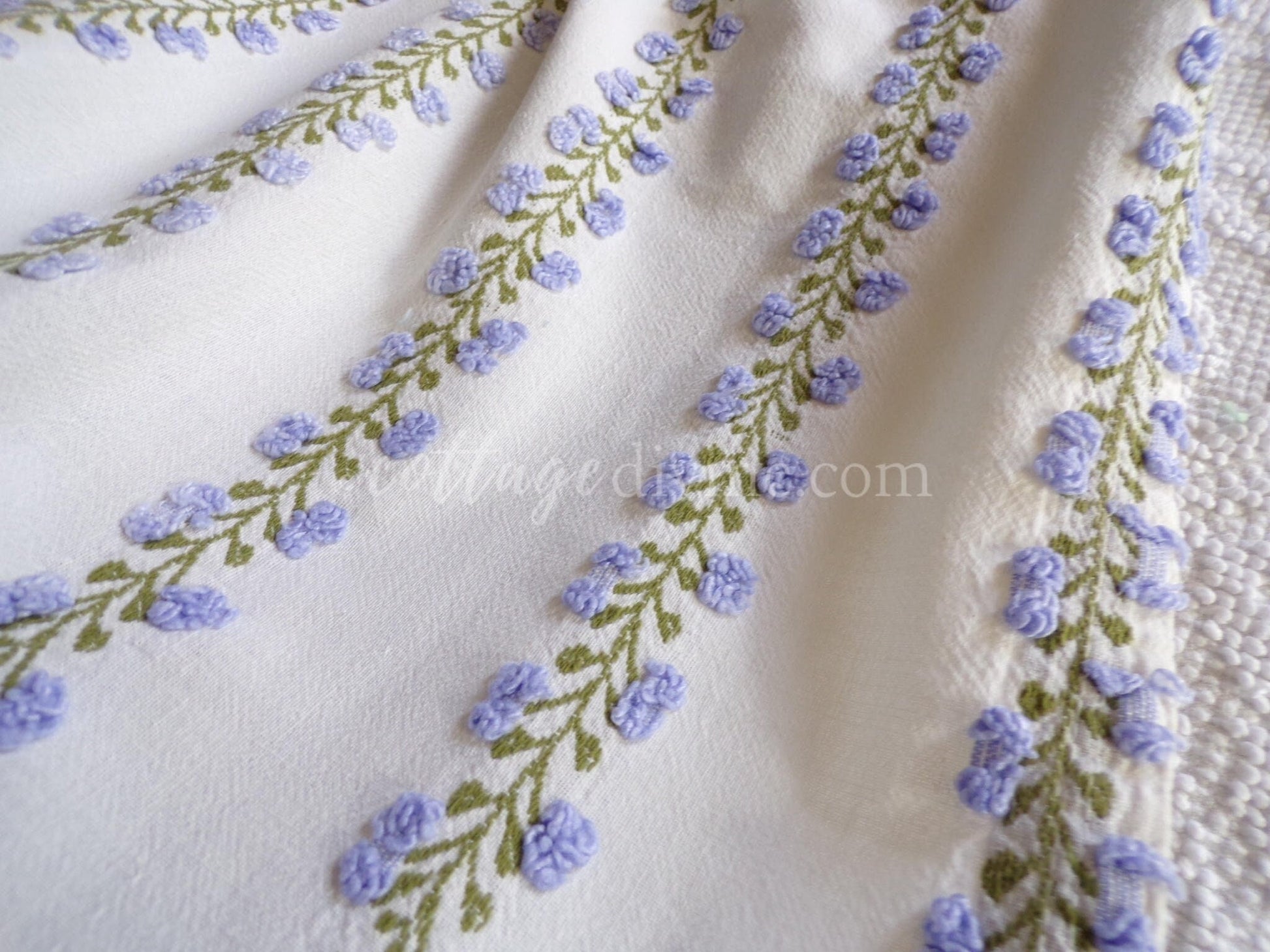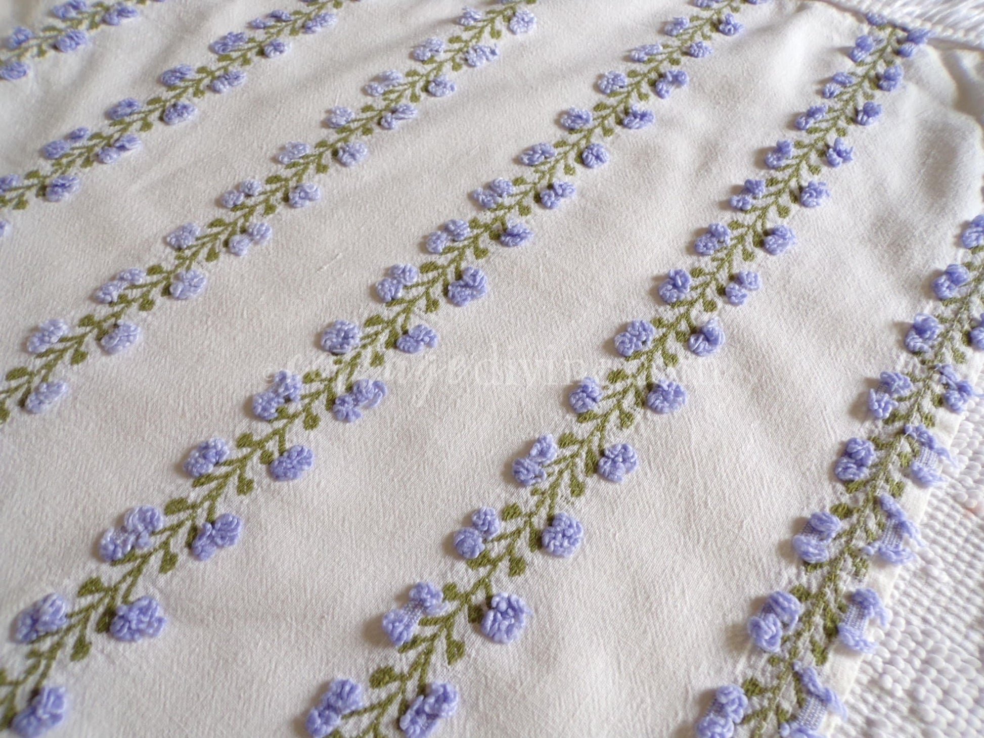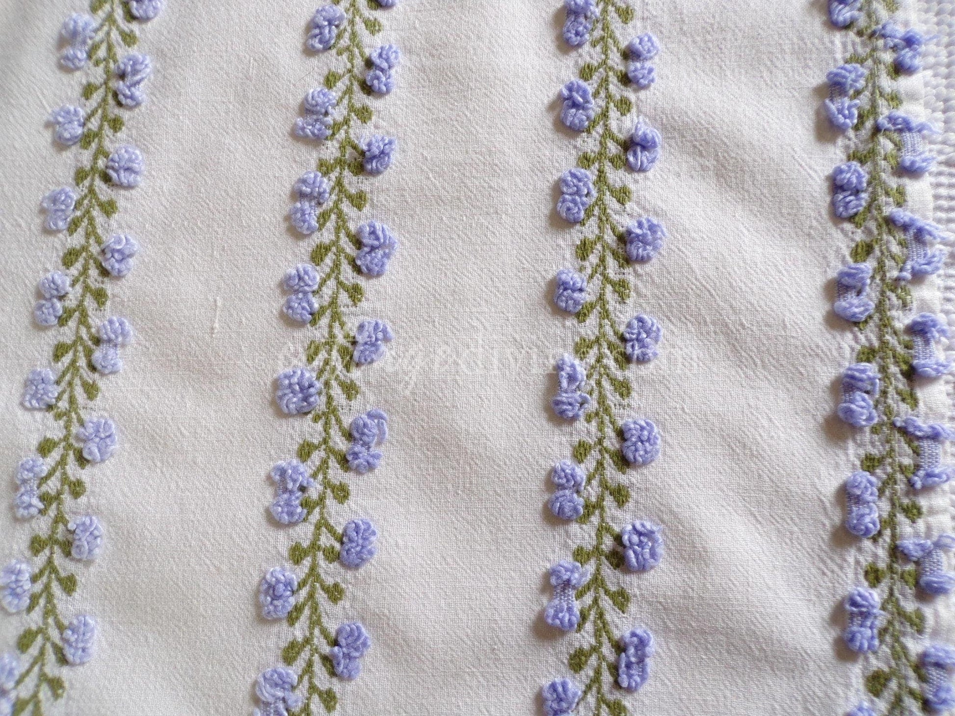 Last piece of this beautiful fabric! Looking for a lovely piece of vintage chenille to deliver just a hint of vintage romance to your design? This 18" x 22" inch fabric piece features small lavender tufted rosebuds climbing up an ivy. A seldom seen design by Fieldcrest in an impossible-to-find colorway.If you're familiar with Morgan Jones rosebuds, you'll find this fabric to be a nice deviation, with more demure roses and an old-world feel on a stronger cotton groundcloth. There may be a few age marks, but otherwise this fabric is in beautiful vintage condition.