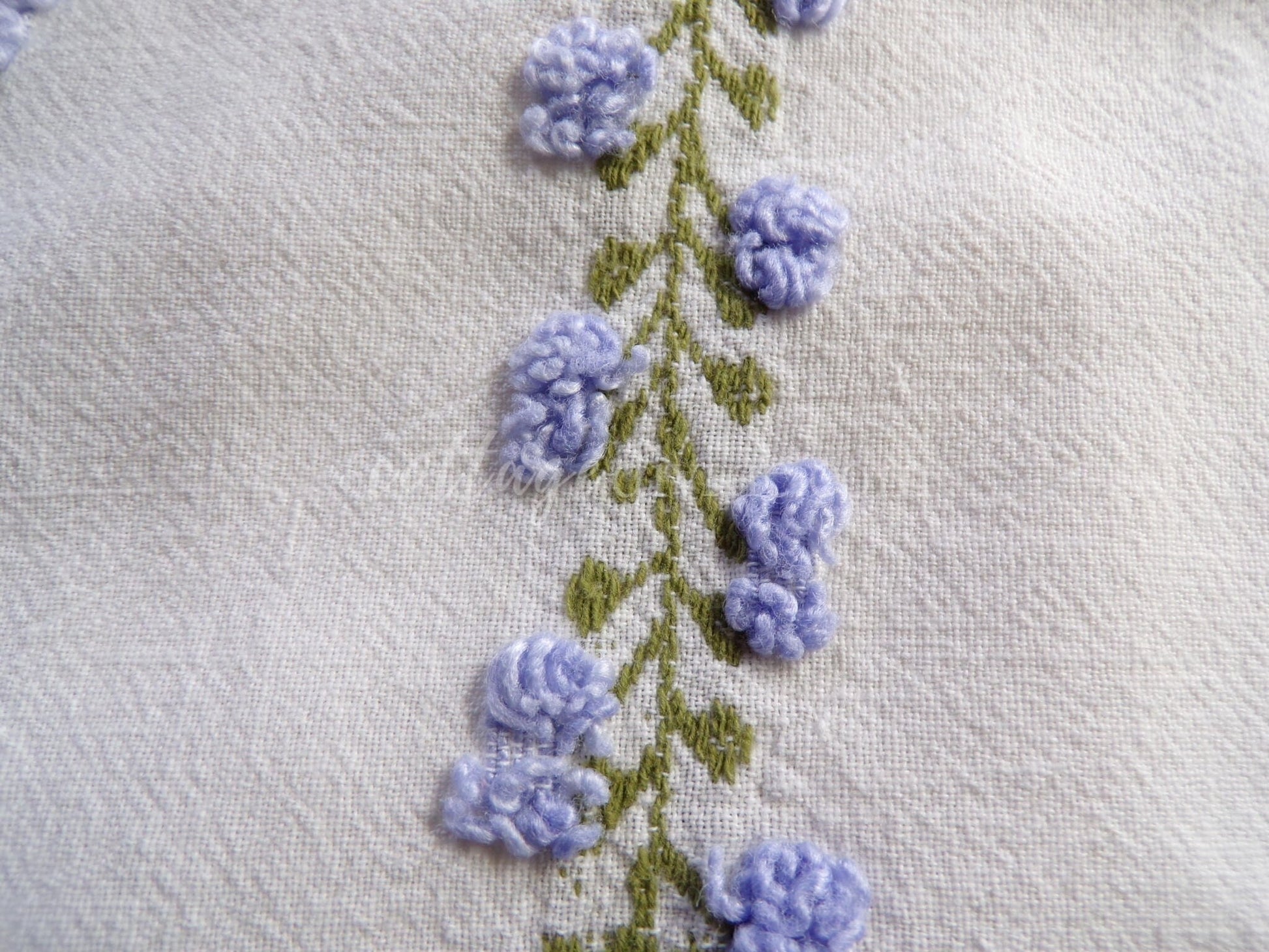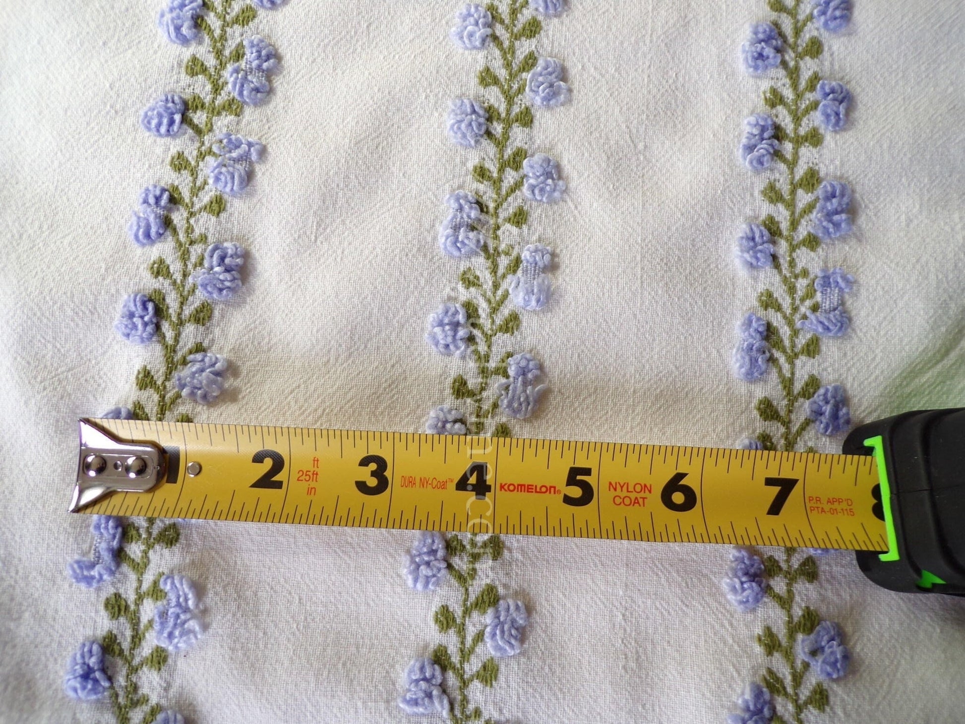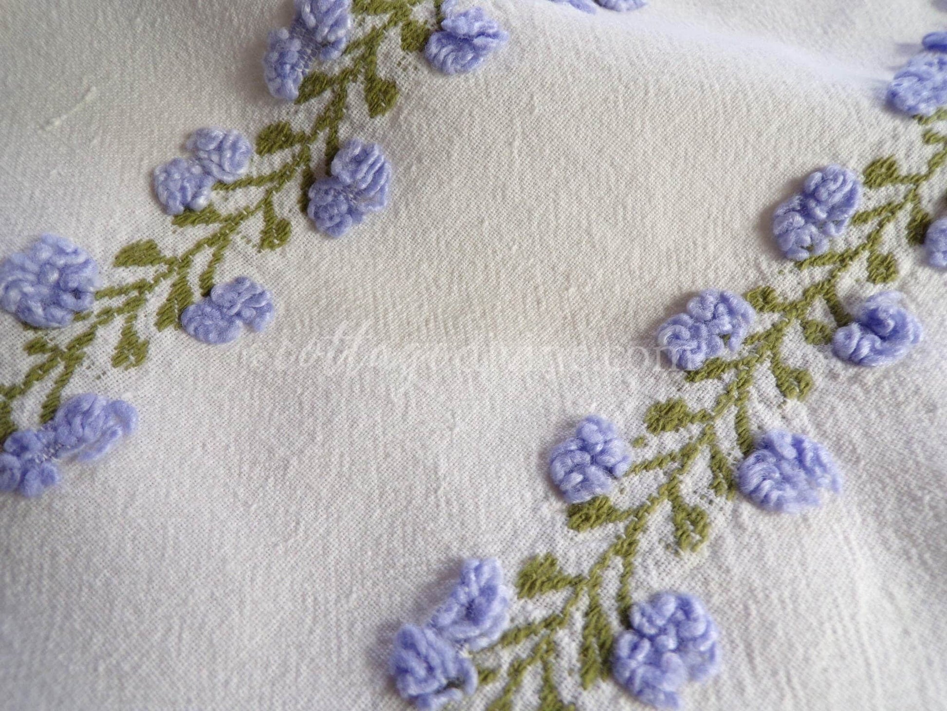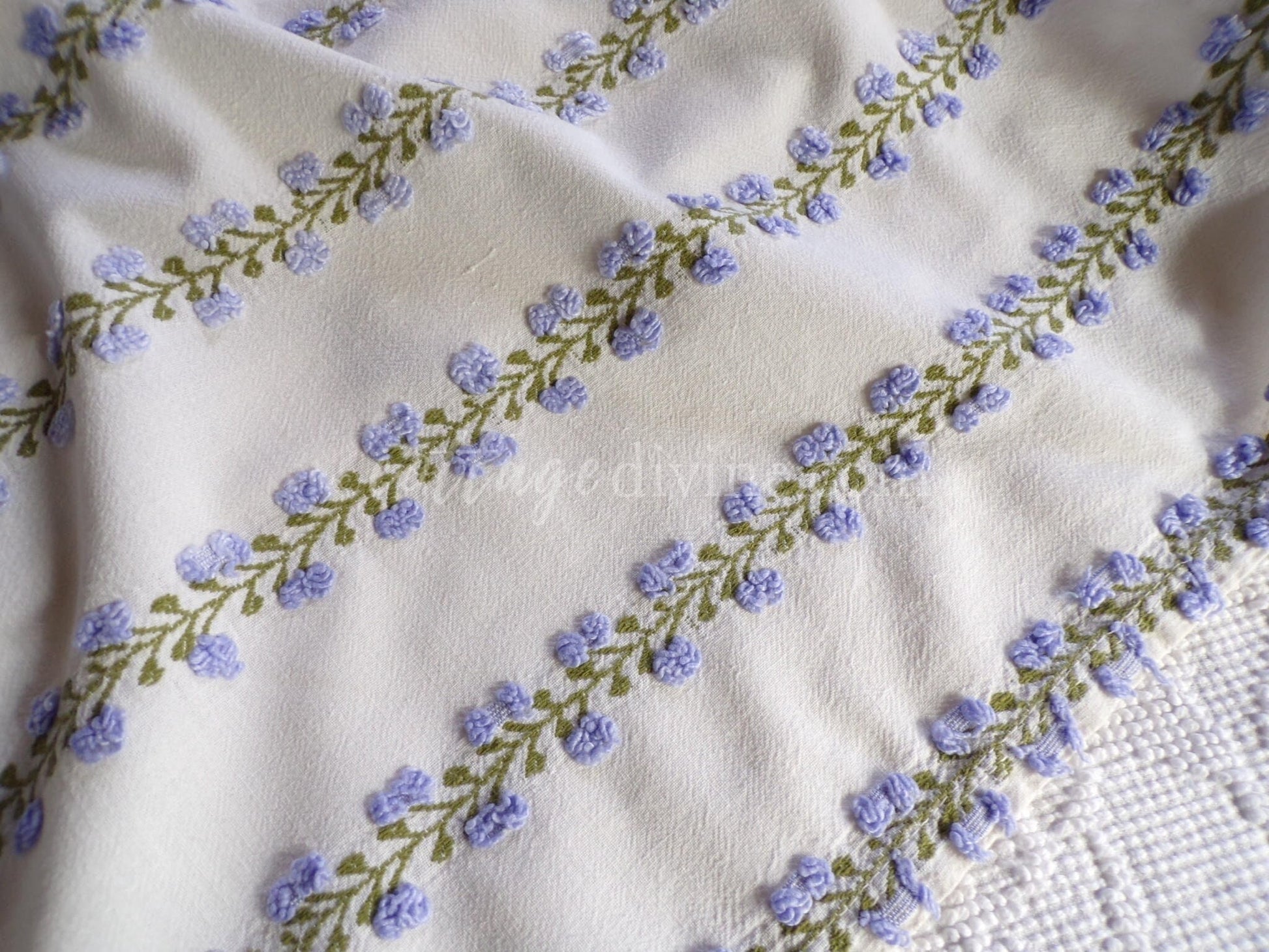 Last piece of this beautiful fabric! Looking for a lovely piece of vintage chenille to deliver just a hint of vintage romance to your design? This 18" x 22" inch fabric piece features small lavender tufted rosebuds climbing up an ivy. A seldom seen design by Fieldcrest in an impossible-to-find colorway.If you're familiar with Morgan Jones rosebuds, you'll find this fabric to be a nice deviation, with more demure roses and an old-world feel on a stronger cotton groundcloth. There may be a few age marks, but otherwise this fabric is in beautiful vintage condition.