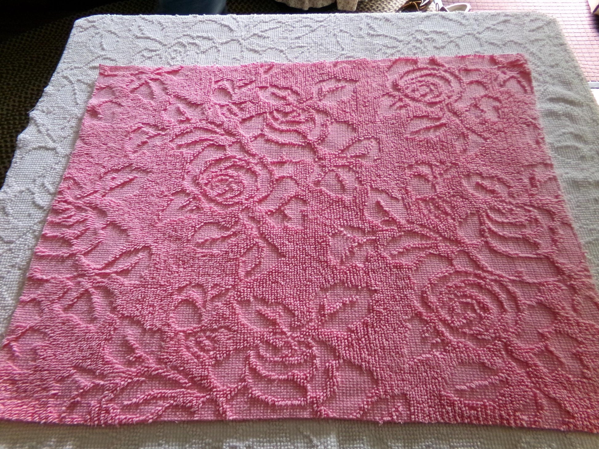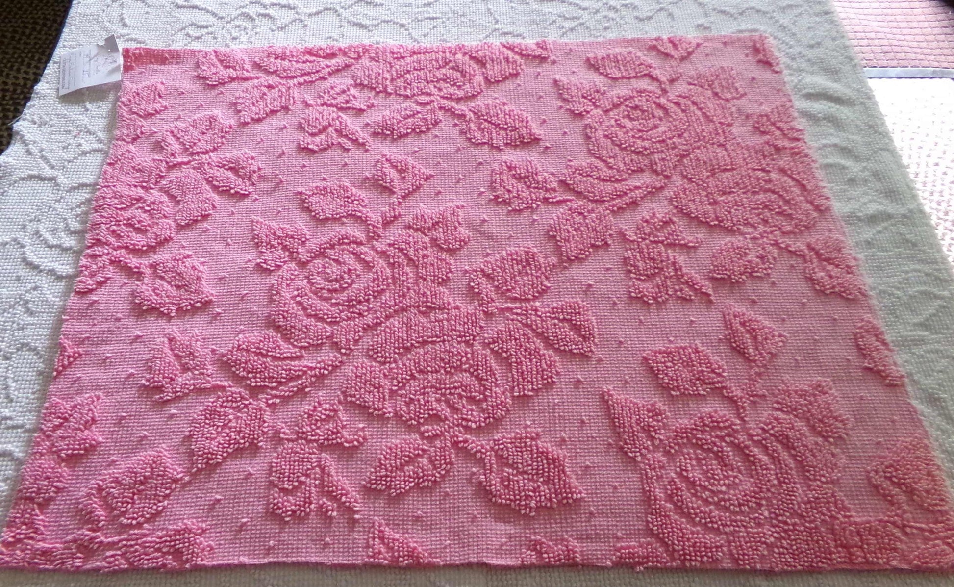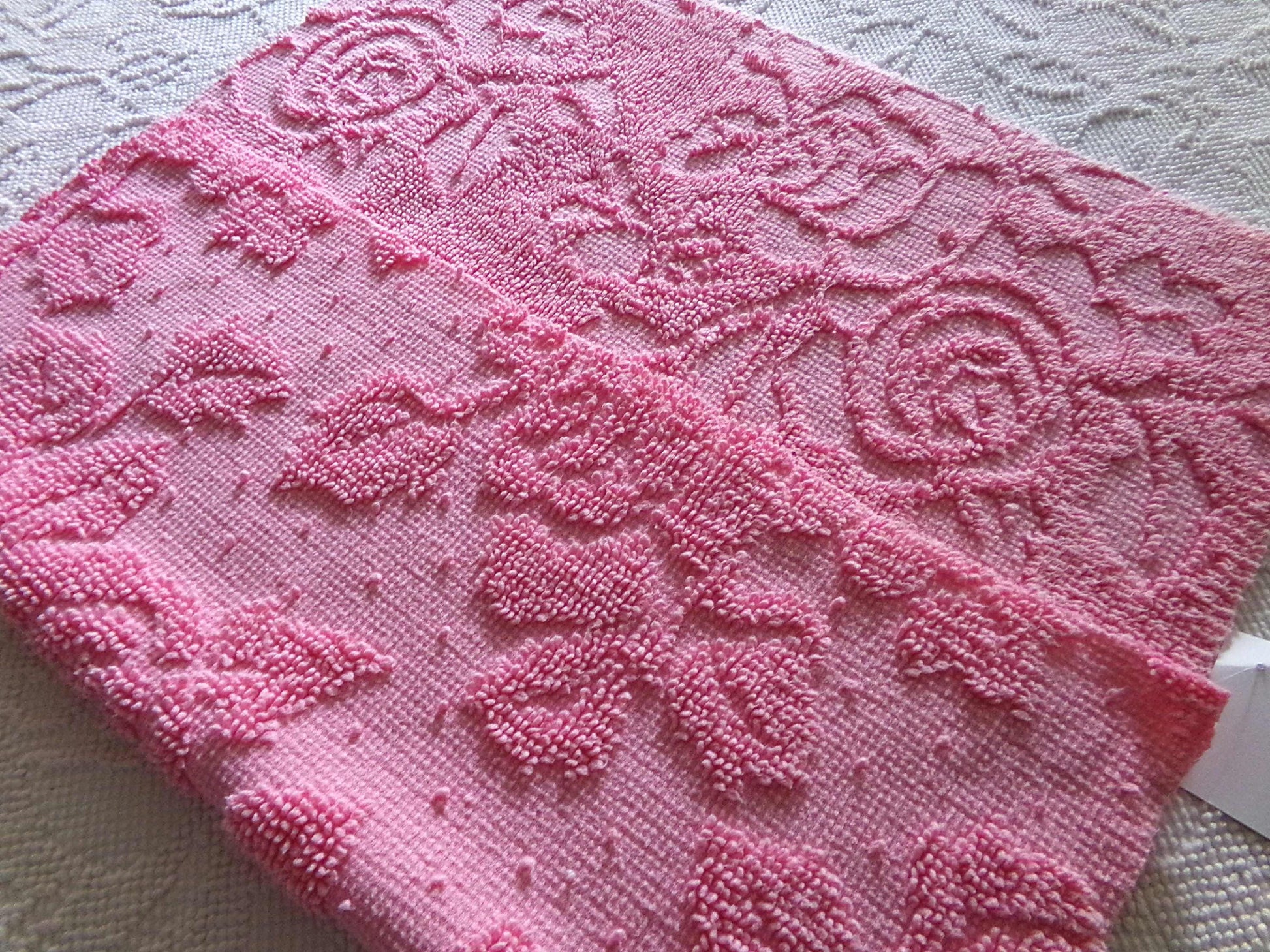 Instantly create the coveted cottage chic look in your pretty project with this gorgeous piece of vintage chenille fabric. It is in the most beautiful shade of pink, with a reversible prominent cabbage rose design accented with tiny raised dots on one side.Measures 19" x 25" inches. Presents beautifully in just about any project, and it's durable enough to use in small bags and totes. Common to this pattern, you'll find some pulls given the woven hobnail design.