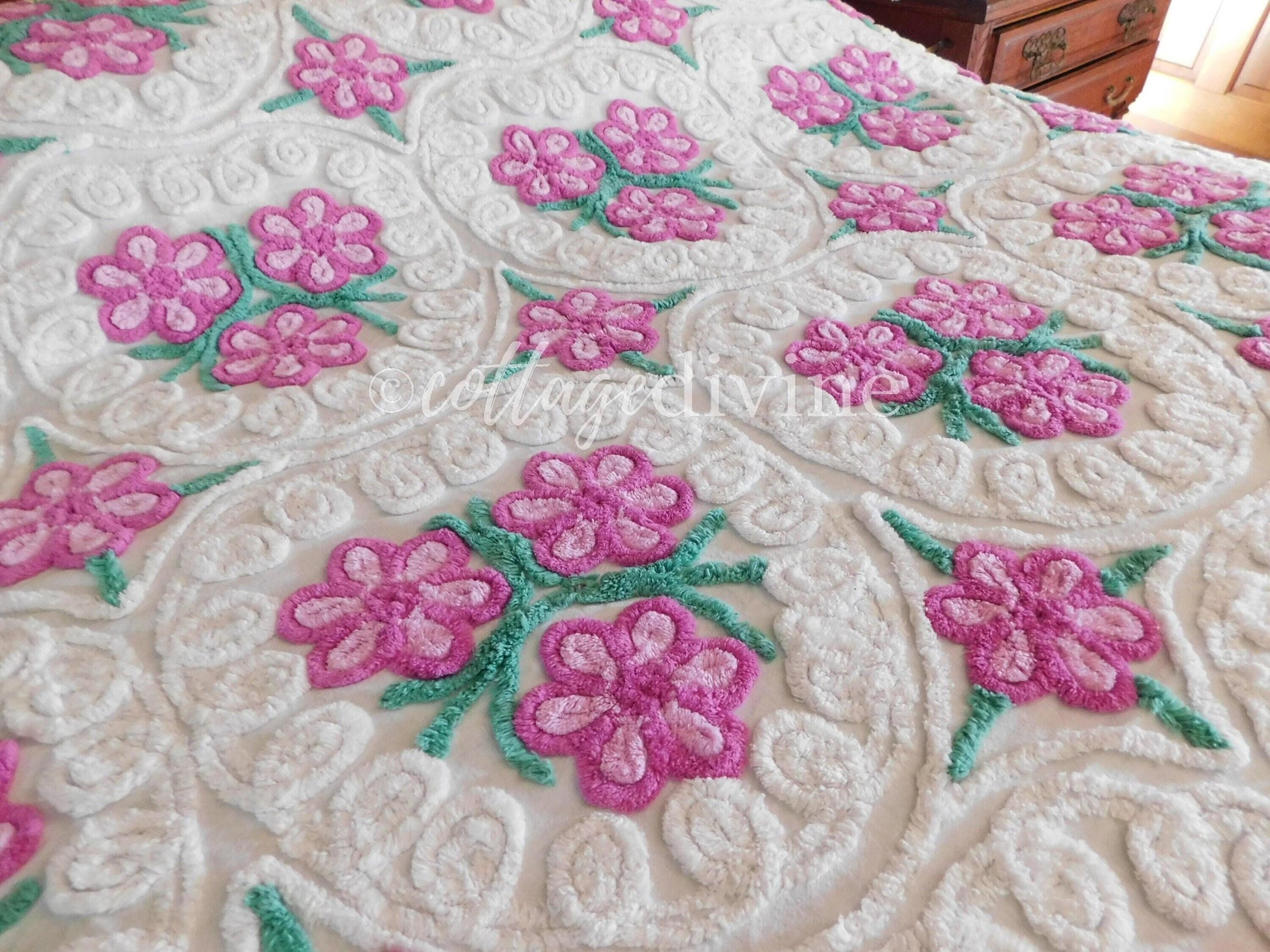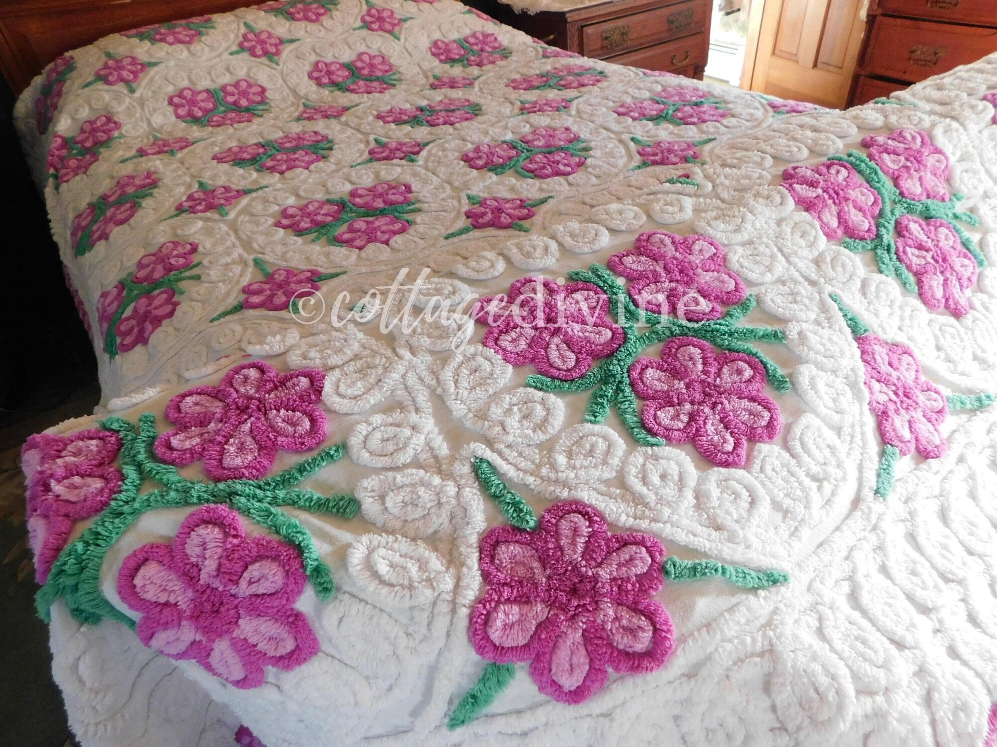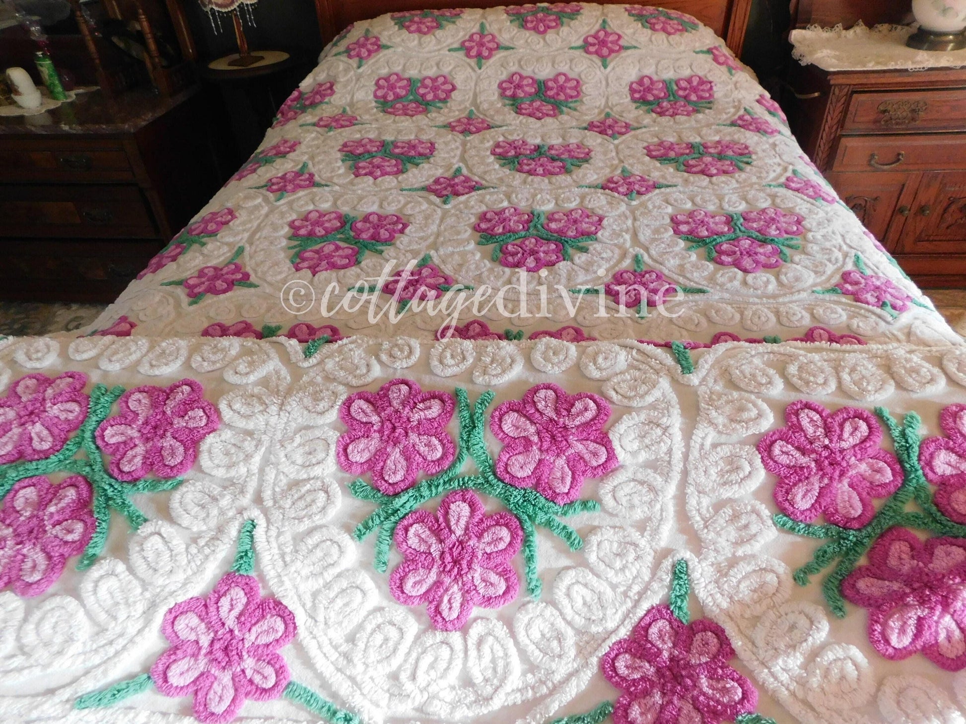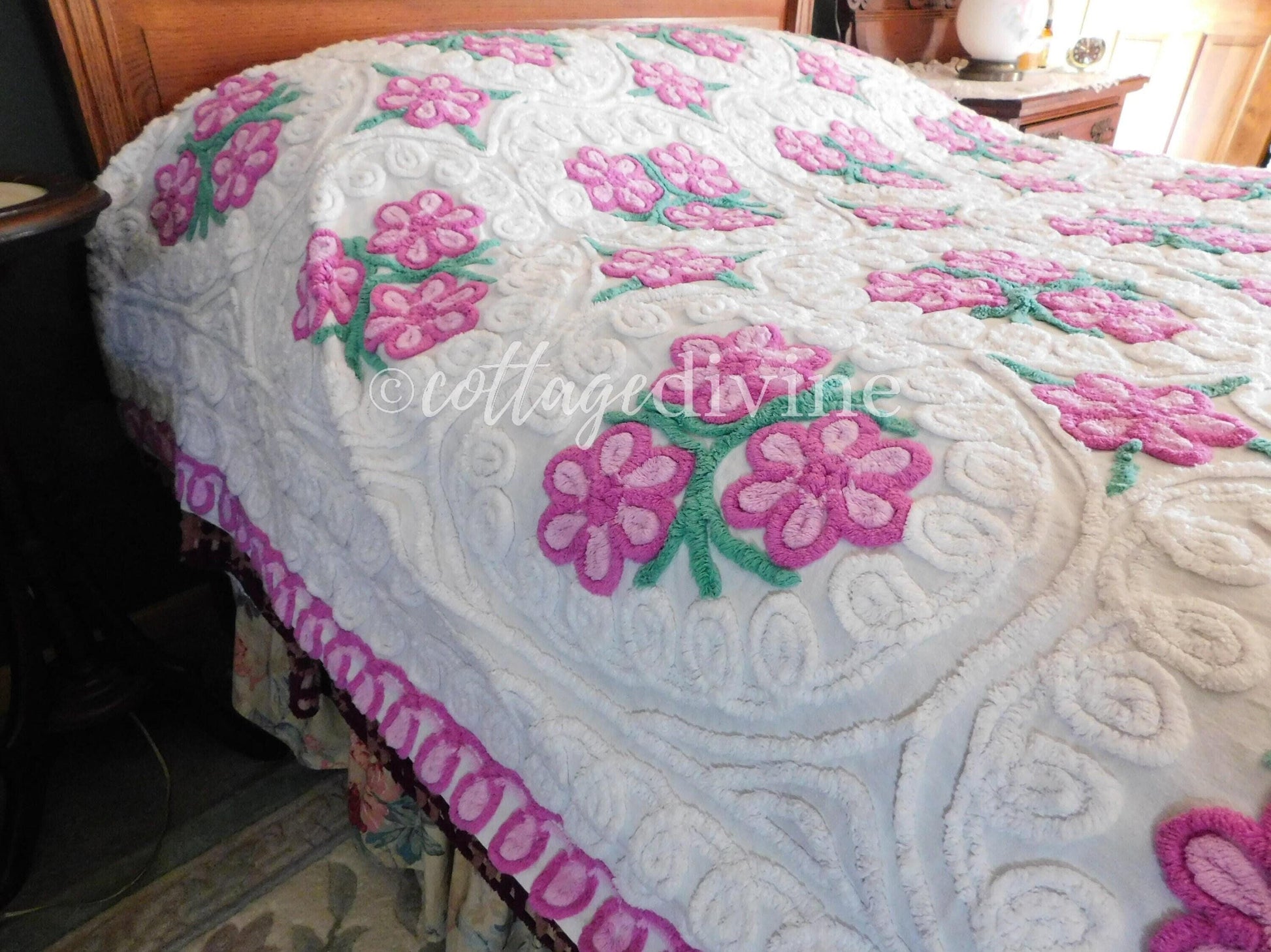 {FULL Size} Romantic plush hearts abound on this 1950s era darling vintage chenille bedspread. Lush swirls of white curlicue loops form prominent hearts with a trio of orchid colored flowers in the center of each. Super cheerful, this special spread has a wonderful essence of joy blended with a cozy old-fashioned nostalgia. A midcentury cottage dream..- FULL size vtg chenille bedspread, displayed on standard full bed- approx msmts: 90"W x 100"L