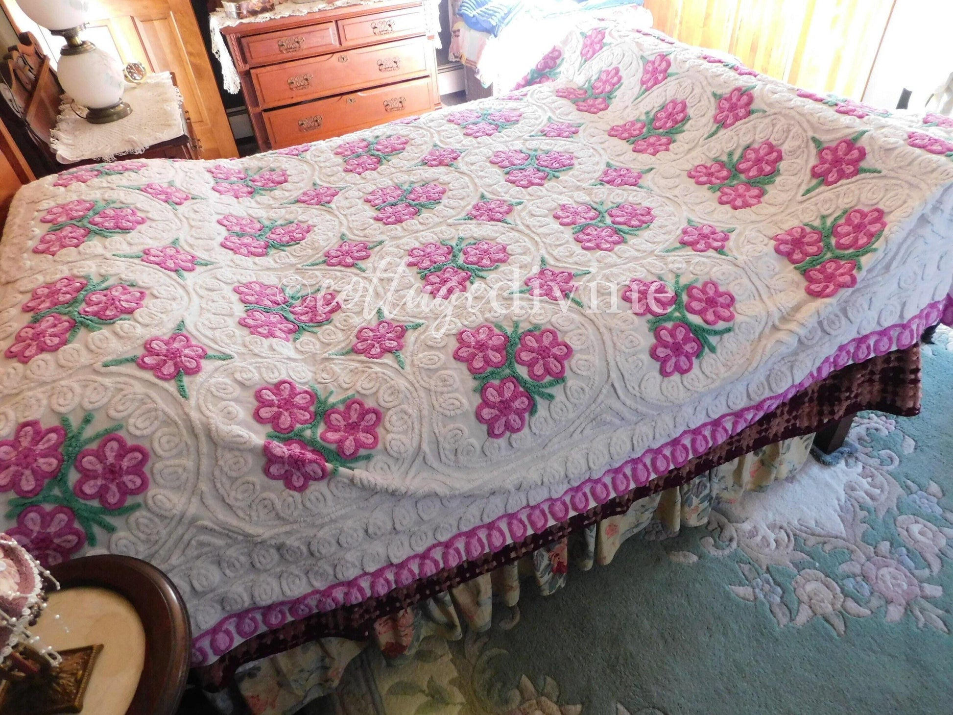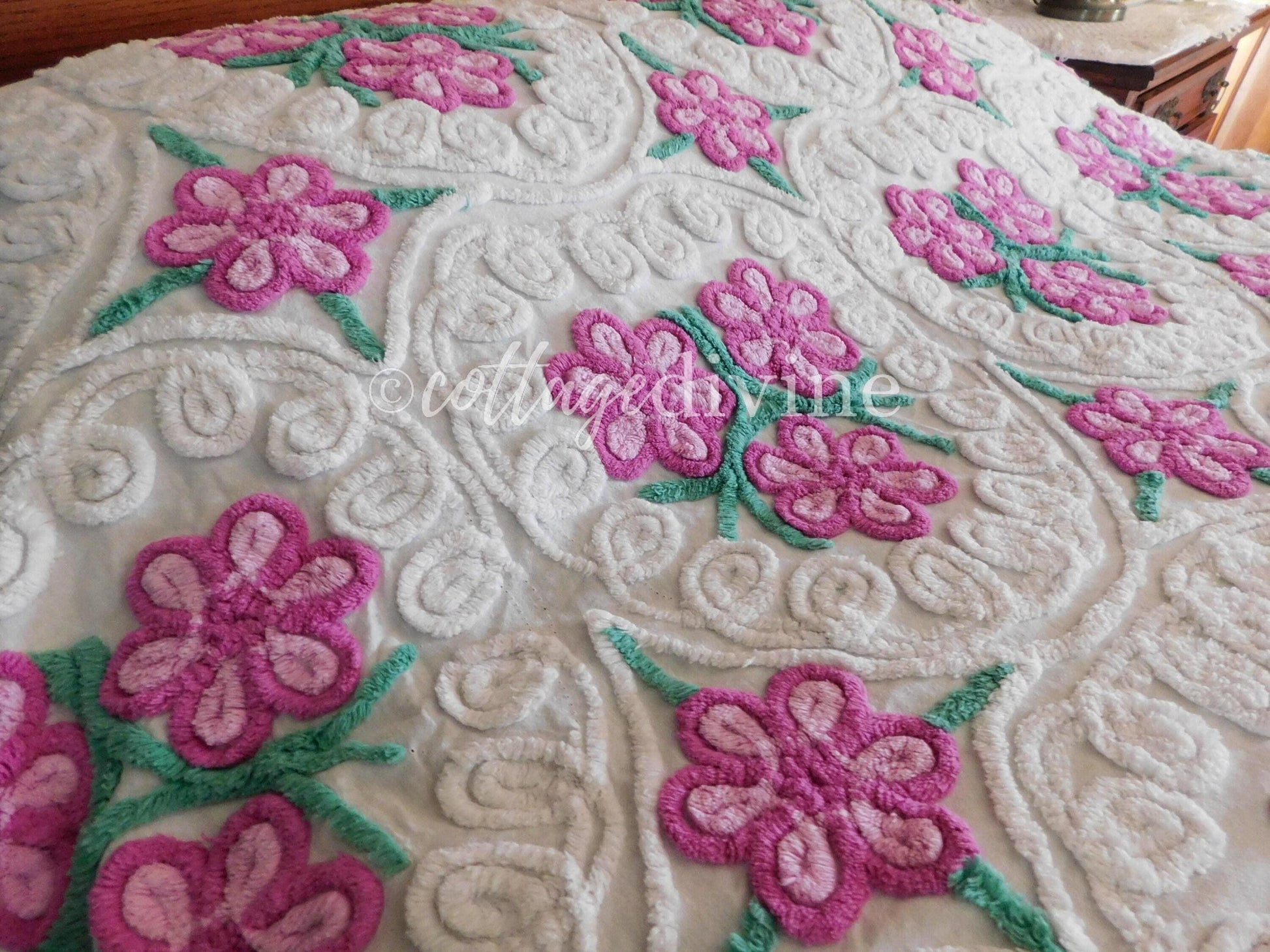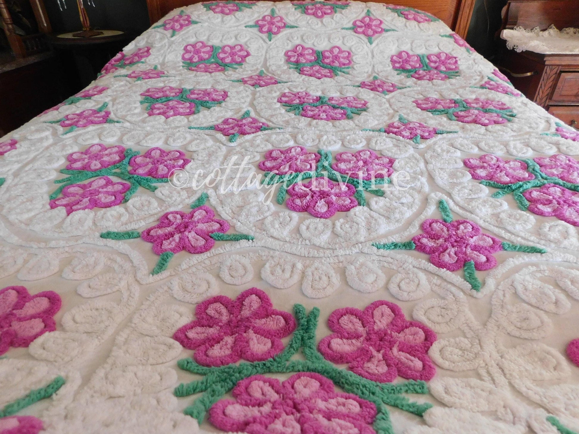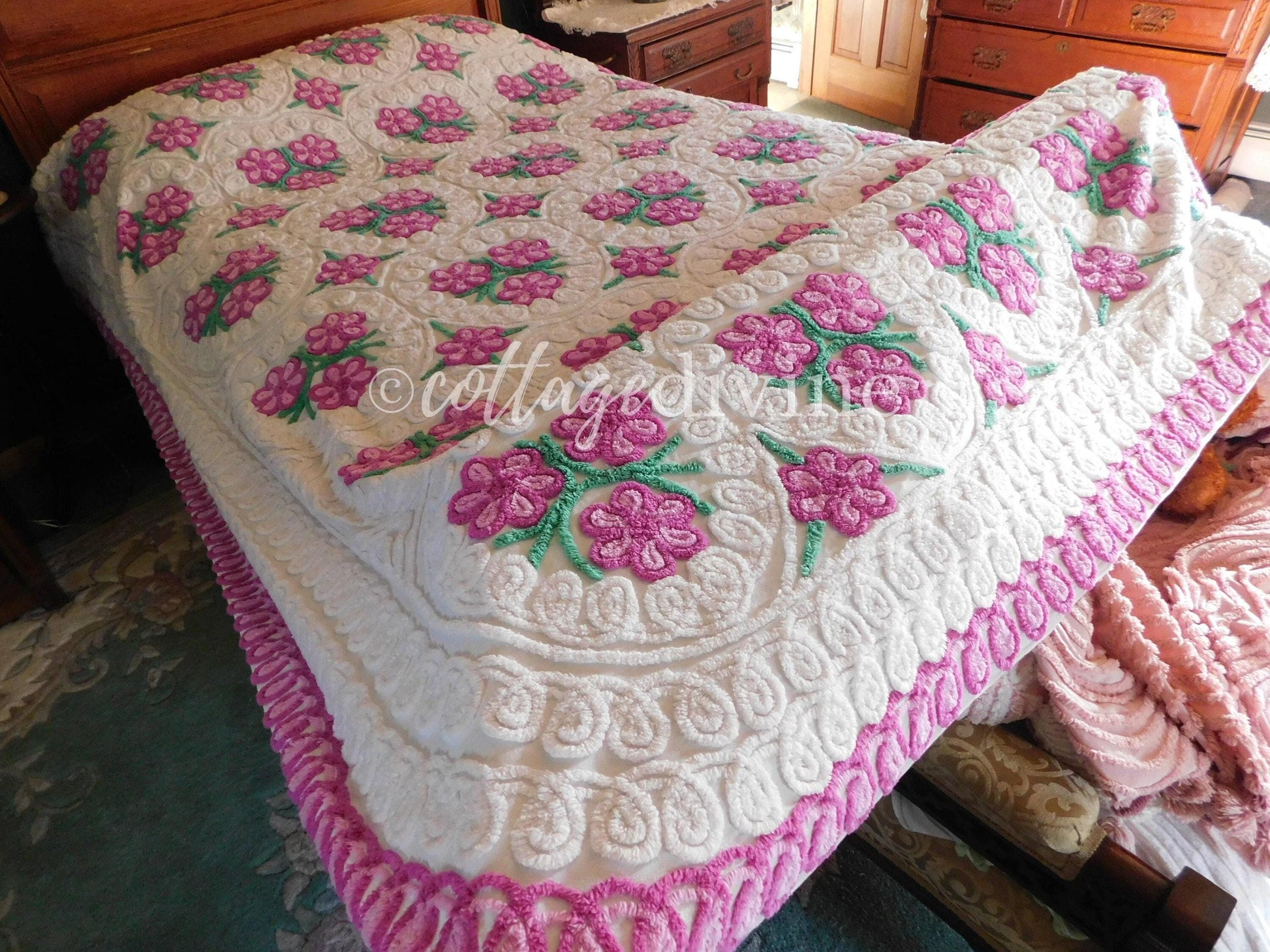 {FULL Size} Romantic plush hearts abound on this 1950s era darling vintage chenille bedspread. Lush swirls of white curlicue loops form prominent hearts with a trio of orchid colored flowers in the center of each. Super cheerful, this special spread has a wonderful essence of joy blended with a cozy old-fashioned nostalgia. A midcentury cottage dream..- FULL size vtg chenille bedspread, displayed on standard full bed- approx msmts: 90"W x 100"L