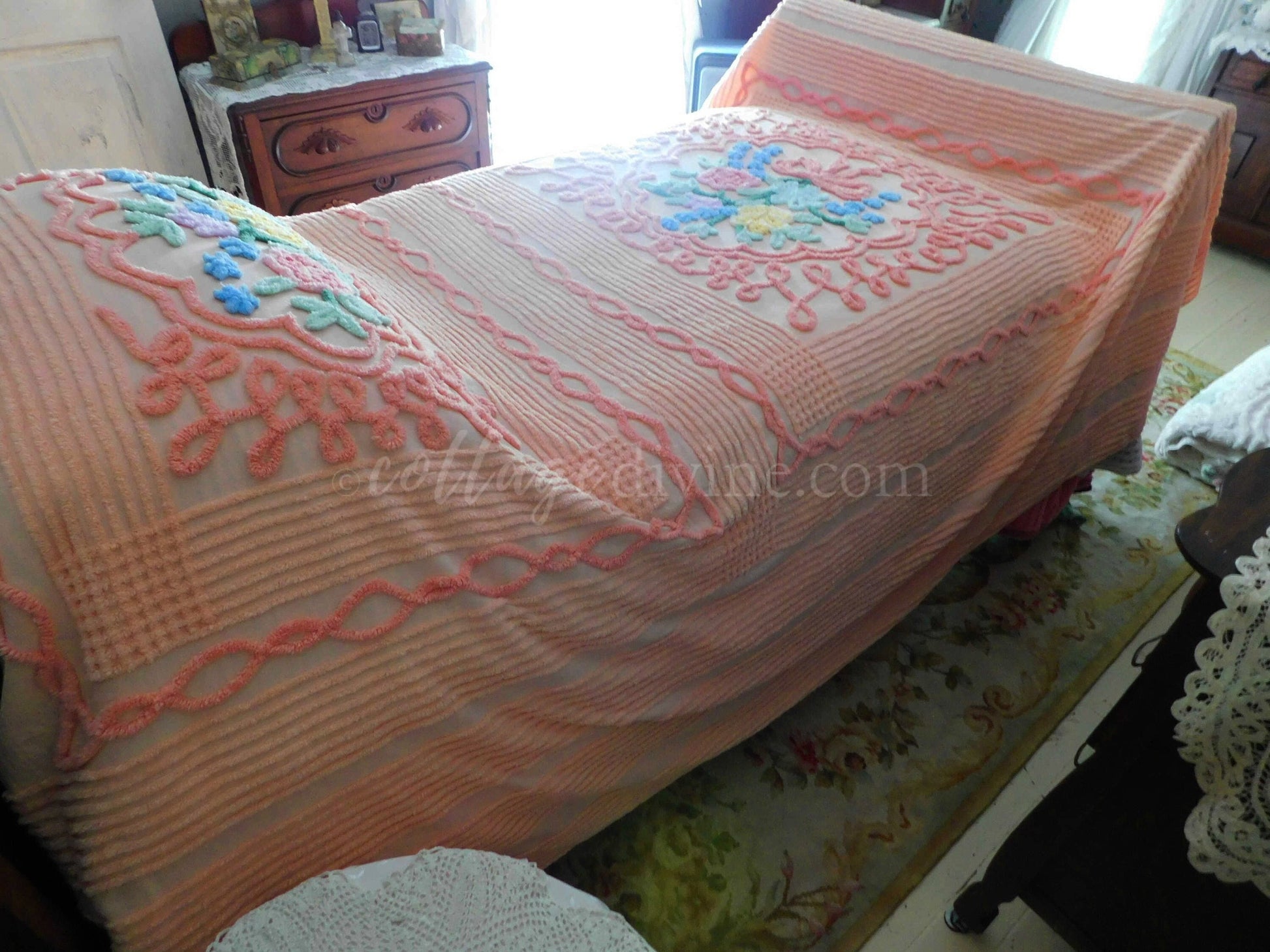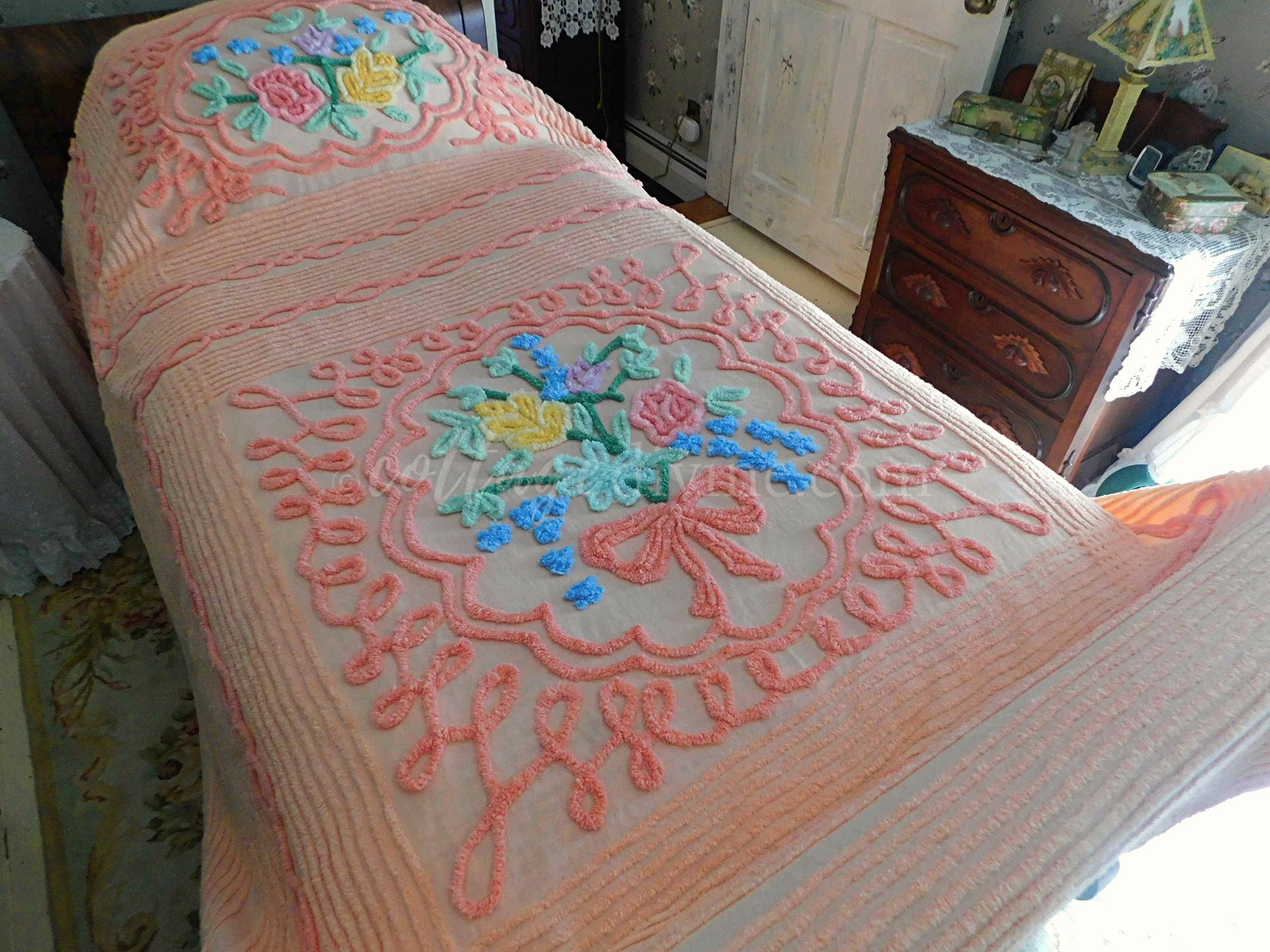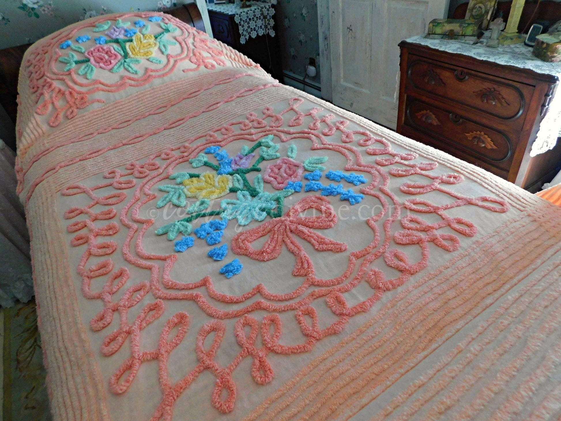 Romantic florals abound on this FULL size vintage chenille bedspread, in the most dreamy shade of old-fashioned peach. Gorgeous detailing to the flower tuft work.100% lighter weight cotton. An ideal bedspread to serve as a summer coverlet, or as a beautiful accent piece in your cozy cottage space...Approx 90"W x 100"L (full size)::all linens are in pre-loved vintage condition showing normal attributes of previous life (i.e.. missing tufts, color variations, vintage scents, age marks, etc.)