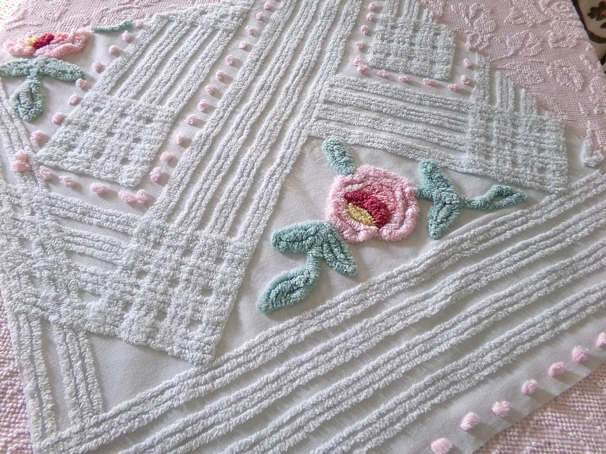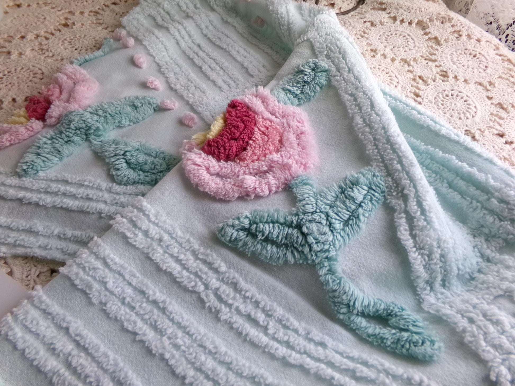 Ever so pretty, this vintage chenille fabric piece features a simple tufted pink rose design on a light, cooltone shade of spa aqua.Measures approx 25" x 24" inches. 100% cotton, very lightweight. Small pinhole as seen final img. Original vintage chenille sourced from a chenille bedspread circa 1960s.