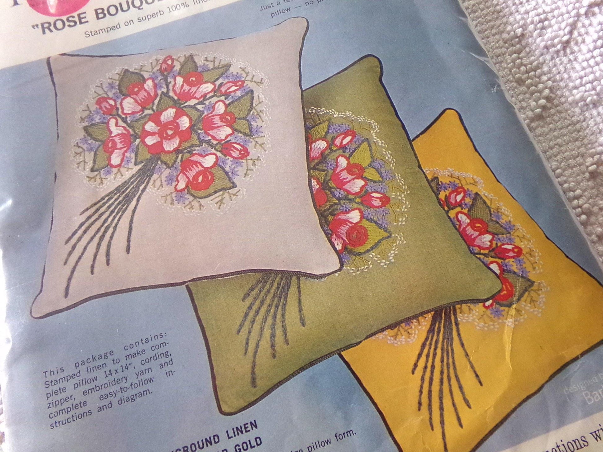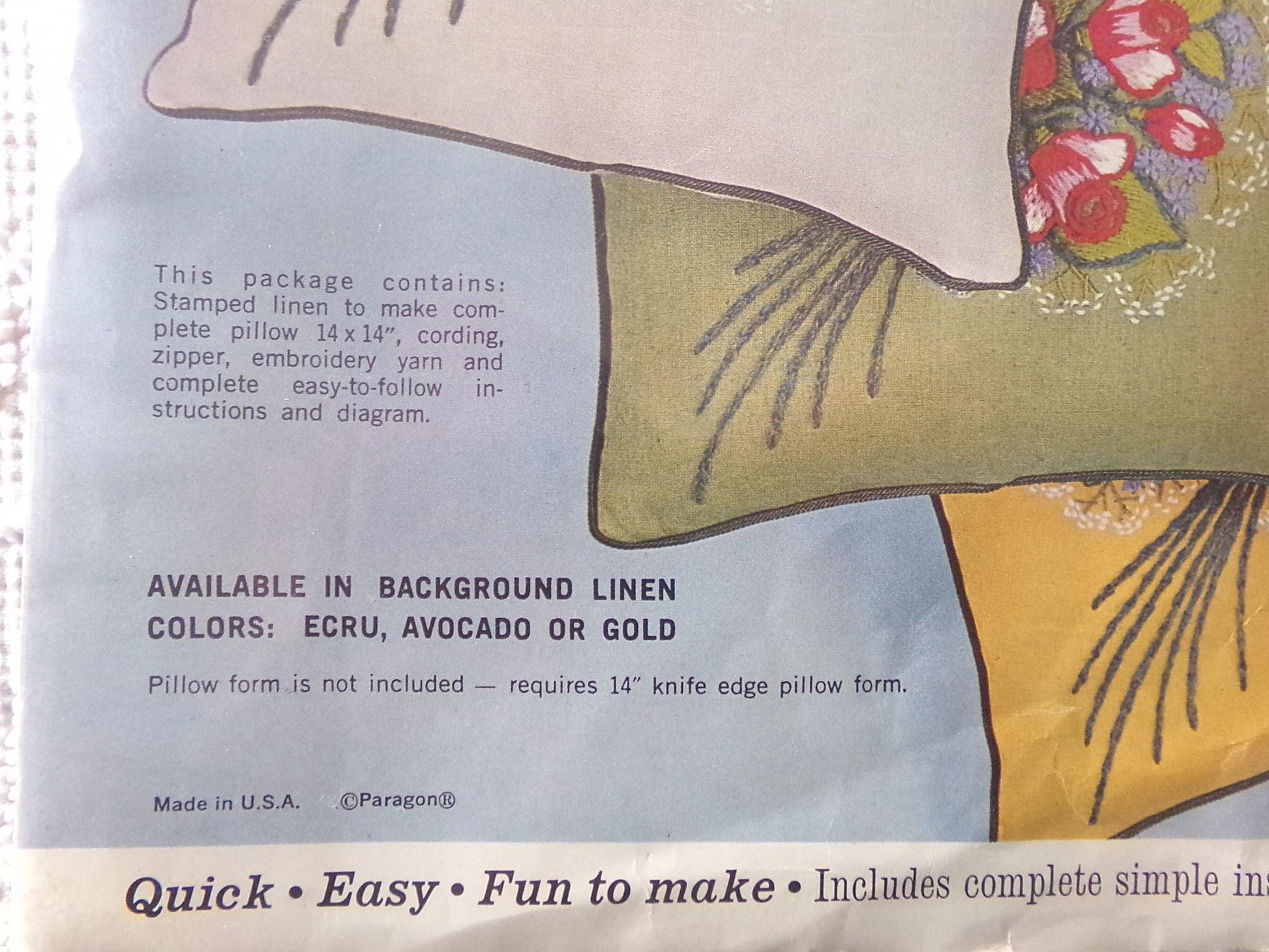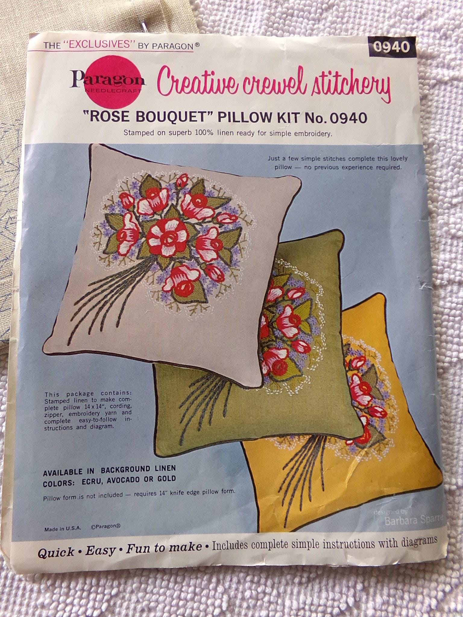 ROSE BOUQUET PILLOW KIT, a lovely vintage pillow embroidery kit by Paragon Needlecraft Creative Crewel Stitchery. **This kit is for the ECRU color only** It would make a wonderful retro hippie 70s style addition to your home once complete.- Paragon Creative Crewel Embroidery Kit # 0940