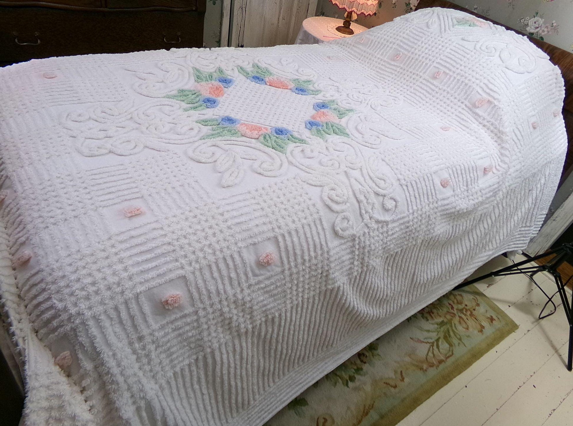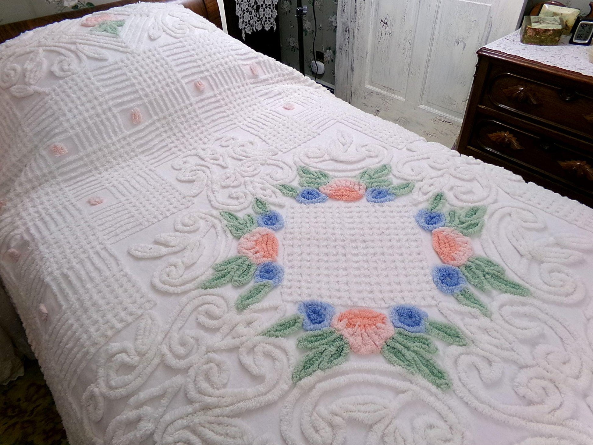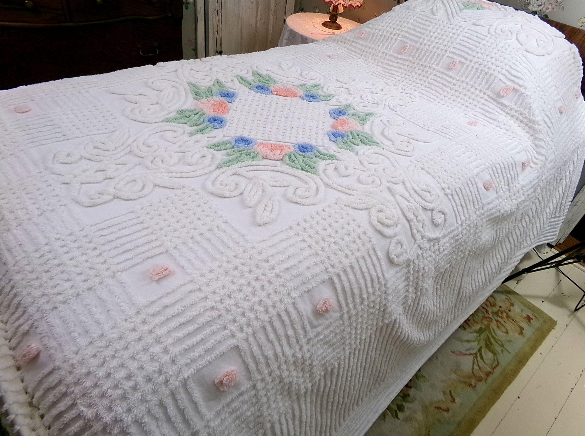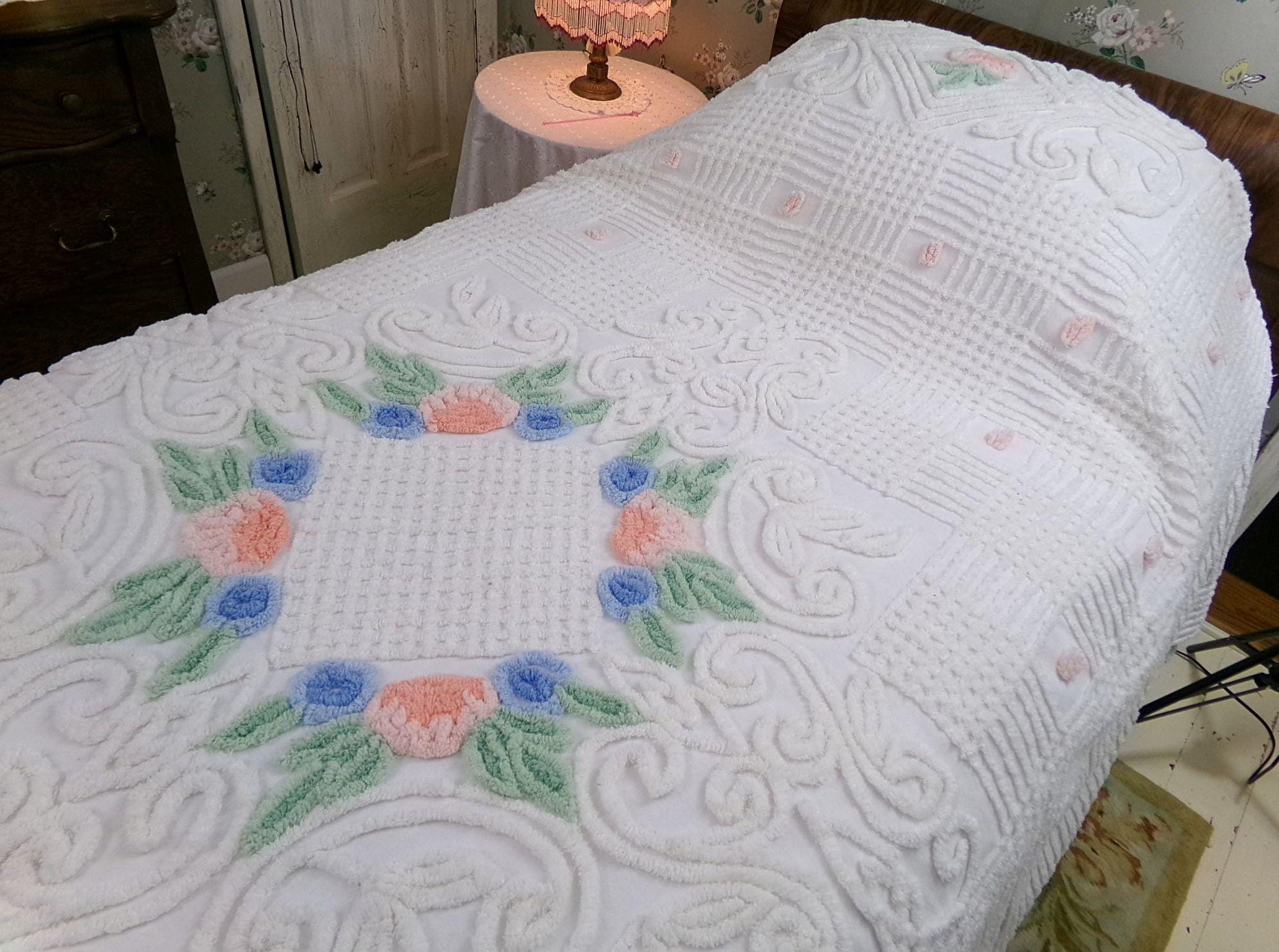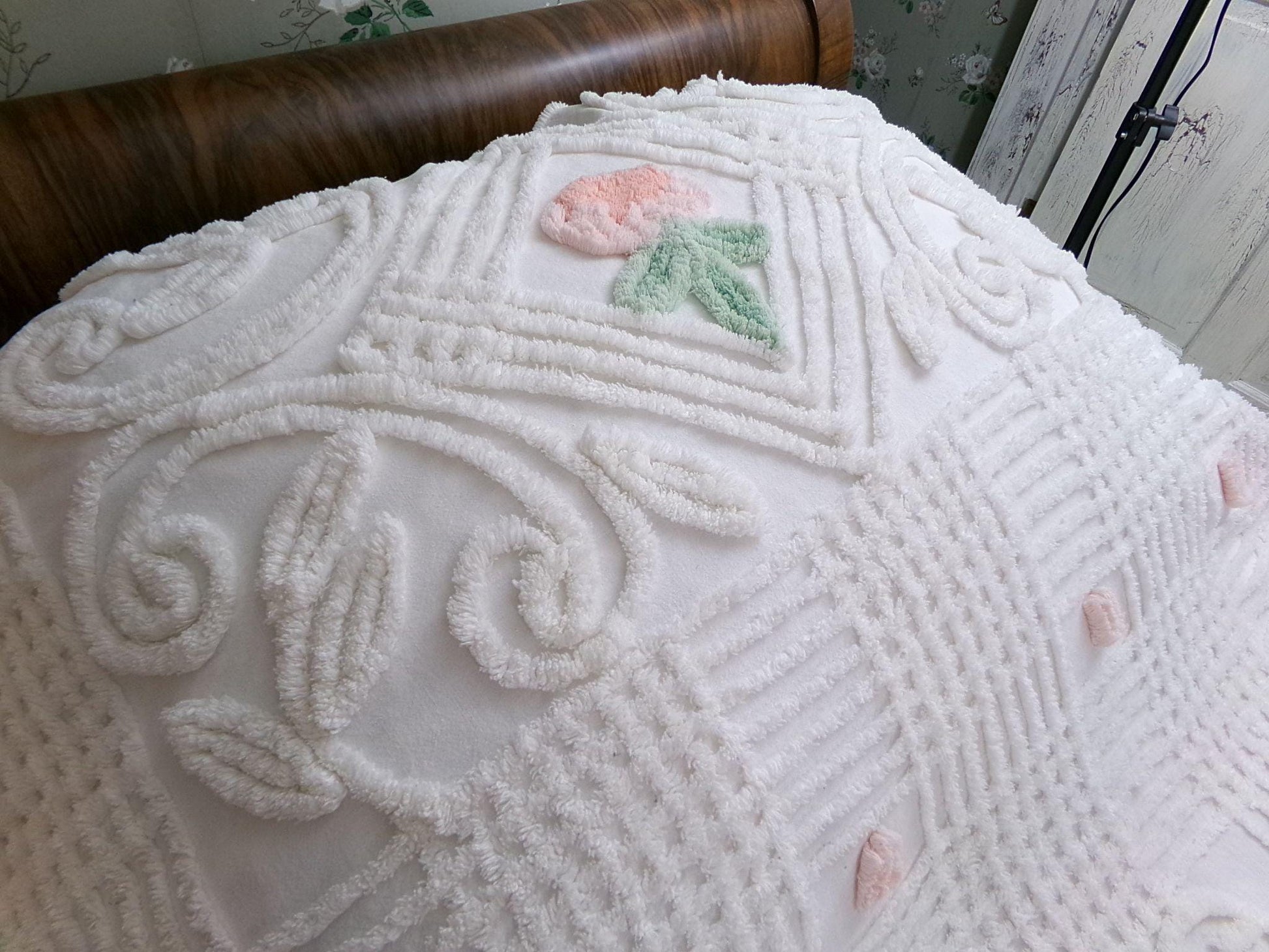 Isn't this the prettiest chenille bedspread? It features a wonderful cottage rose floral motif in the center, surrounded by intricate sculpted scrollwork. Because of its soft white background, it is versatile enough to easily bring cottage style to any setting.Full size. Approx 87"W x 100"L. 100% cotton, light to mid-weight. Few marks, to the fabric & light fray to hemline in a few areas. Displayed on a twin bed in bright light; to see it staged on a queen or full sized bed, ask anytime.