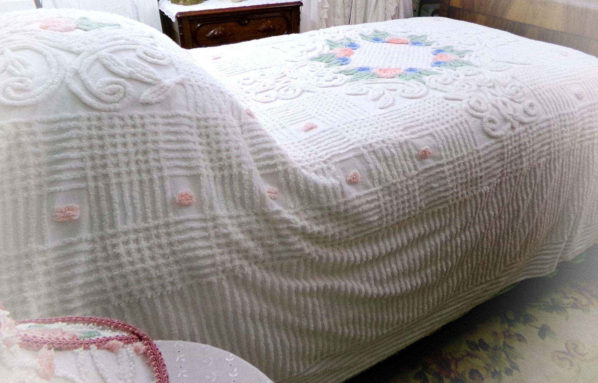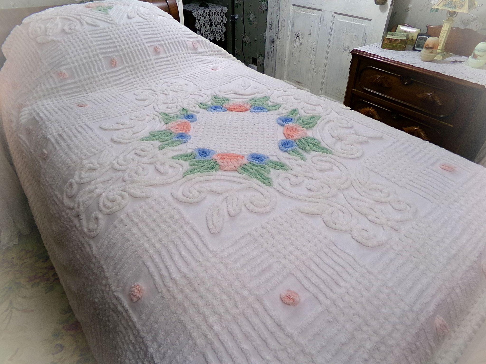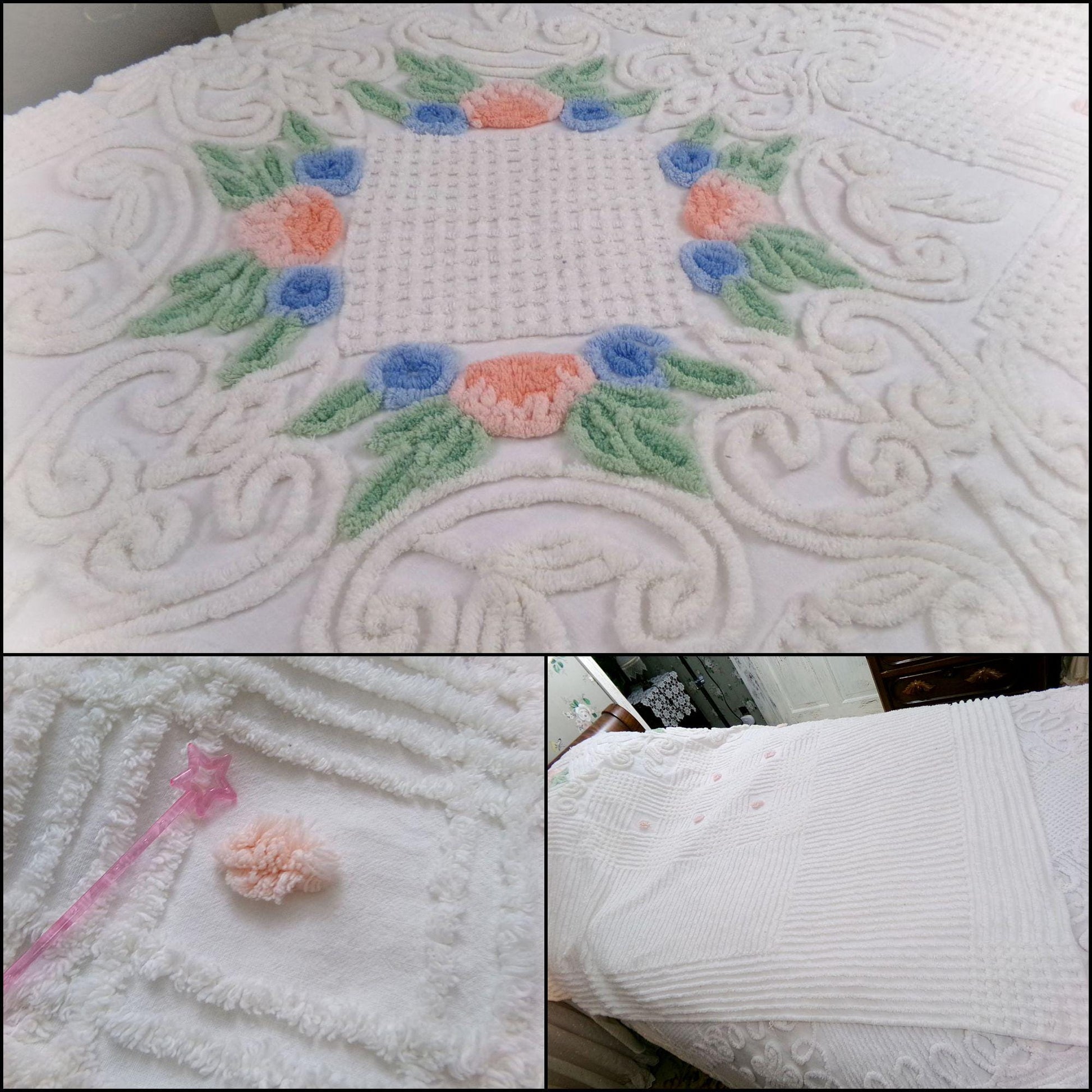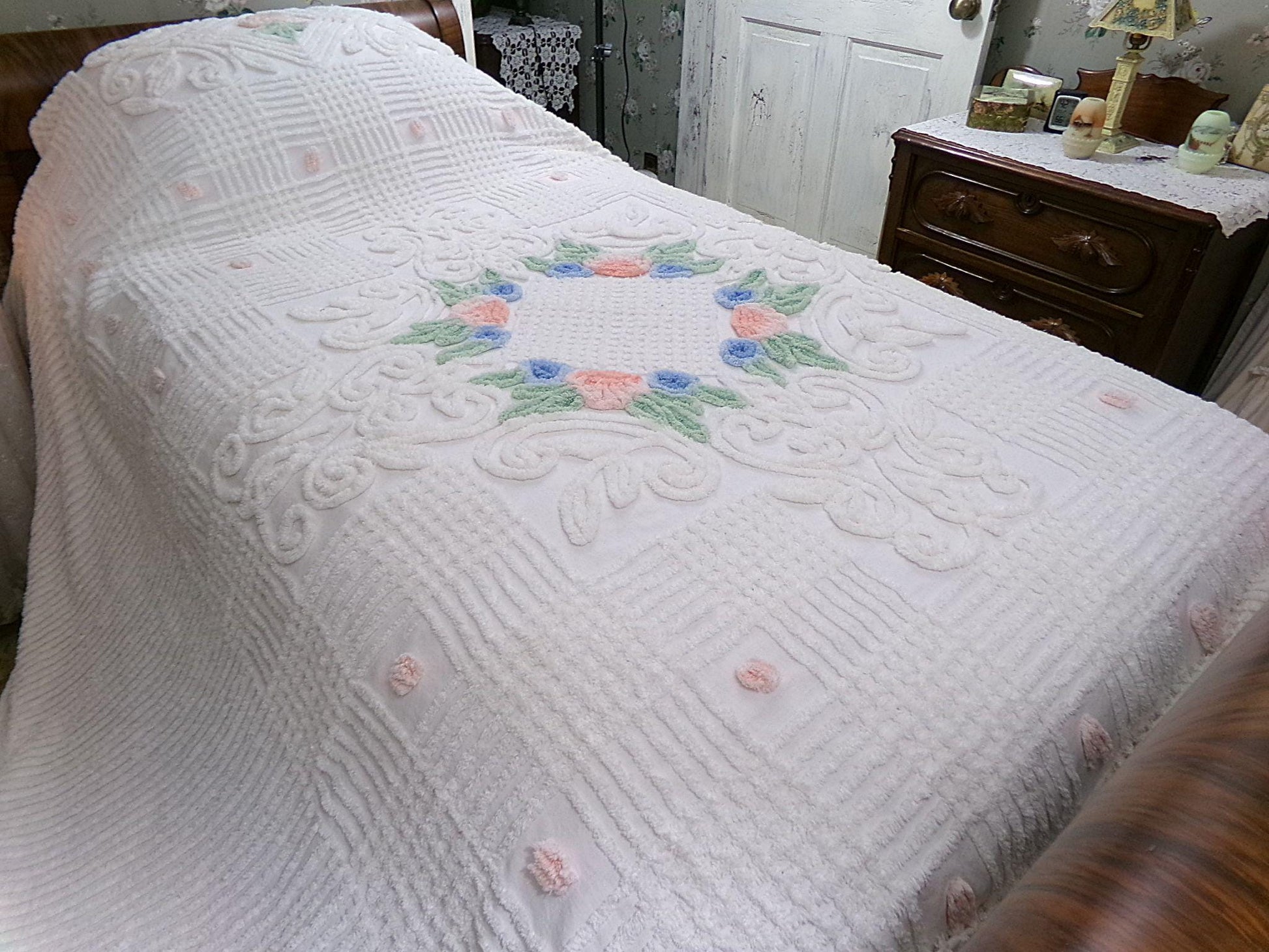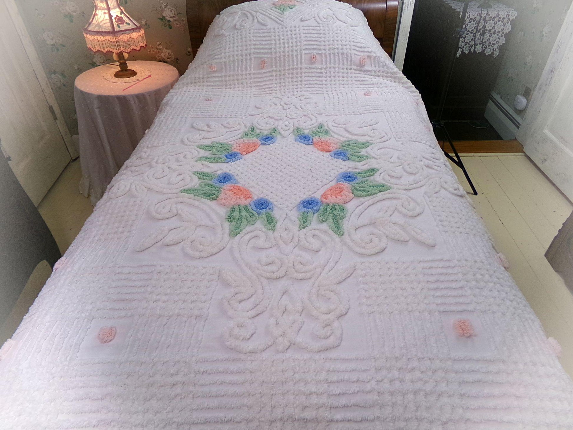 Isn't this the prettiest chenille bedspread? It features a wonderful cottage rose floral motif in the center, surrounded by intricate sculpted scrollwork. Because of its soft white background, it is versatile enough to easily bring cottage style to any setting.Full size. Approx 87"W x 100"L. 100% cotton, light to mid-weight. Few marks, to the fabric & light fray to hemline in a few areas. Displayed on a twin bed in bright light; to see it staged on a queen or full sized bed, ask anytime.