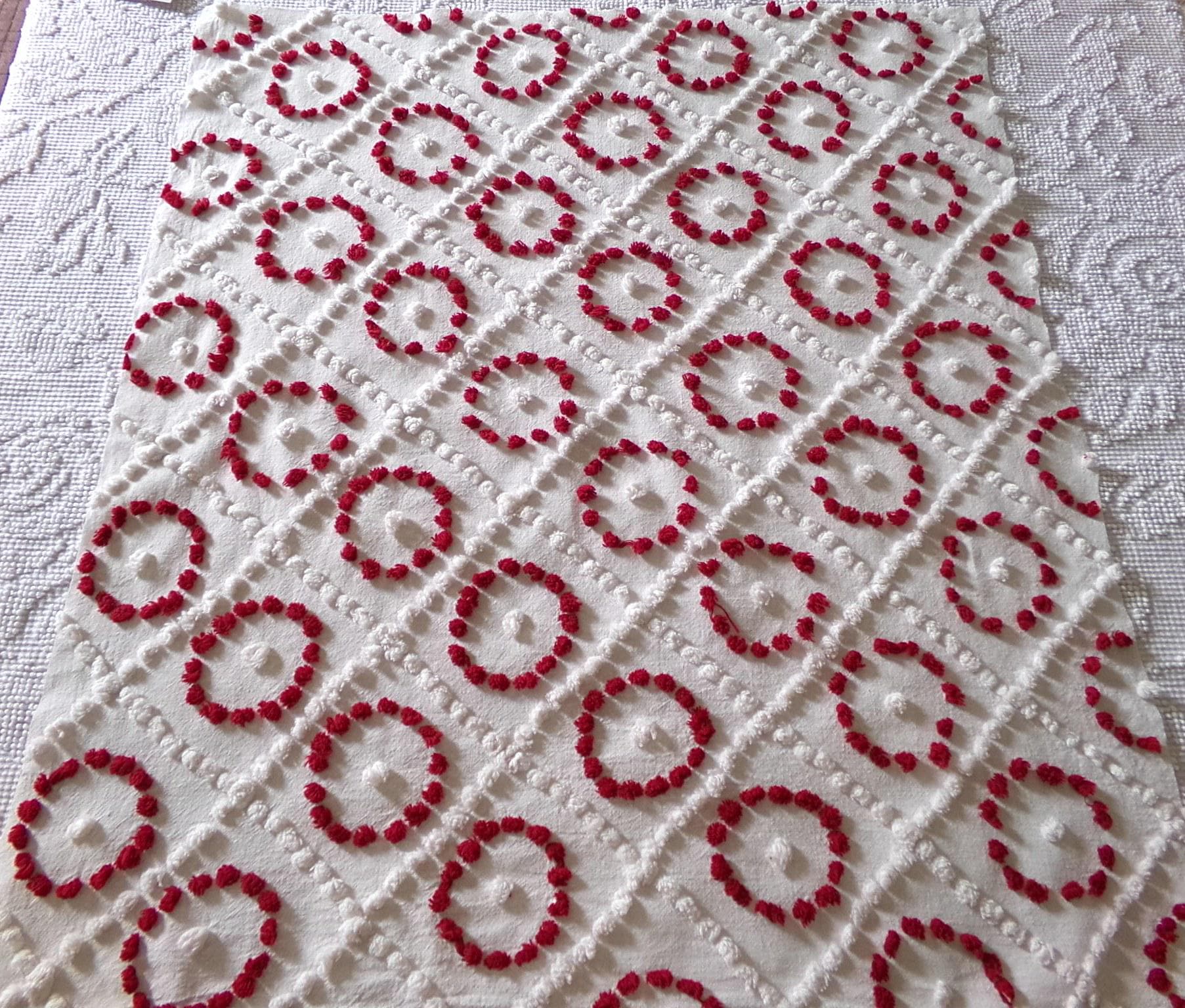 How charming this vintage fabric is...this piece features a nested geometric design with ruby red circles situated in white diamond dots. And each circle has a single white dot right in the middle.Handtufted design from the late 1930s which has been preserved remarkably well for nearly a century. This pattern has long been a favorite in rustic chenille quilts and handmade Christmas stockings.