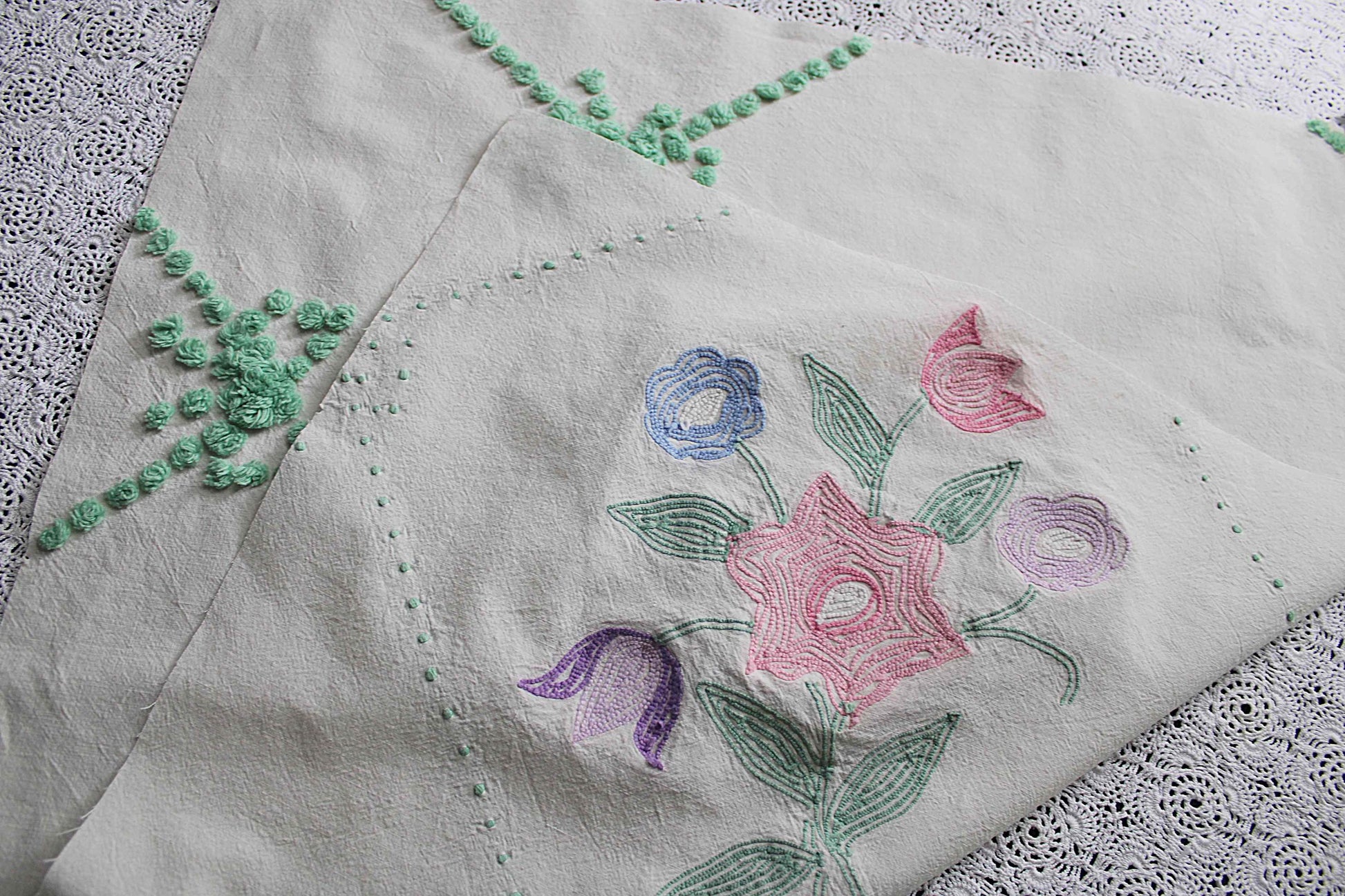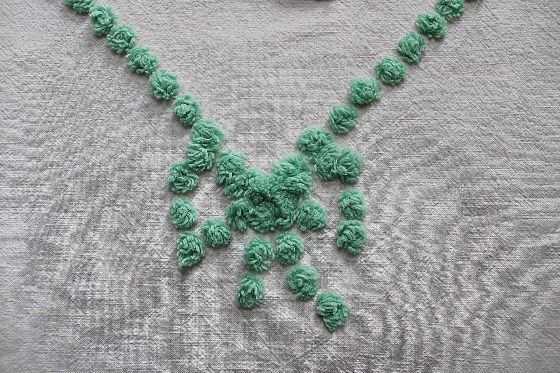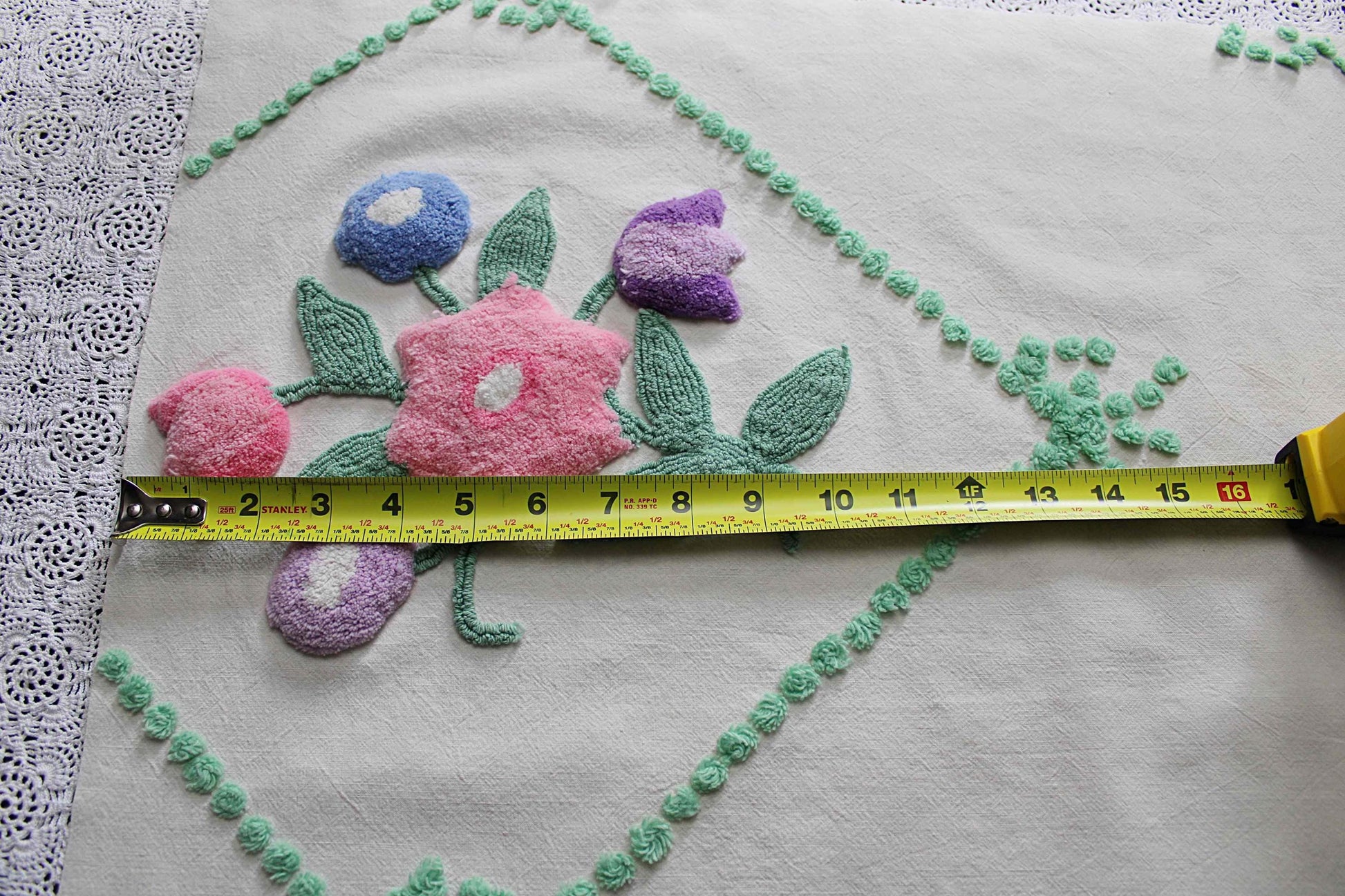 This vintage chenille material features a beautiful raised 3D peony tulip motif on warm white lightweight cotton. Small jadeite puff accents and cute tufted bows make this a cottage chic classic. A great piece for a pillow cover; please study placement/msmts of motif to make sure it will work for your design.Approx 20" x 25" inch piece. 100% cotton, very early chenille dating to early 1940s. May have attributes of age such as small pinholes, etc.