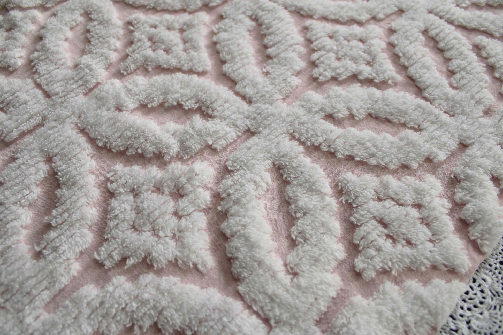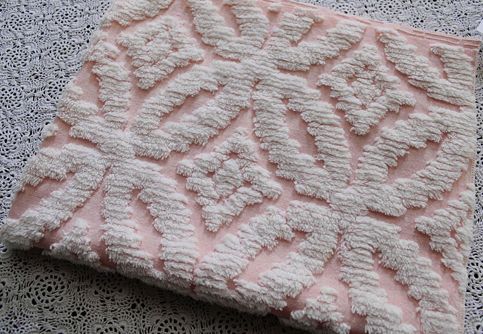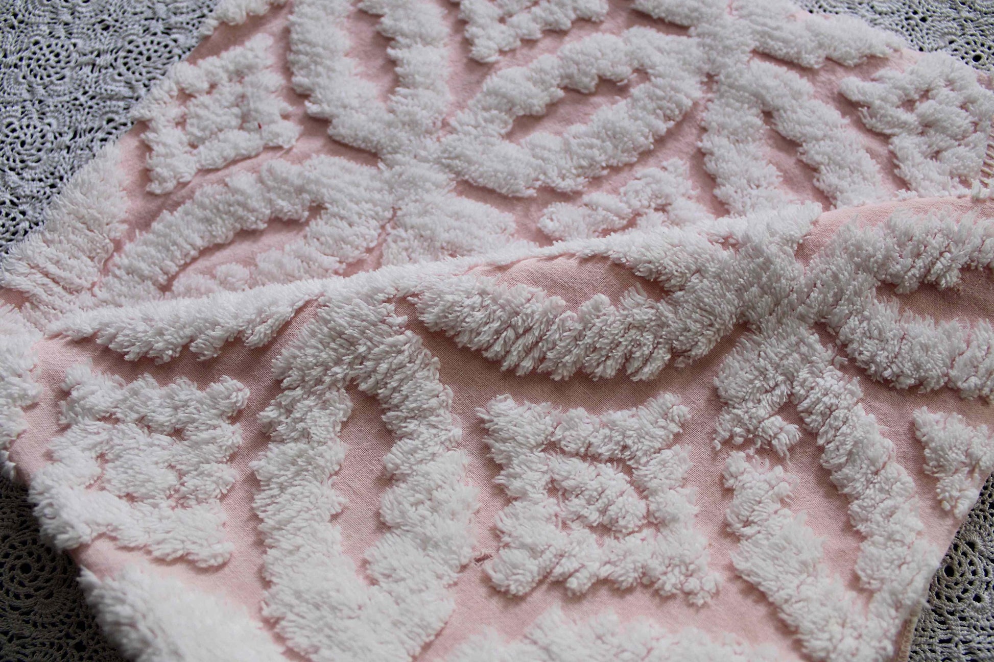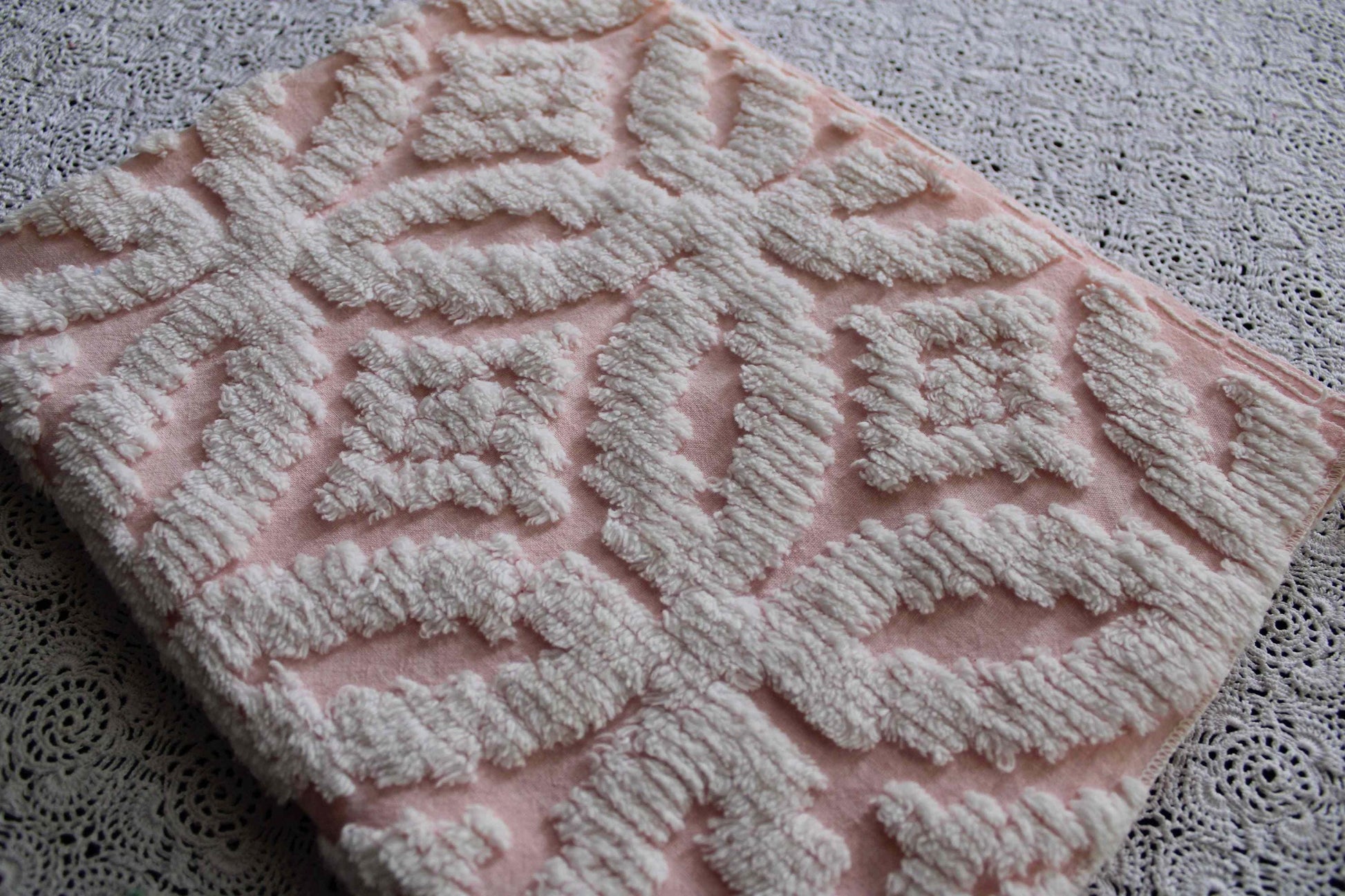 This vintage chenille material features a sculpted geometric petal design on a cool pink bkgd. The color is very similar to Mettler's thread called "Shrimp Pink" which has very soft peachy undertones.Approx 20" x 25" inch piece. 100% cotton, strong & easy to sew with.